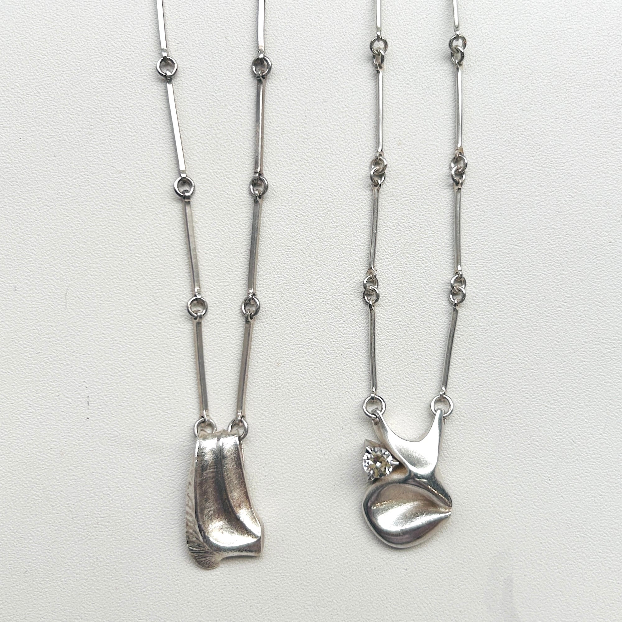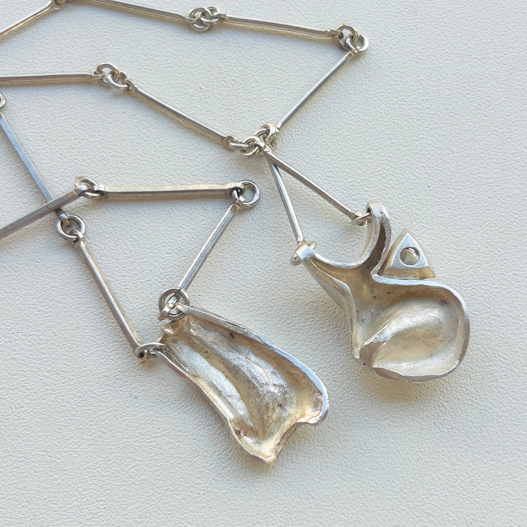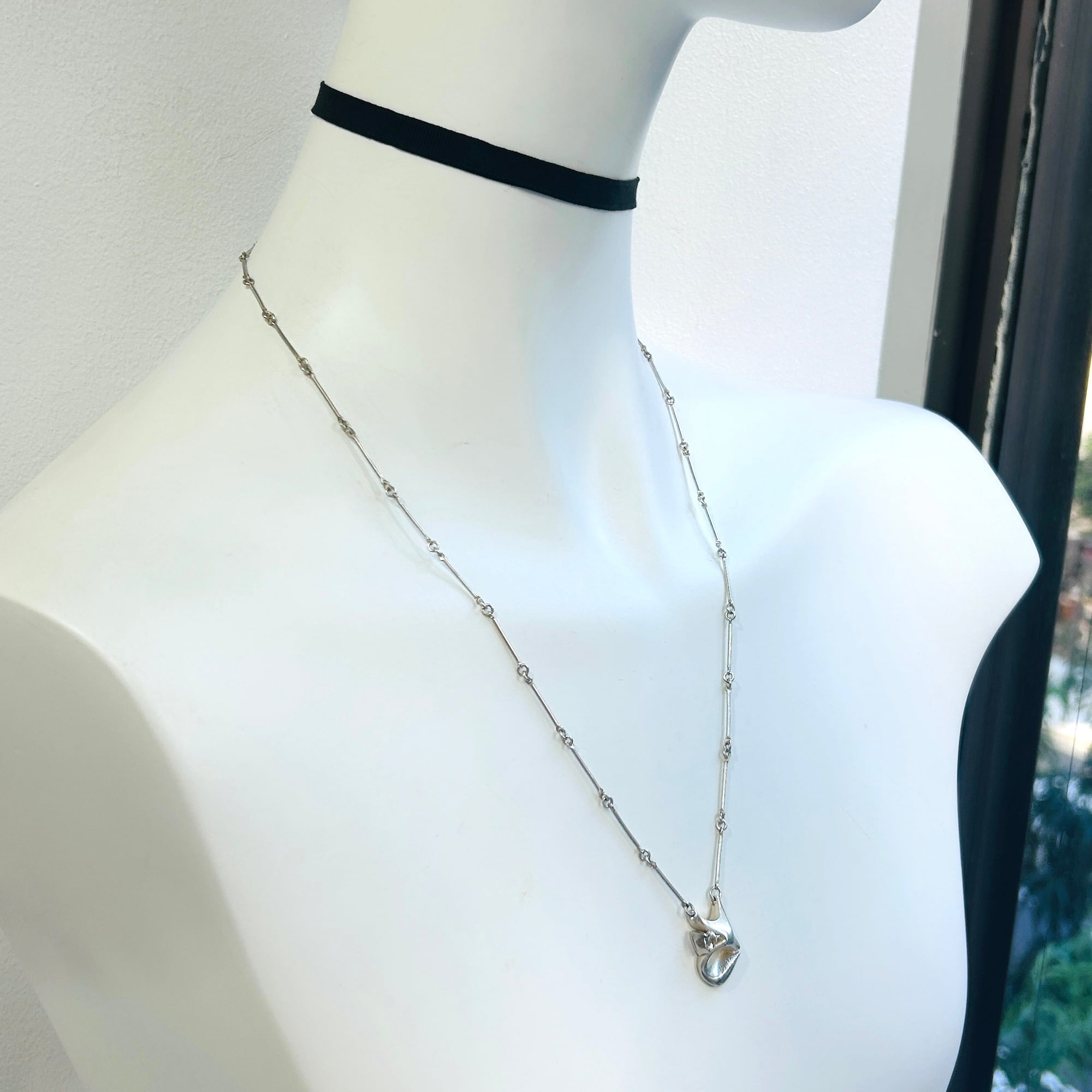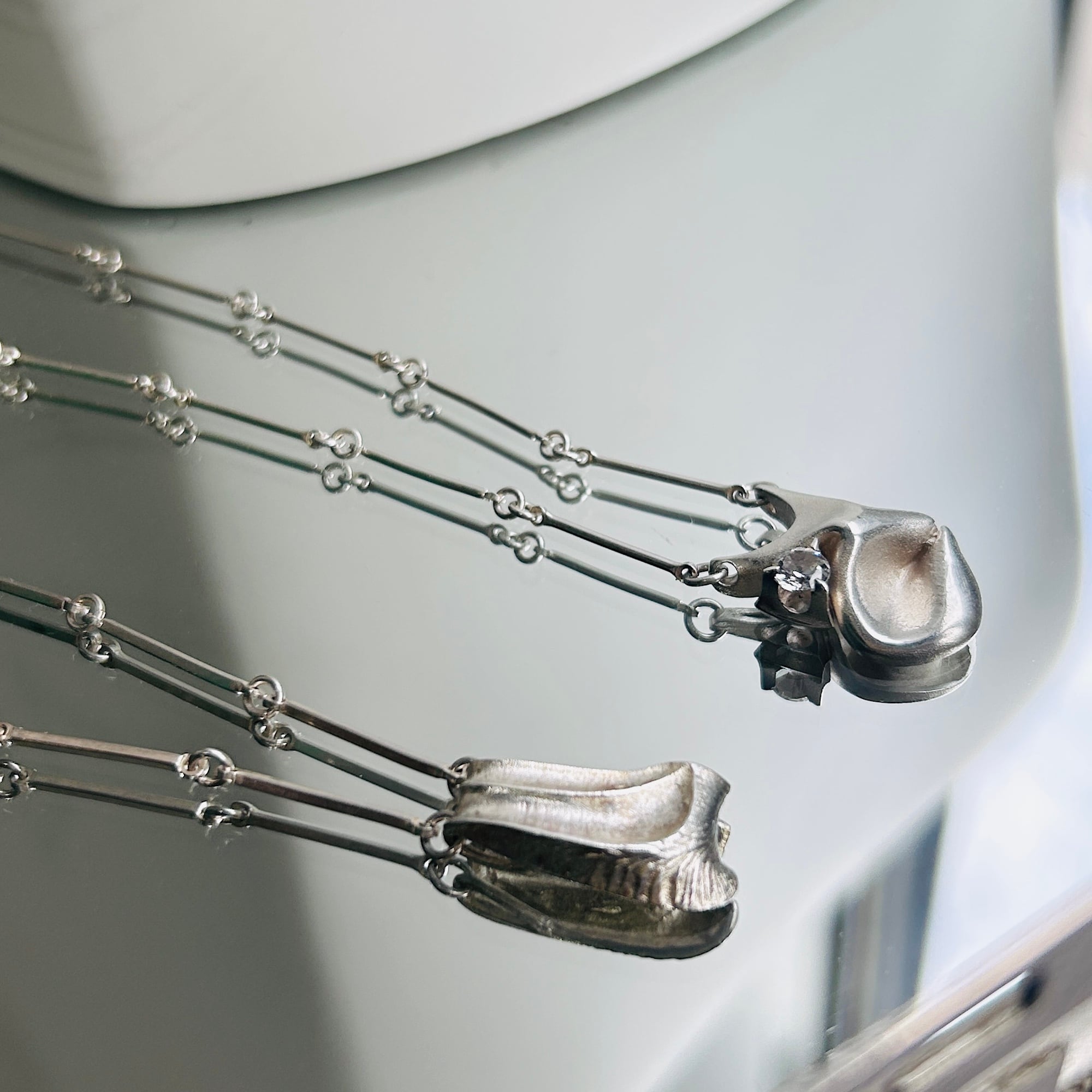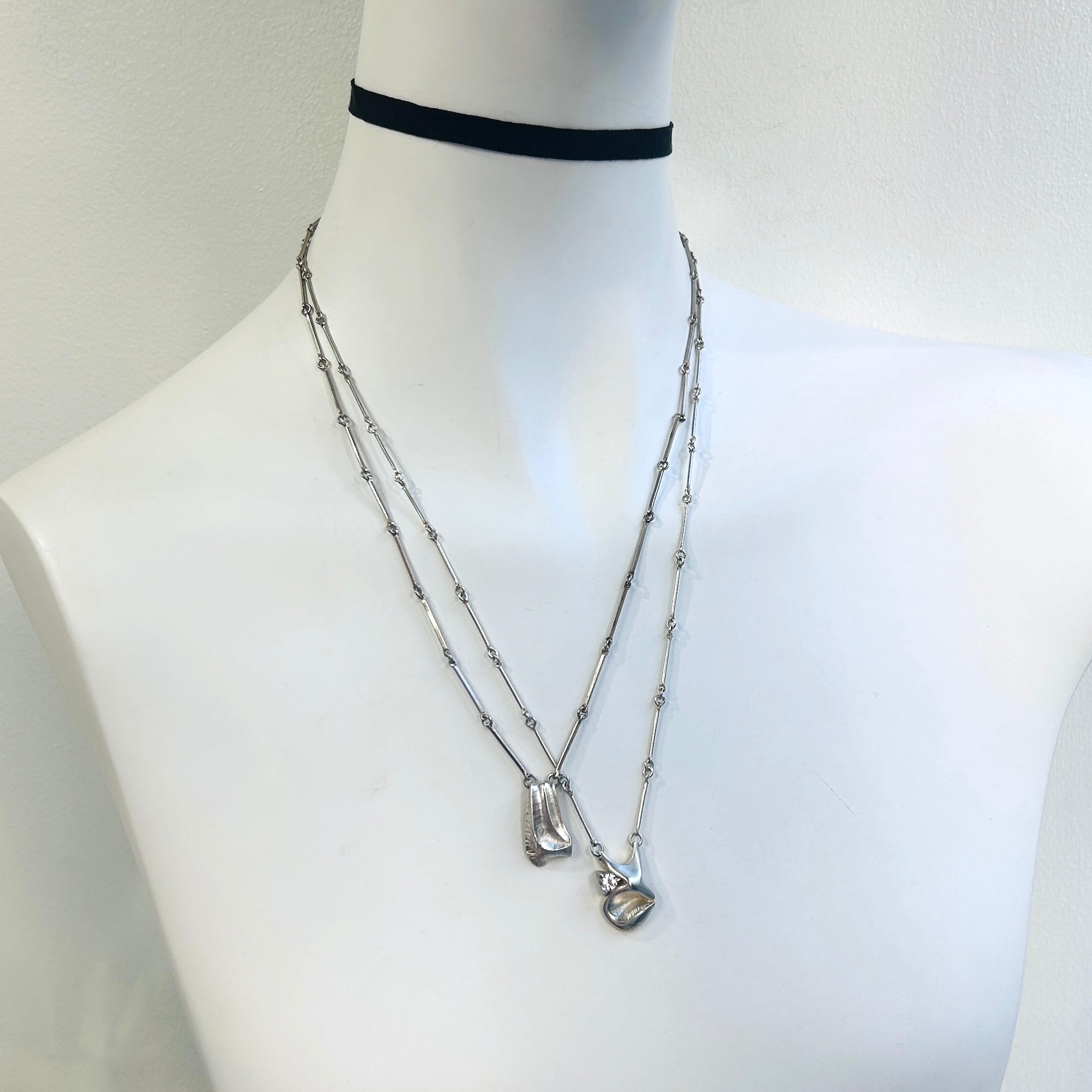 独創的な北欧ペンダント2種入荷いました。ツヤのある鏡面とサテン調の対照的な仕上げが施されたオーガニックフォルムに水晶が付いたペンダントです。個性が強いデザインですが華奢なバーに小ぶりのトップでボリューム控えめです。お洋服に自然に馴染む着けやすいデザインです。こちらはフィンランドで今も継続しているジュエリーブランド「Sirokoru(シロコル)」のデッドストックト品、1979年製作発表「Time Machine」というシリーズです。シコロルはMatti J. Hyvärinen(マッティ・ヒヴァリネン / 1937-2017)が1958年に設立したジュエリーブランドです。留め具横のバーに「MJH」「925」、タウンマーク、製造年1979年の刻印「B8」。当店のシロコルは1970〜80年頃、日本に輸入され関西の百貨店で販売されていましたが売却されないまま長い間保管されていたDEADSTOCKです。シルバー磨きクロスで磨いて頂くといいツヤが出ます。溝の黒ずみが気になりましたら液体クリーナーの使用をお勧め致します。