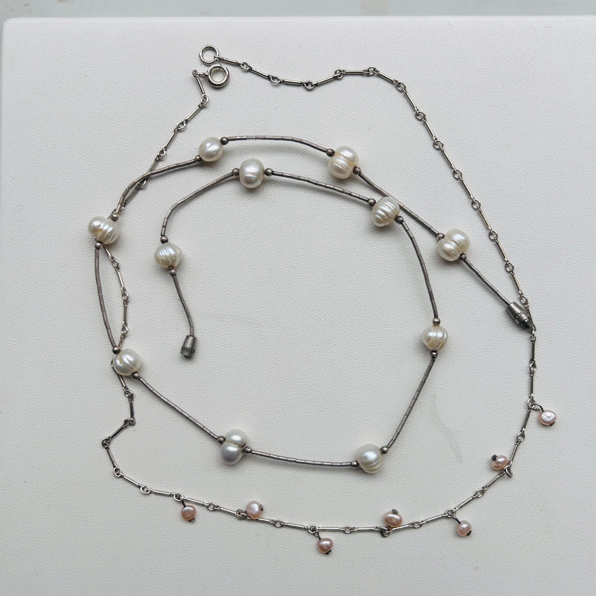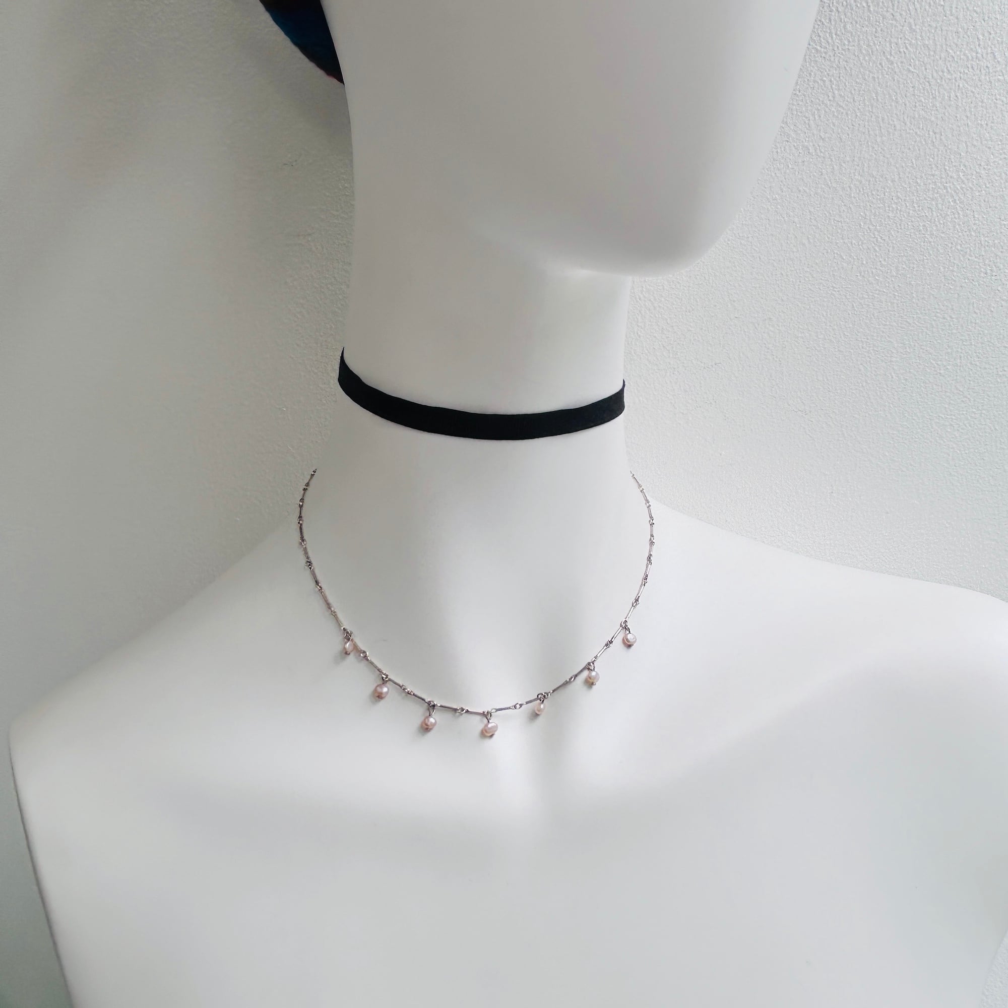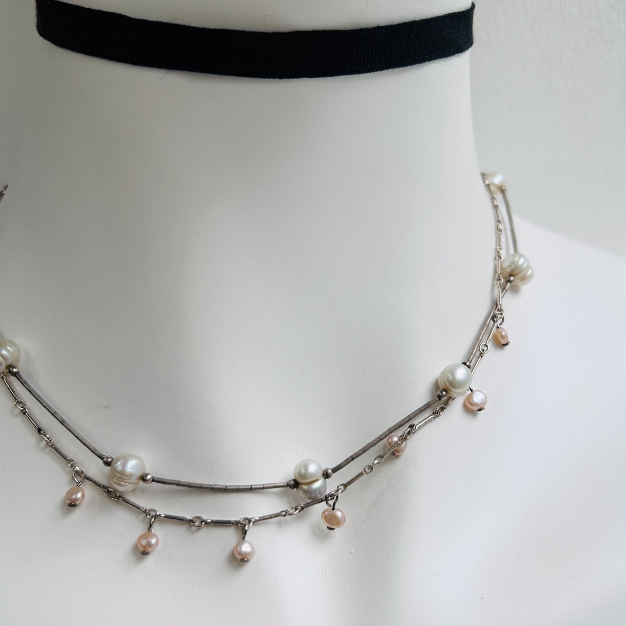 華奢なバーリンクネックレスに小粒淡水パールのネックレス。パールはほんのりピンク色です。短いネックレスですのでシャツの襟元から覗かせたり、長いチェーンと合わせて重ね着けも素敵だと思います。春夏は首が大きく開いたトップスと合わせるのもキュート。シルバーのカジュアルな雰囲気とパールの可憐さもある軽やかで使いやすいネックレスです。シャツとデニムスタイルに合わせるとカッコ良さそう:):)