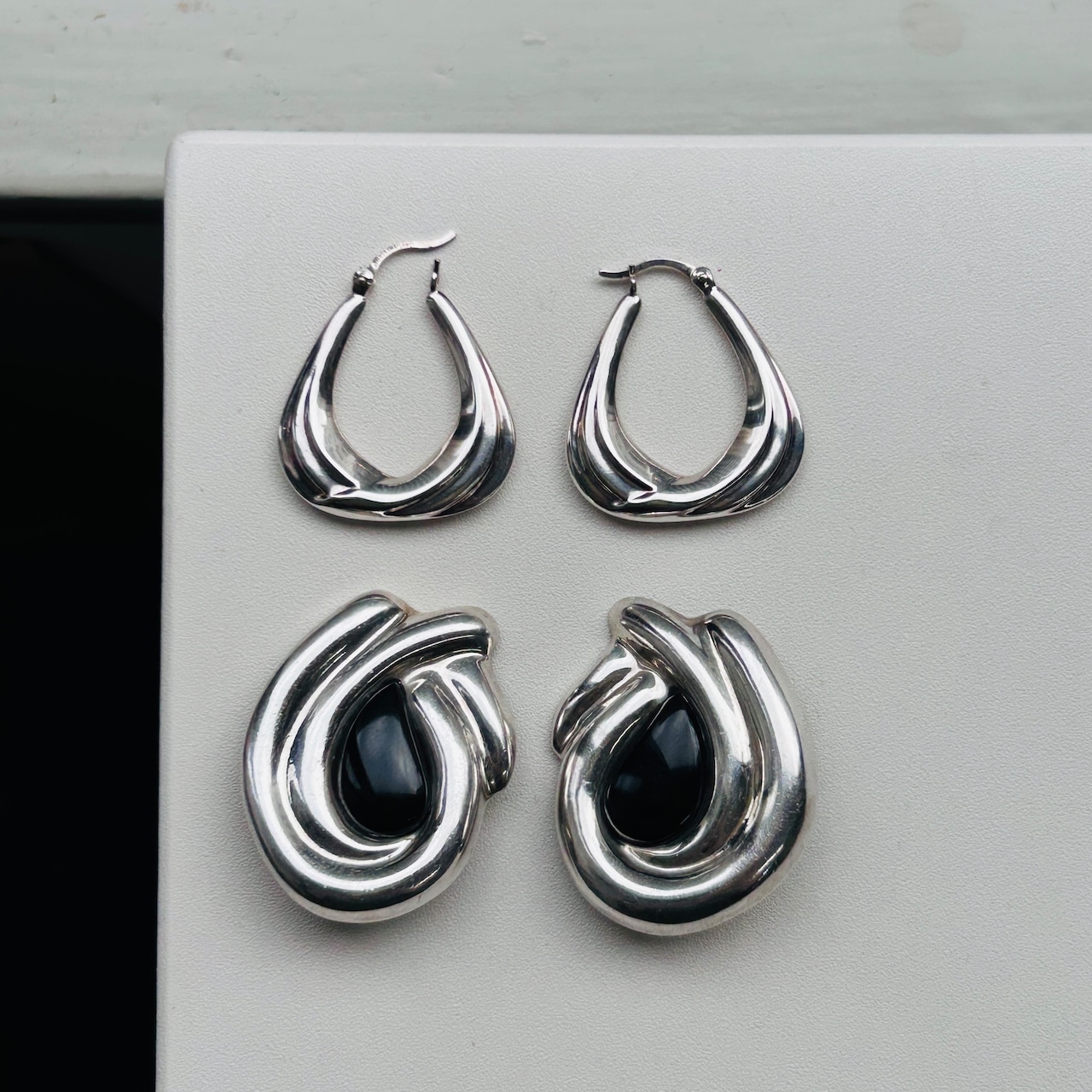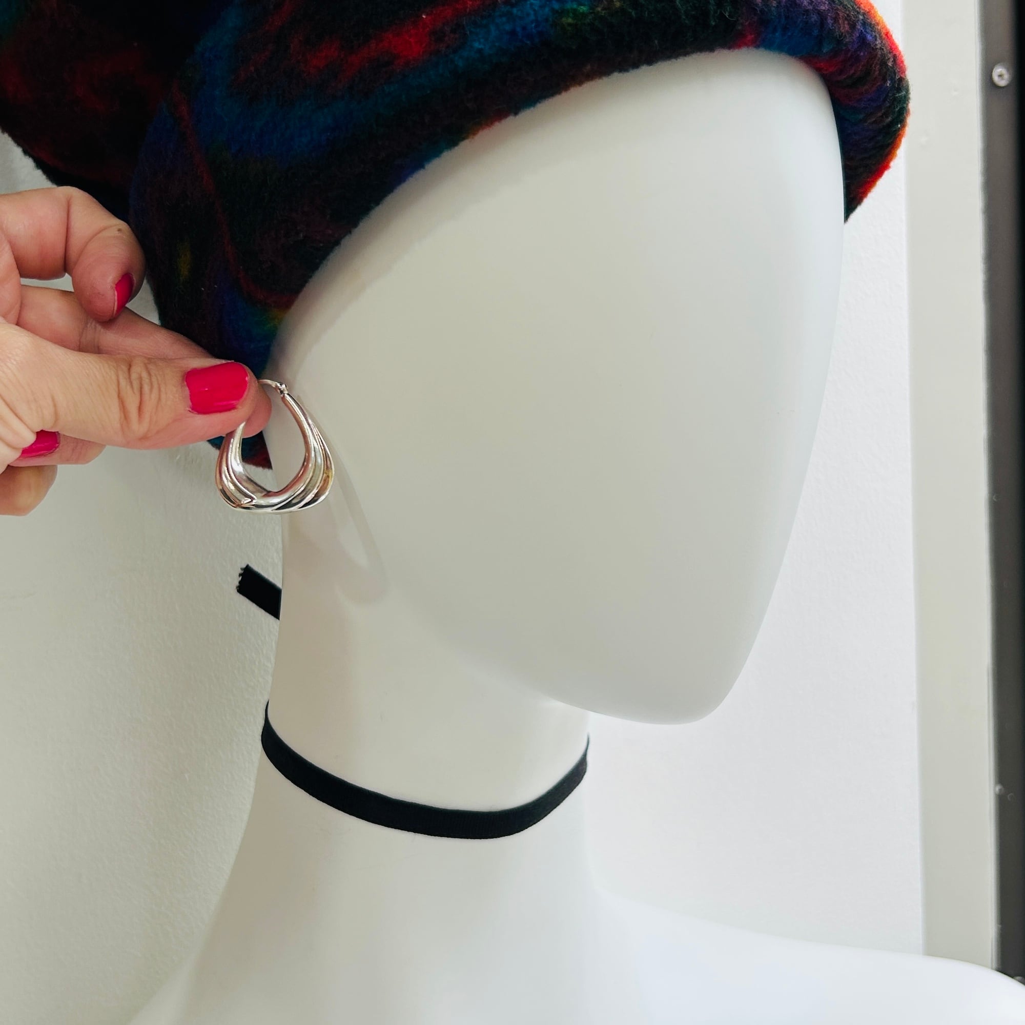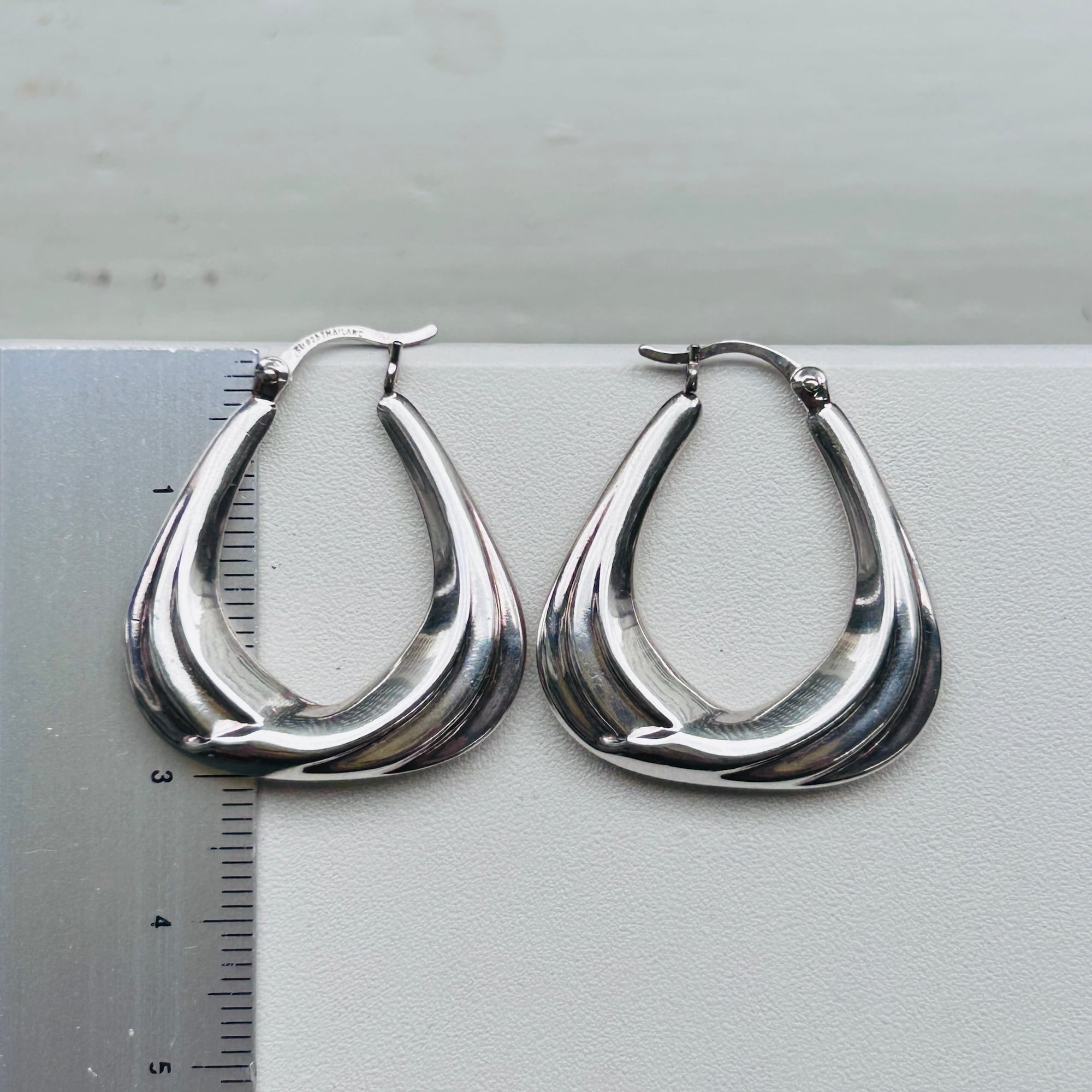 緩い三角形フープ。ドレープのようなリブ模様が素敵です。膨らんだ程よい存在感のあるピアスです。上品な輝き、洗練された印象あります。針に「925」「THAILAND」。針は二股フックに固くカチっとハマります。いいシルバーです。