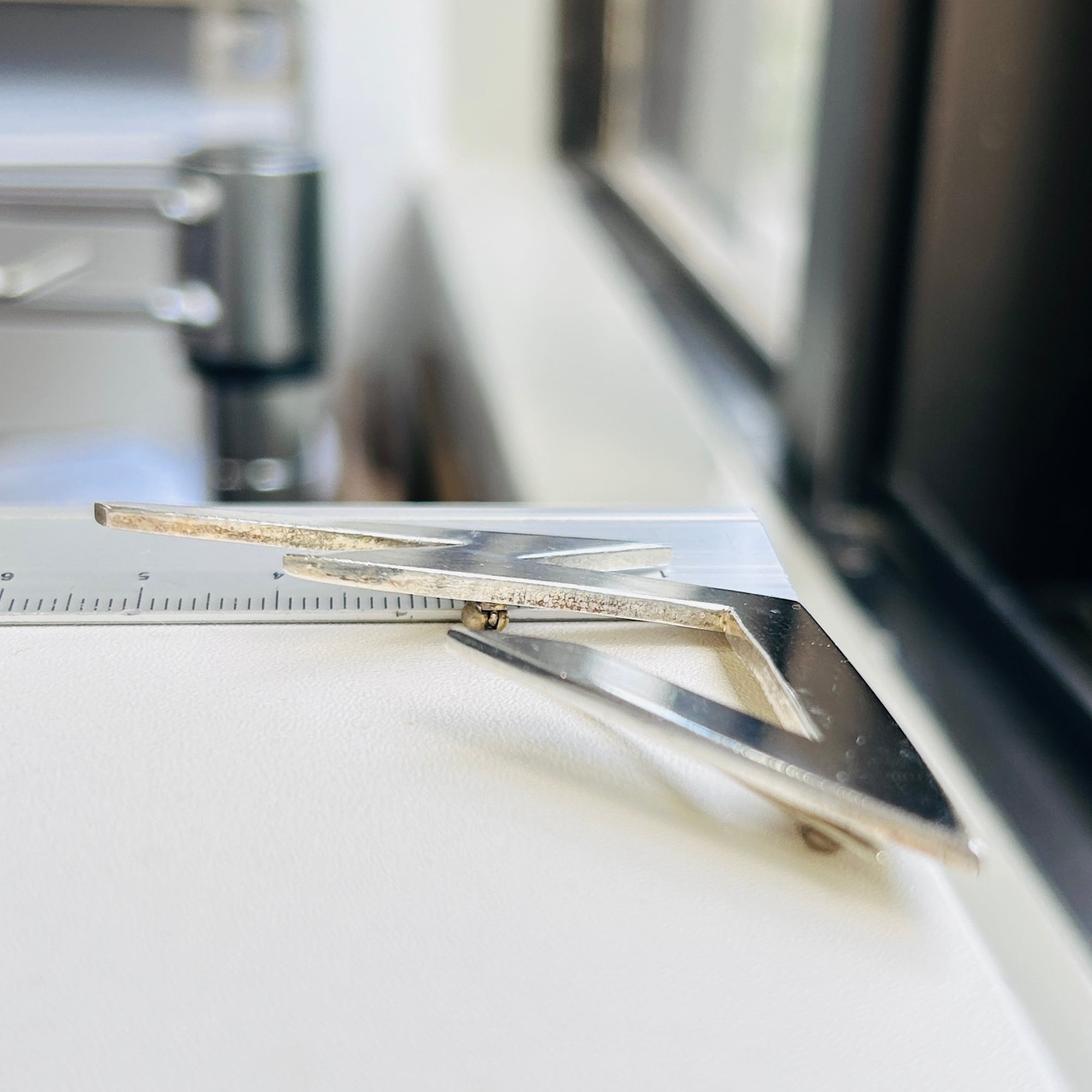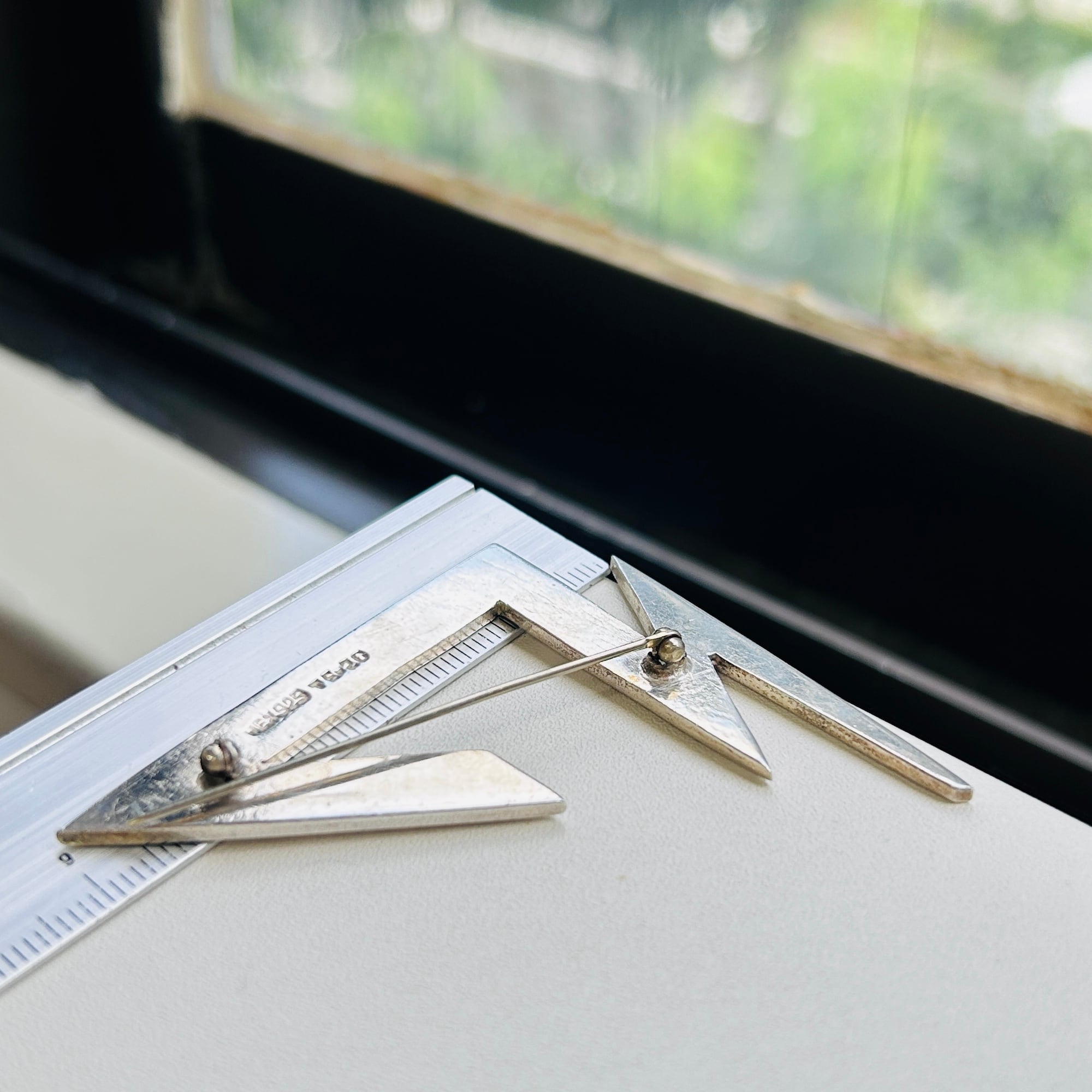 エッジの効いた大振りブローチ。2mm厚のソリッドシルバー、固くしっかりした作りです。表面全体に薄いスリキズ・スレあります。。男女問わず使っていただけるカッコいいデザイン。少し斜めにしたり、角度を変えて楽しめます。金具の動きに問題ありません。「MEX」「925」刻印。