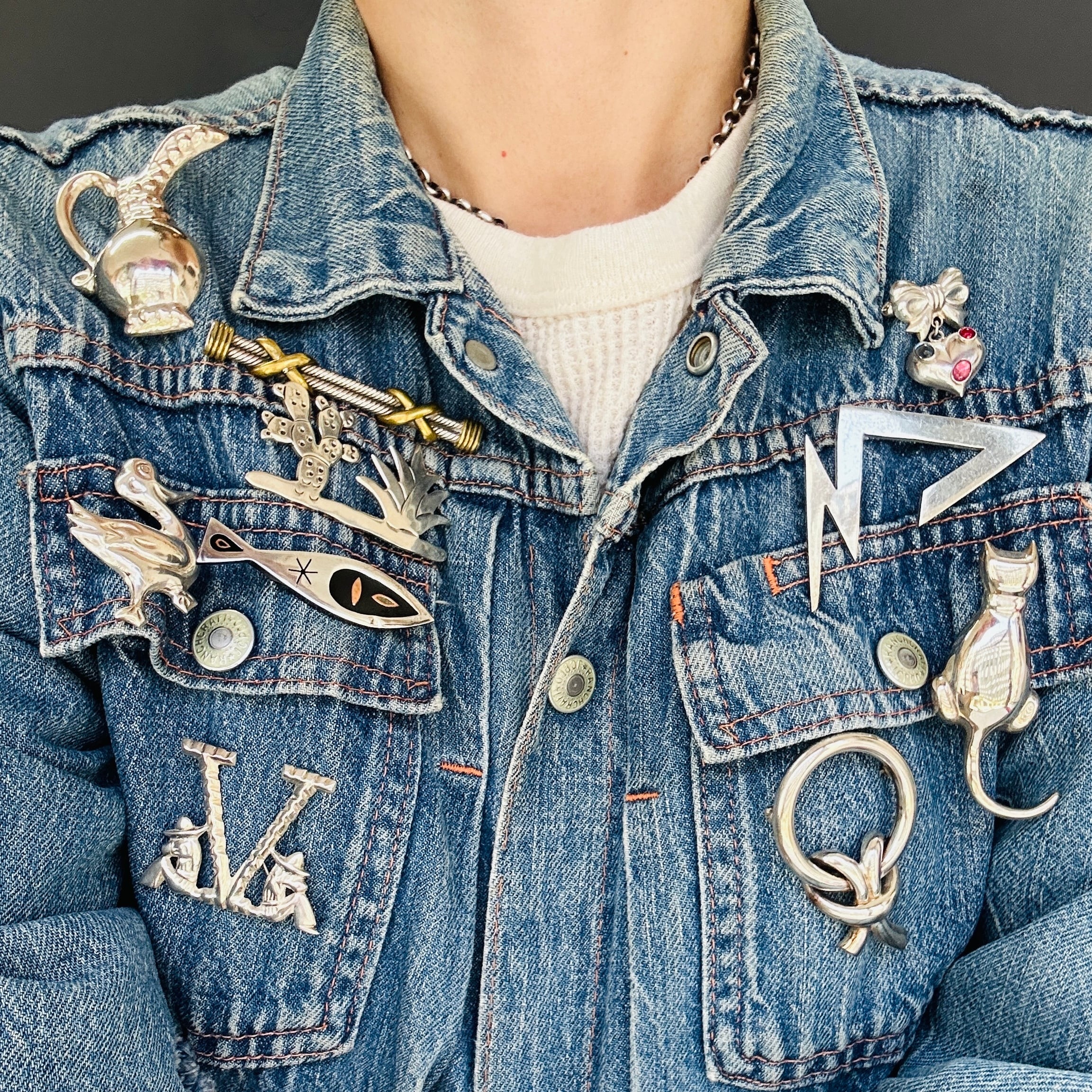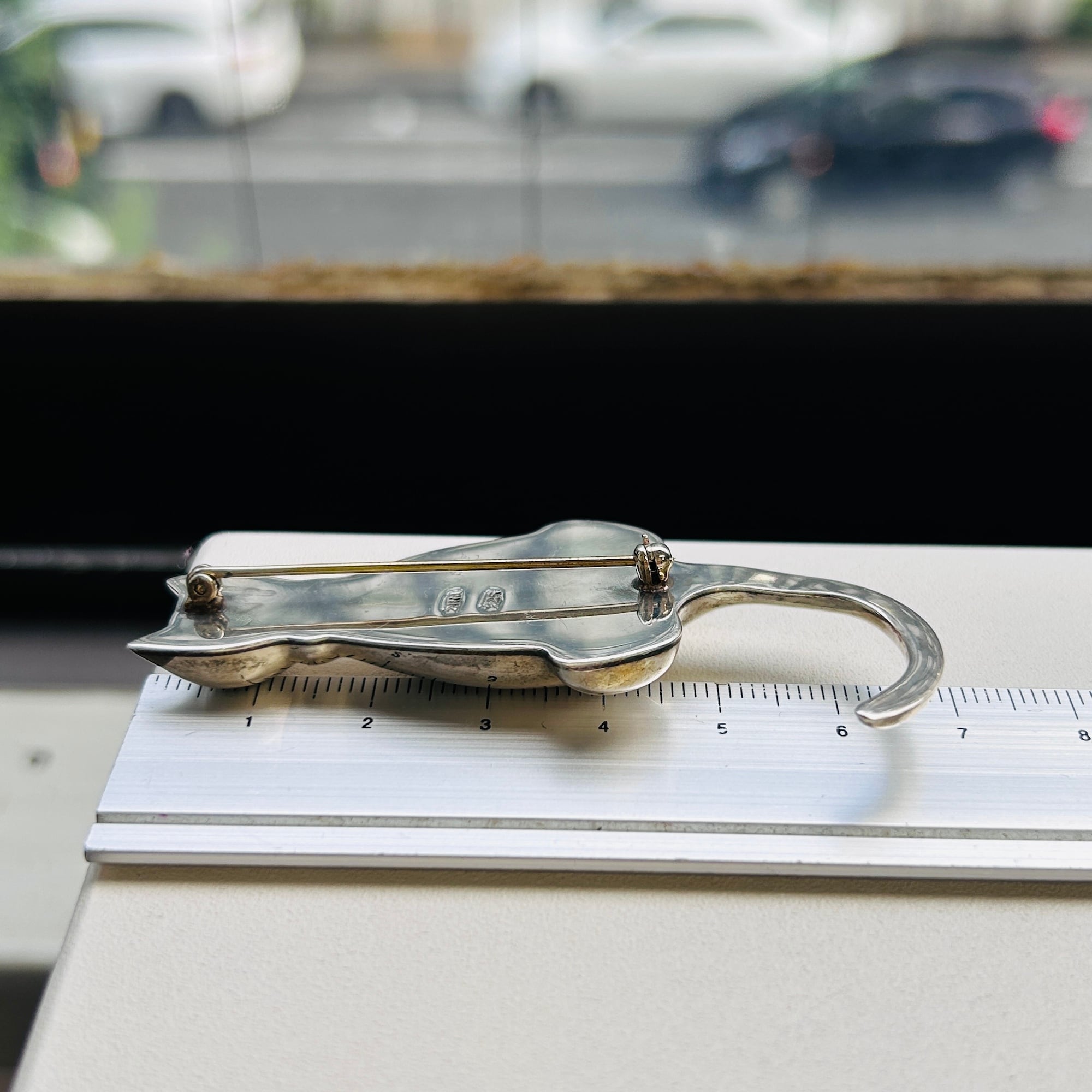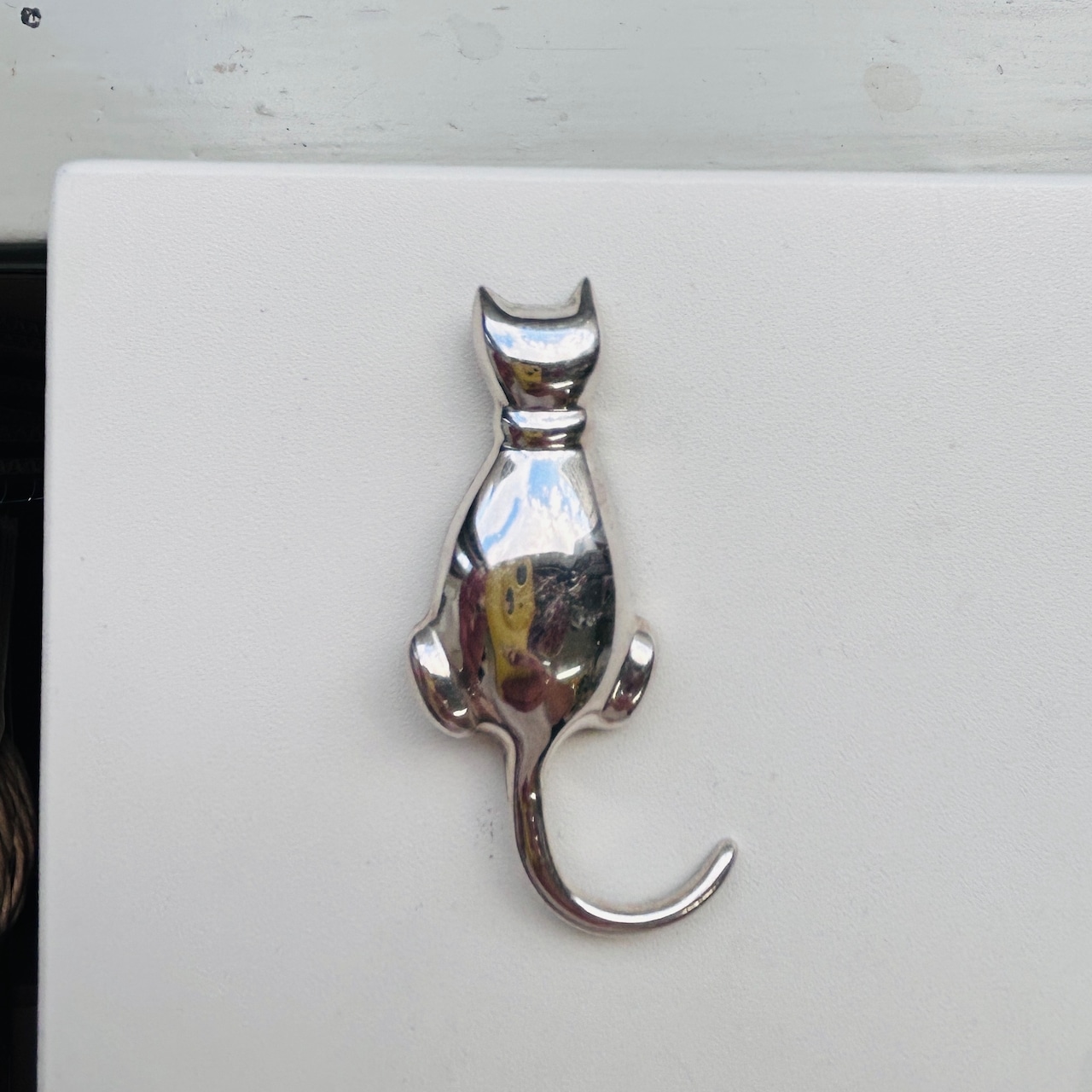 後ろ姿の座りネコブローチ。ツルンとしたボディに丸まった尻尾がポイントです。膨らんでいるのでよく輝き、良く映えます。中は空洞です。表面には多少スレがある程度です。金具の動きに問題ありません。「ZINA」「925」刻印。