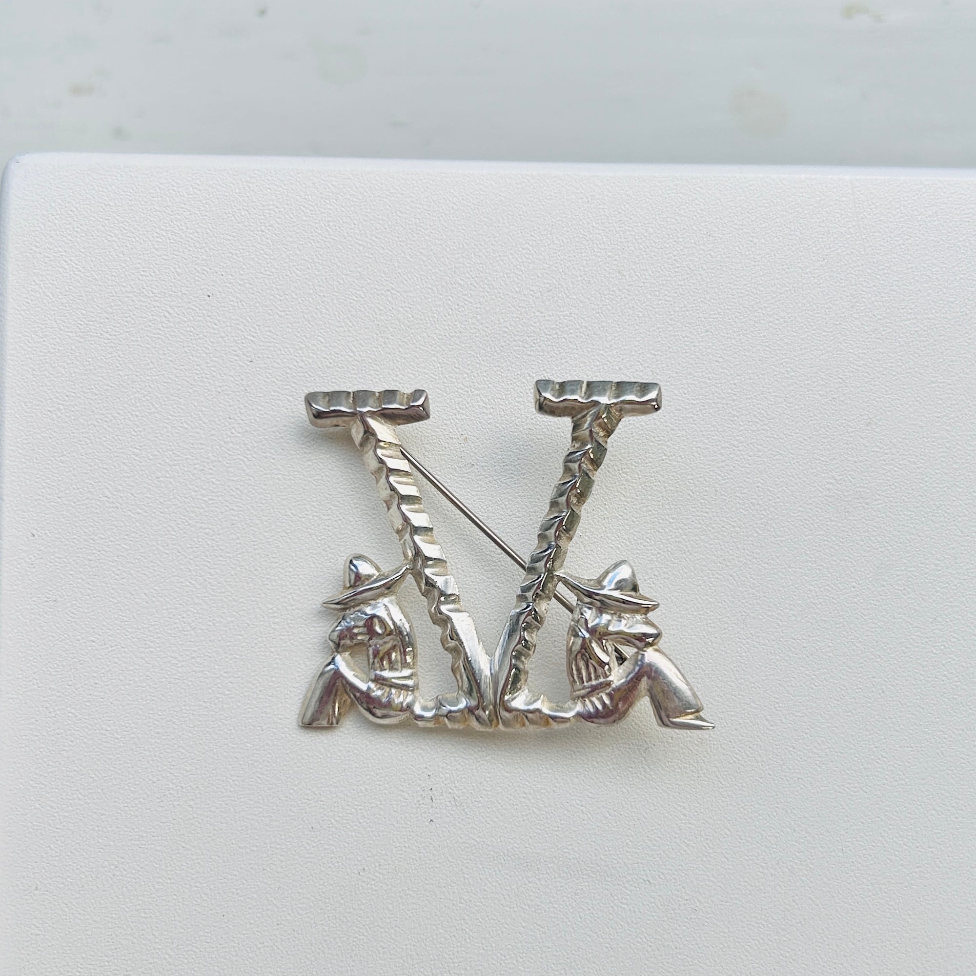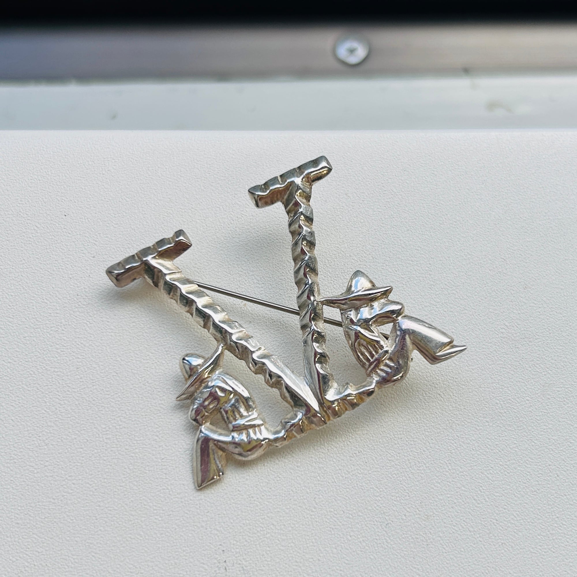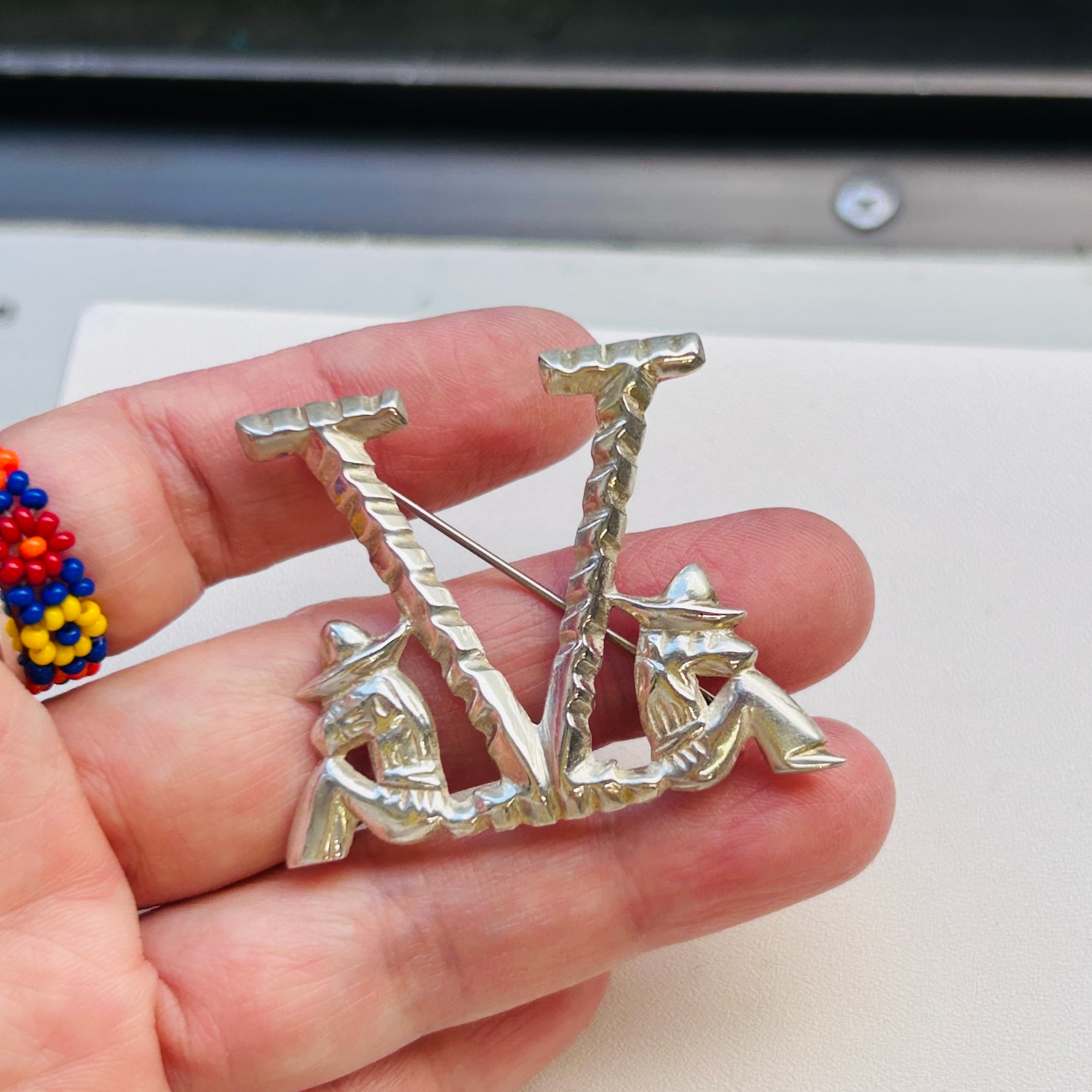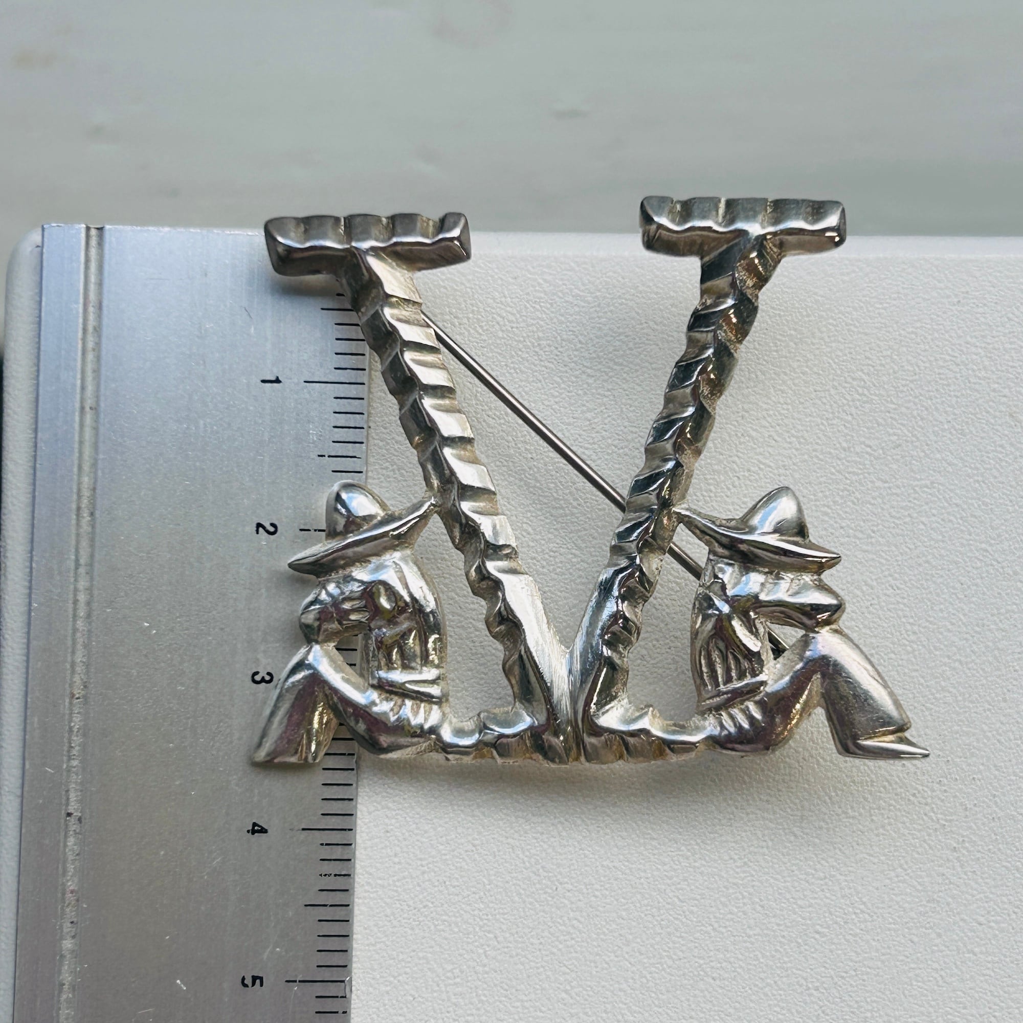 シエスタモチーフのメキシカンシルバーブローチ。ソンブレロ帽を被った男性が座って休憩している様子はメキシコの伝統的なモチーフです。こちらは男性2人、中央のVは何か分かりませんが、スッキリしたアウトラインデザインです。斜めに付いたピンは使いやすいです。金具の動きに問題ありません。裏に「SILVER」「MEXICO」、1920〜40年頃の刻印です。