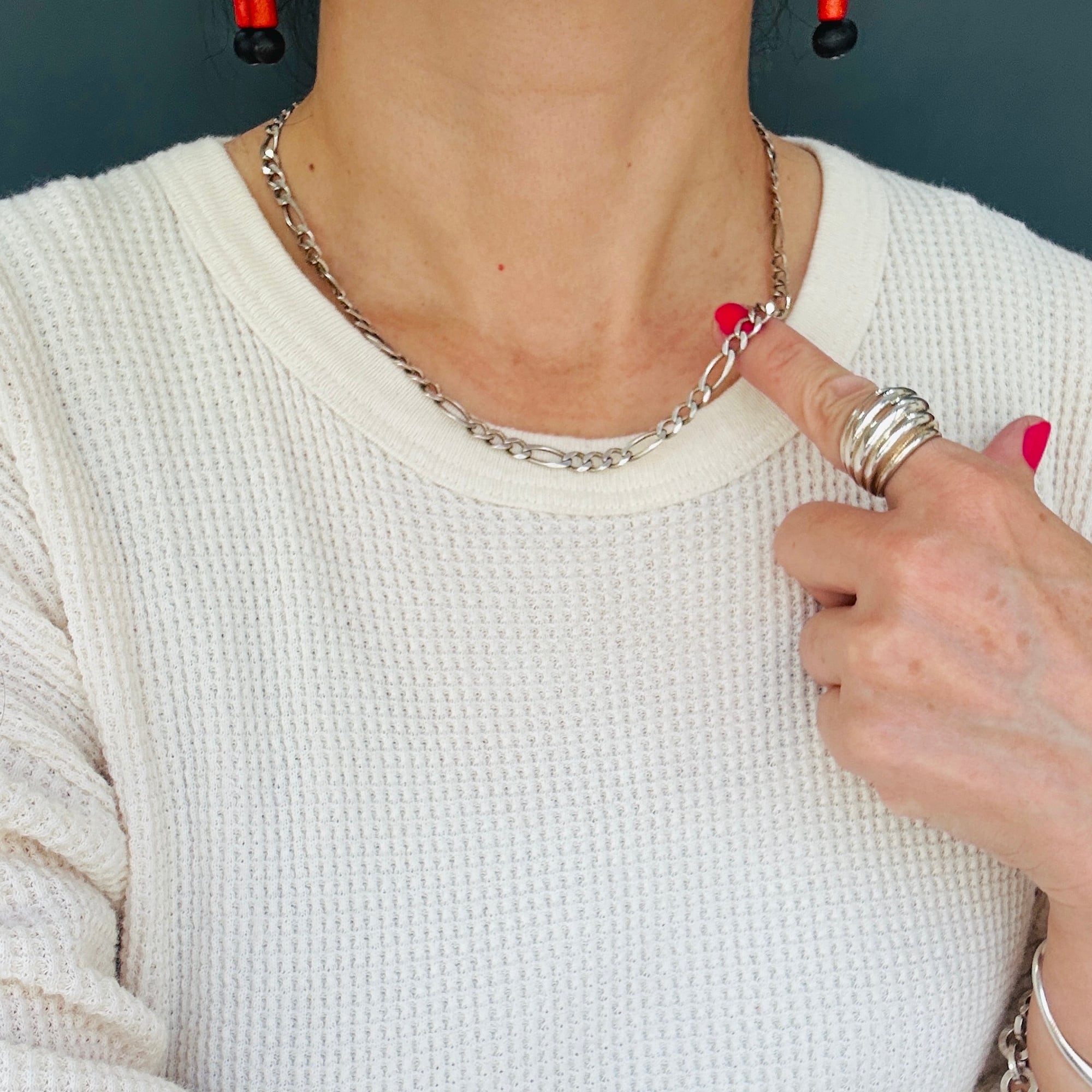 優雅でクールなフィガロチェーンネックレス。男女問わず使っていただけるユニセックスなサイズ感です。楕円コマに金具を引っ掛けてチョーカー風に着けるのもキュート。チャームやパドロックを着けてカスタマイズも楽しいです。チャームを引き立ててくれるクラシックでカッコいい、タイムレスデザイン。ピカピカしすぎないセミマットな落ち着いたグレートンシルバーです。「ITALY」「925」刻印。