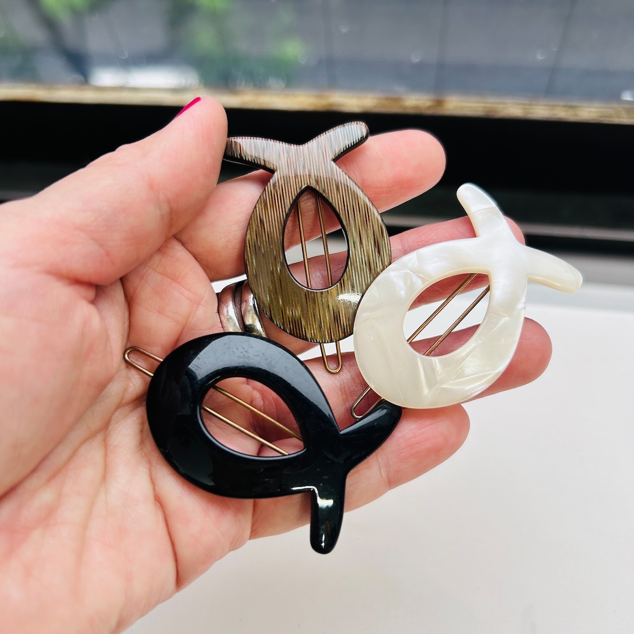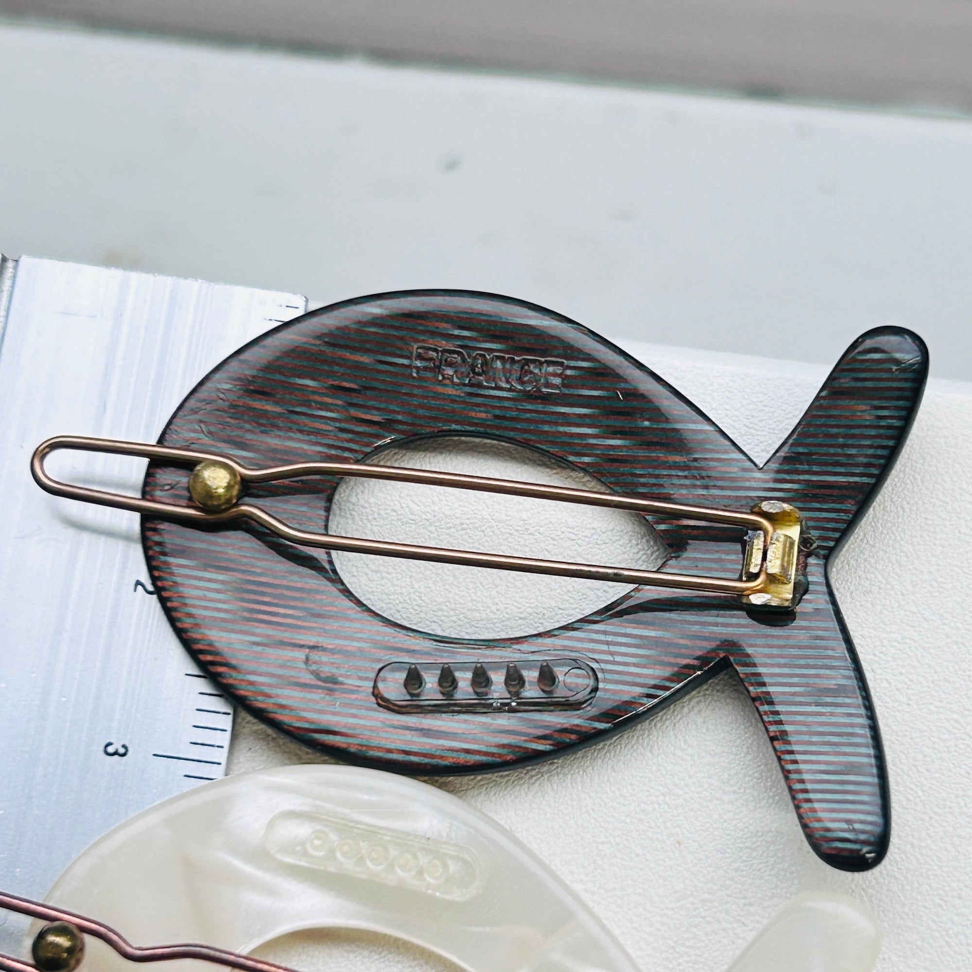 フランスから届いたDEADSTOCK髪留め。可愛いサカナ型。フランスはサカナモチーフが多いです。お守り的な意味合いもあるそうです。私にはリボンぽくも見えて可愛いです。こちらの髪留めはバラ売りです。エマラルドグリーンと茶系MIXの髪留めは「FRANCE」エンボスがあります。全てピンの動きに問題ありません。