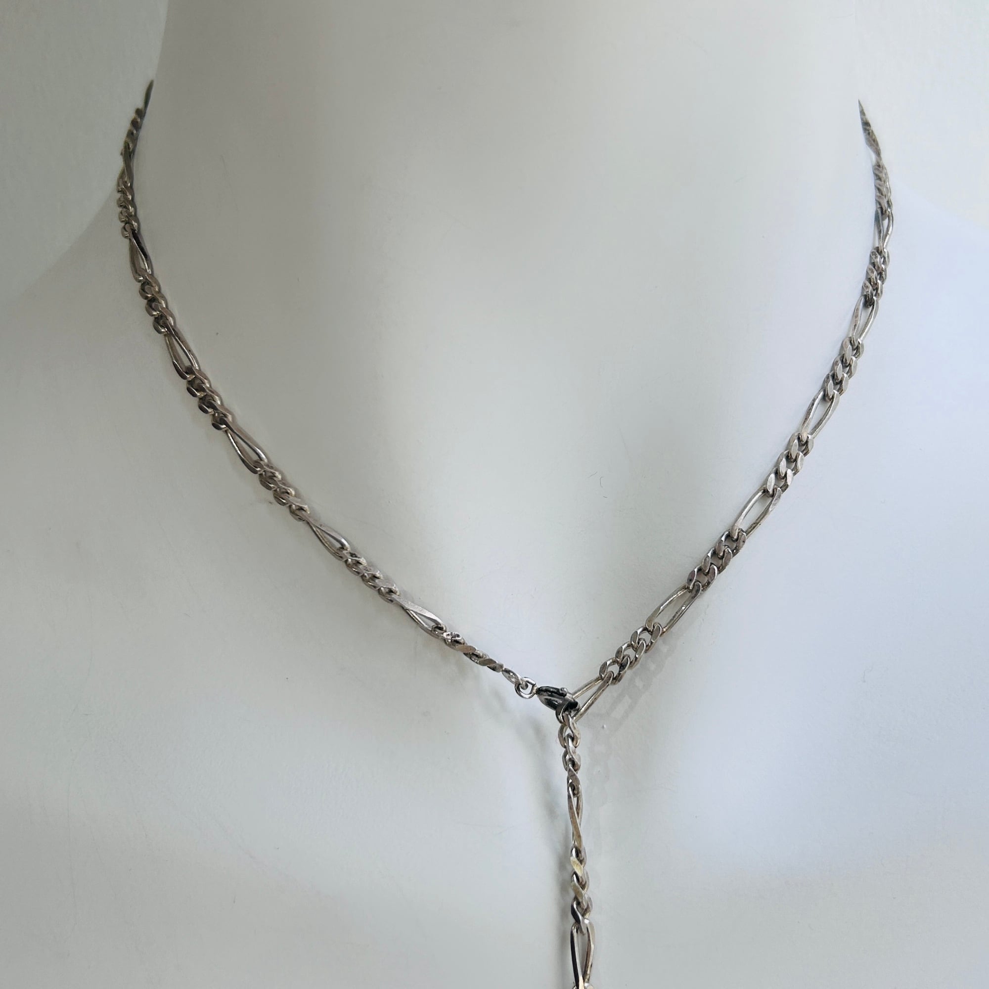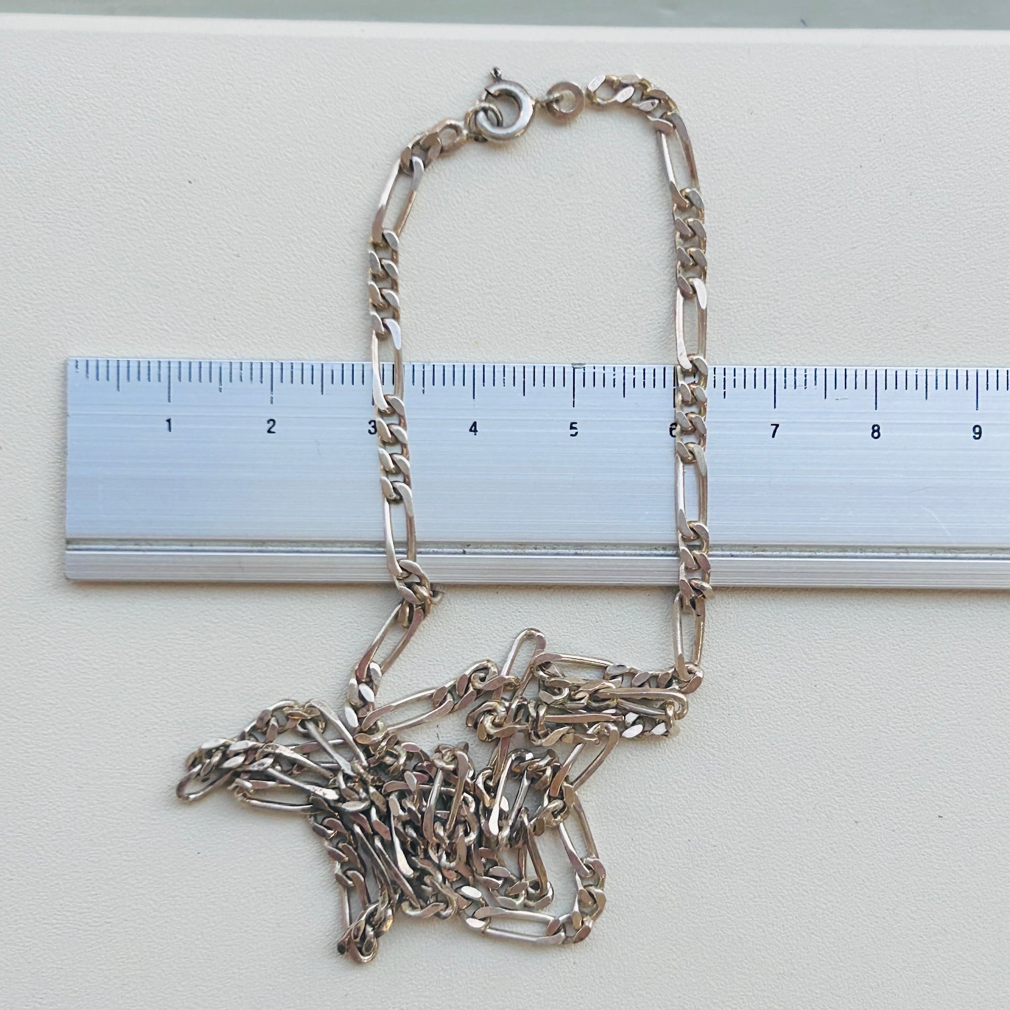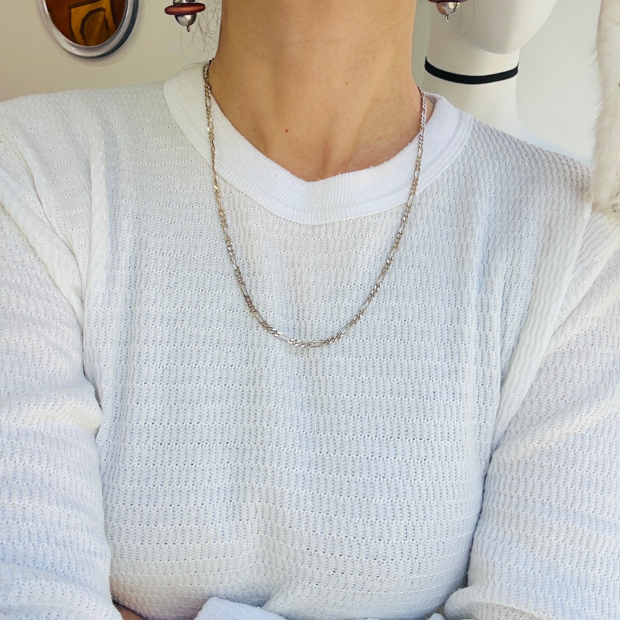 やや長めのフィガロチェーンネックレス。着けるだけで洗練された雰囲気アップの便利なチェーンです。楕円コマに金具を引っ掛けて短くつけたり出来ます。チャームとの相性もとてもいいです。クラシックでカッコいい、タイムレスデザイン。ピカピカしすぎない落ち着いたシルバーです。フランスメーカーマークとミネルヴァのような、、読み取れない刻印。