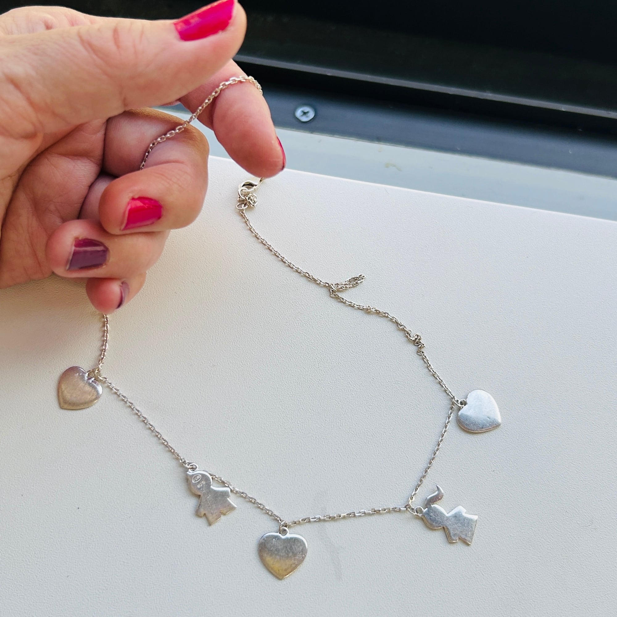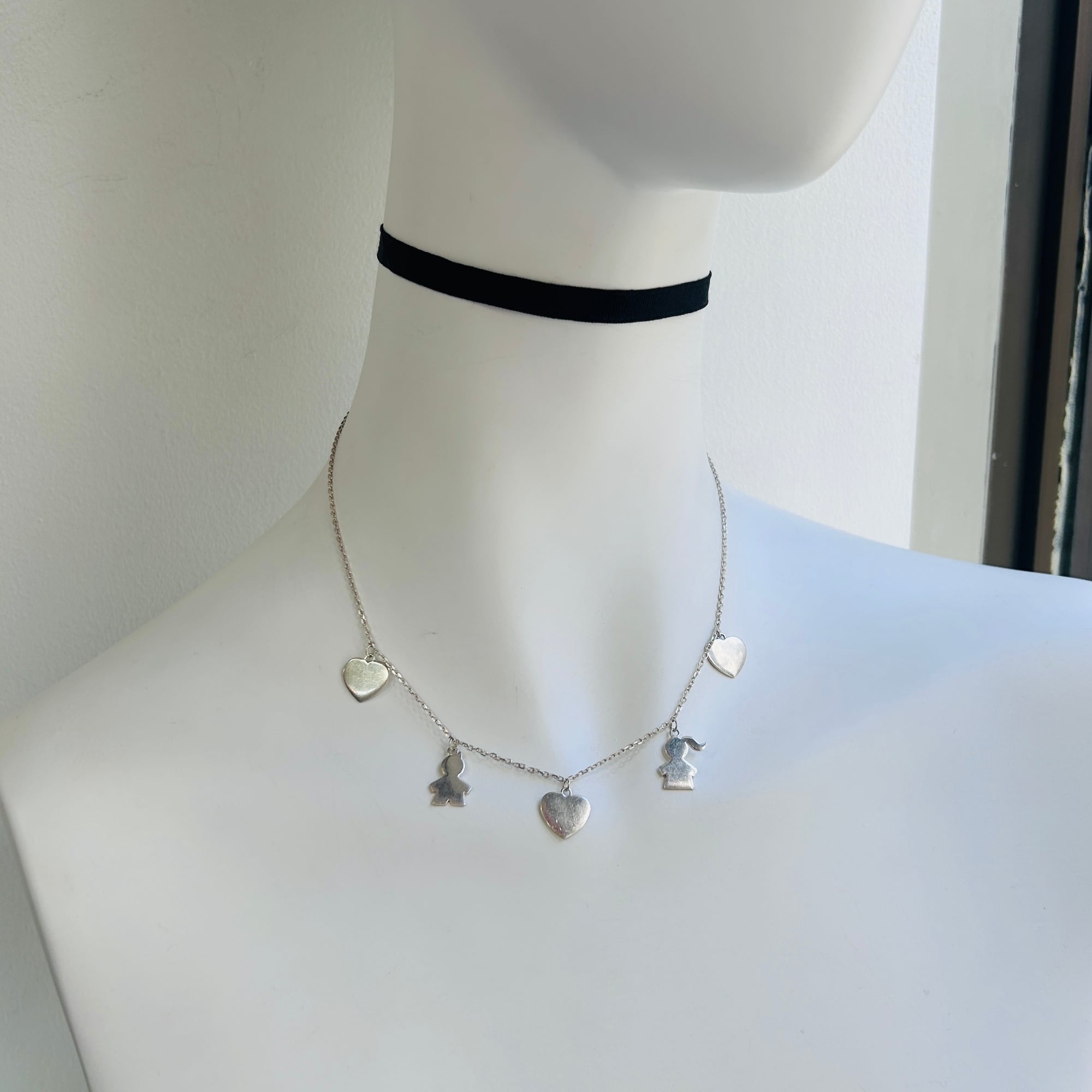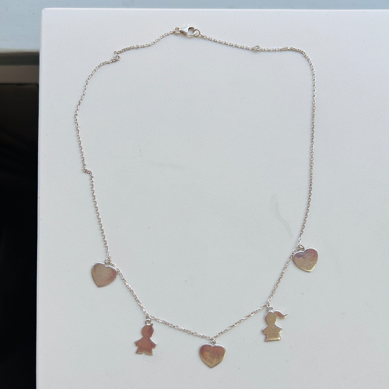 フランスから届いたネックレス。ハートと男の子、女の子チャームが付いています。緩いカタチのチャームで可愛い。男の子女の子のお母さんにいかがでしょう?チャームはしっかりしたソリッドシルバーで重量感ありますので胸元にしっかり落ち着いてくれます。チェーンの途中に丸カンが付いていますので短めで着用可。丸カンはロウ付けされていますので開きません。チャームの表面は薄いスレあります。男の子チャームの裏に「925」とフランスメーカーマーク。留め具にも「925」。