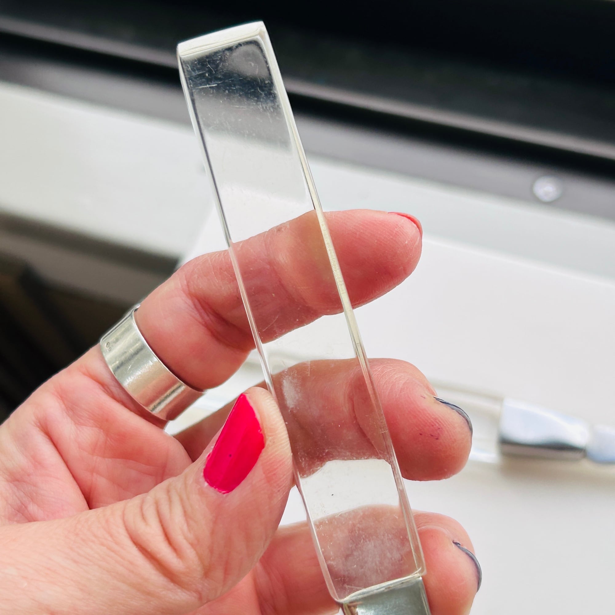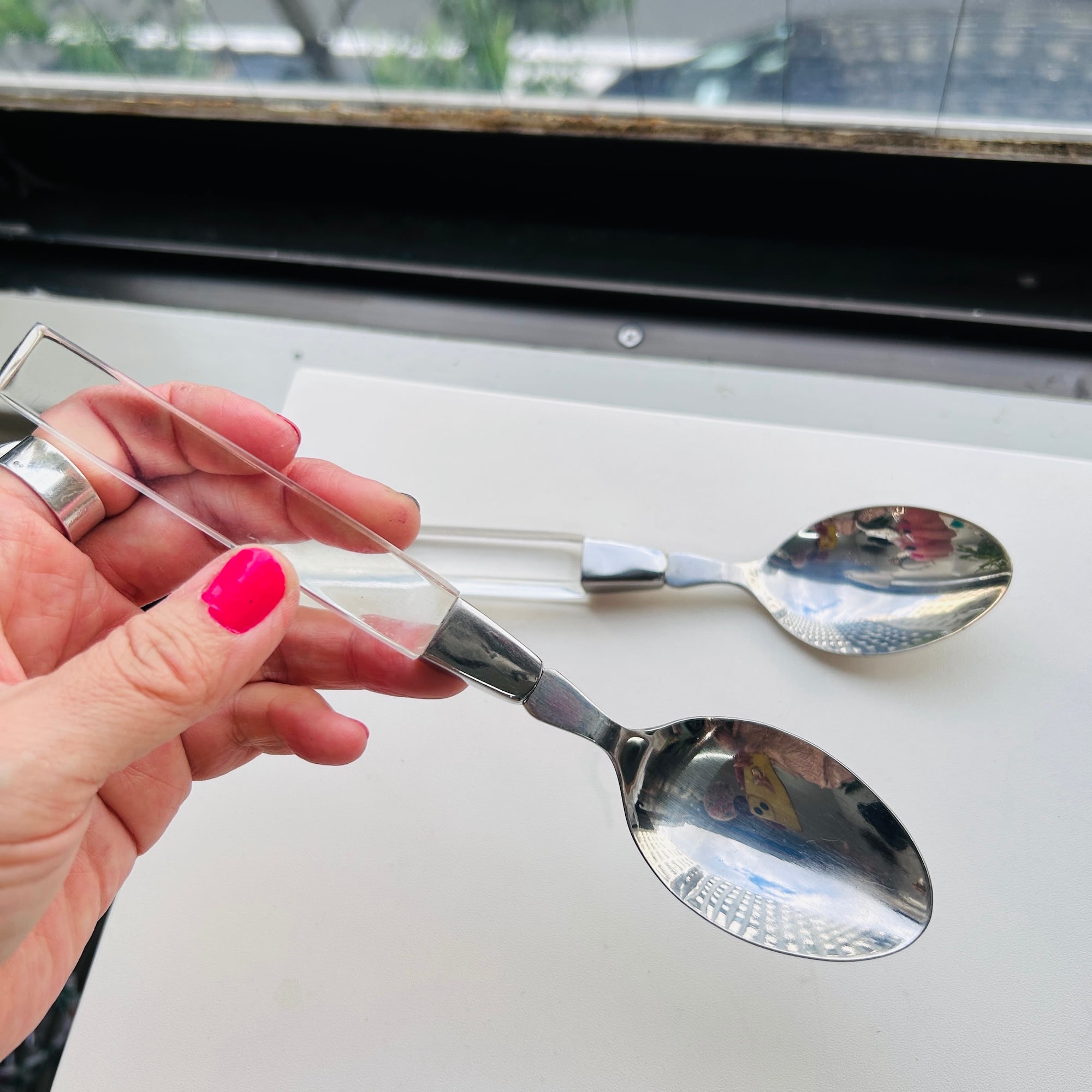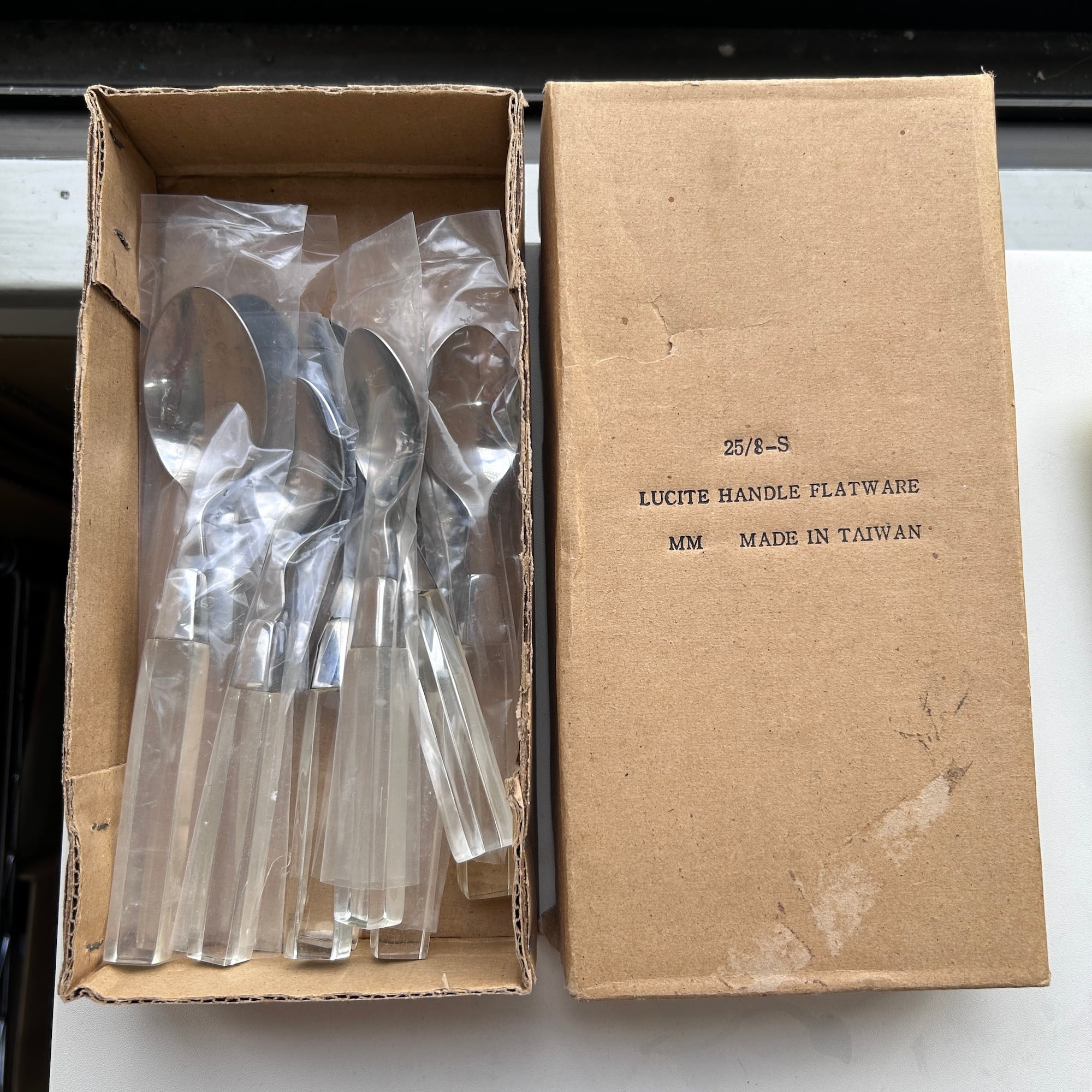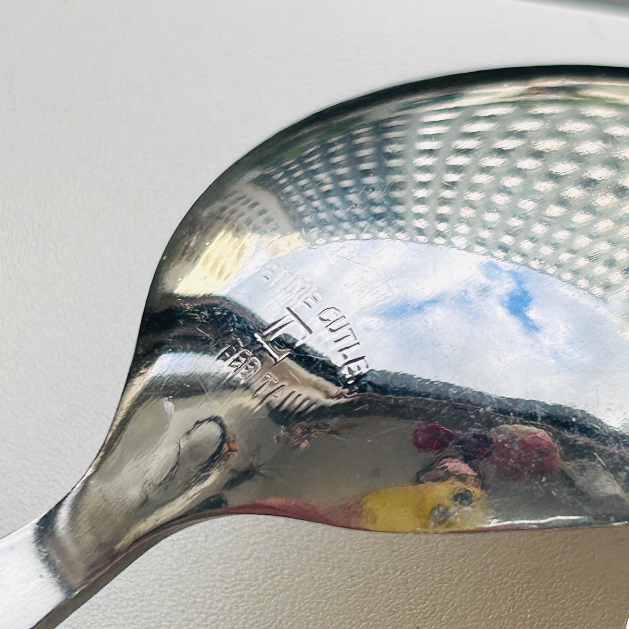 キレイに保管されていた70〜80年代のスプーン。私が大好きなクリアルーサイトハンドルです。模様なしのスクエアシェイプ、ミニマルデザインがお気に入りポイントです。カレーを食べるのに丁度いい大きめサイズです。美味しいモノを食べる時に使って頂けたら幸福感がさらにアップします:)袋に入って保管されていましたがが、昔のモノです。極薄いスレなどご容赦ください。