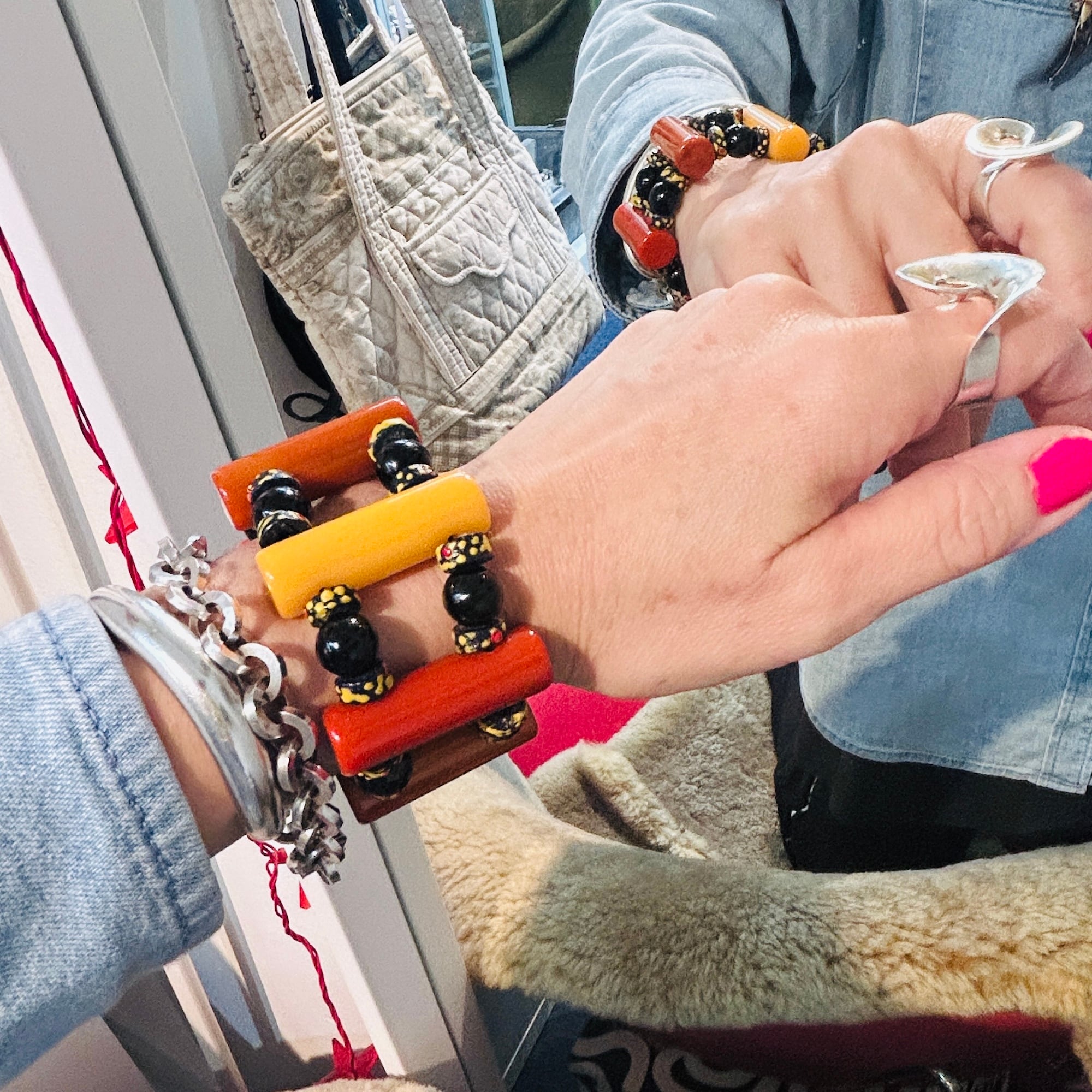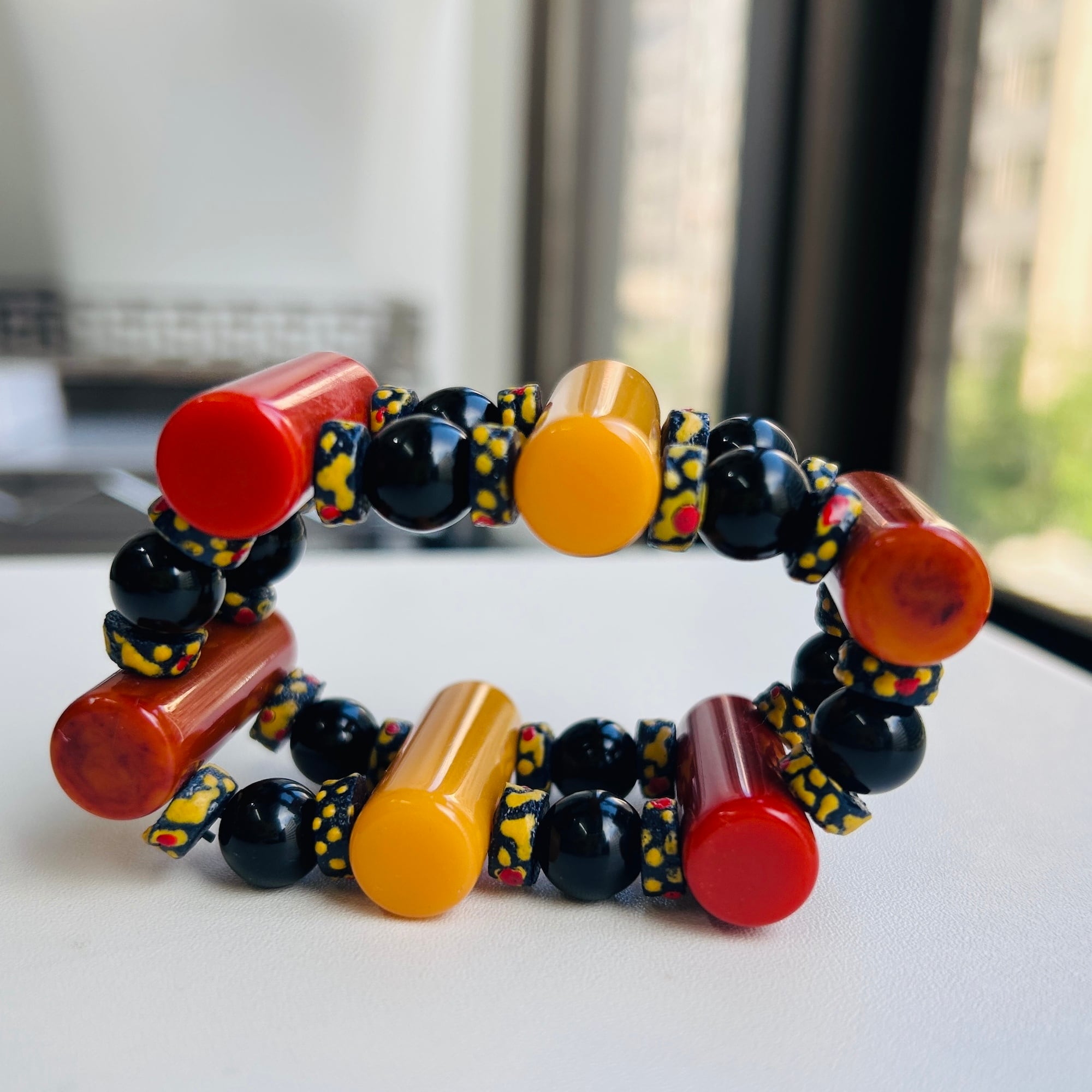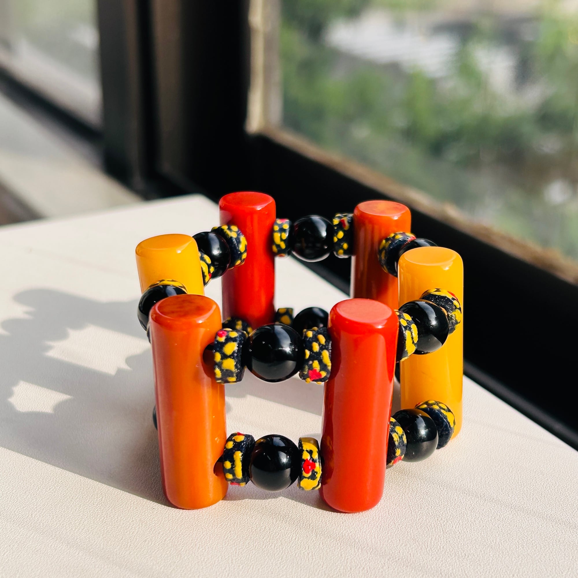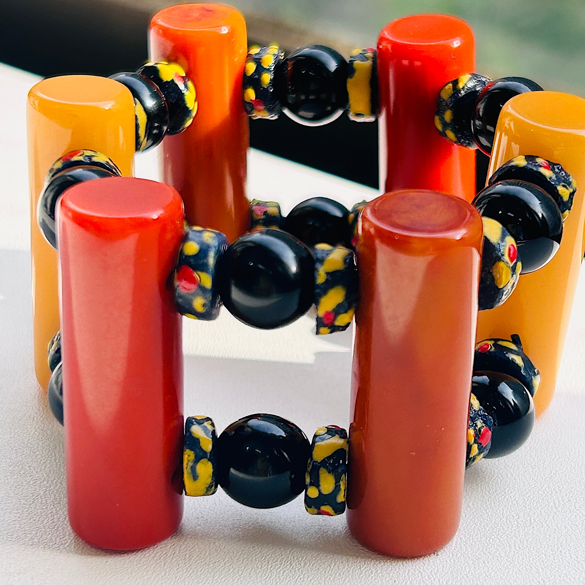 Vintage ベークライトビーズを用いたhandmadeブレスレット。暖色系の円柱ビーズがベークライトです。間に使われた模様入りビーズもキュート。オリジナリティある可愛いデザインです。
