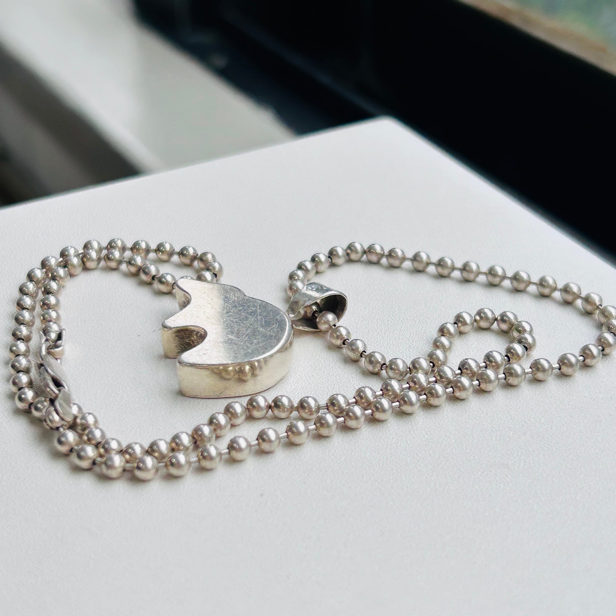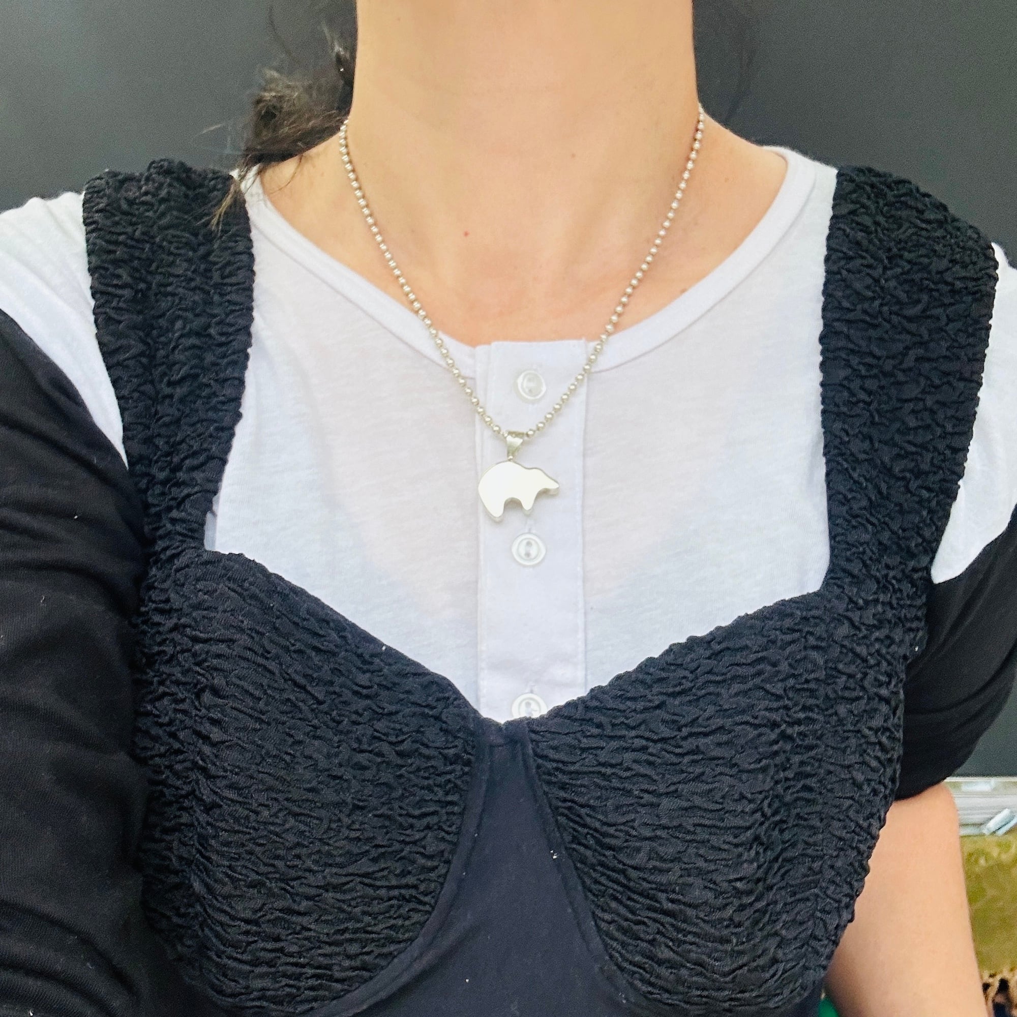 可愛いクマチャームネックレス。クマは厚み約6mm、ゴロンとしたソリッドシルバーです。ベイルはボディと接合していて動きません。ボールビーズチェーンとの相性GOODなネックレスです。ボールビーズは直径3mm、しっかりした作り。単体でも使える便利なチェーンです。ロングチェーンやもっと短いチェーンとの重ね着けも可愛いと思います。クマに「MEXICO」「925」、チェーンは「ITALY」「925」。一度クリーニングしました。磨けばもっとツヤピカになると思います。お届け前にもう一度キレイにしてお届けしますね。
