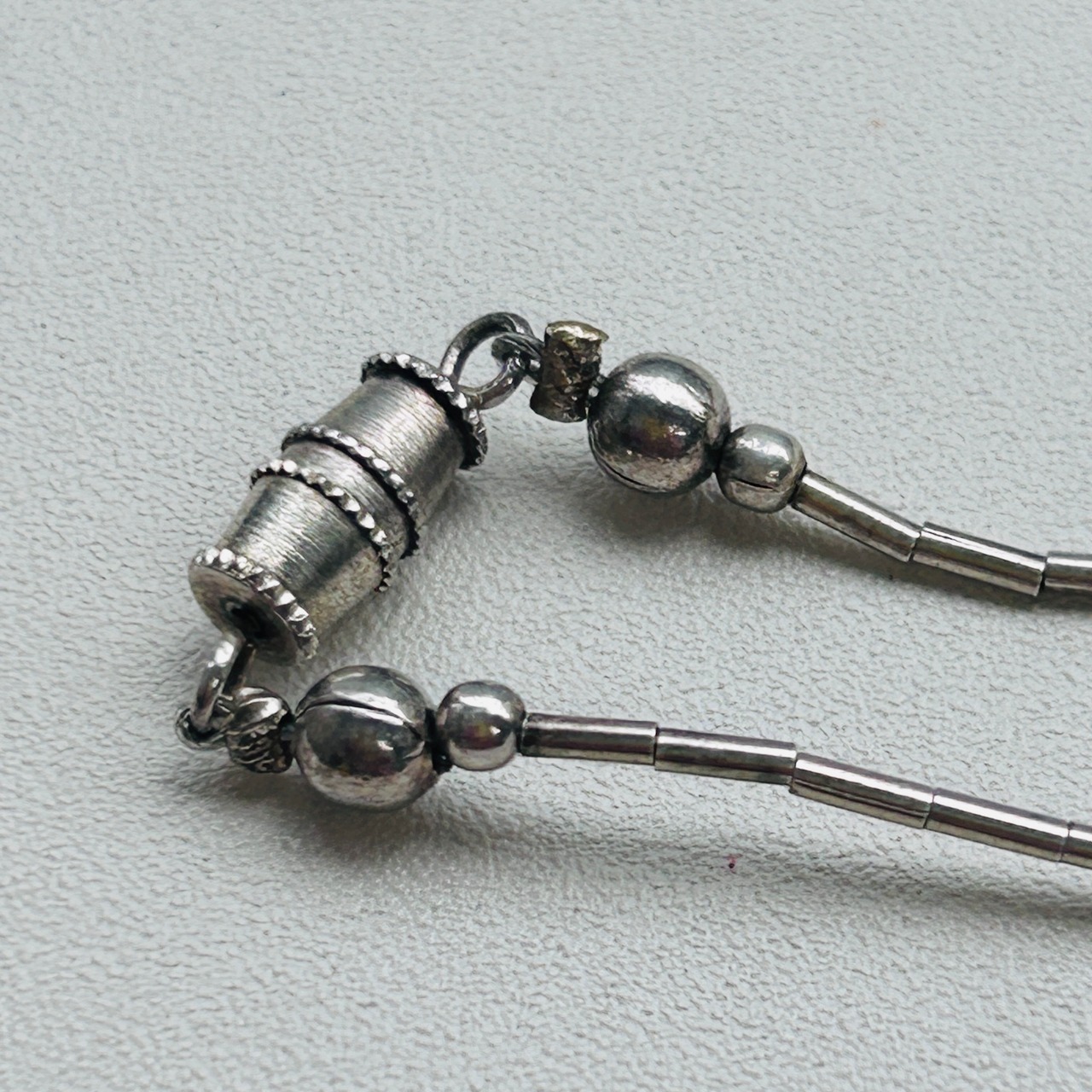 不揃いなシェルビーズとシェルバード、オールホワイトビーズとシルバーのスッキリカラーなネックレスです。首周りがデコラティブになってすごく可愛いデザインです。リキッドシルバービーズは首でチクチク感じず着けやすいです。写真4・一箇所曲がった跡がありますが着けると首の再度より後ろの方に位置するので気になりません。バレル型留め具は2つを合わせてネジネジ回すと締まります。ビーズの中はワイヤーです。