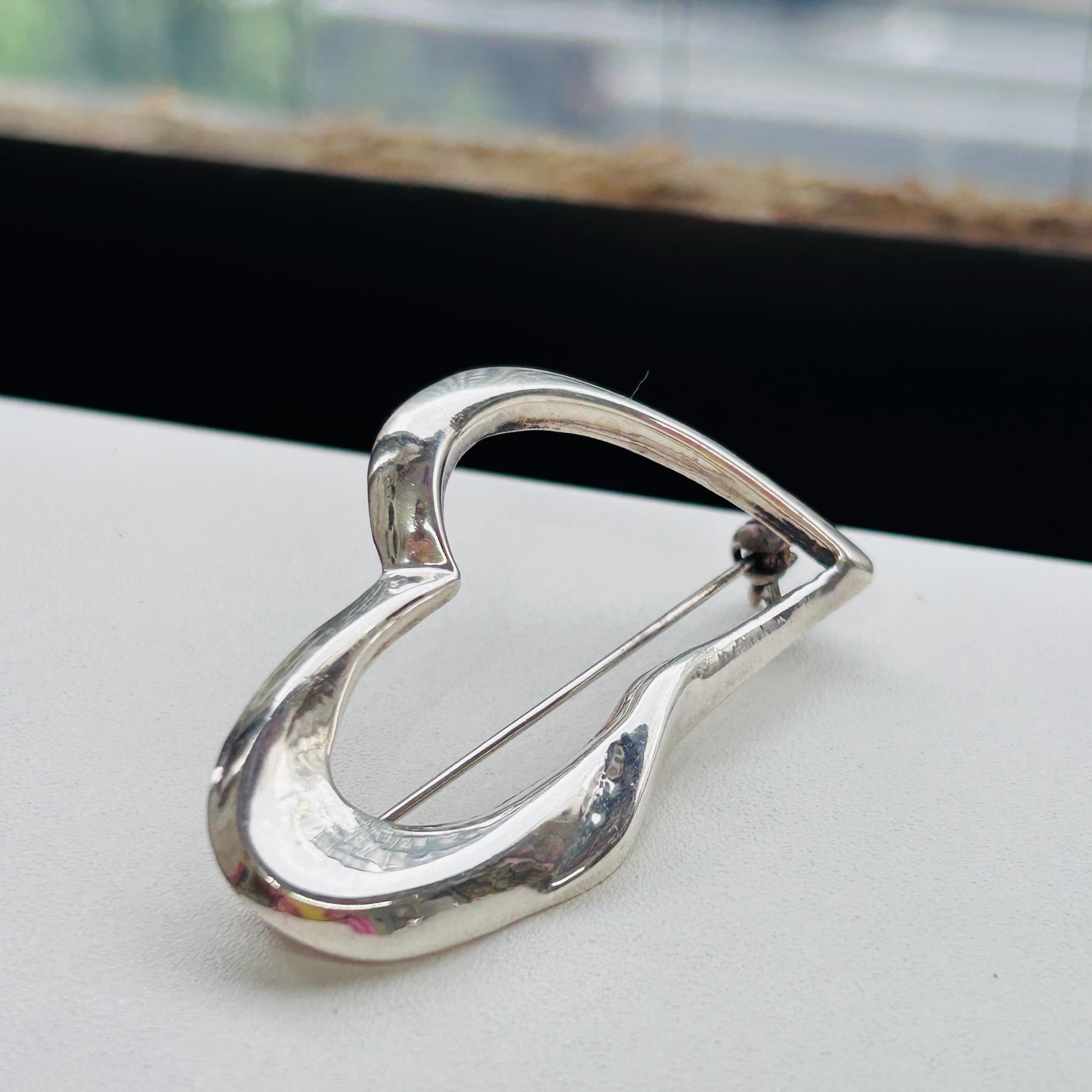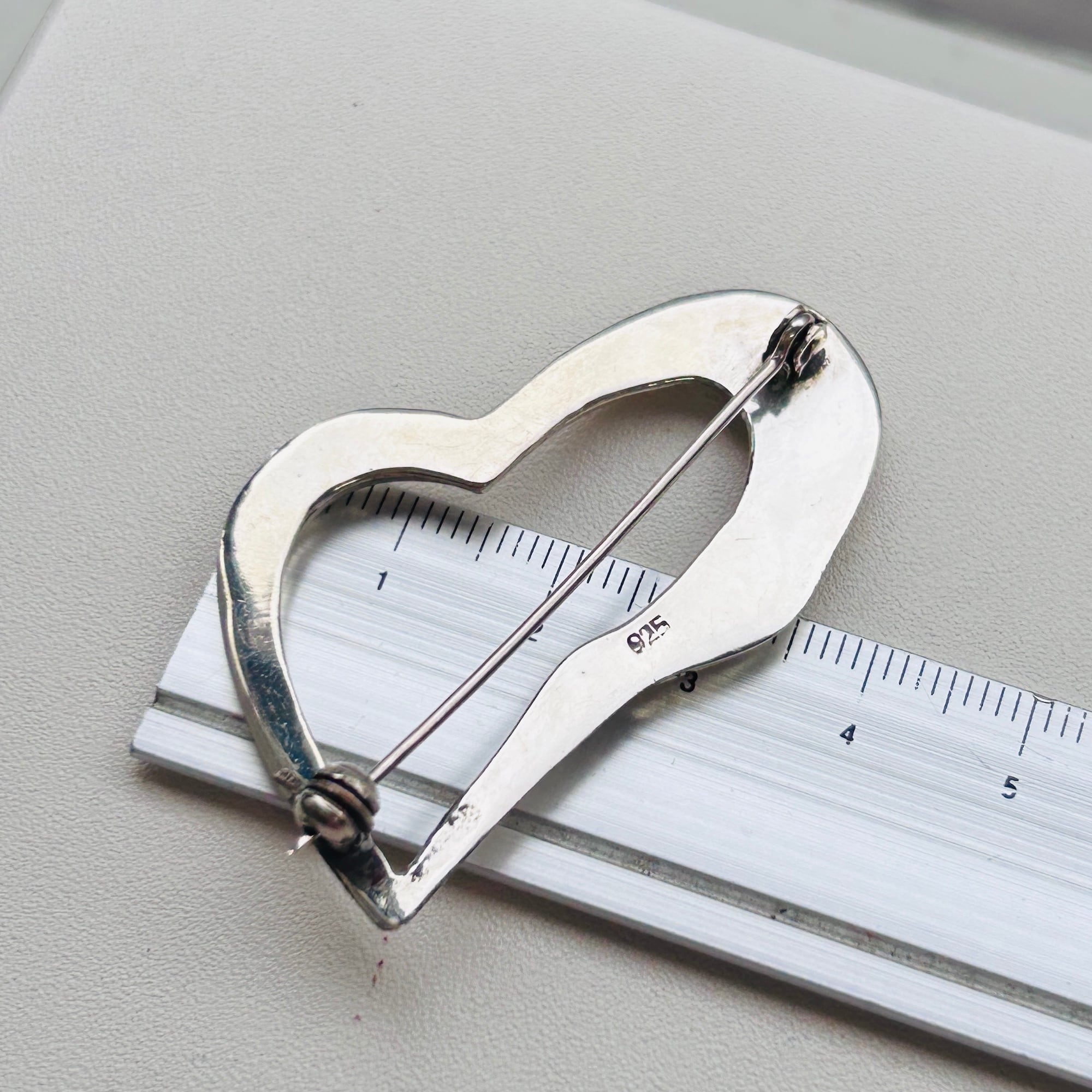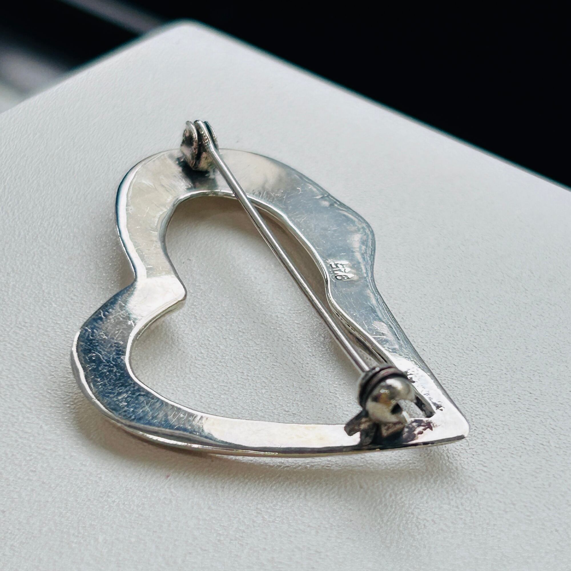 少しヒネリの入ったハートブローチ。ハートはちょっと抵抗あるけど、、ハート可愛い、という方にオススメです。中は空洞で内壁も薄そうな、軽い作りです。針は長く使いやすいです。金具に問題ありません。「925」刻印。