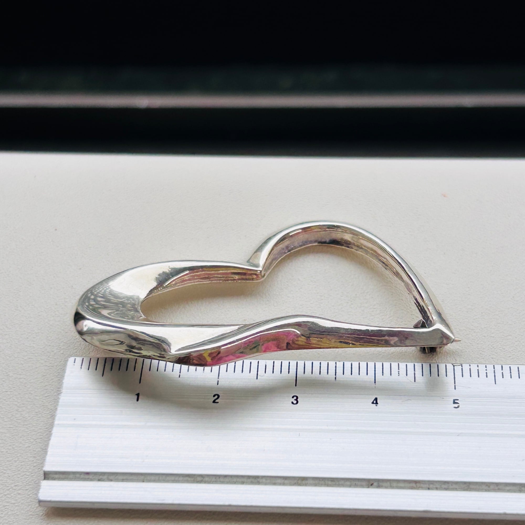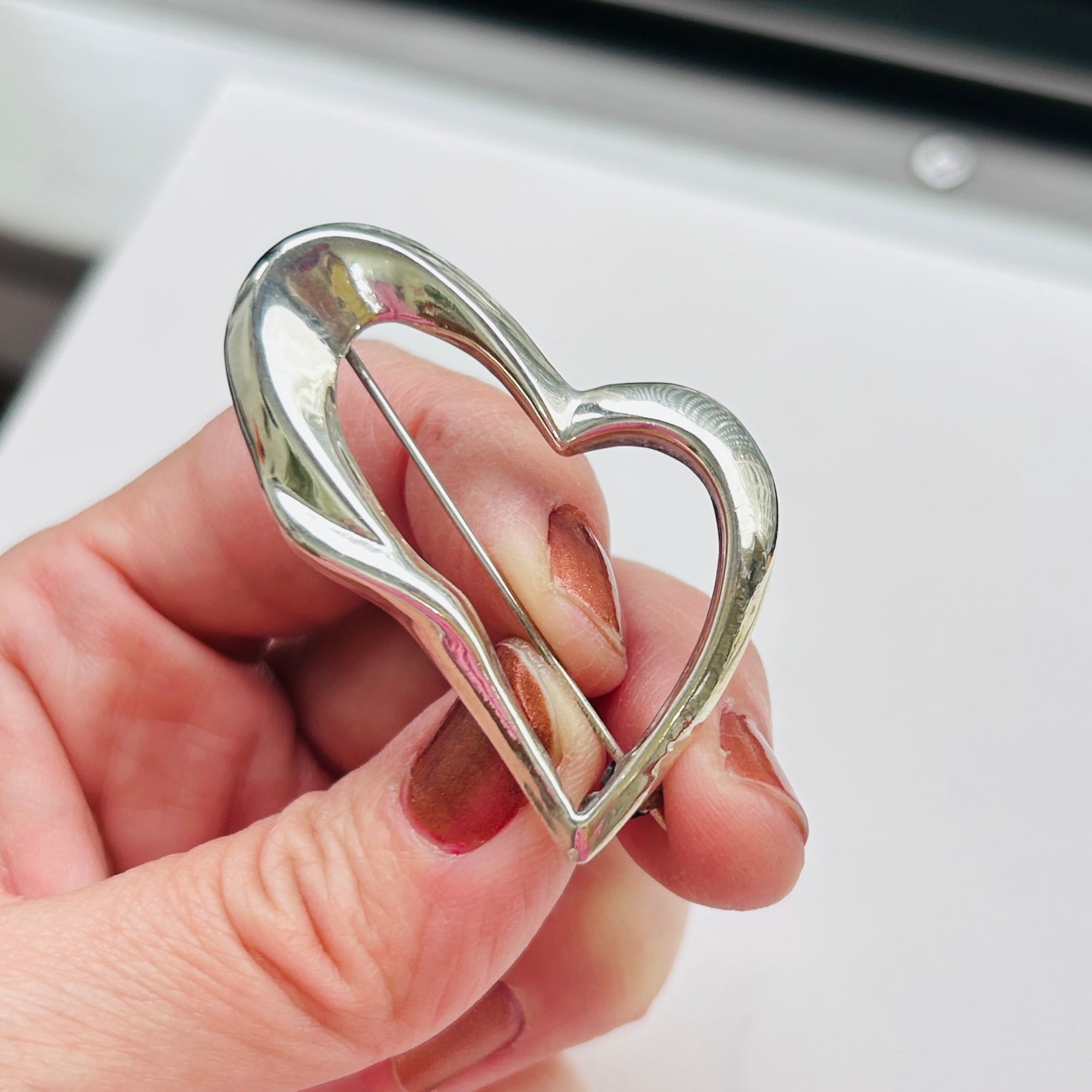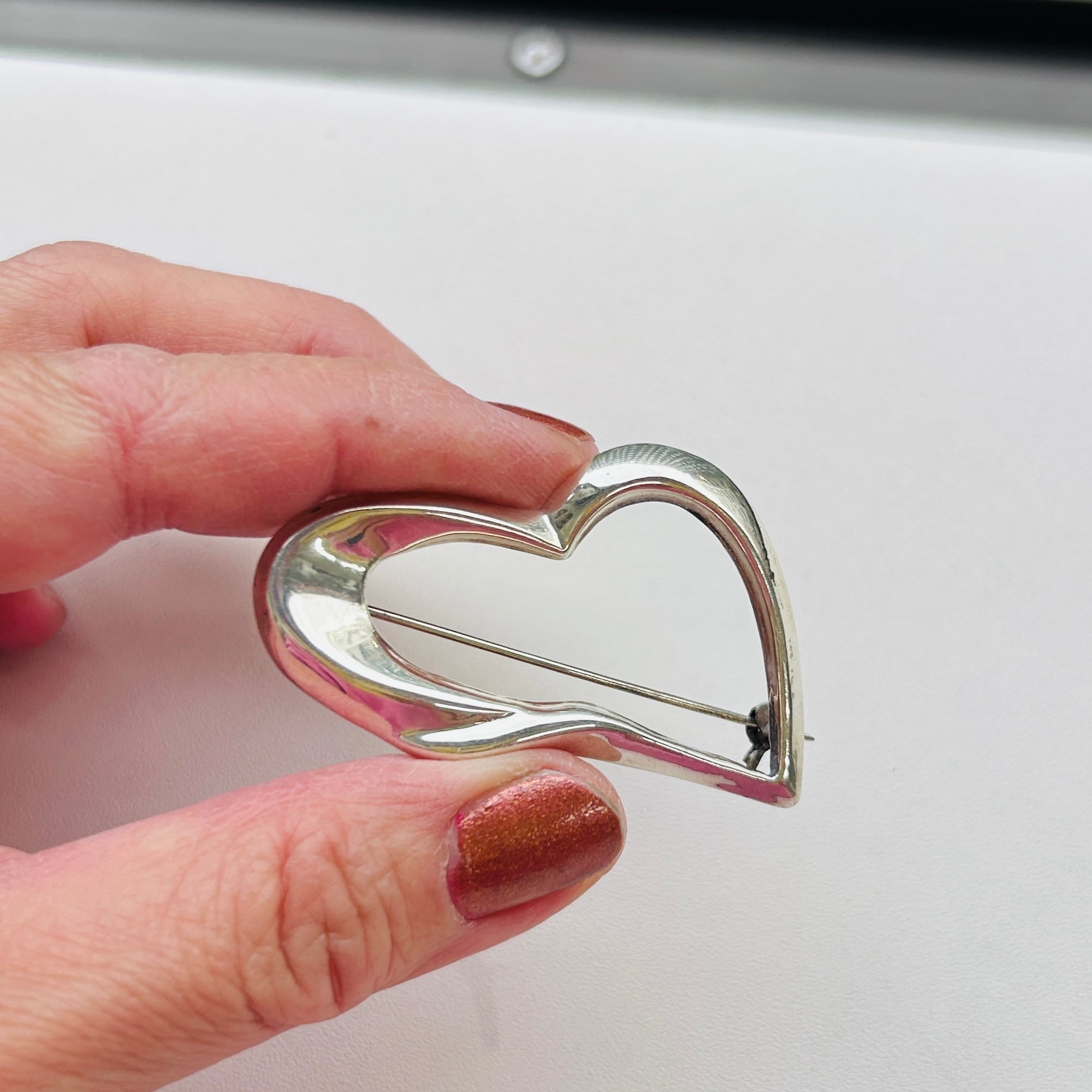 少しヒネリの入ったハートブローチ。ハートはちょっと抵抗あるけど、、ハート可愛い、という方にオススメです。中は空洞で内壁も薄そうな、軽い作りです。針は長く使いやすいです。金具に問題ありません。「925」刻印。