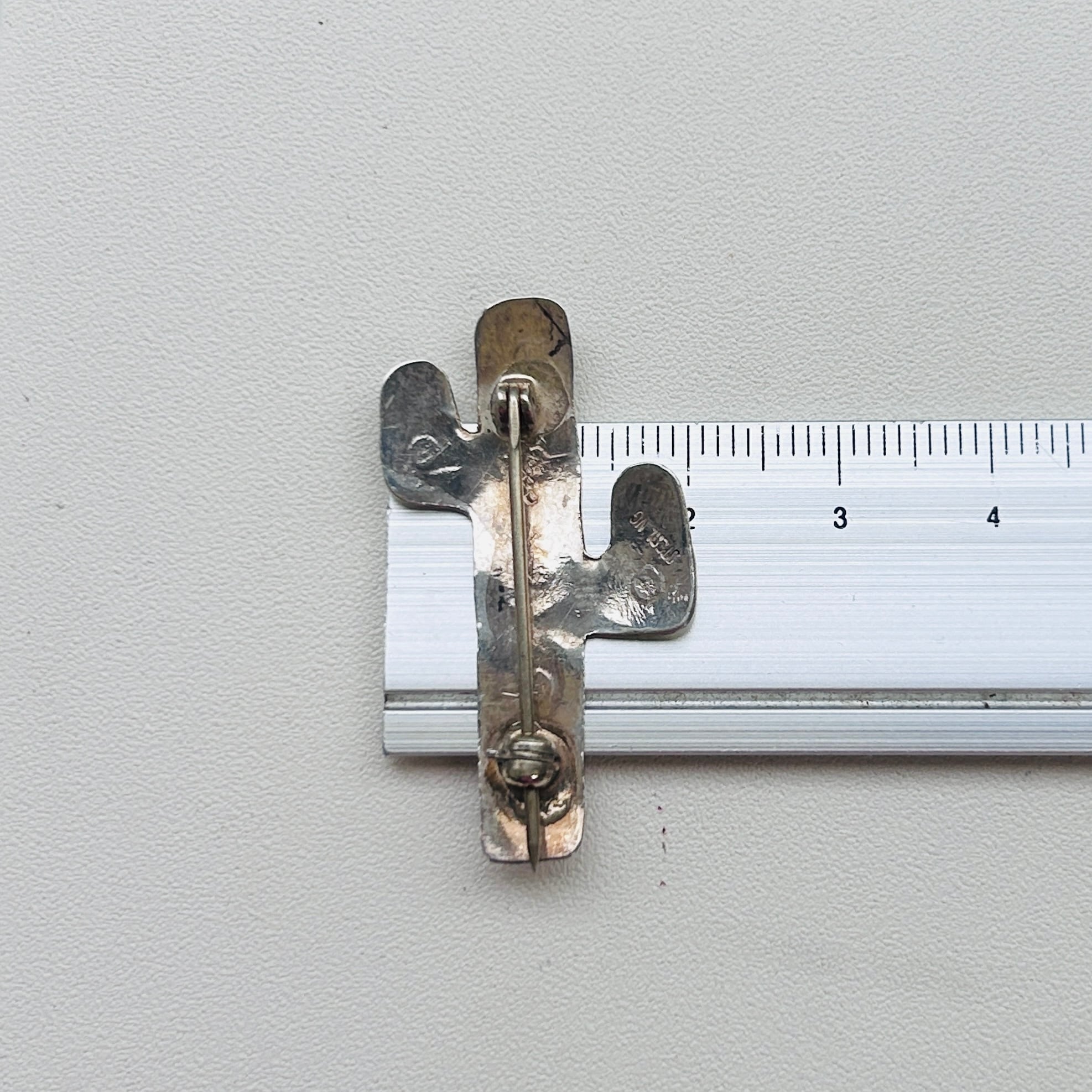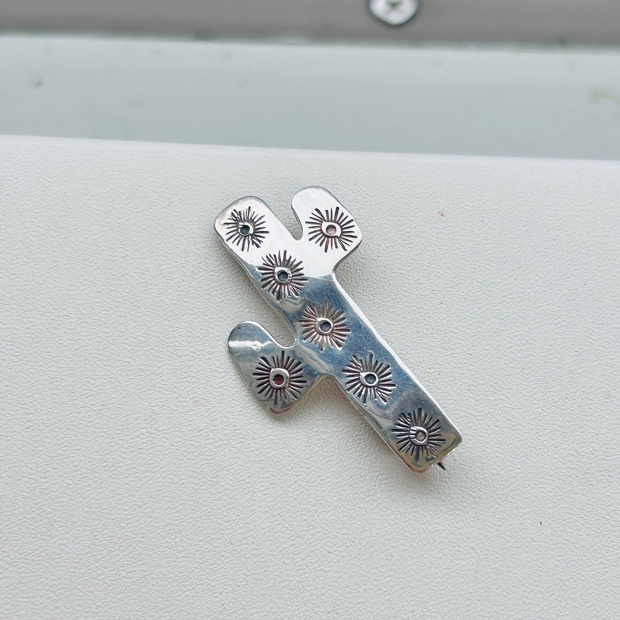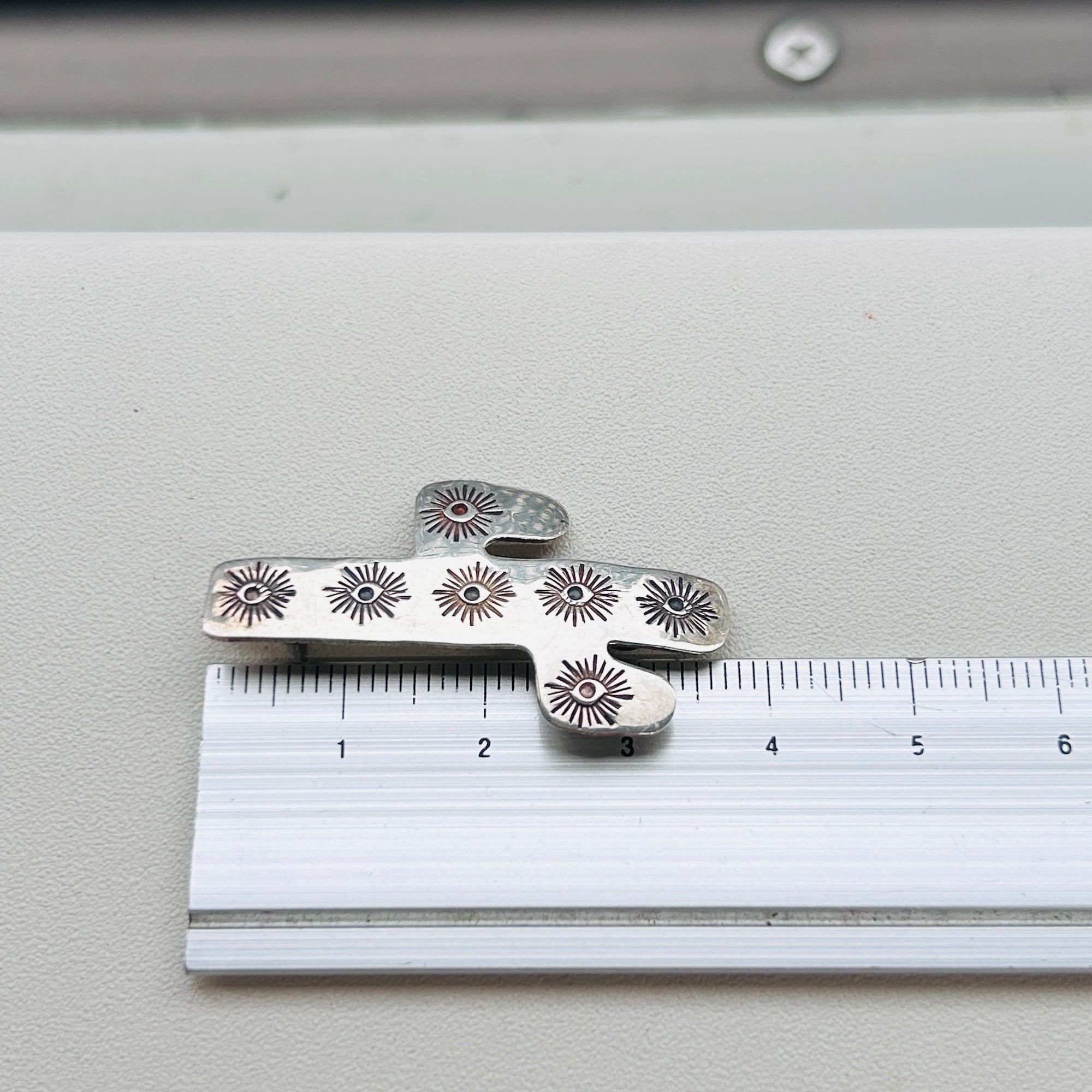 小さくて可愛いサボテンブローチ。薄いシルバーに太陽のようなスタンプワークです。ネイティブアメリカンらしいハンドメイドの素朴さのある小さくて愛らしいブローチです。裏に作家マークと「STERLING」。