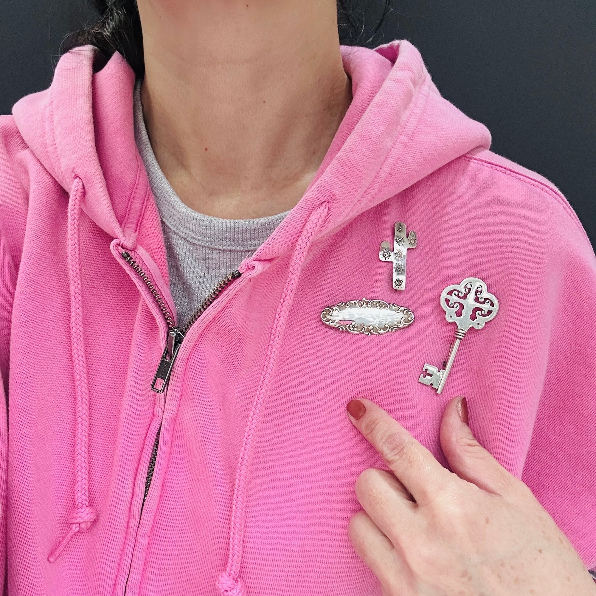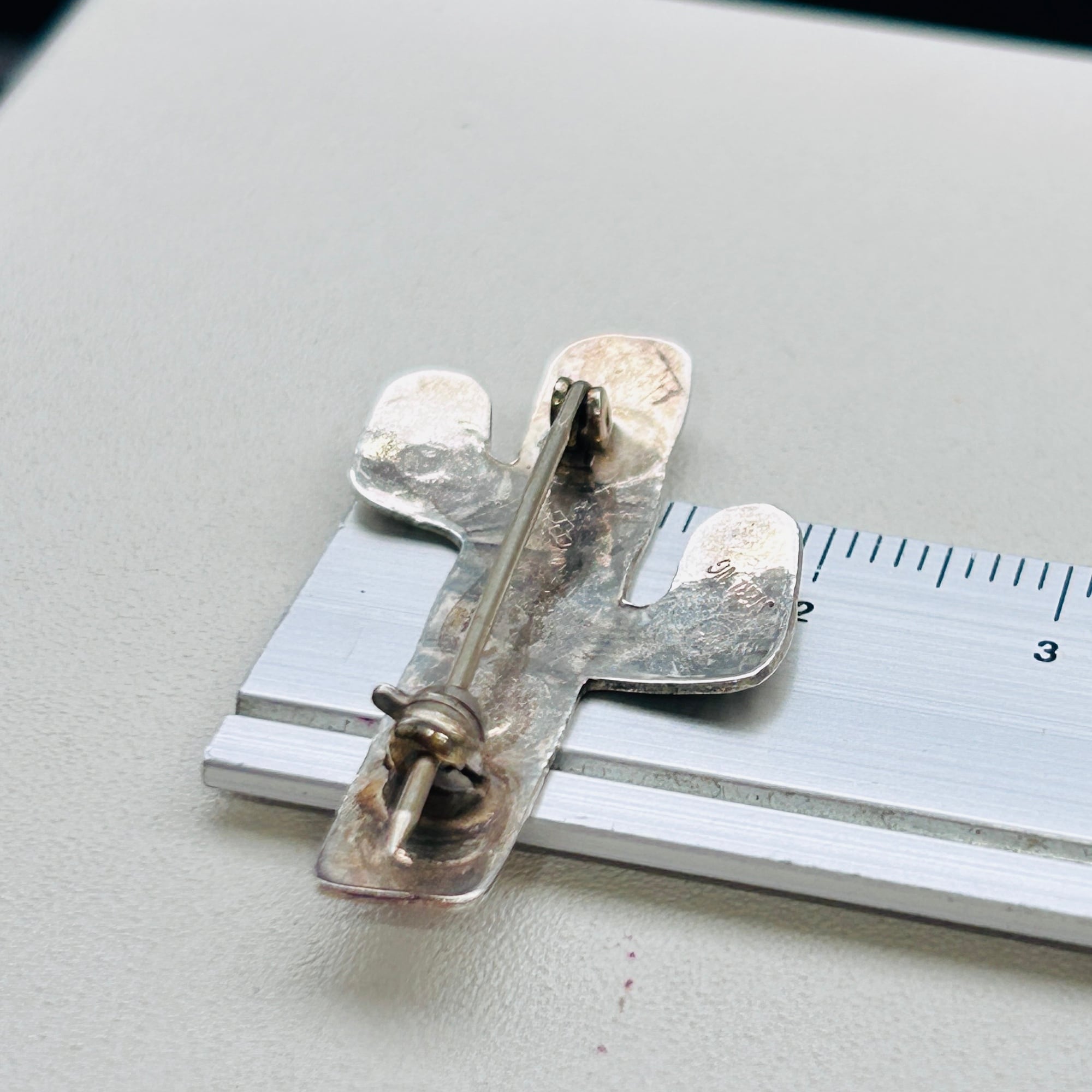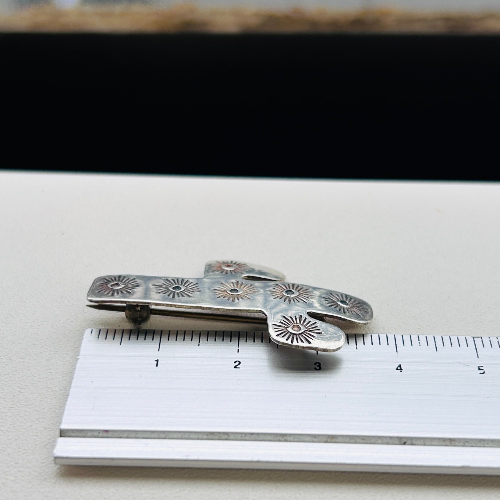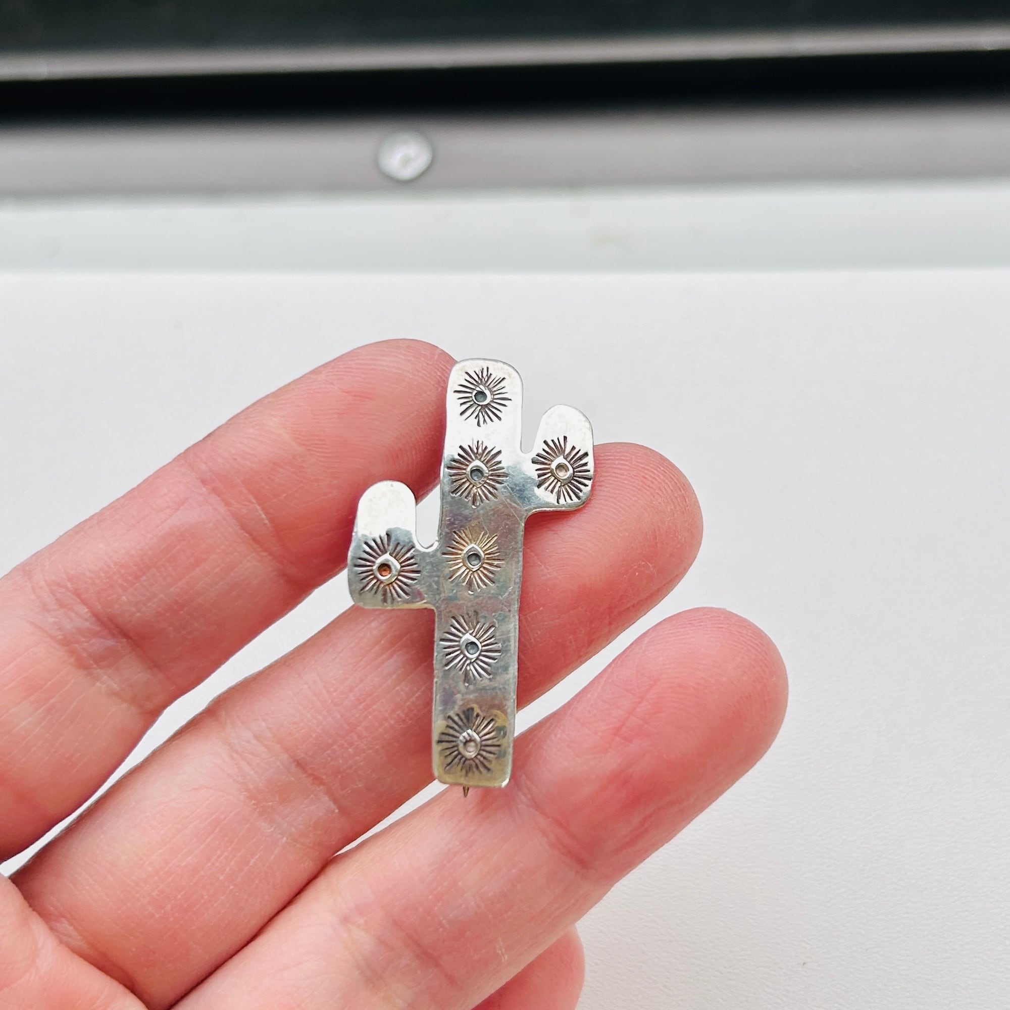 小さくて可愛いサボテンブローチ。薄いシルバーに太陽のようなスタンプワークです。ネイティブアメリカンらしいハンドメイドの素朴さのある小さくて愛らしいブローチです。裏に作家マークと「STERLING」。