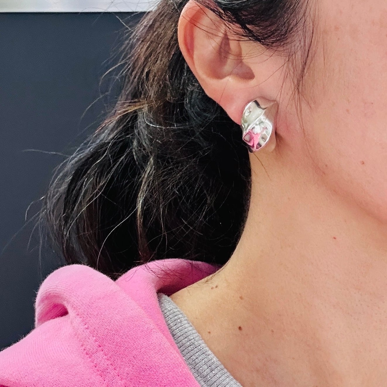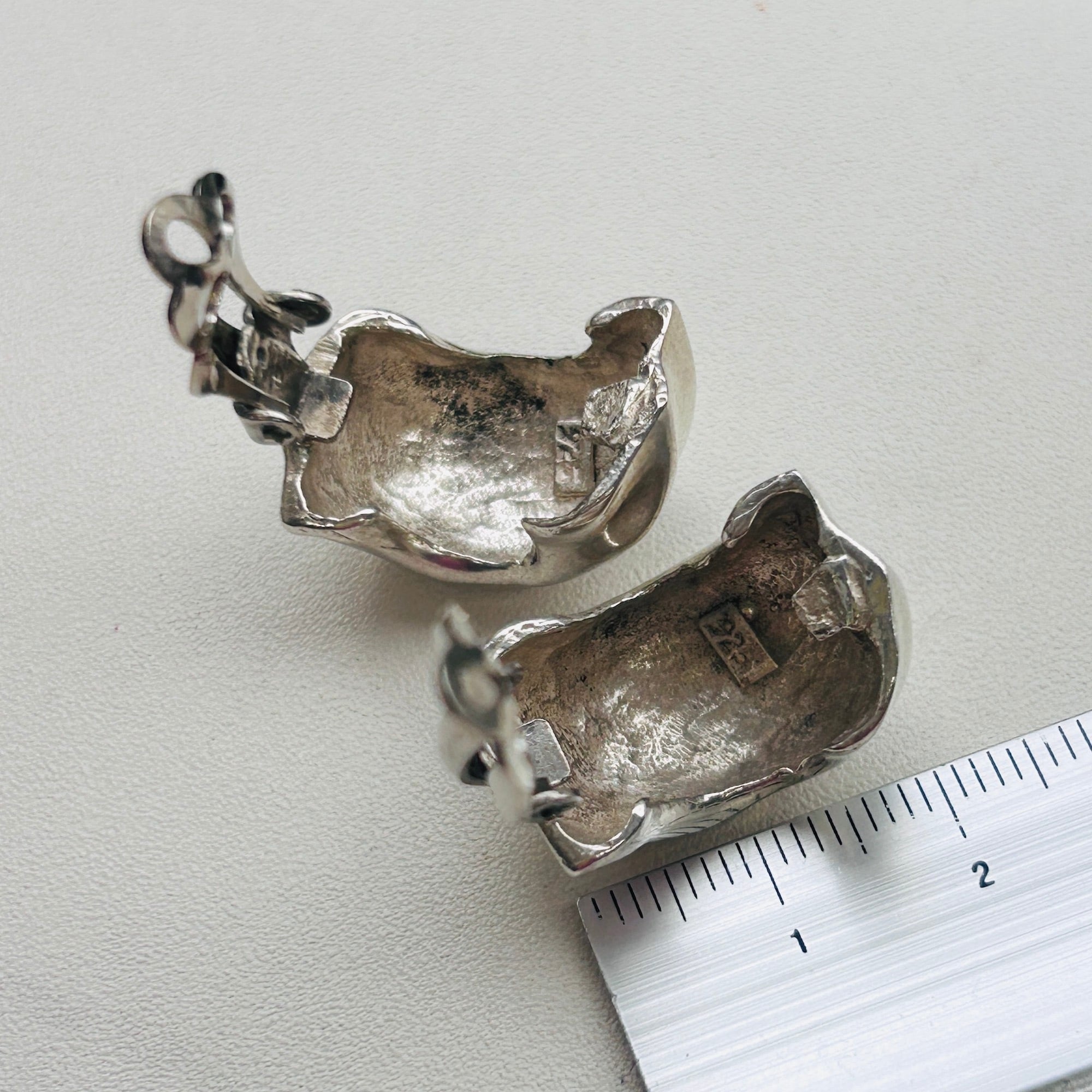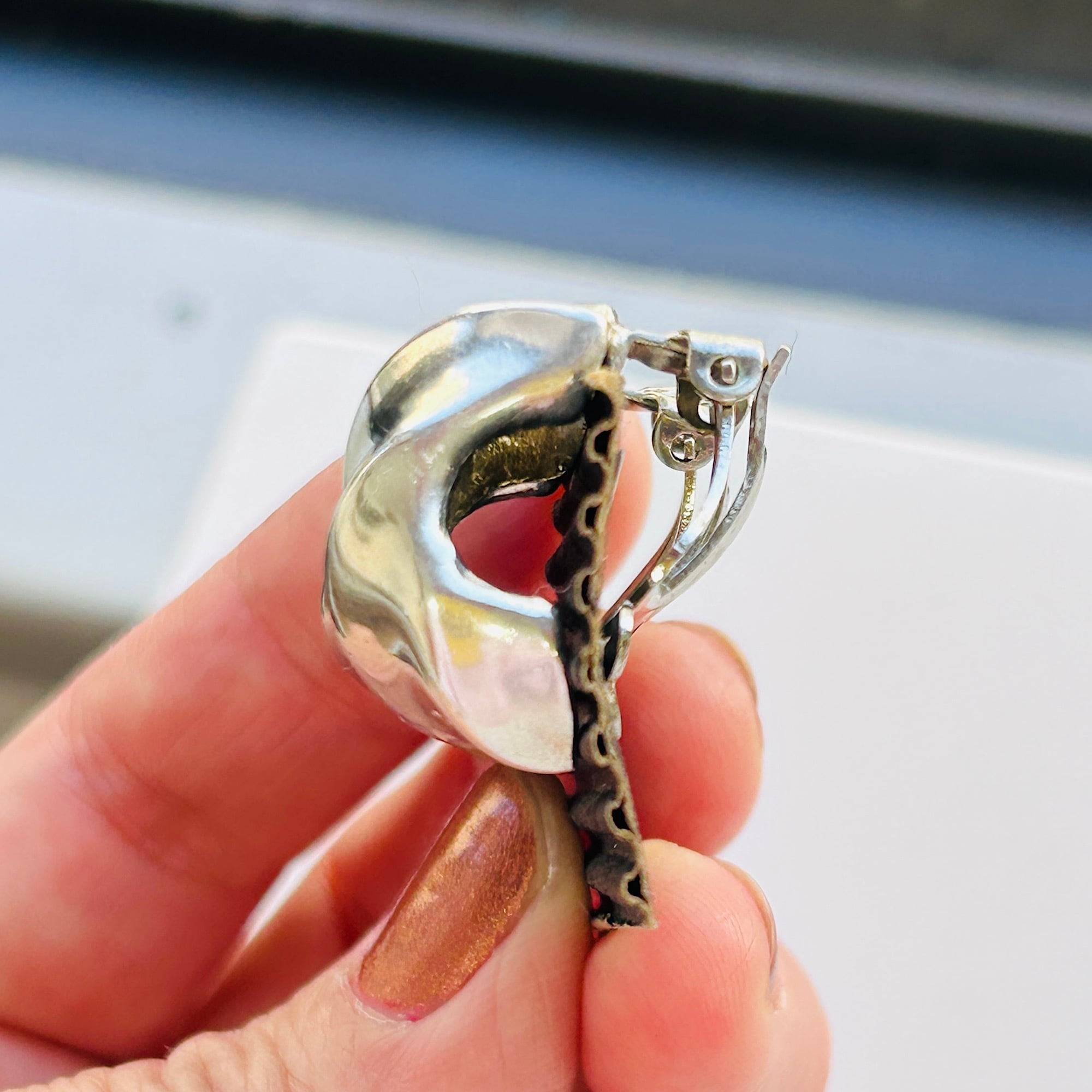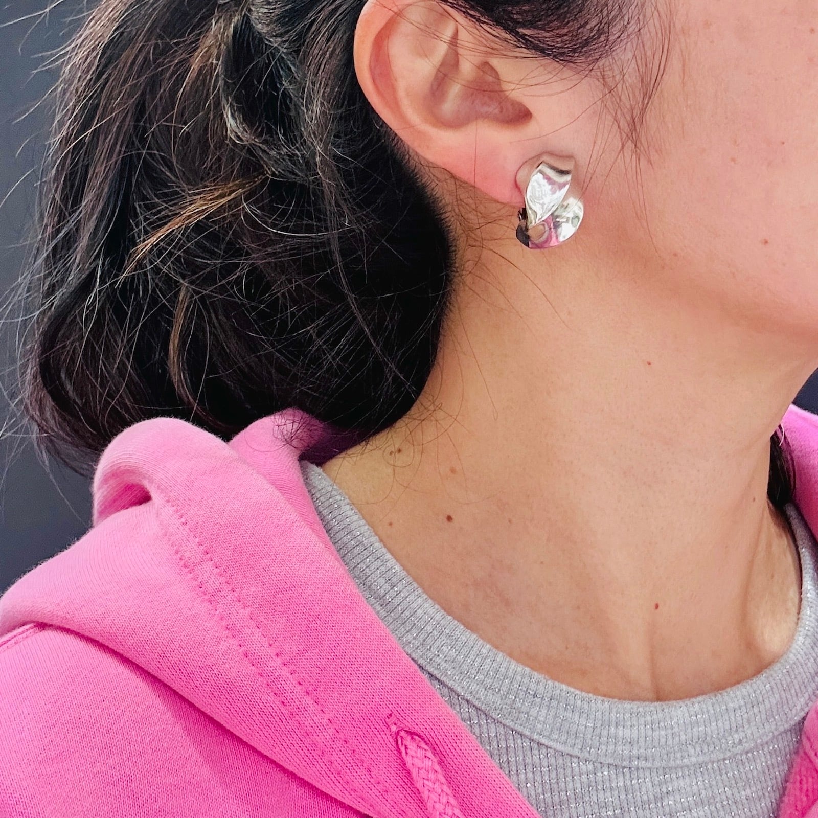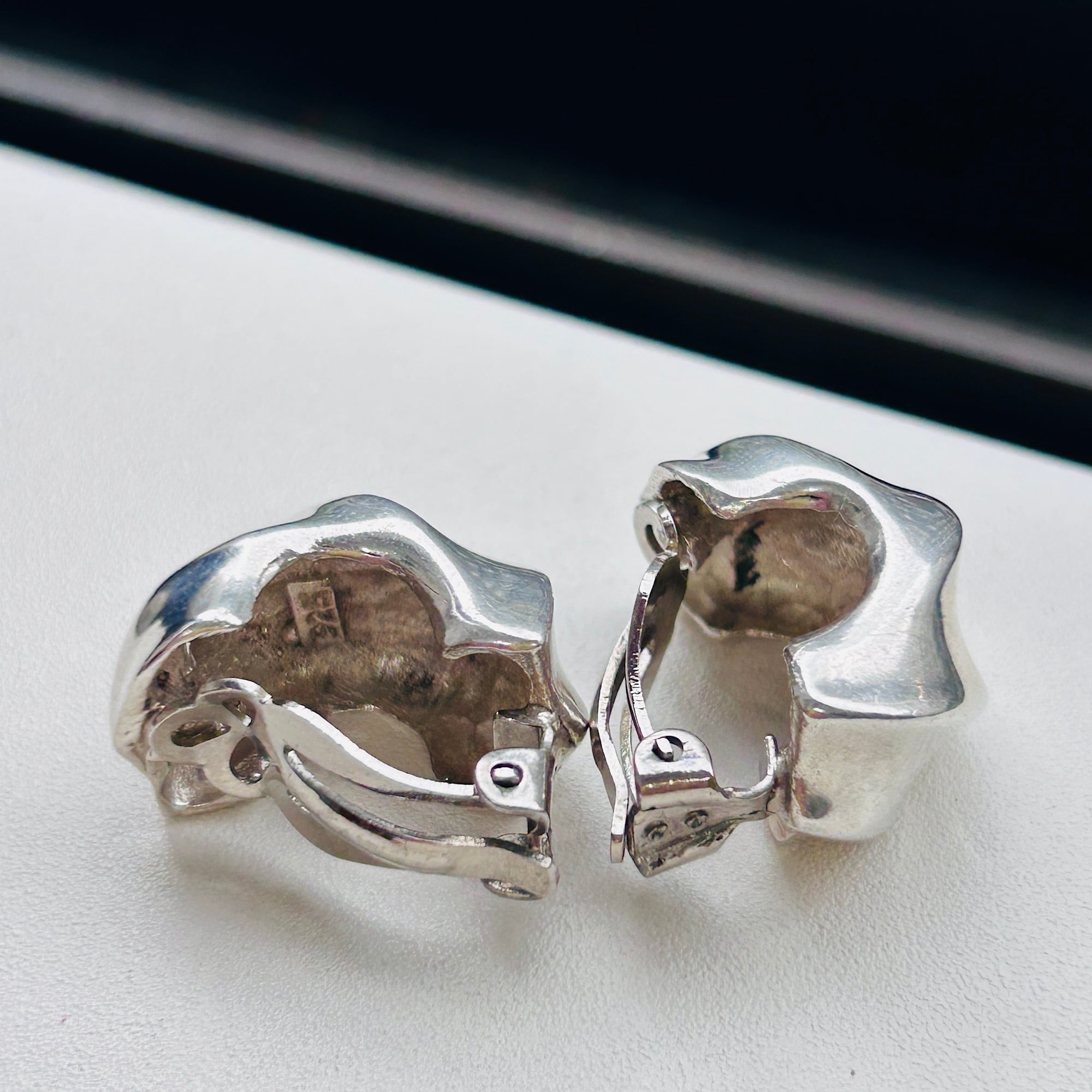 ハーフフープ型のクリップイヤリング。捻りクッキーのようなゴロンとした形。ヴィンテージシルバーらしいイカつくてクールなデザインです。耳に圧迫感のない着け心地でキチンと留まります。なかなか見つかることのない稀少なフープ型イヤリングです。内側に「925」。