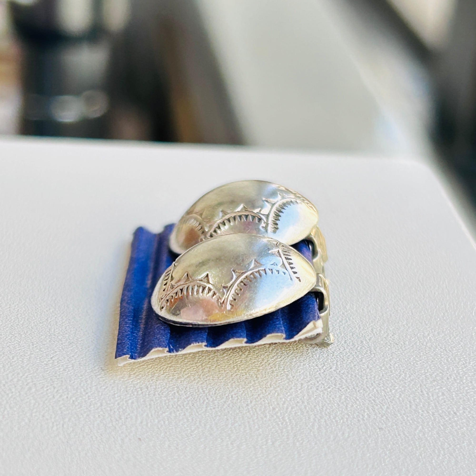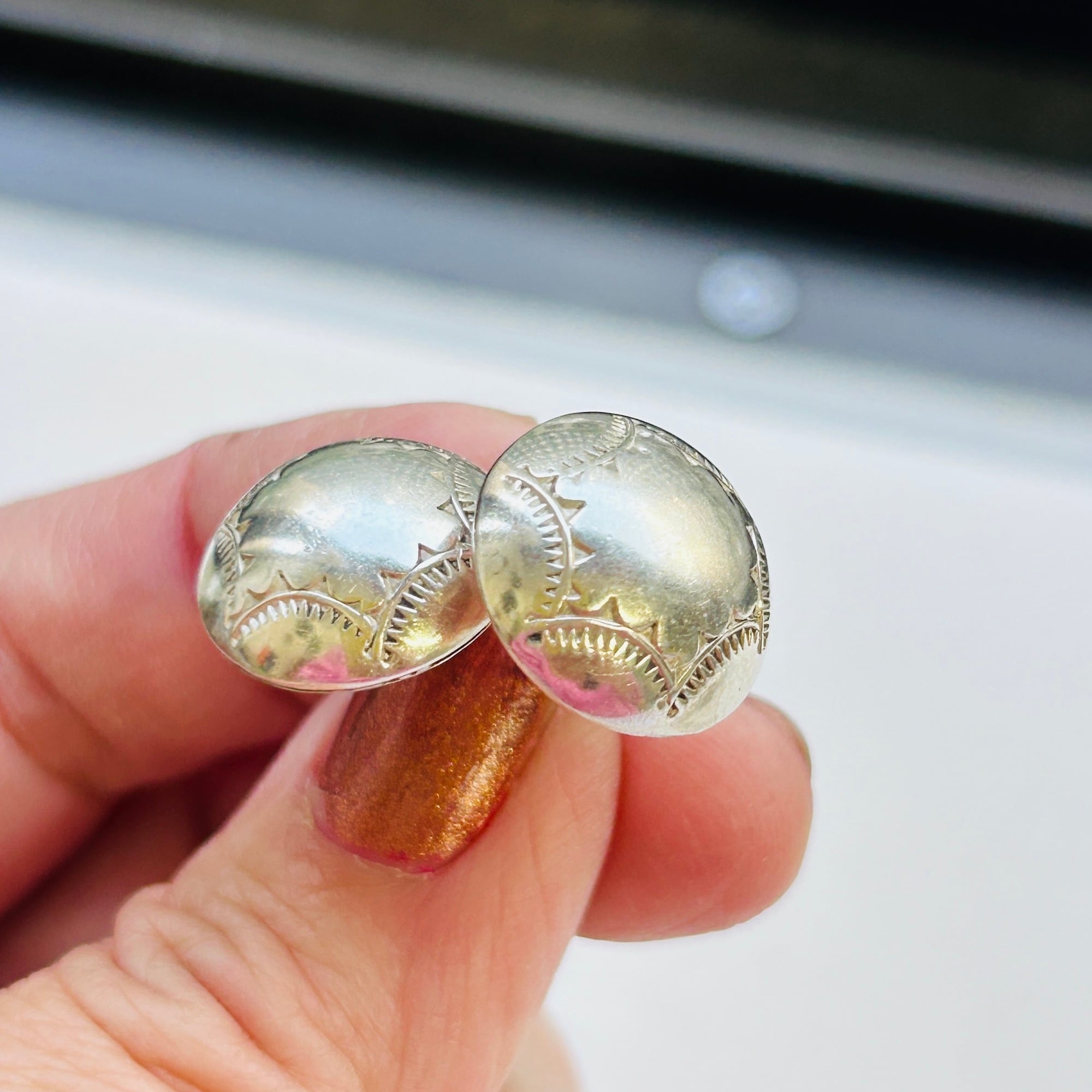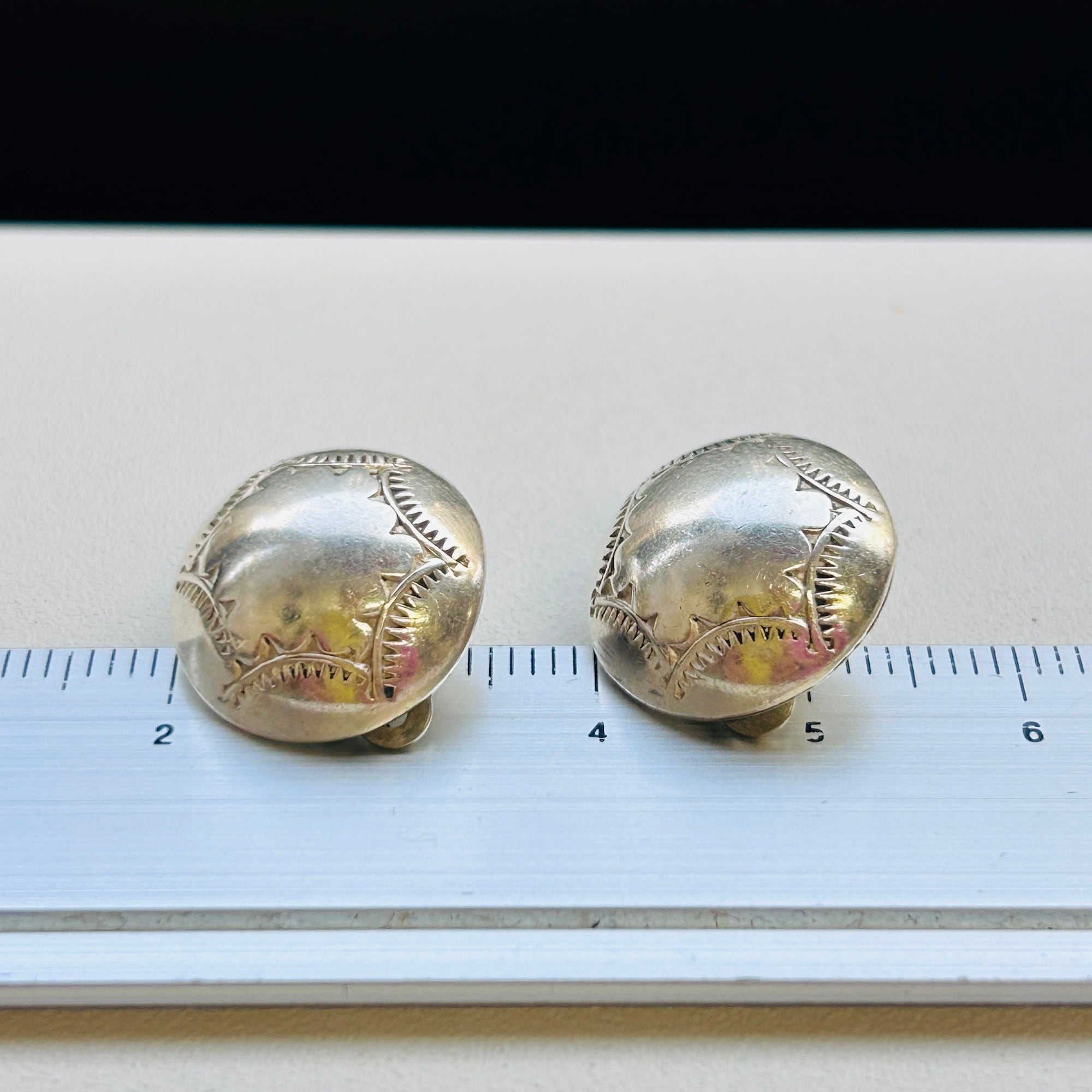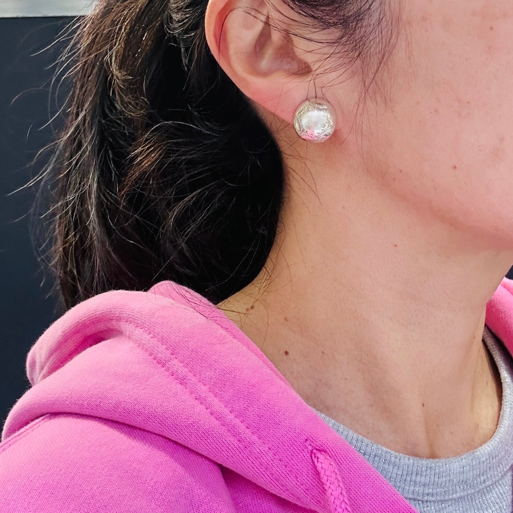 スタンプワーク入りの小さなドームイヤリング。非常に軽く着けているのを忘れてしまう着用感です。デイリーに使えるカジュアルなイヤリングです。刻印なしシルバー。Good Price!