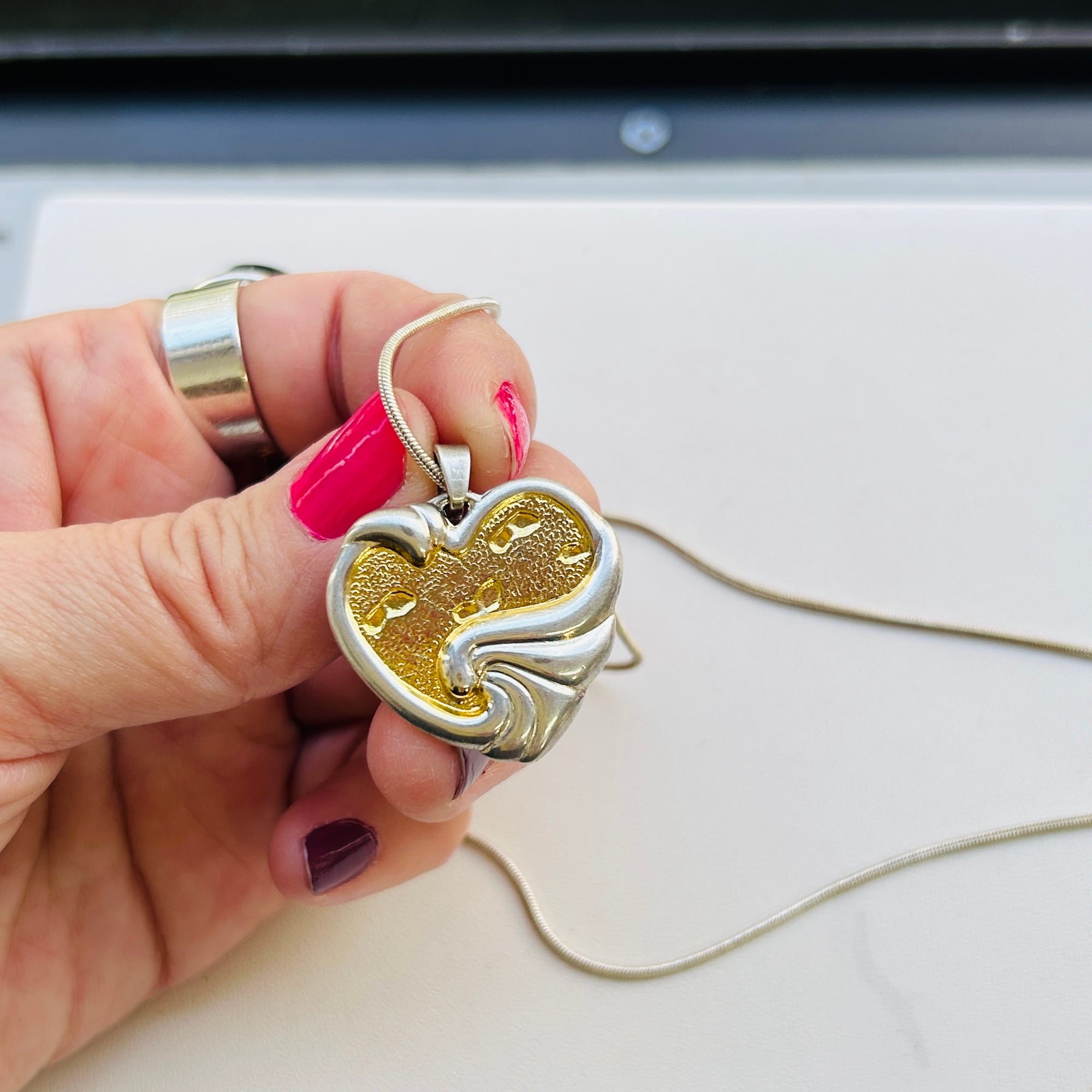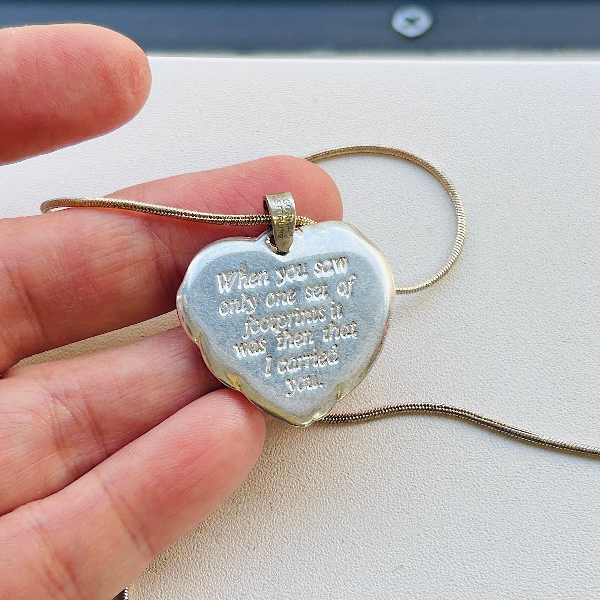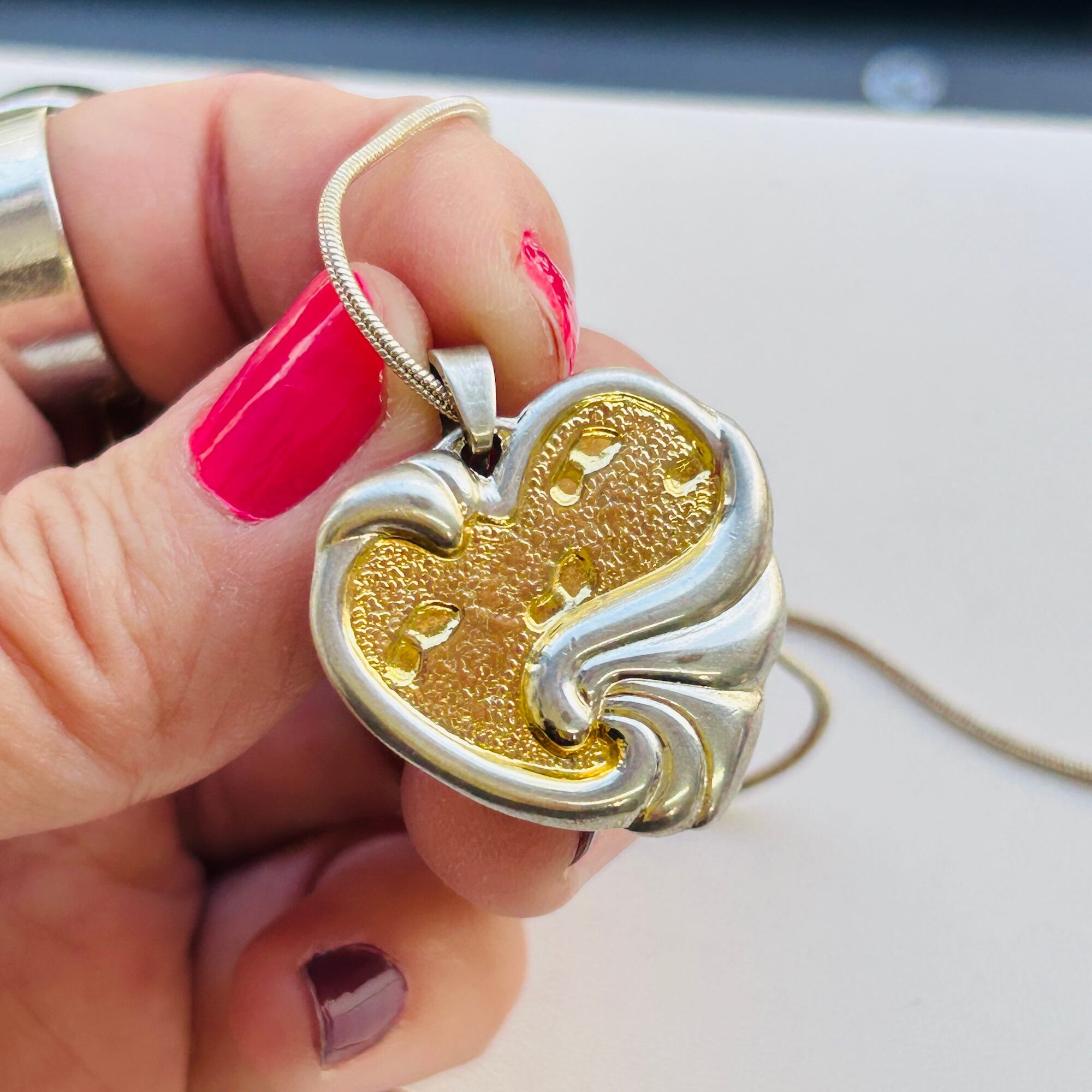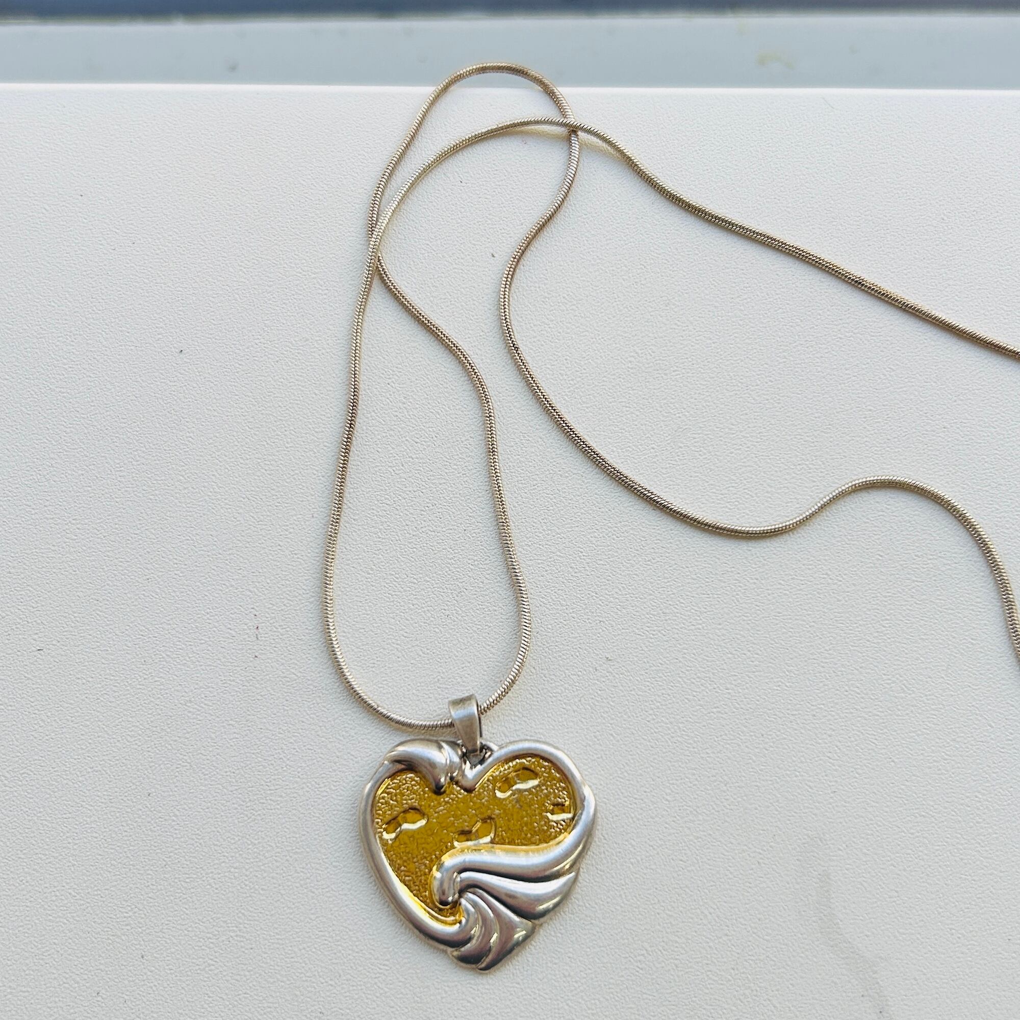 ツートーンハートのペンダントネックレス。波打ち際の砂浜に残る足跡を描いた海辺モチーフのハートトップはGorham社製。アメリカ1831年創業、カトラリーなどの銀製品が有名な老舗メーカーです。ハート裏はクリスチャン・ポエム "Footprints in the Sand"。トップだけで重量約10g。重みと厚みのあるとてもいいシルバーです。さすがメーカー品だと実感して頂けると思います。スネークチェーンもうっすら金色のシャンパンカラーです。チェーンは「925」刻印