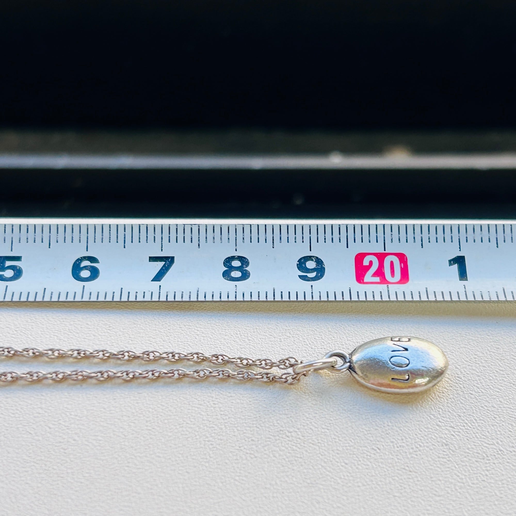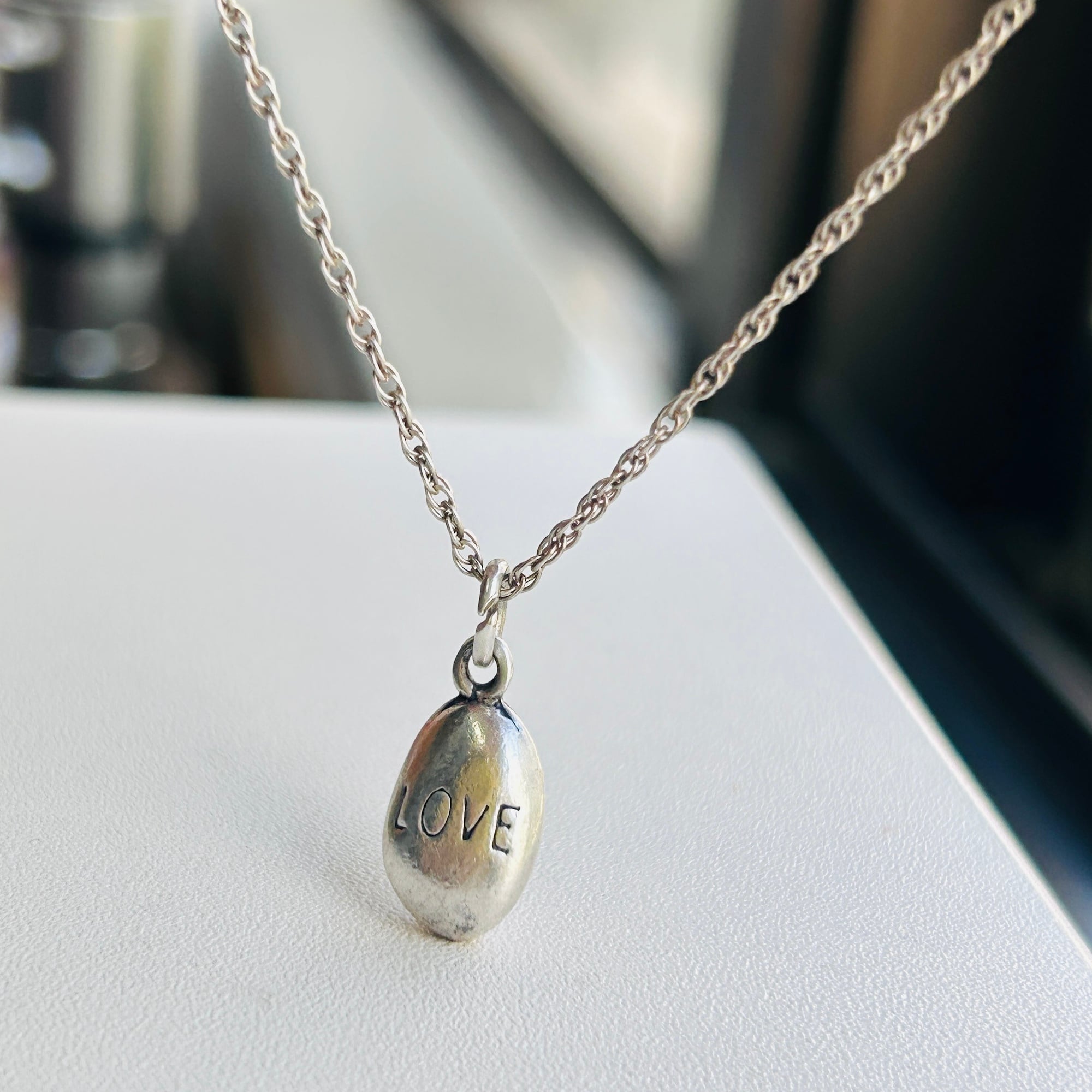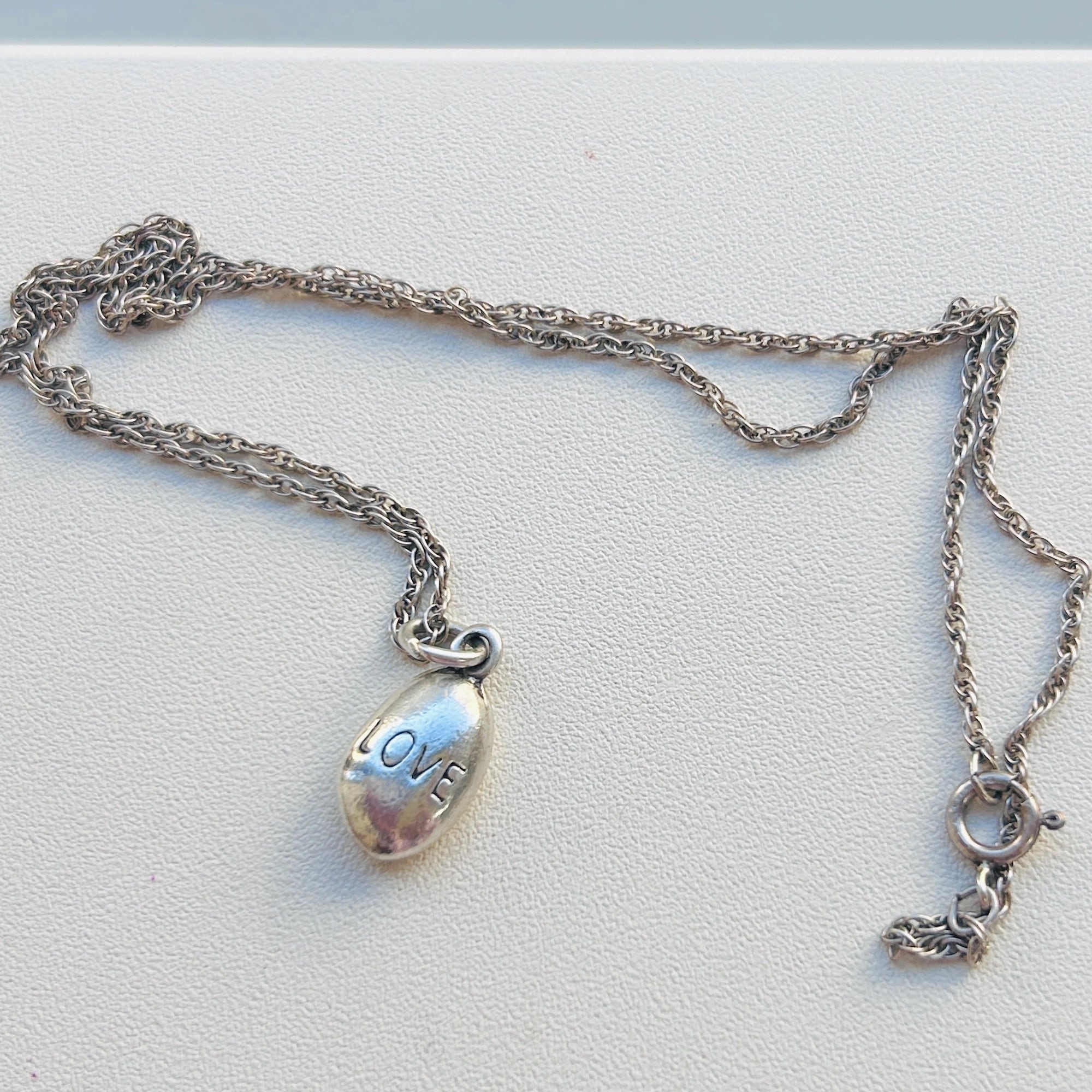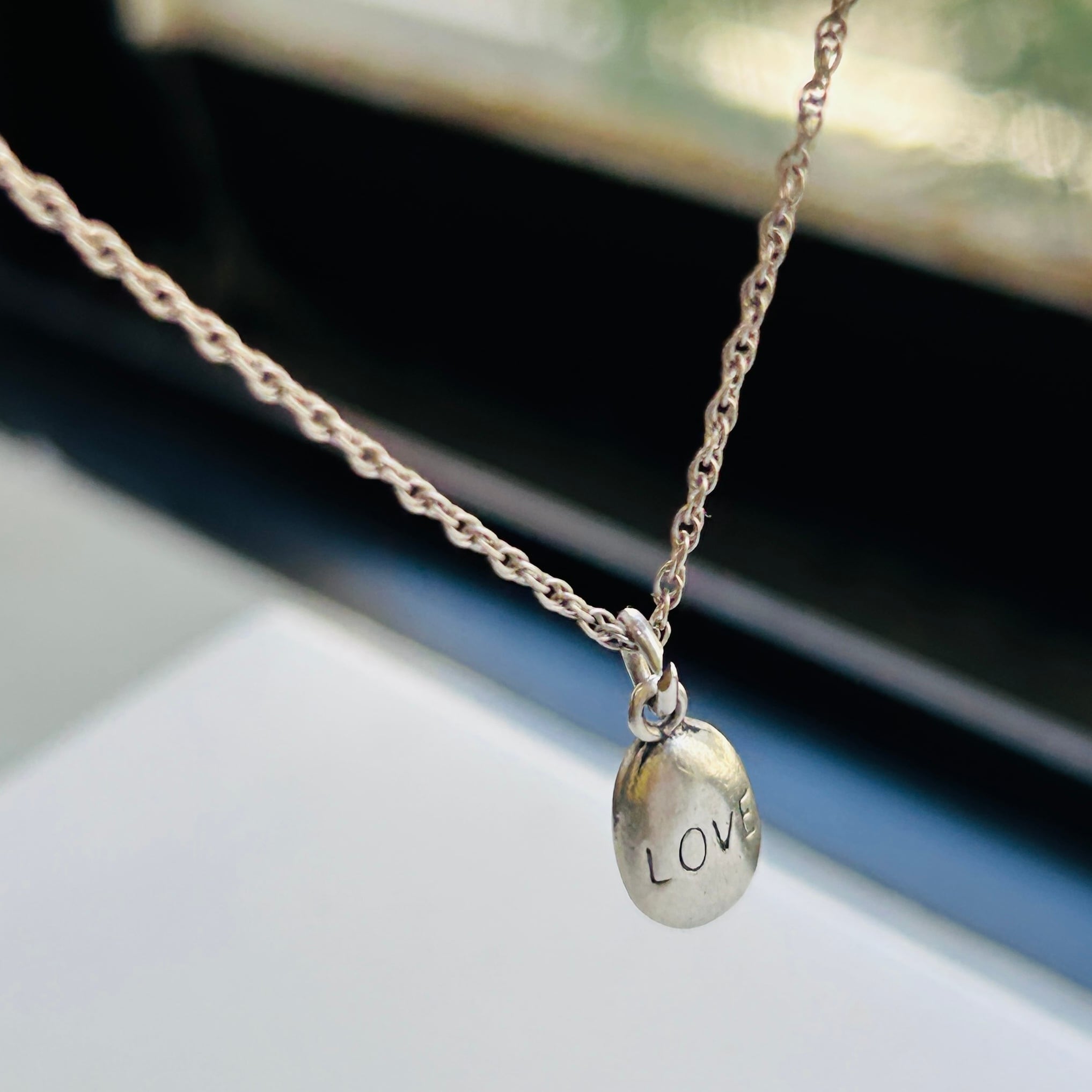 LOVEの文字が書かれたチャームネックレス。マットなチャームは小さくてゴロンとしたソリッドシルバーで重量を感じます。渋いシルバーカラーのチェーンは小さなコマが重なったツイストチェーン。ピカピカしすぎない落ち着いたトーンが小粋でキュートです。重ね着けしやすいチョーカーレングスもGOOD。可愛いです!チャーム裏にメーカーマークと「925」、チェーンは「STERLING」。