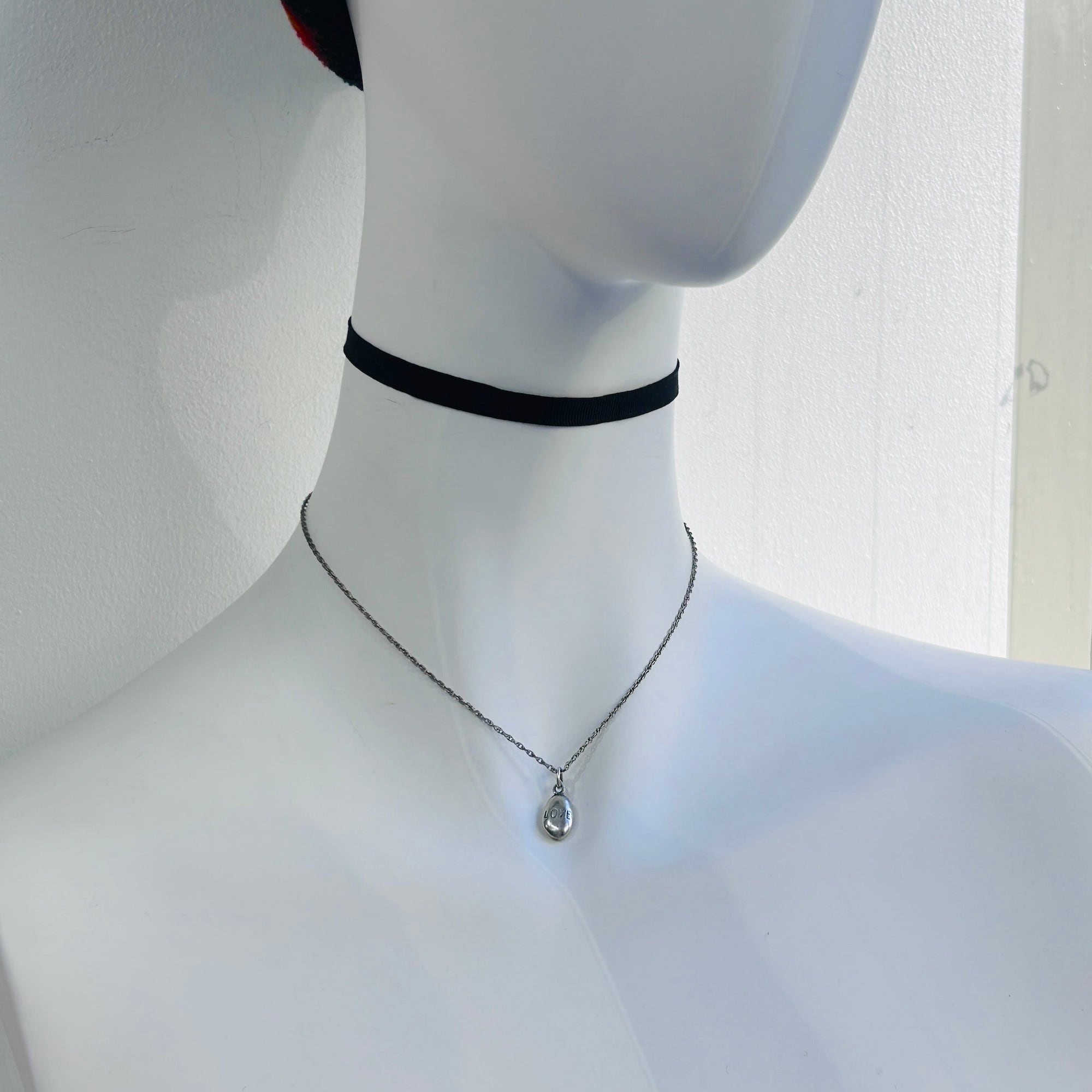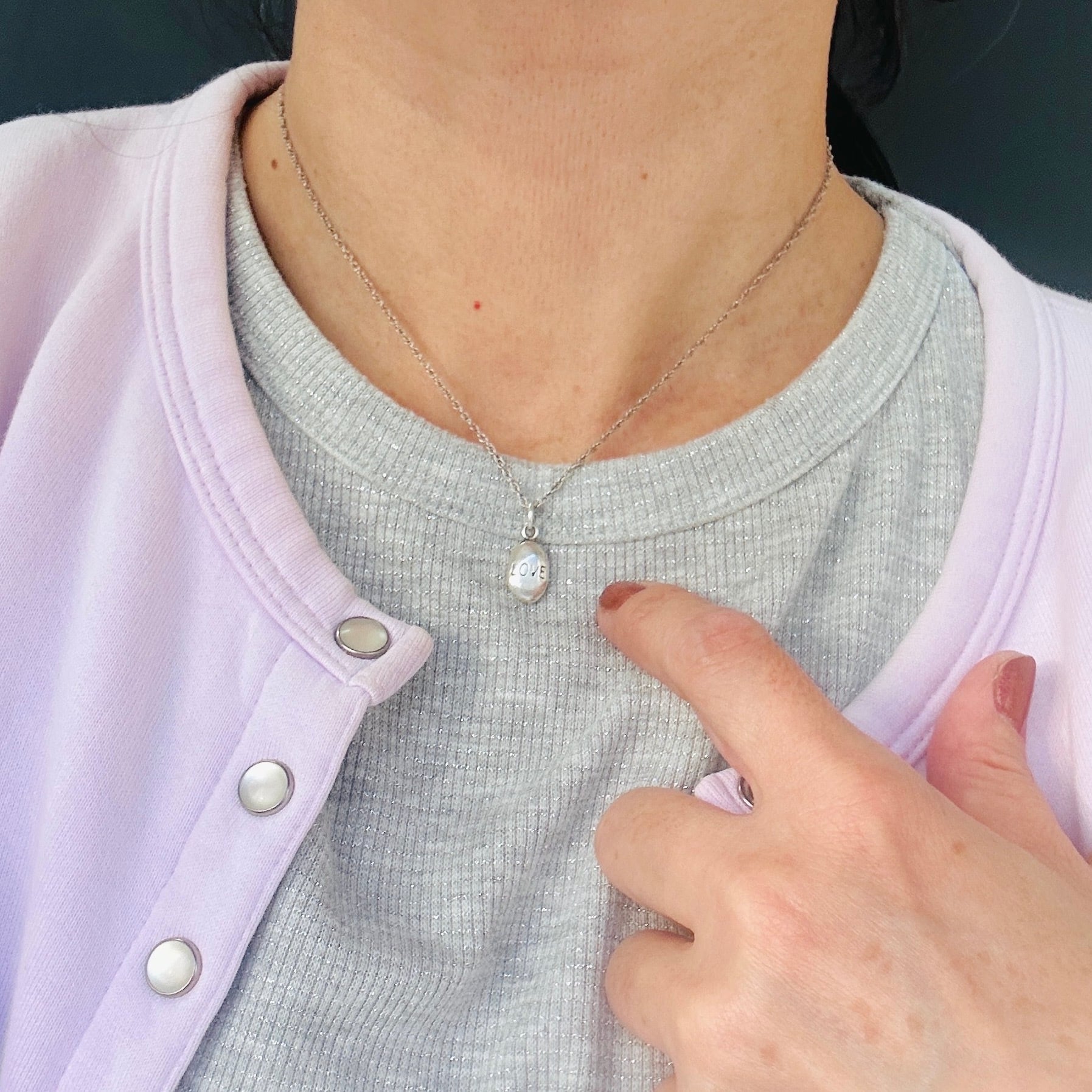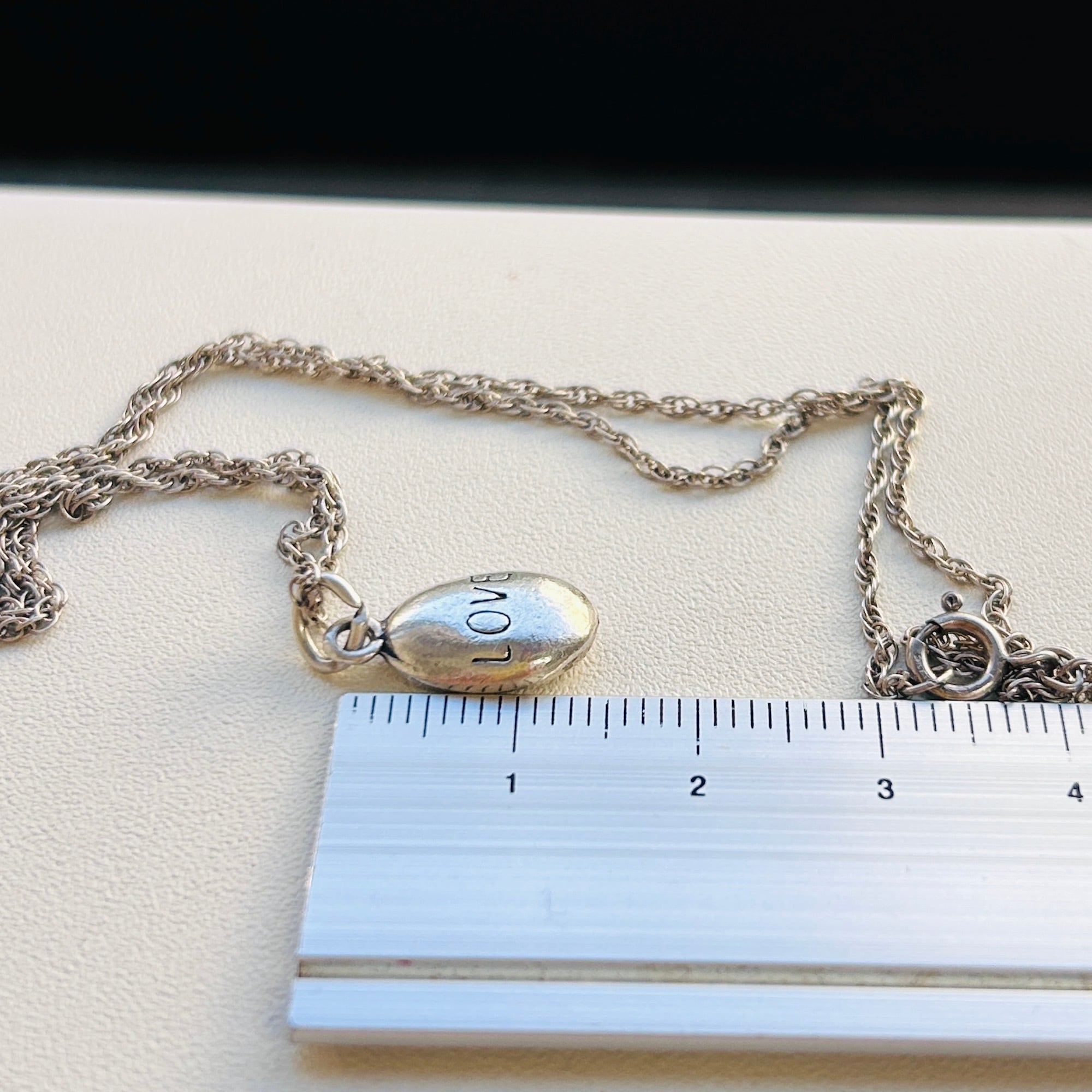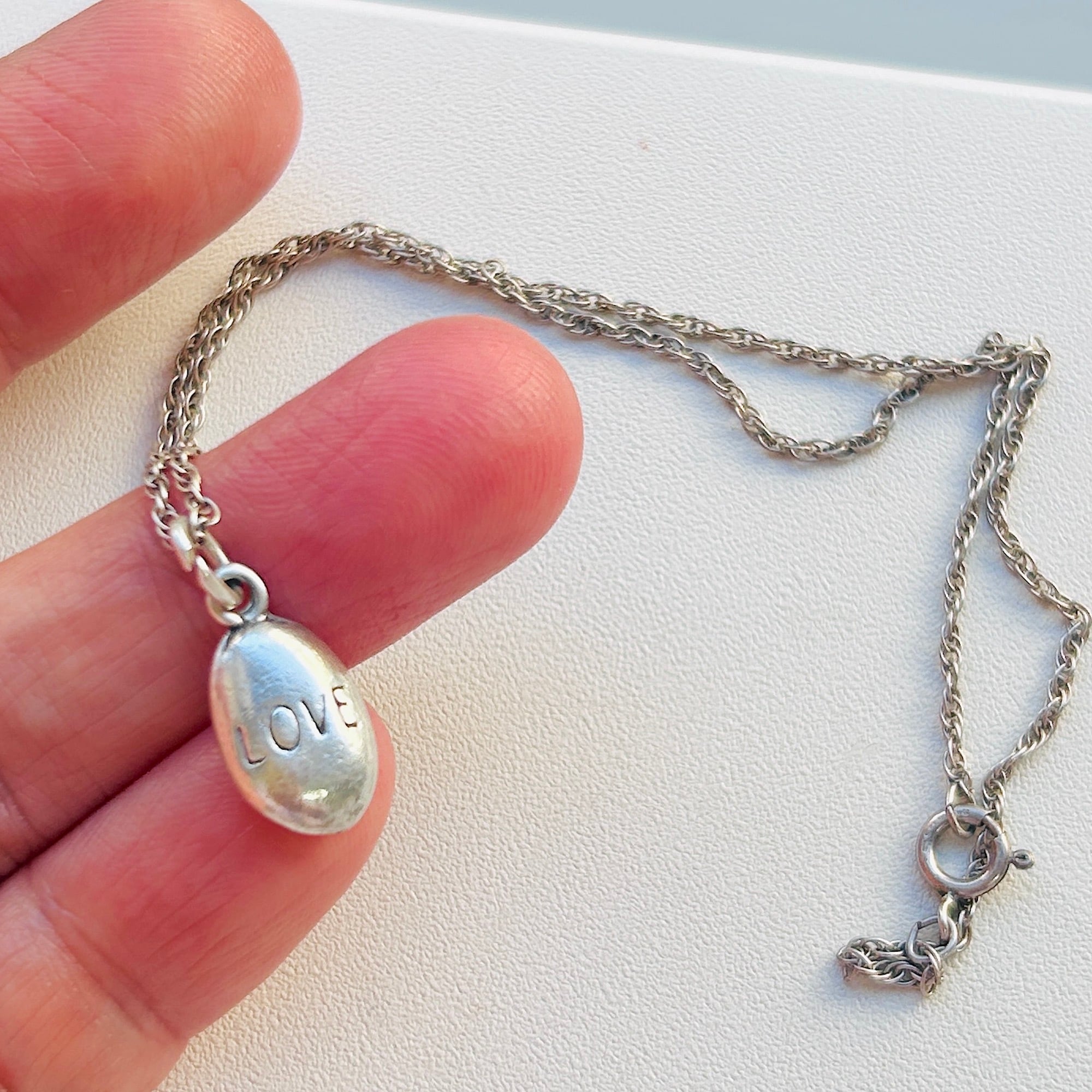 LOVEの文字が書かれたチャームネックレス。マットなチャームは小さくてゴロンとしたソリッドシルバーで重量を感じます。渋いシルバーカラーのチェーンは小さなコマが重なったツイストチェーン。ピカピカしすぎない落ち着いたトーンが小粋でキュートです。重ね着けしやすいチョーカーレングスもGOOD。可愛いです!チャーム裏にメーカーマークと「925」、チェーンは「STERLING」。