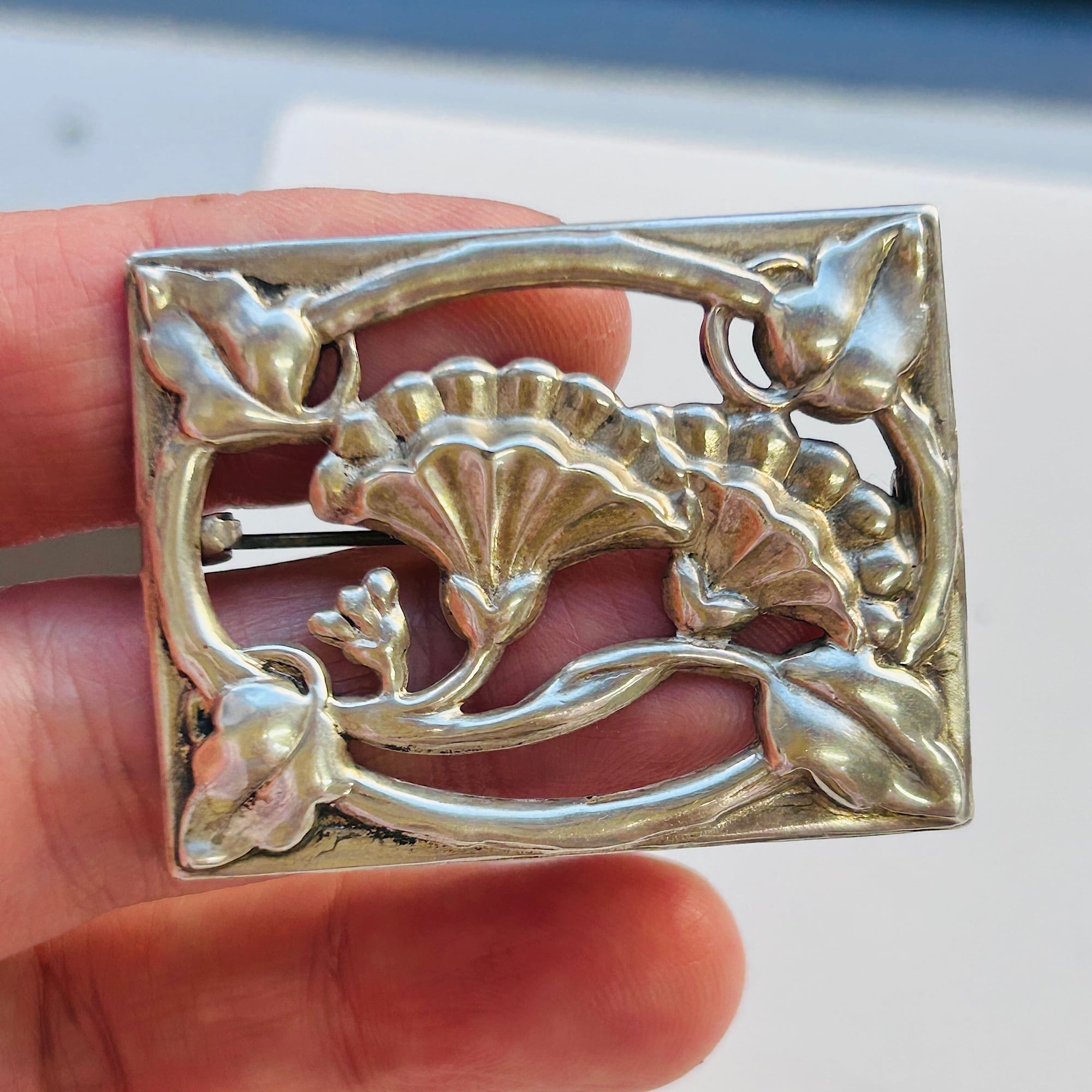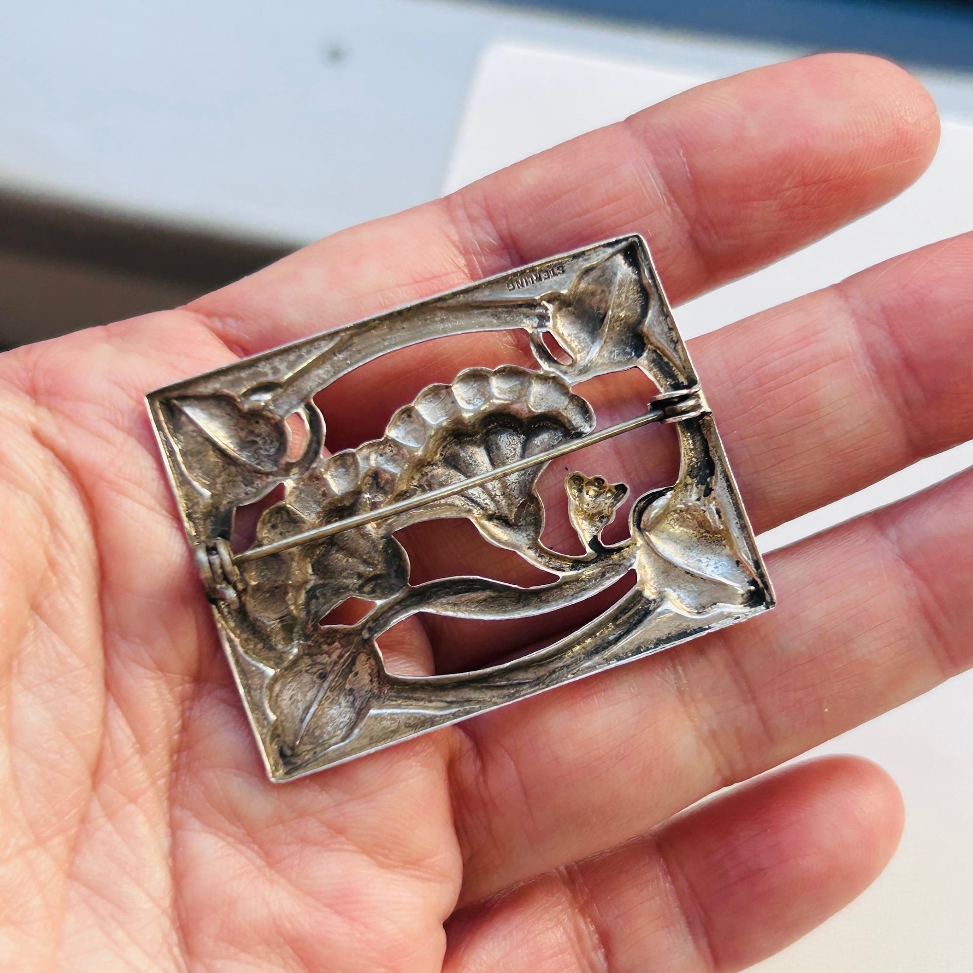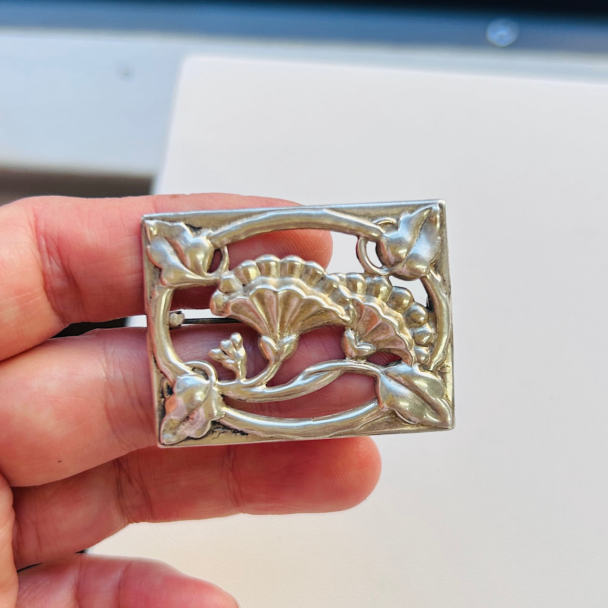 四角いフレームに緩やかな曲線で植物が描かれたアールヌーボー調ブローチ。変色が進むと陰影が濃くなり更に味が出てくると思います。型押しで薄めのシルバーですが正面から見ると凹凸がありお洋服に映える作りです。クラシックで品のあるブローチですのでギフトにもオススメです。金具に問題ありません。「STERLING」刻印。