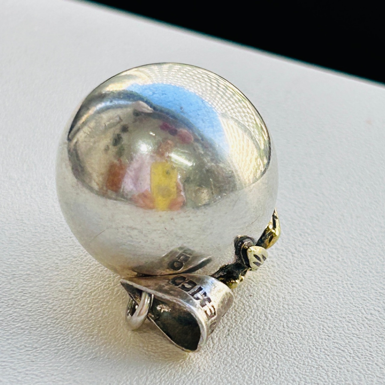 優しい音色のチャイムボールトップ。ゴールドトーンのティンカーベルがついていて、とても珍しいです。とにかくティンカーベルが大好きな方に見つけてもらえるかも、と思って仕入れてきました。ベイルに「MEXICO」「925」。
