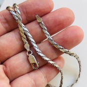捻り模様のチェーンネックレス。細かいパーツが層になっているので強度がある作り。輪が繋がった鎖とは違いクッキリとしたラインで見映えします。女性ならカッコいい雰囲気に、男性ならチョーカーレングスでセクシーな首元に:)シンプルでさりげなくクール。ユニセックスなチェーンです。「ITALY」「925」刻印。