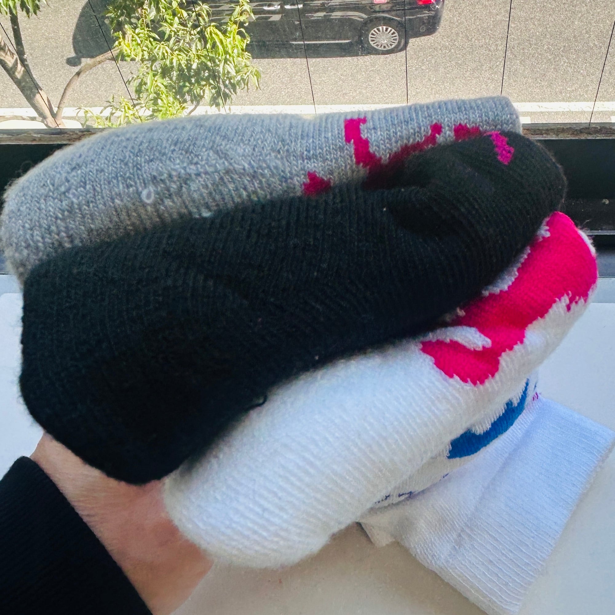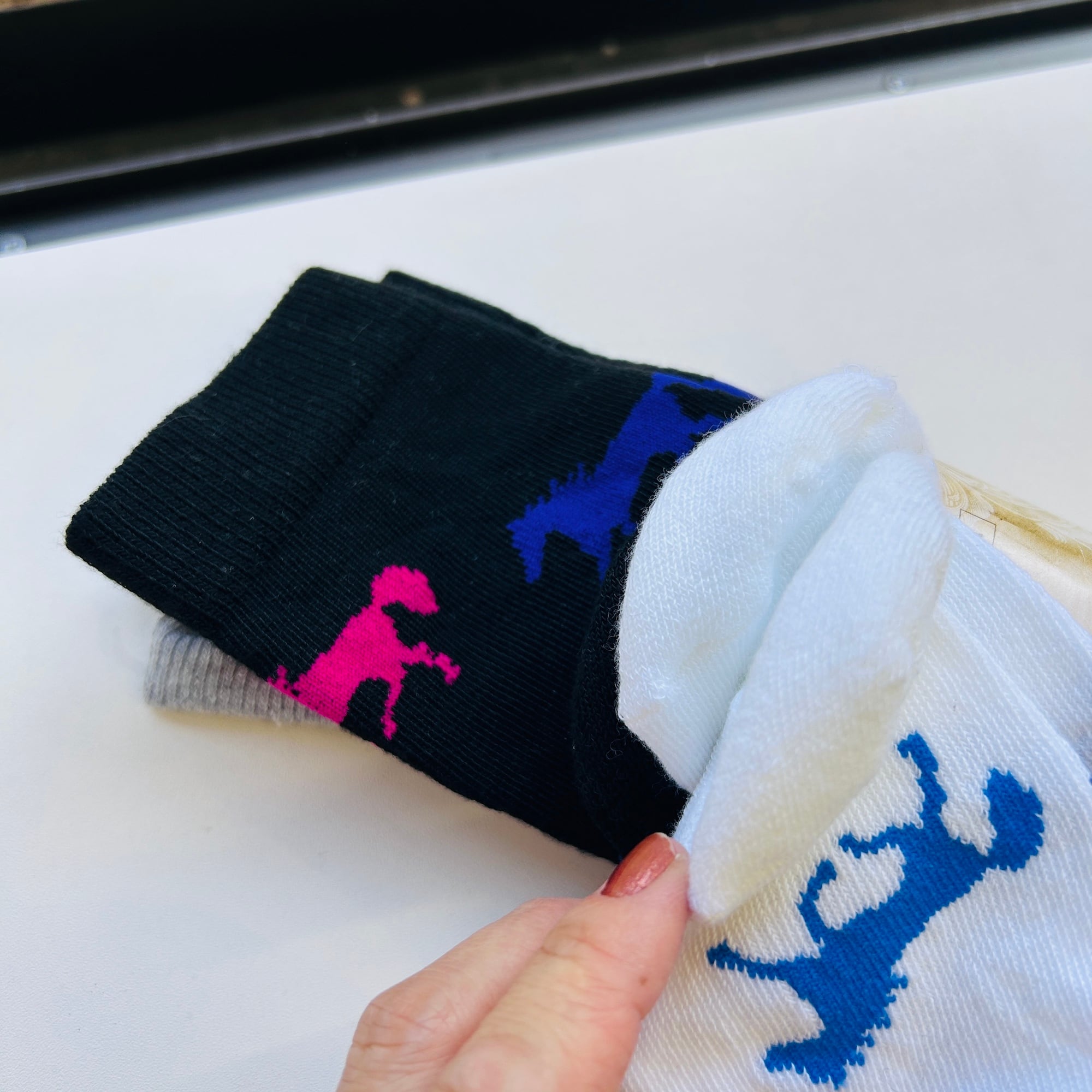 未開封のソックス。カラフルなお馬さん模様です。Made in USA。靴サイズでいうとUSサイズ6−9。US7は24.0cmにあたります。大抵の方が捌けるサイズです。