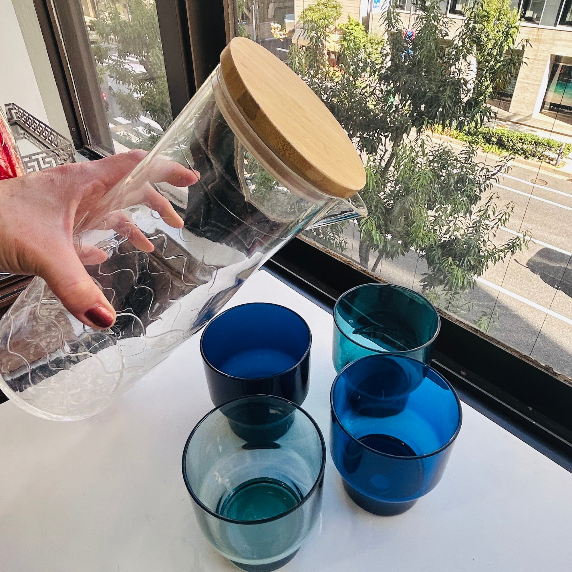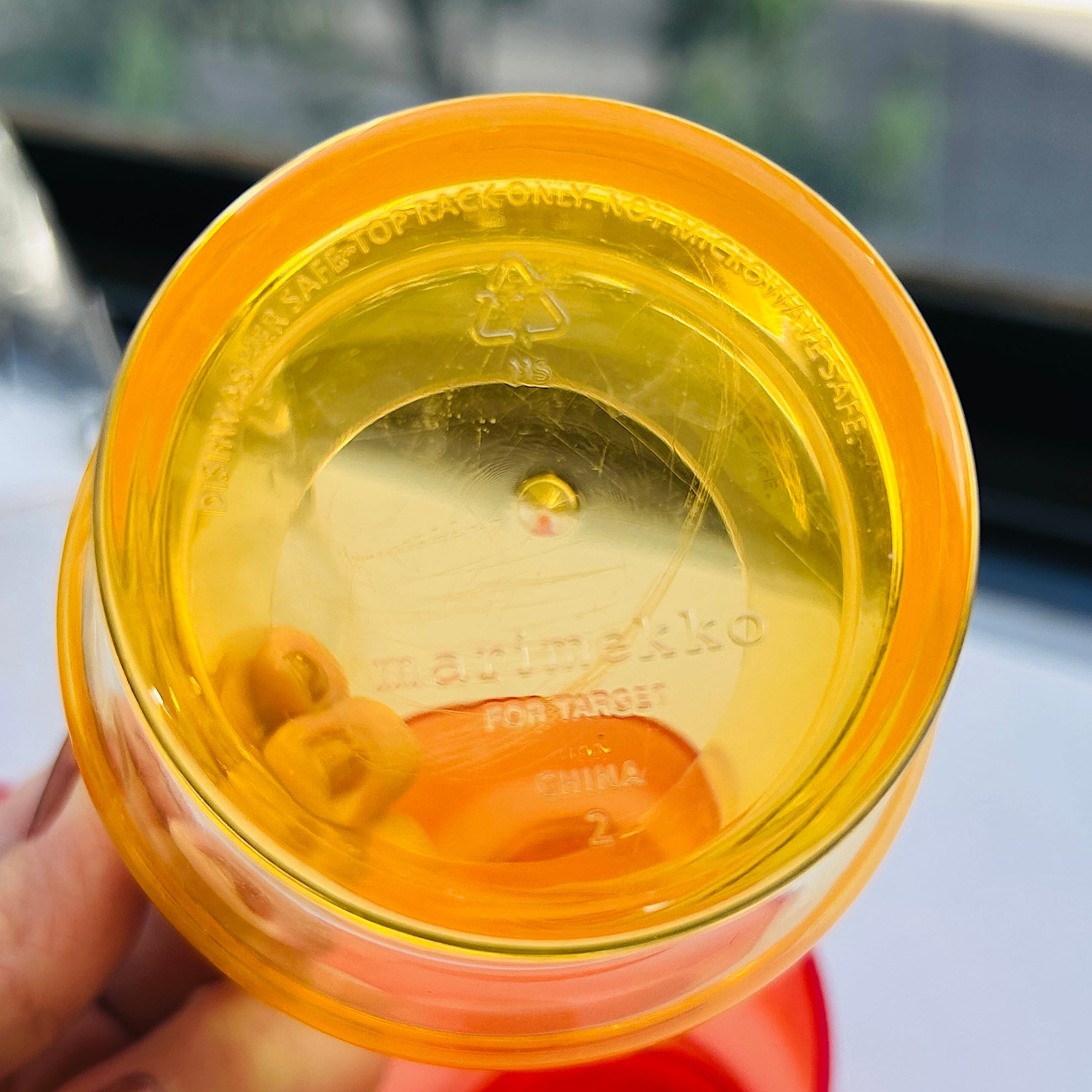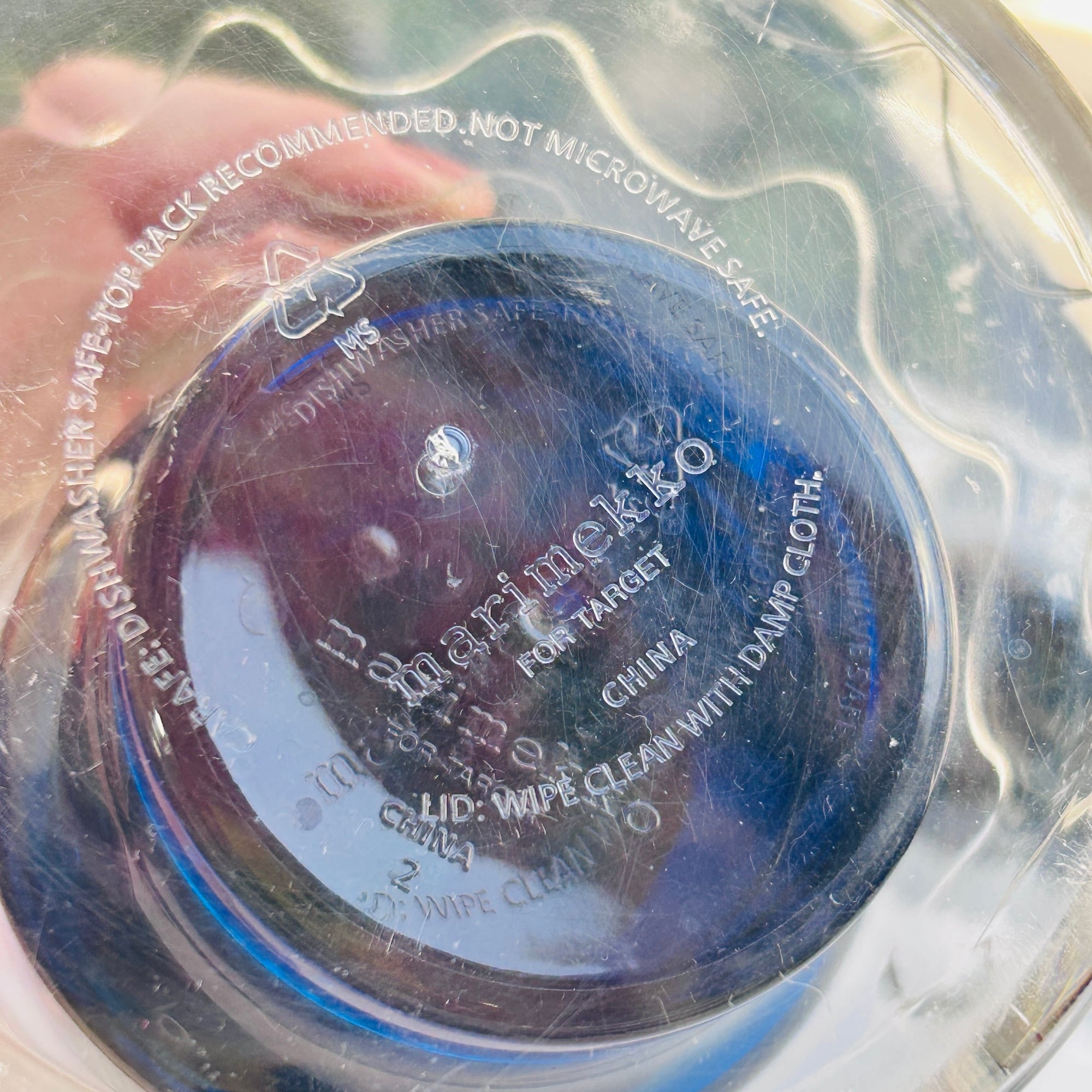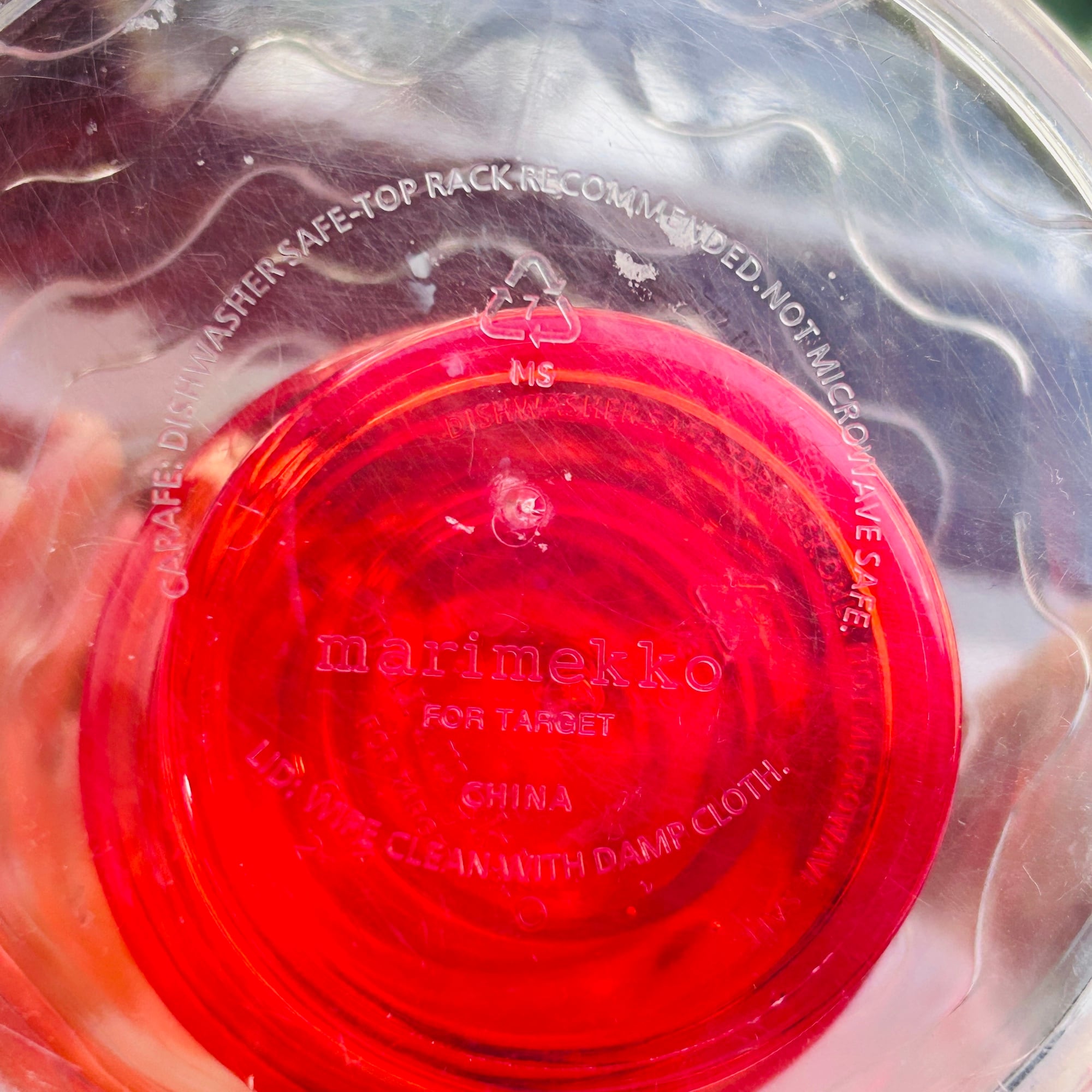 樹脂製カラフェセット。水差しボトルに色付きコップが4客付いています。2016年、マリメットとアメリカのターゲット(日用品店)のコラボ商品です。水差しボトルの容量は約1リットル。竹製のフタにパッキンが付いています。パッキンはとてもキレイです。ボトルは側面にスレが所々見られ、使用感あります。樹脂製カラーグラスは青系、赤系のグラデーションカラーグラスはそれほど使用感がなくキレイです。グラスがボトルの中に収まるようになっていますのでキャンプなどに持って行ってもらうのもいいと思います。ボトルとグラスの底に「marimekko FOR TARGET」。食洗機OK、ただし上段ラック推奨。電子レンジ不可の記載があります。
