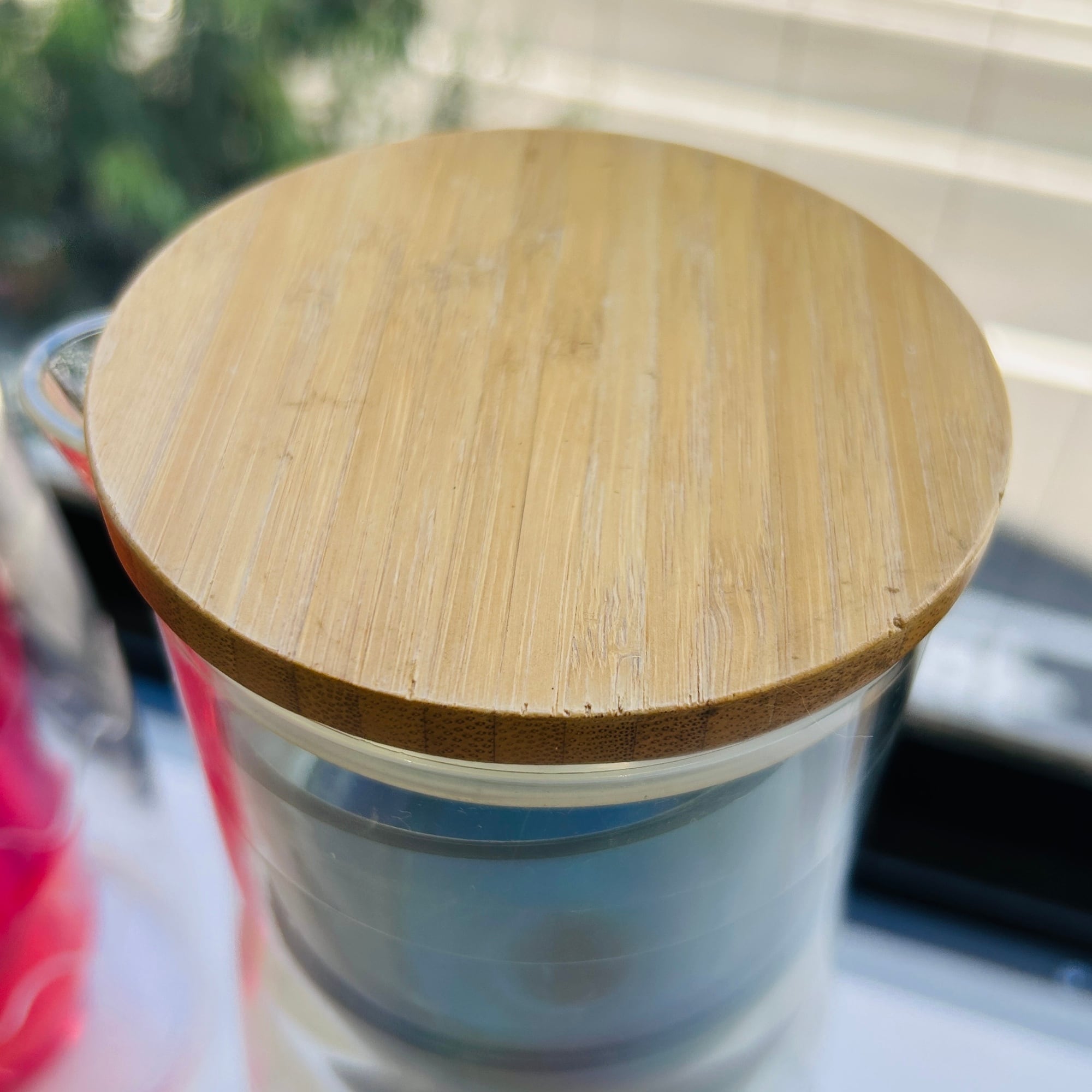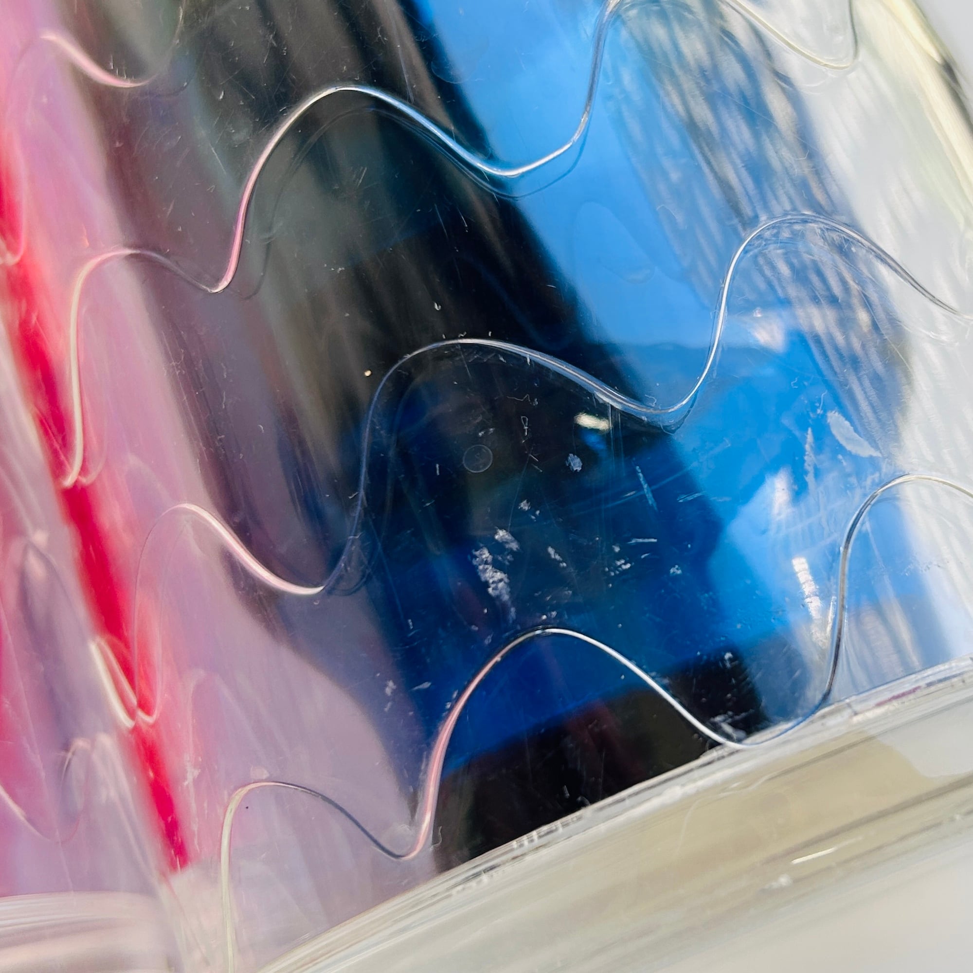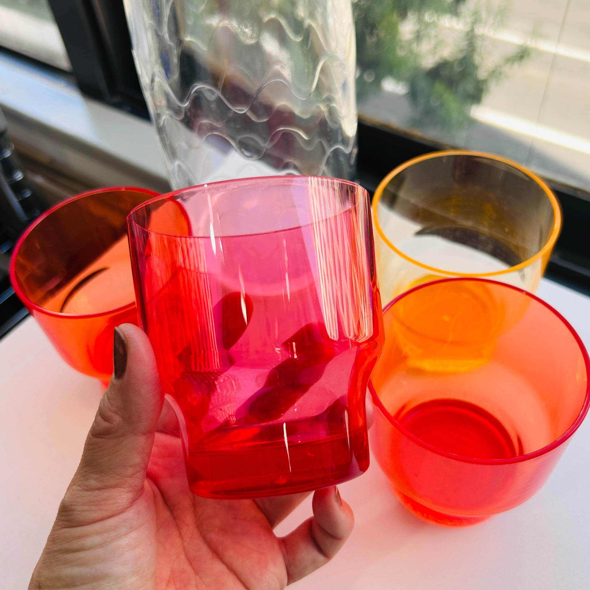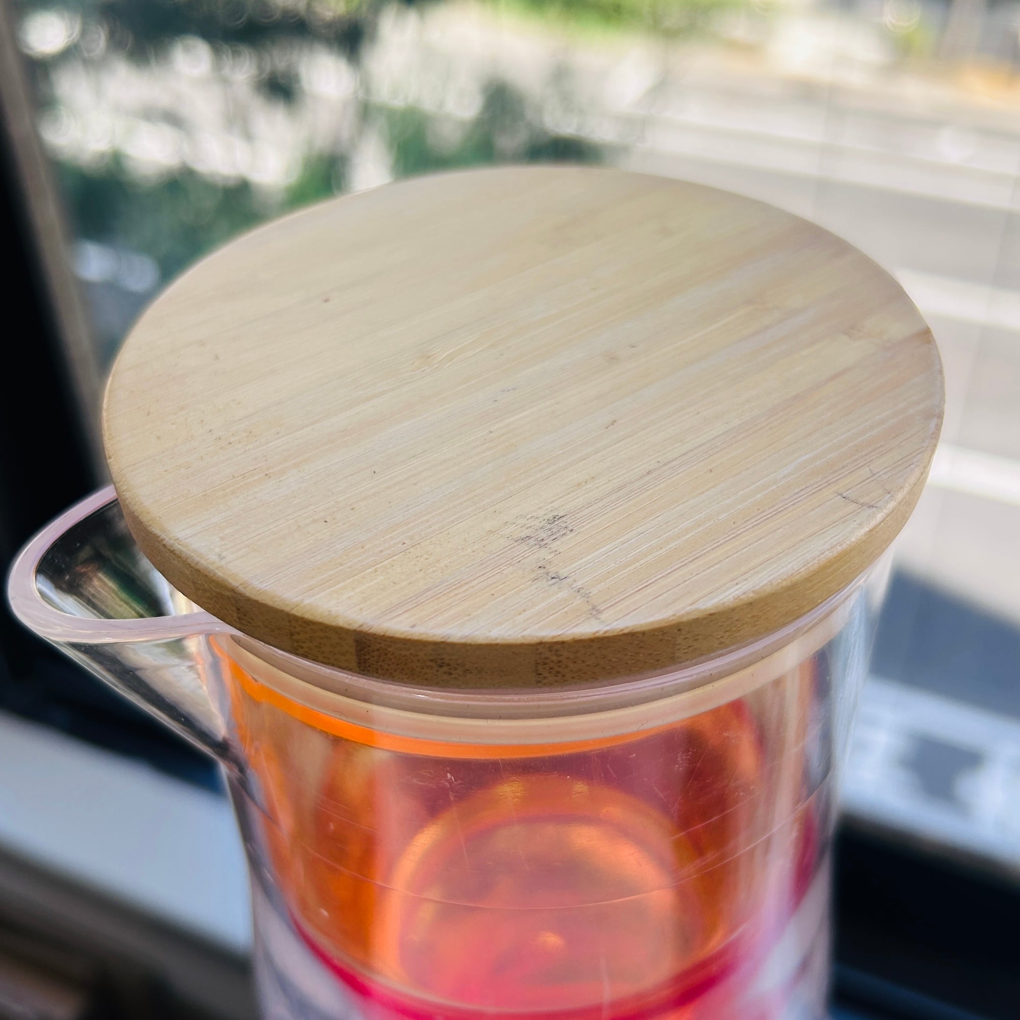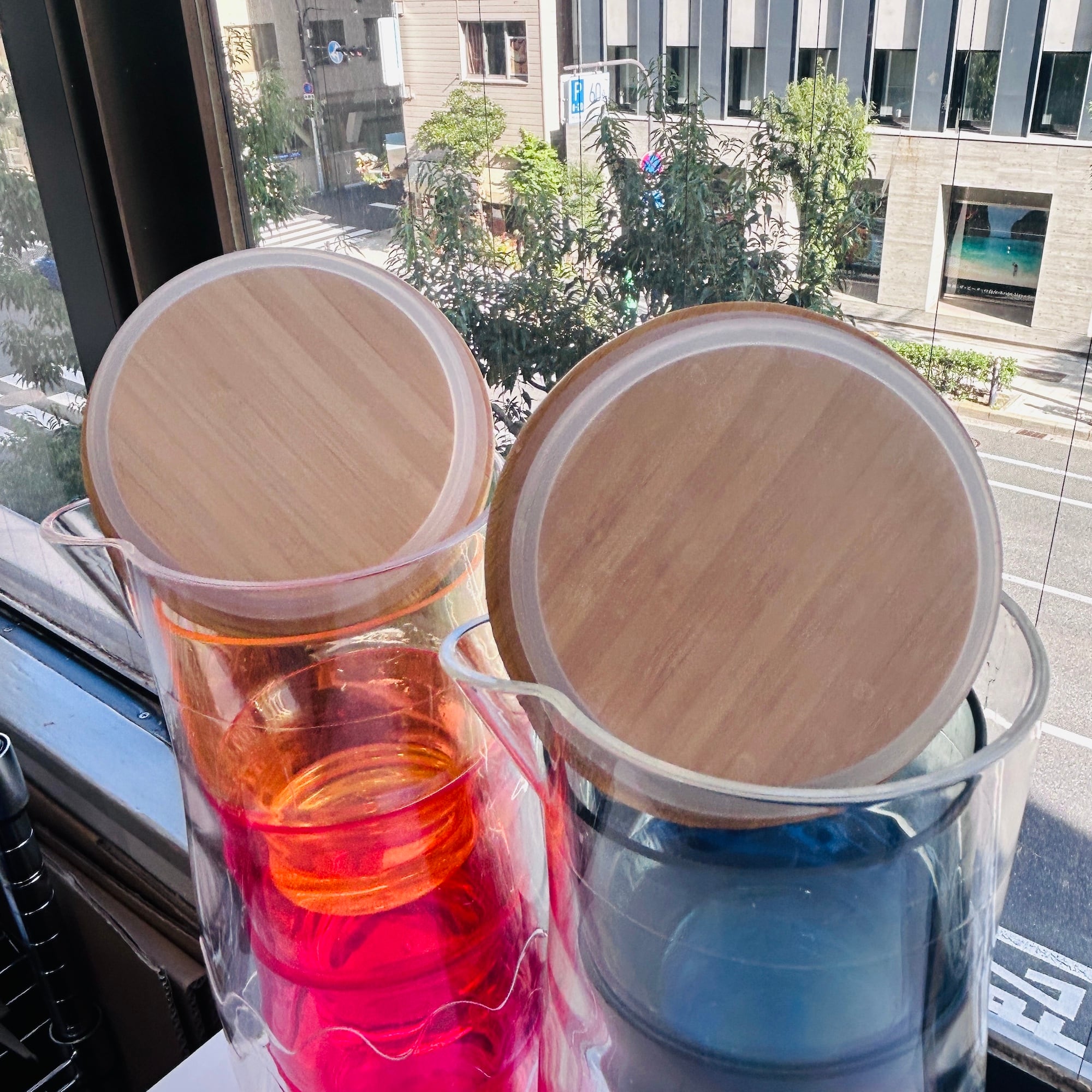 樹脂製カラフェセット。水差しボトルに色付きコップが4客付いています。2016年、マリメットとアメリカのターゲット(日用品店)のコラボ商品です。水差しボトルの容量は約1リットル。竹製のフタにパッキンが付いています。パッキンはとてもキレイです。ボトルは側面にスレが所々見られ、使用感あります。樹脂製カラーグラスは青系、赤系のグラデーションカラーグラスはそれほど使用感がなくキレイです。グラスがボトルの中に収まるようになっていますのでキャンプなどに持って行ってもらうのもいいと思います。ボトルとグラスの底に「marimekko FOR TARGET」。食洗機OK、ただし上段ラック推奨。電子レンジ不可の記載があります。