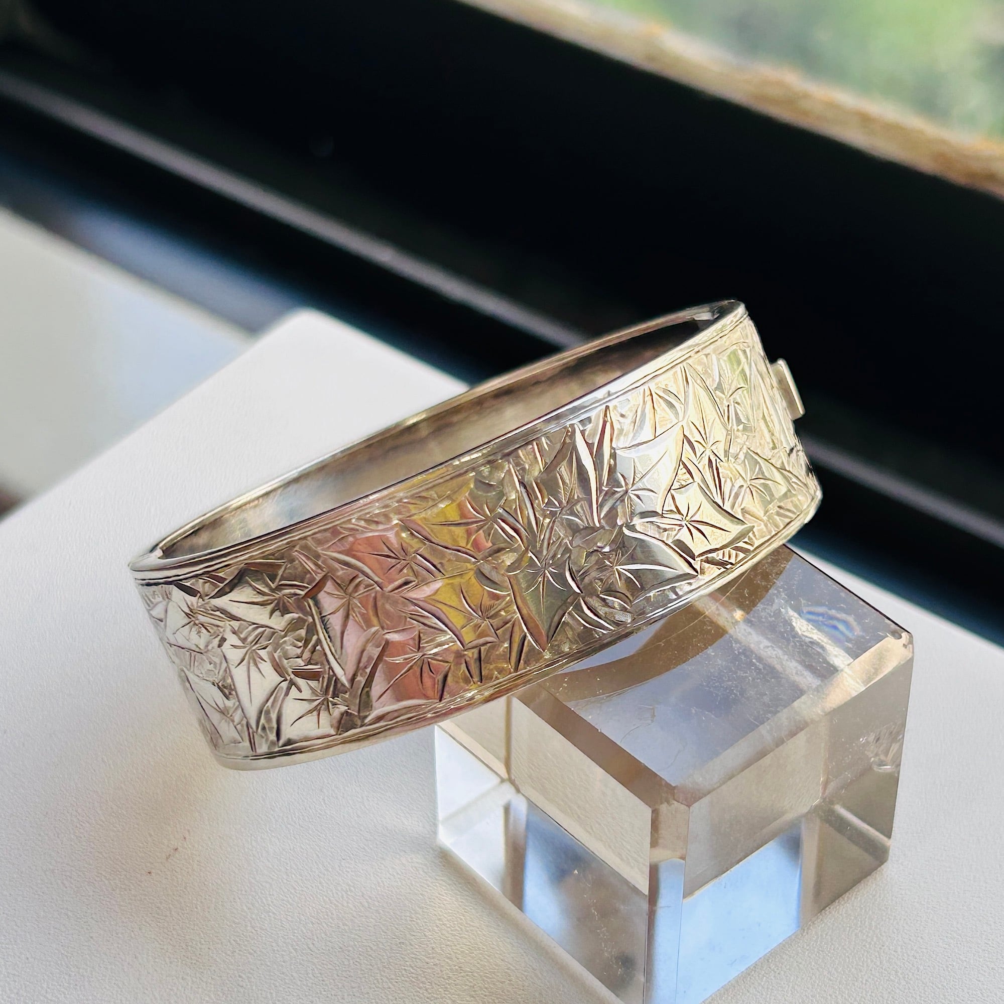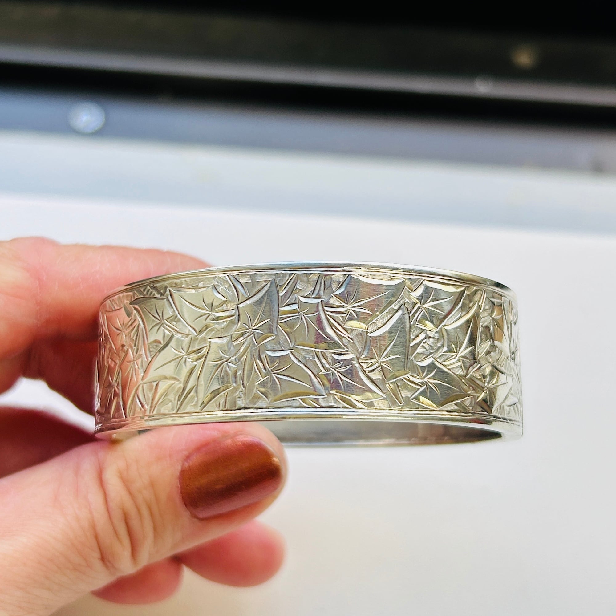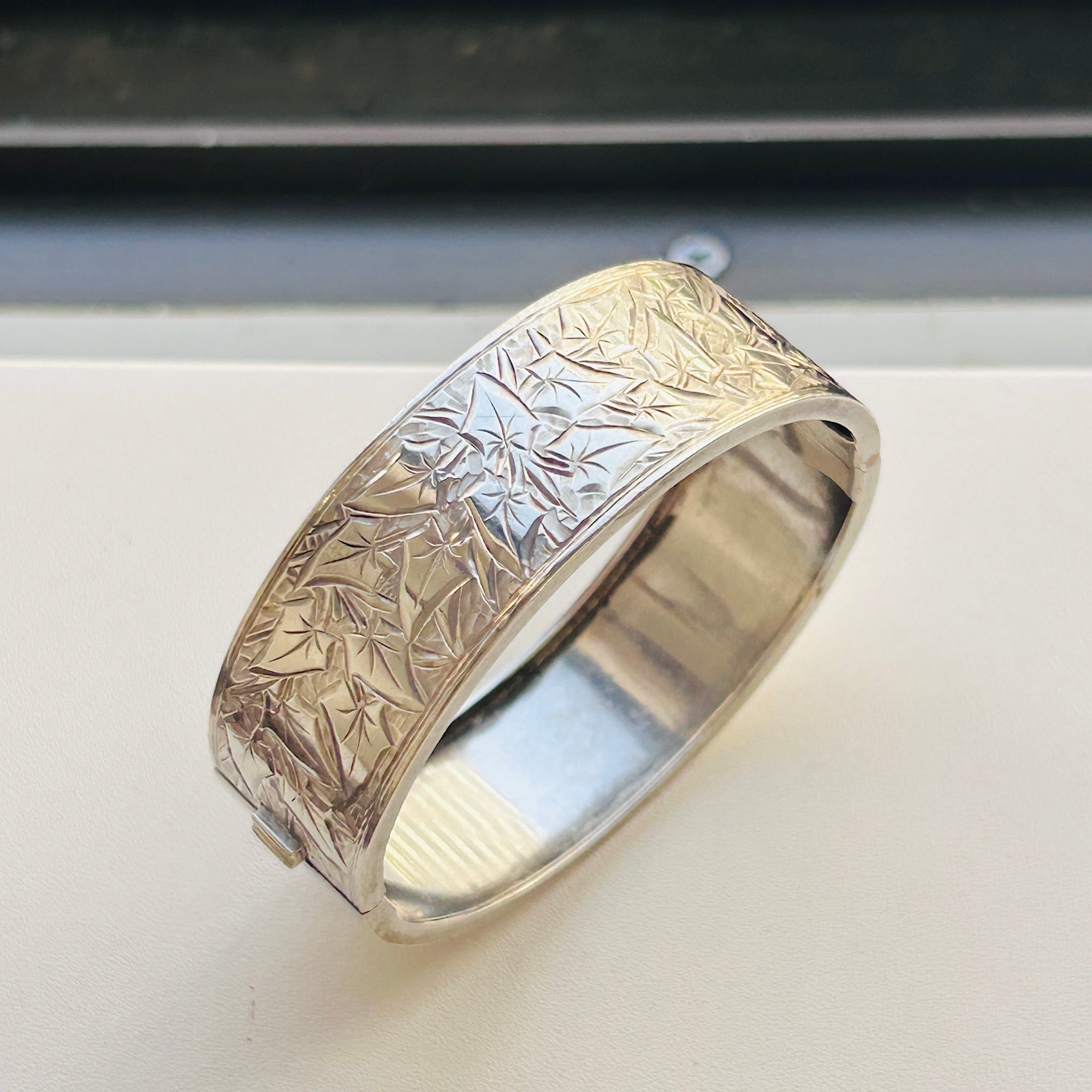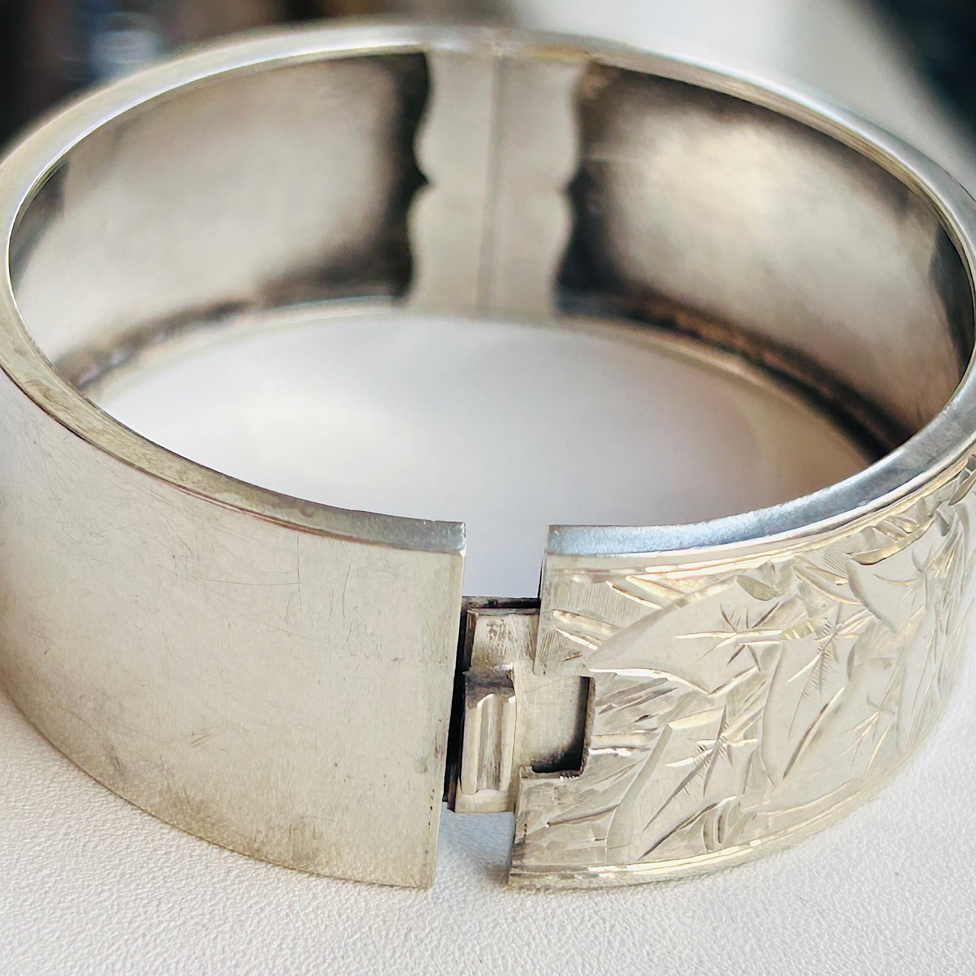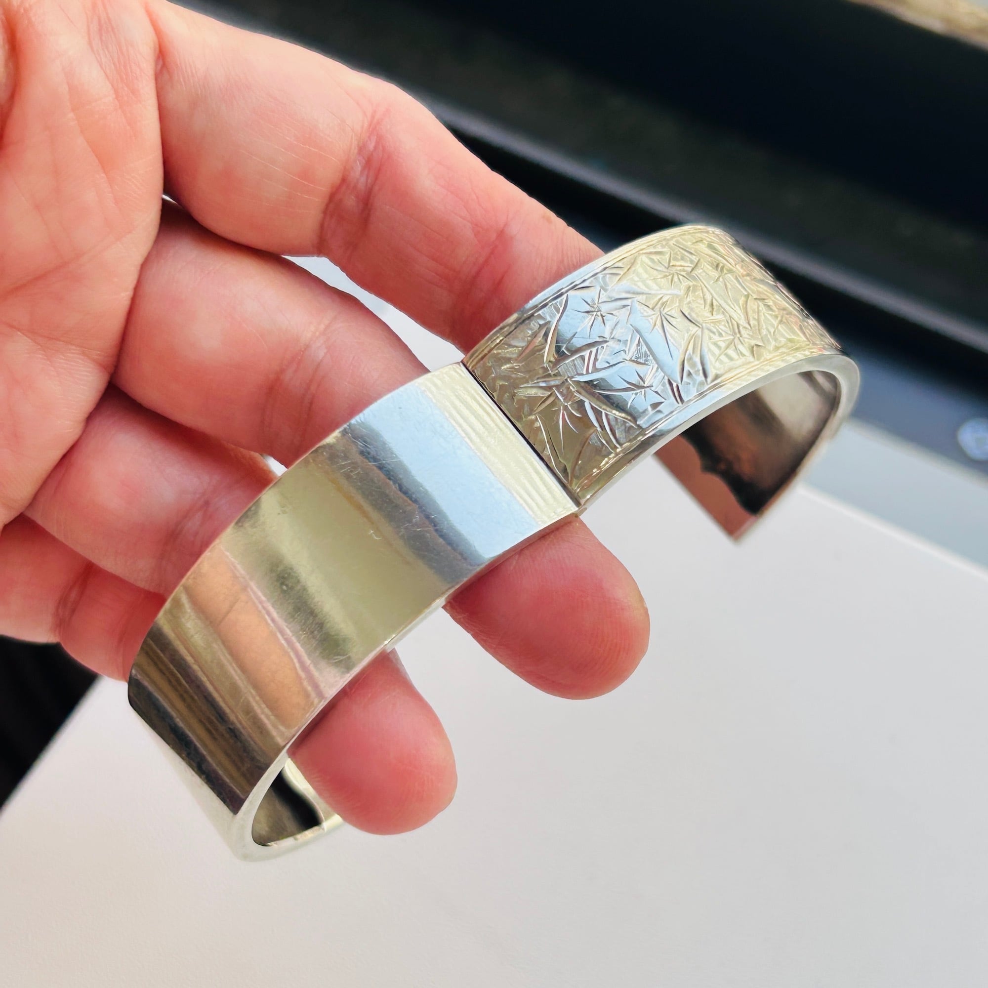 美しくてカッコいい彫りバングル。薄い作りで上手な作り、職人の手仕事を感じるアートな作品です。サイズは私の手首(14.5~15cm)にちょうど。重すぎず着けやすいです。着脱は突起を下に押して引き抜いて下さい。差し込み金具はカチっとしっかり締まります。作家やメーカー名、シルバー刻印のない無名の名工による逸品。大変オススメです。送料無料でお届け致します。