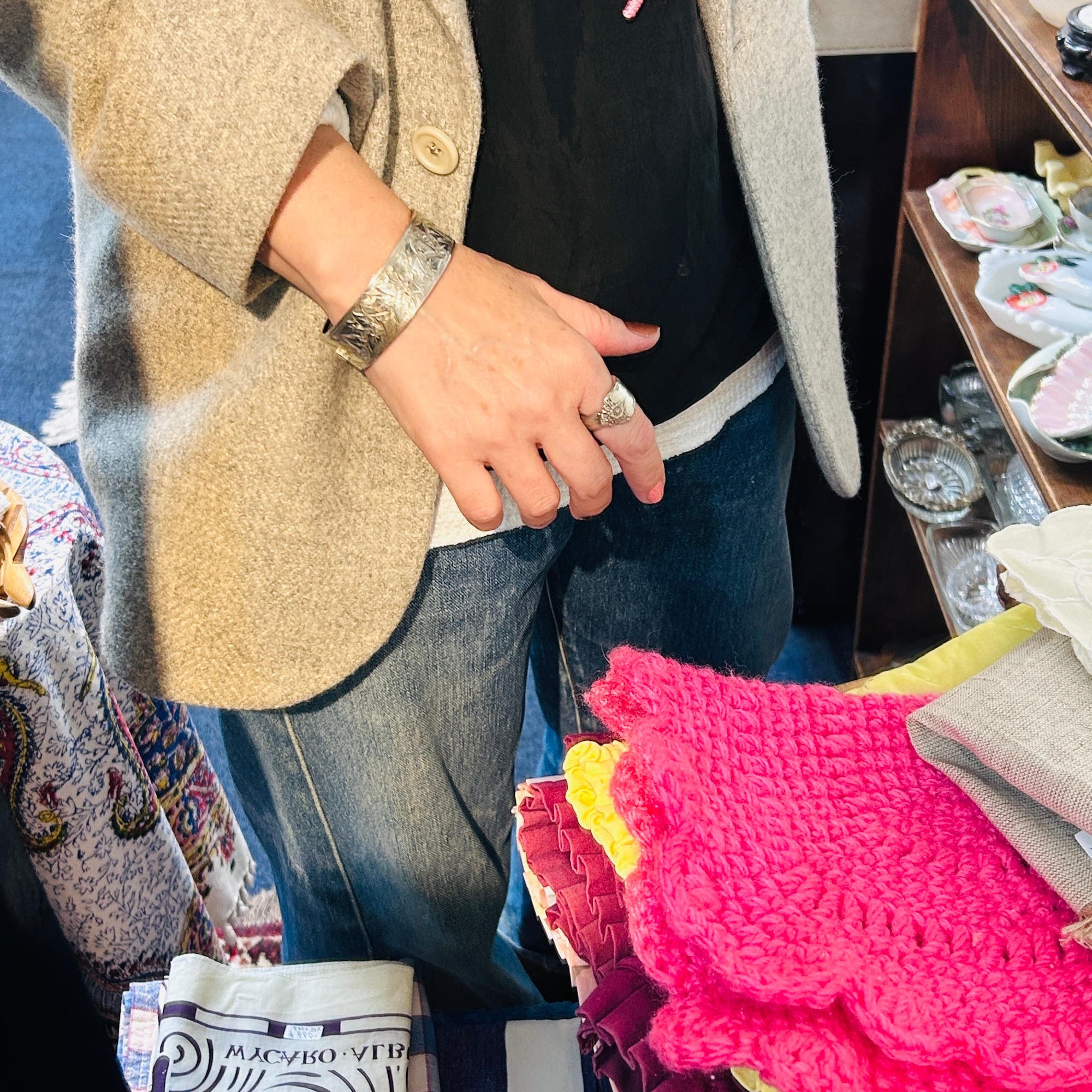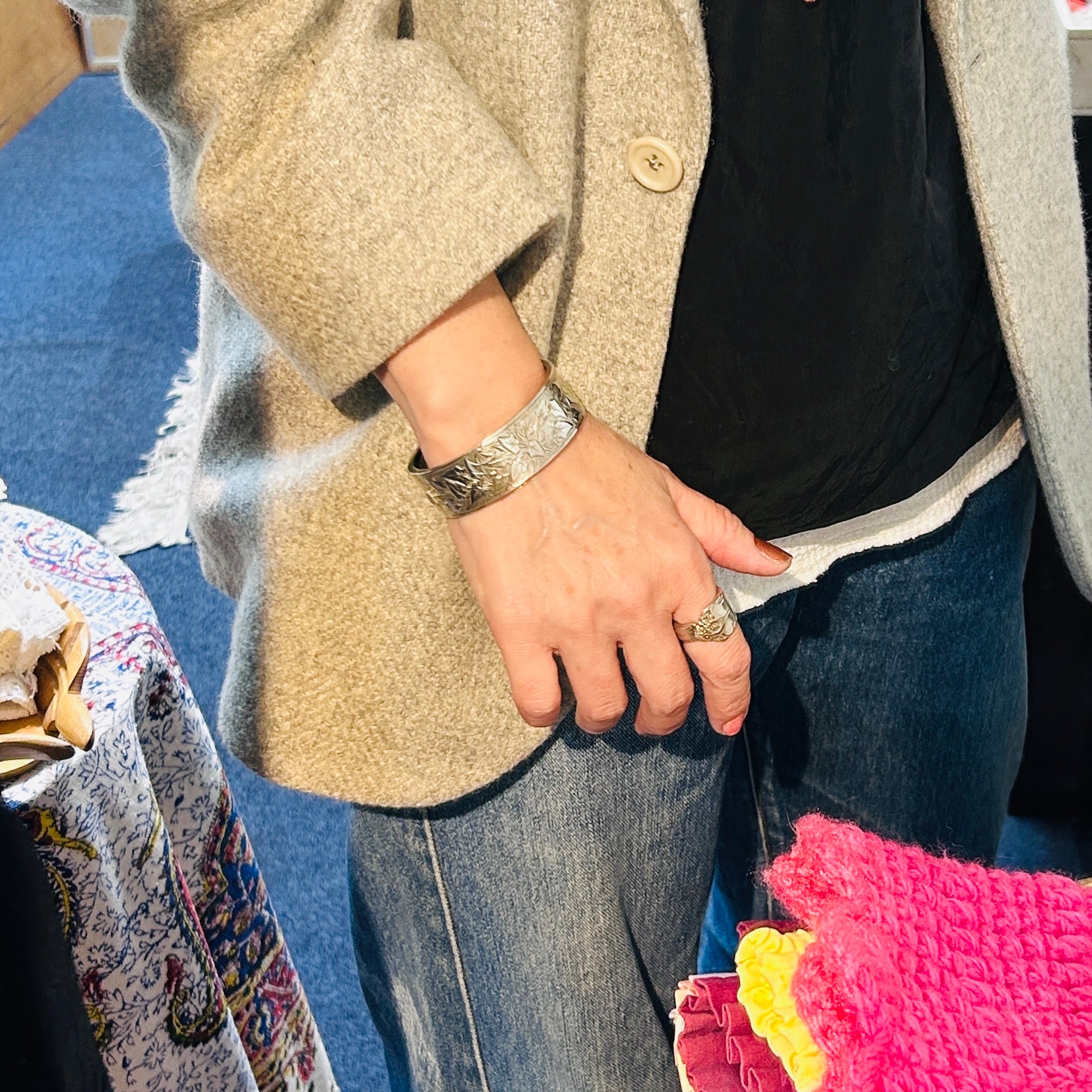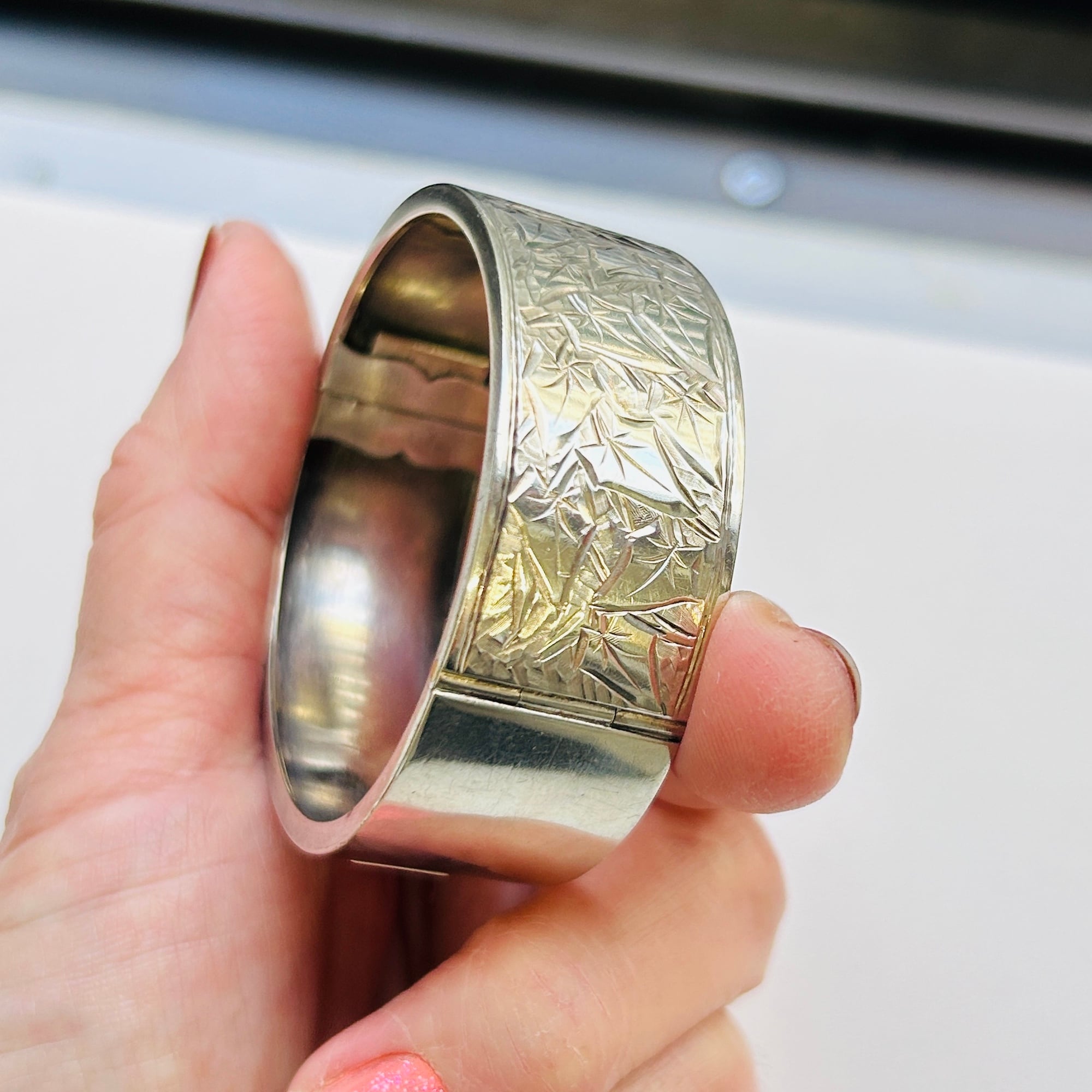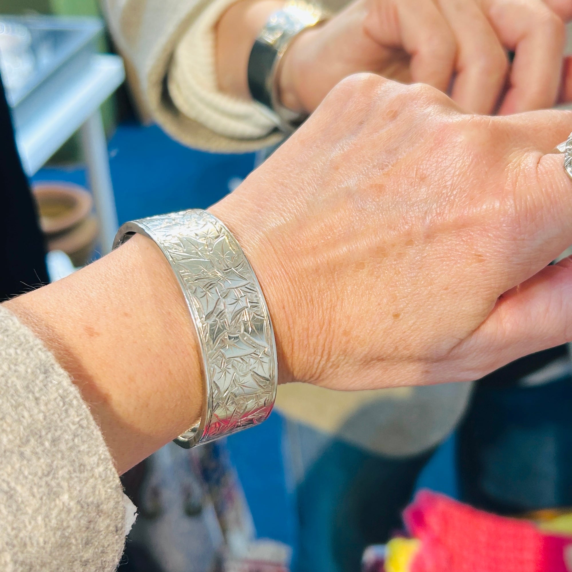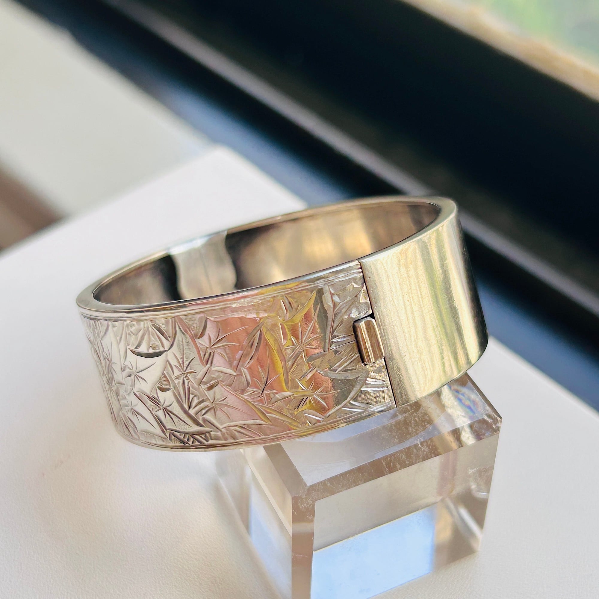 美しくてカッコいい彫りバングル。薄い作りで上手な作り、職人の手仕事を感じるアートな作品です。サイズは私の手首(14.5~15cm)にちょうど。重すぎず着けやすいです。着脱は突起を下に押して引き抜いて下さい。差し込み金具はカチっとしっかり締まります。作家やメーカー名、シルバー刻印のない無名の名工による逸品。大変オススメです。送料無料でお届け致します。