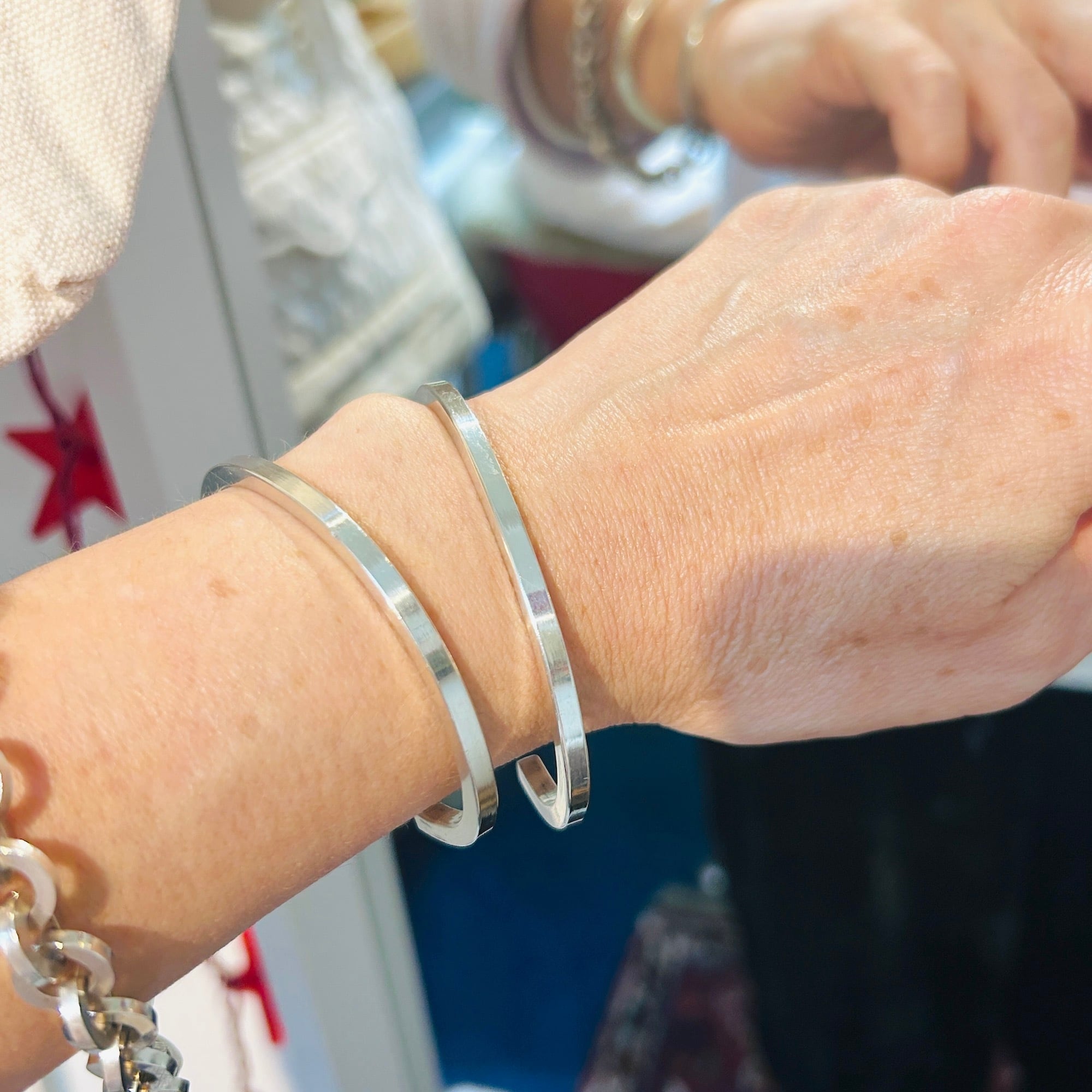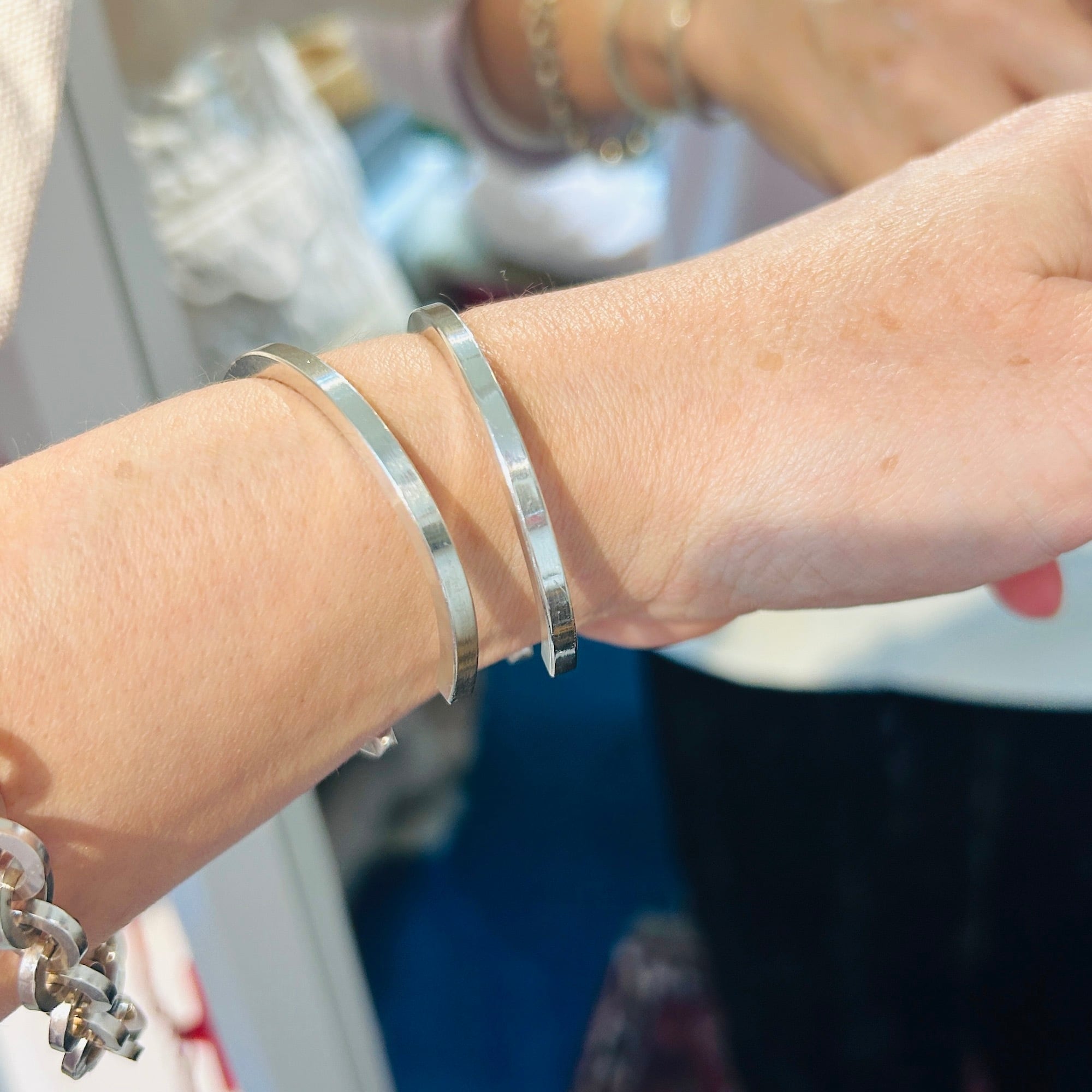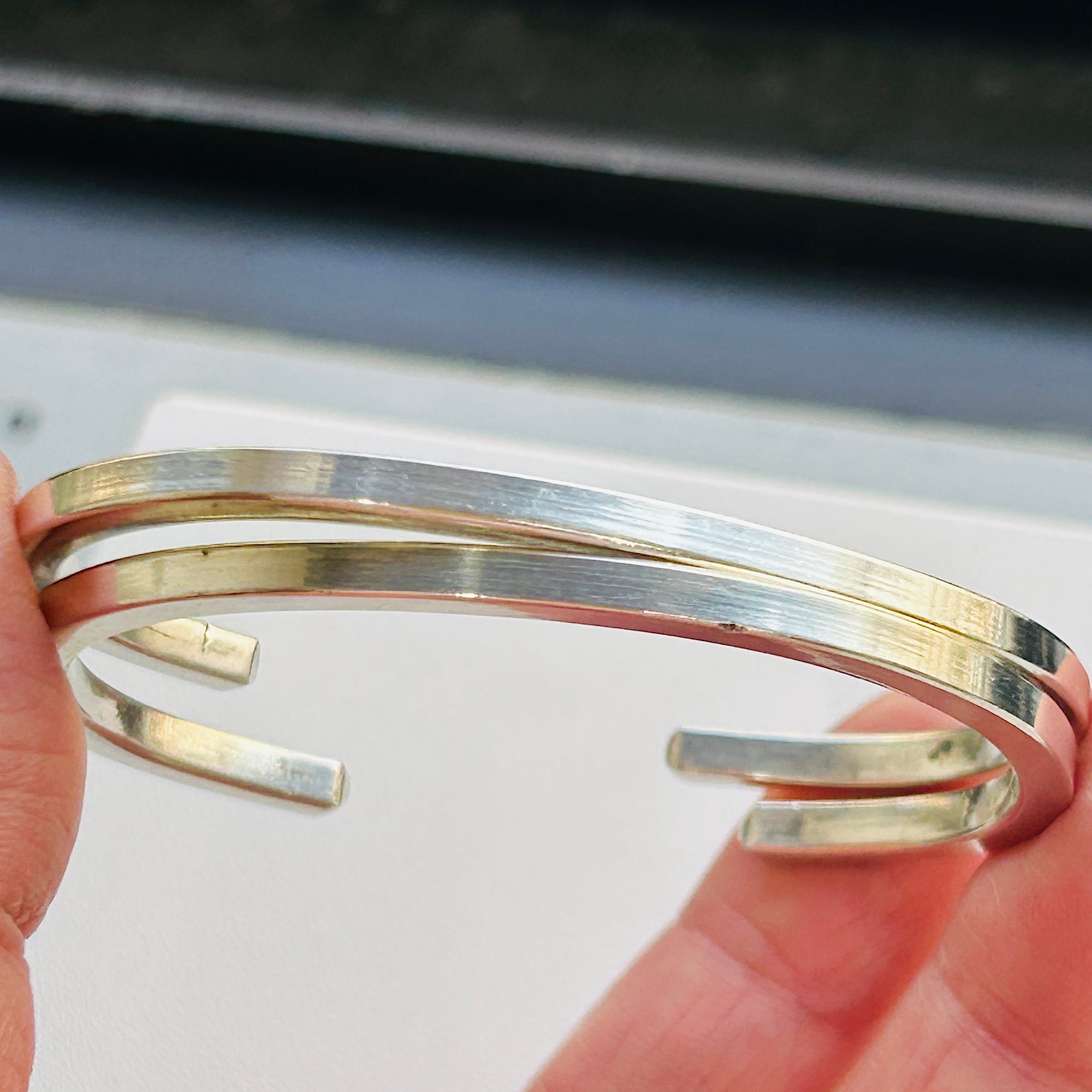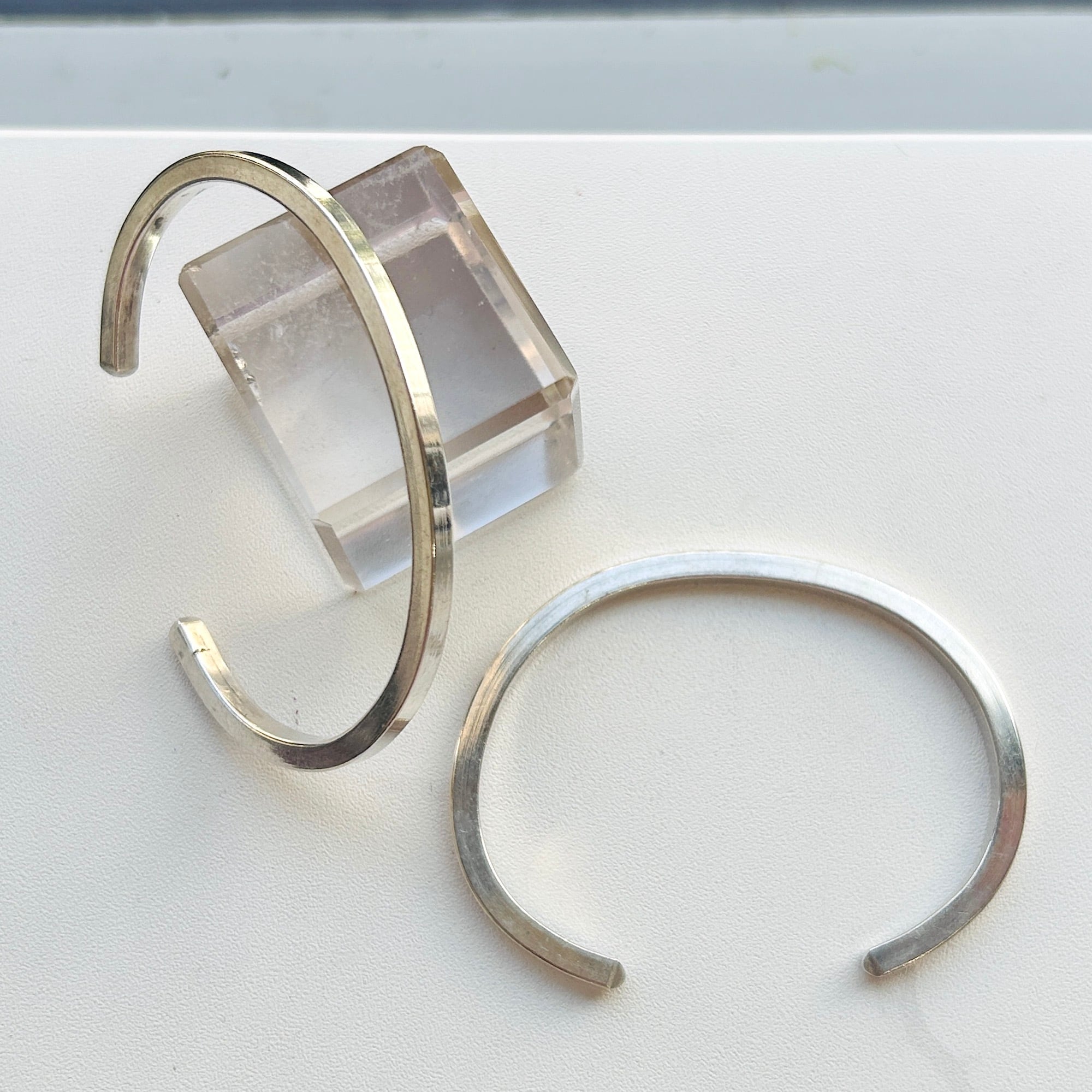 スーパーシンプル、3.5mm幅のソリッドシルバーバングル2点入荷しました。厚みも3mm弱ありますので手元でクッキリ見えます。大と小、どちらかのサイズを選んでお買い物下さい。開口部分のエッジは角が取れているので着脱時、手首にガリっと食い込まないよう配慮された優しい作りになっています。作家名、シルバー刻印等ないですが非常に上手に作られています。2つ一緒に着けるのもカッコいいです:)
