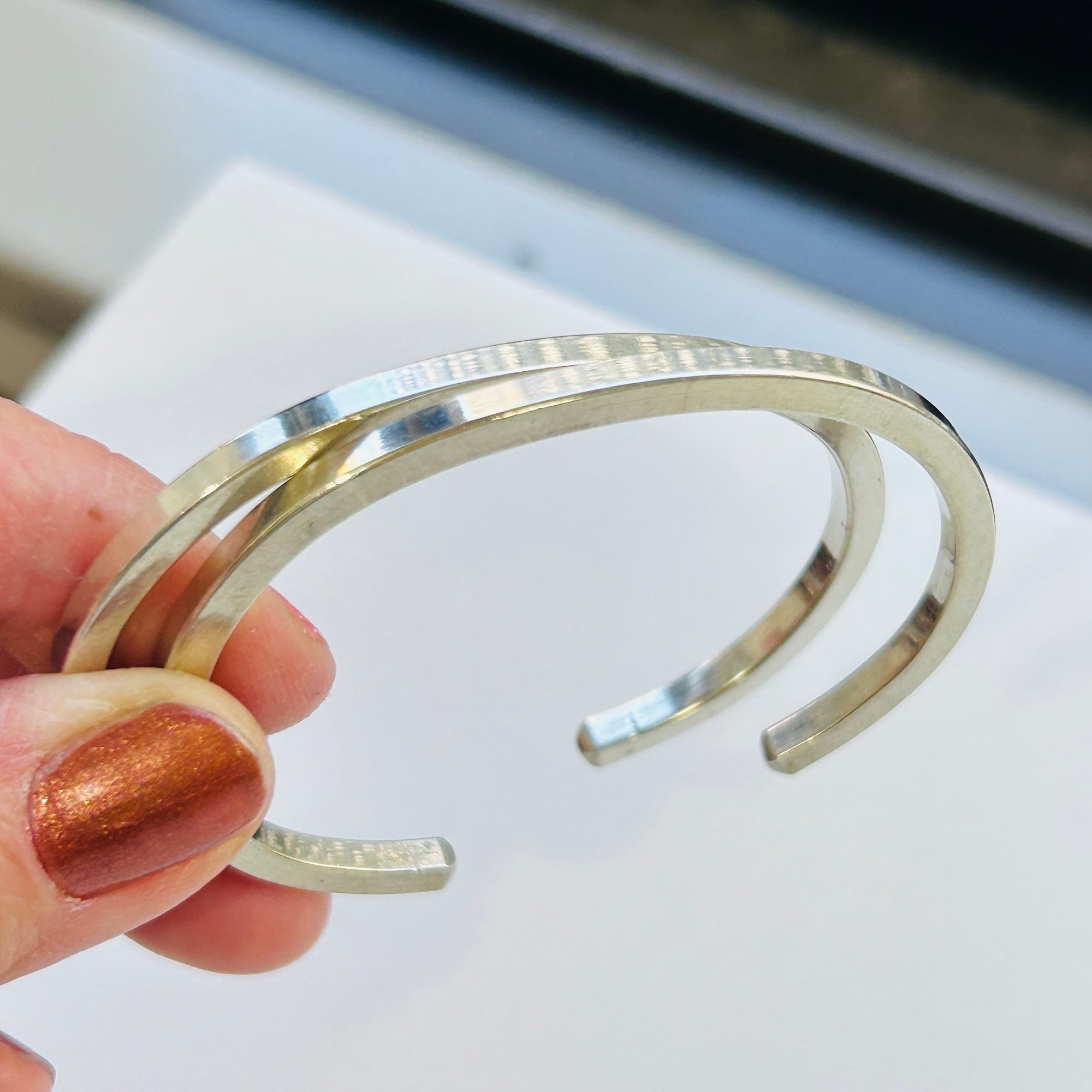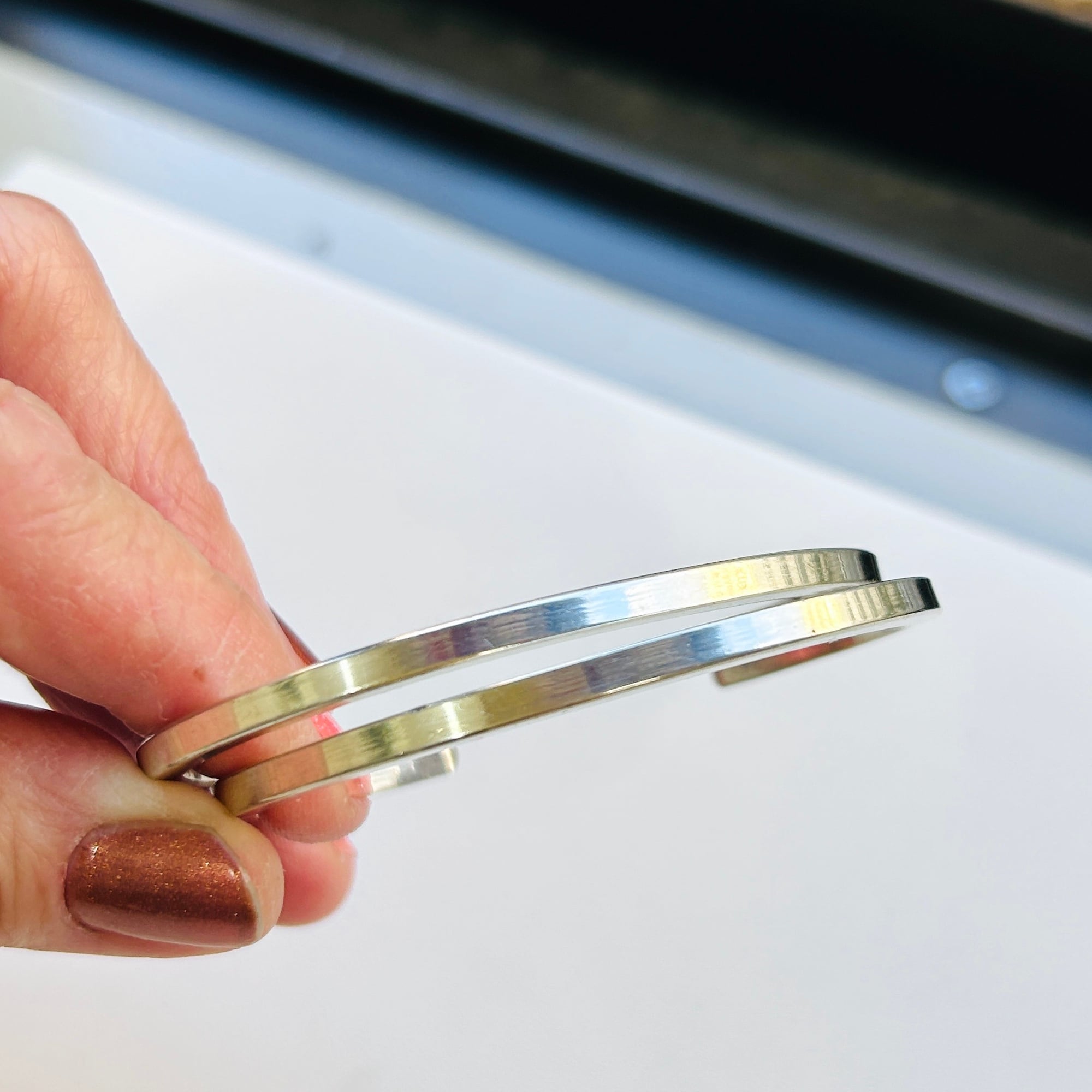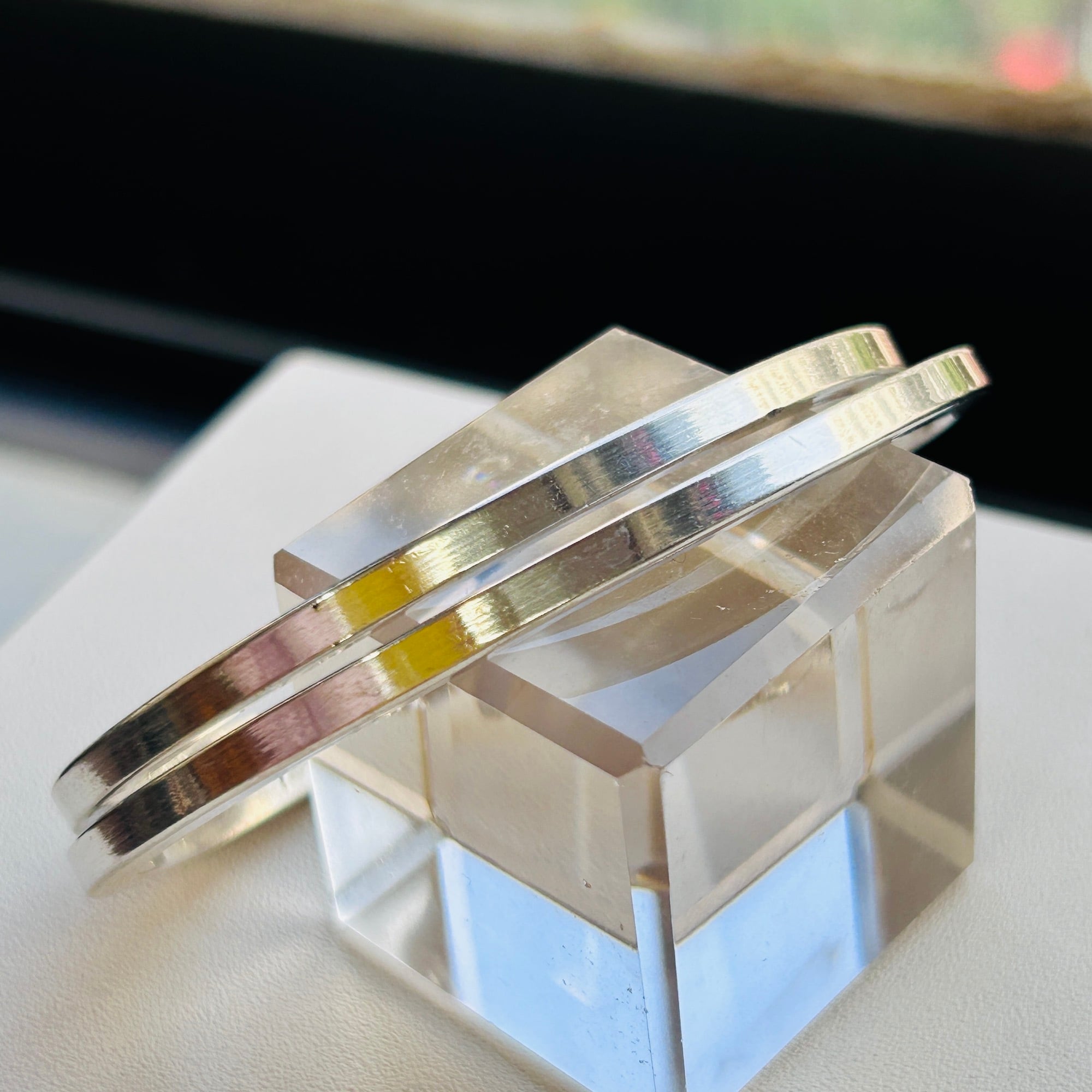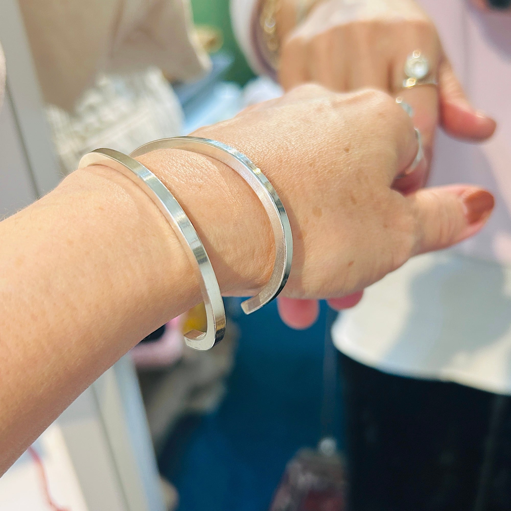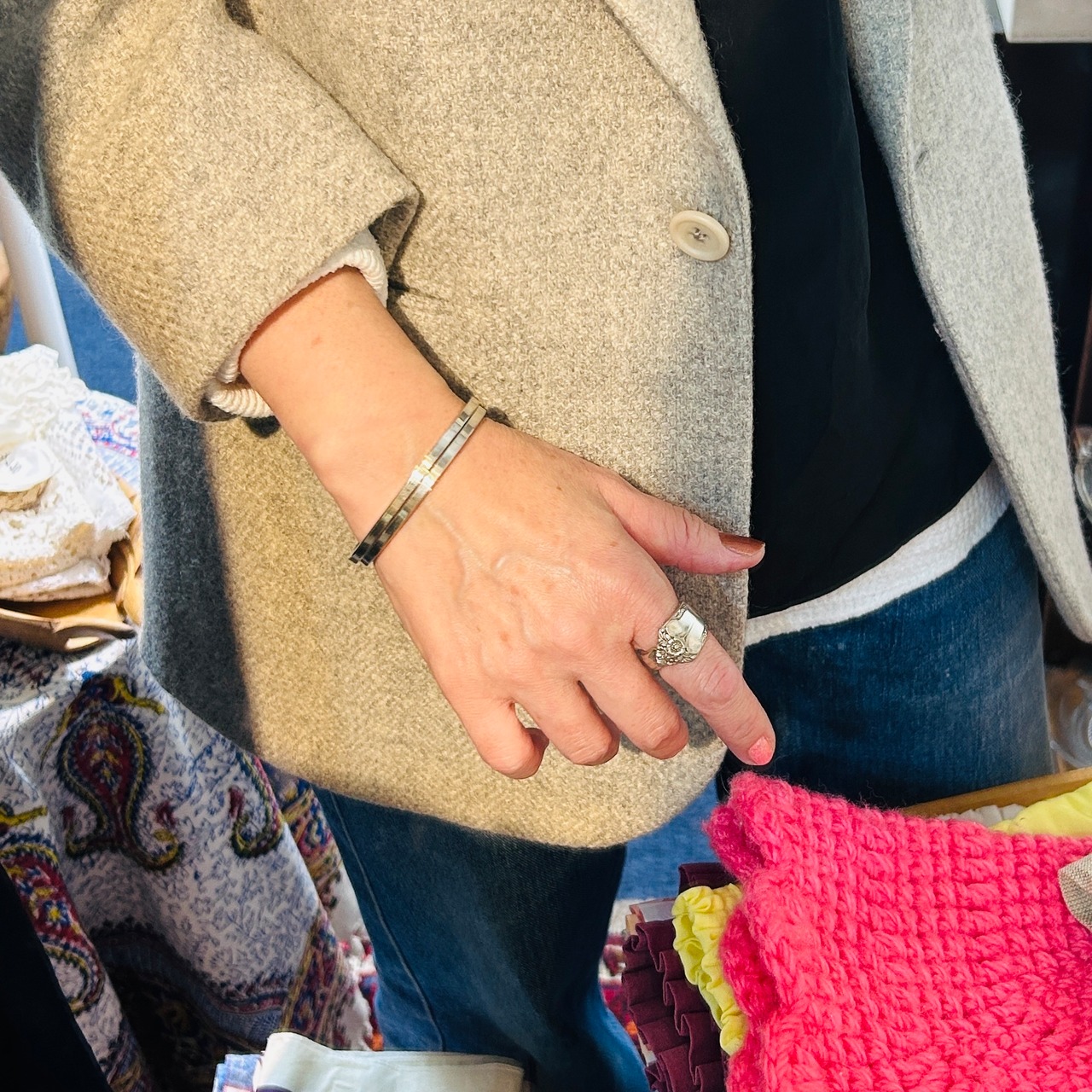 スーパーシンプル、3.5mm幅のソリッドシルバーバングル2点入荷しました。厚みも3mm弱ありますので手元でクッキリ見えます。大と小、どちらかのサイズを選んでお買い物下さい。開口部分のエッジは角が取れているので着脱時、手首にガリっと食い込まないよう配慮された優しい作りになっています。作家名、シルバー刻印等ないですが非常に上手に作られています。2つ一緒に着けるのもカッコいいです:)