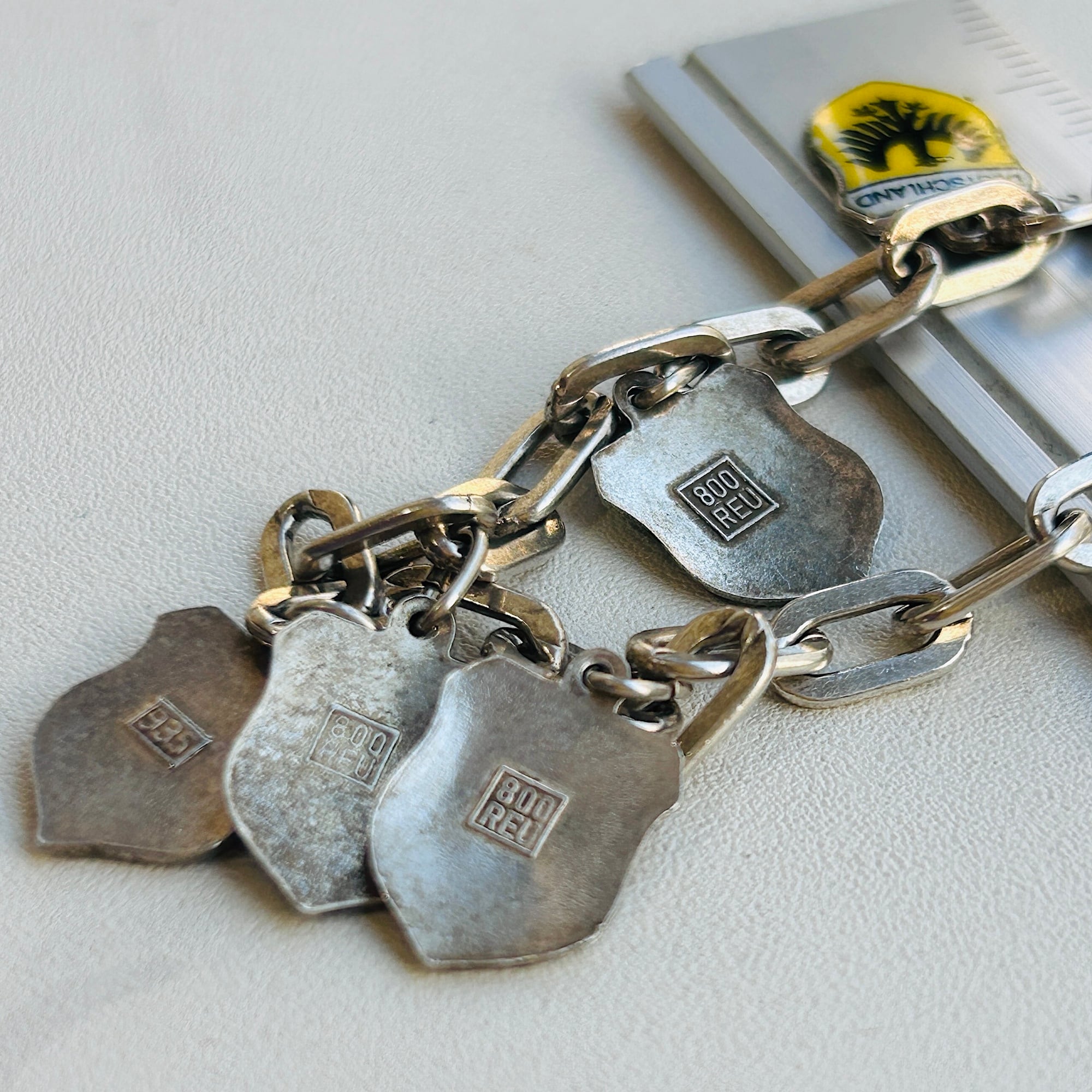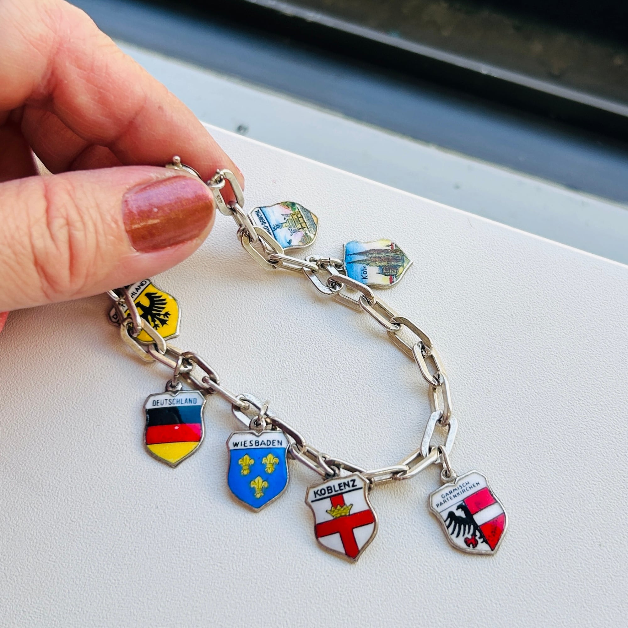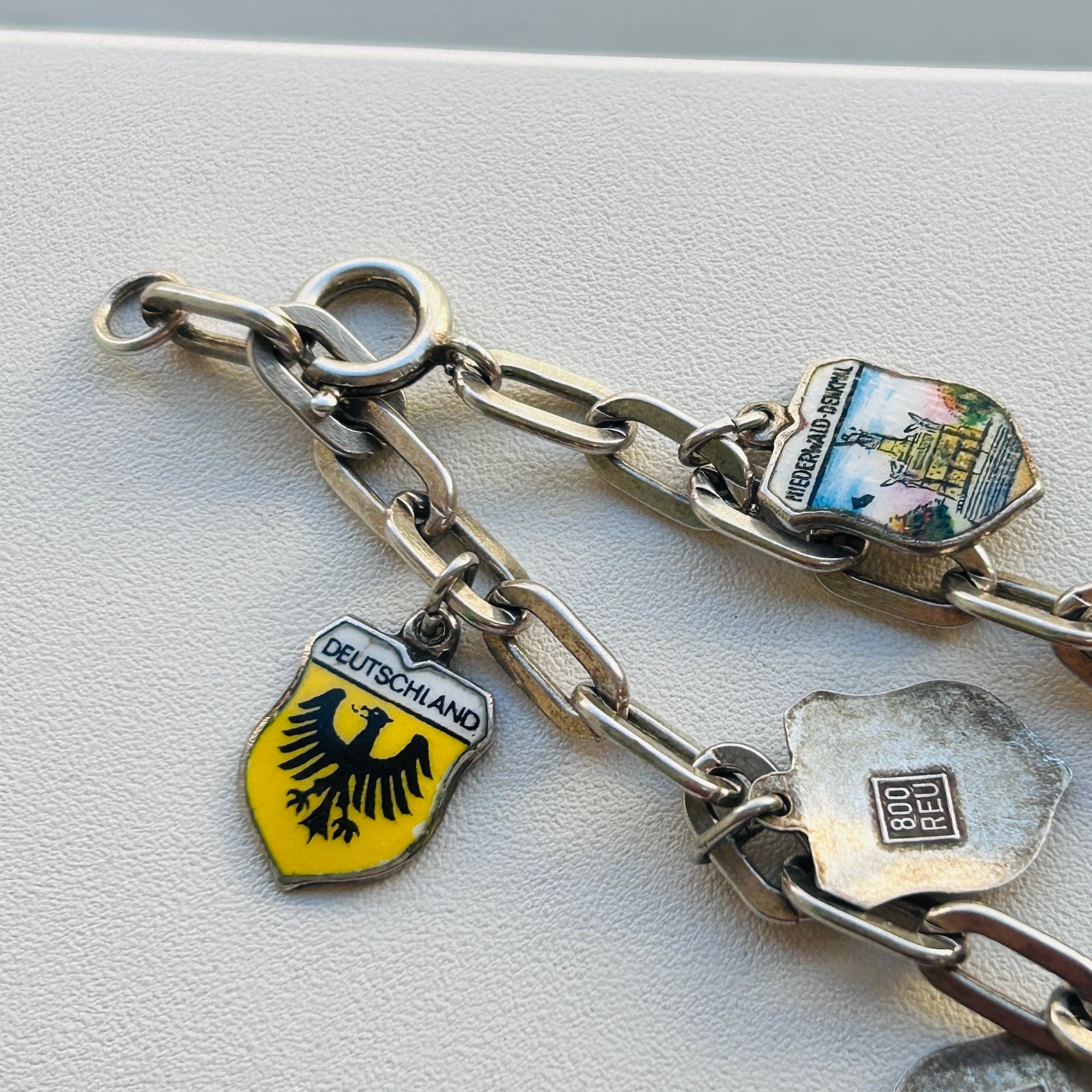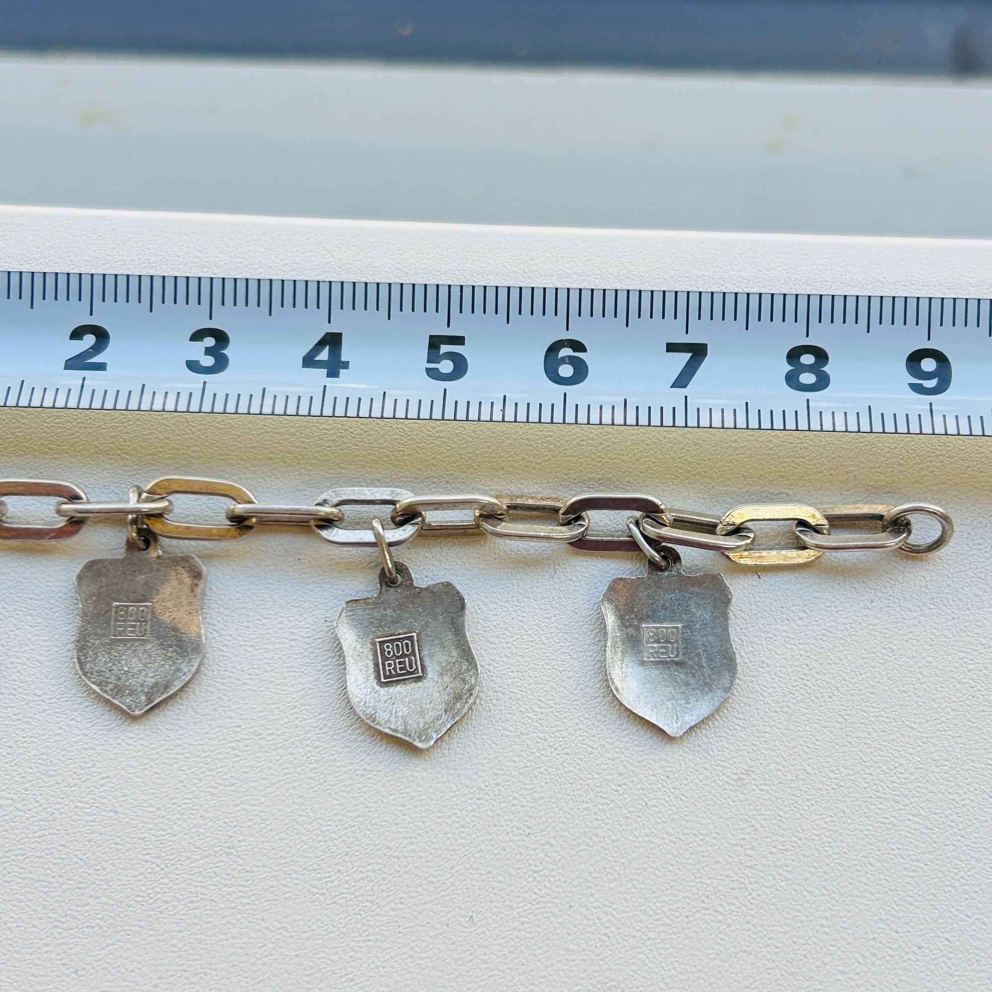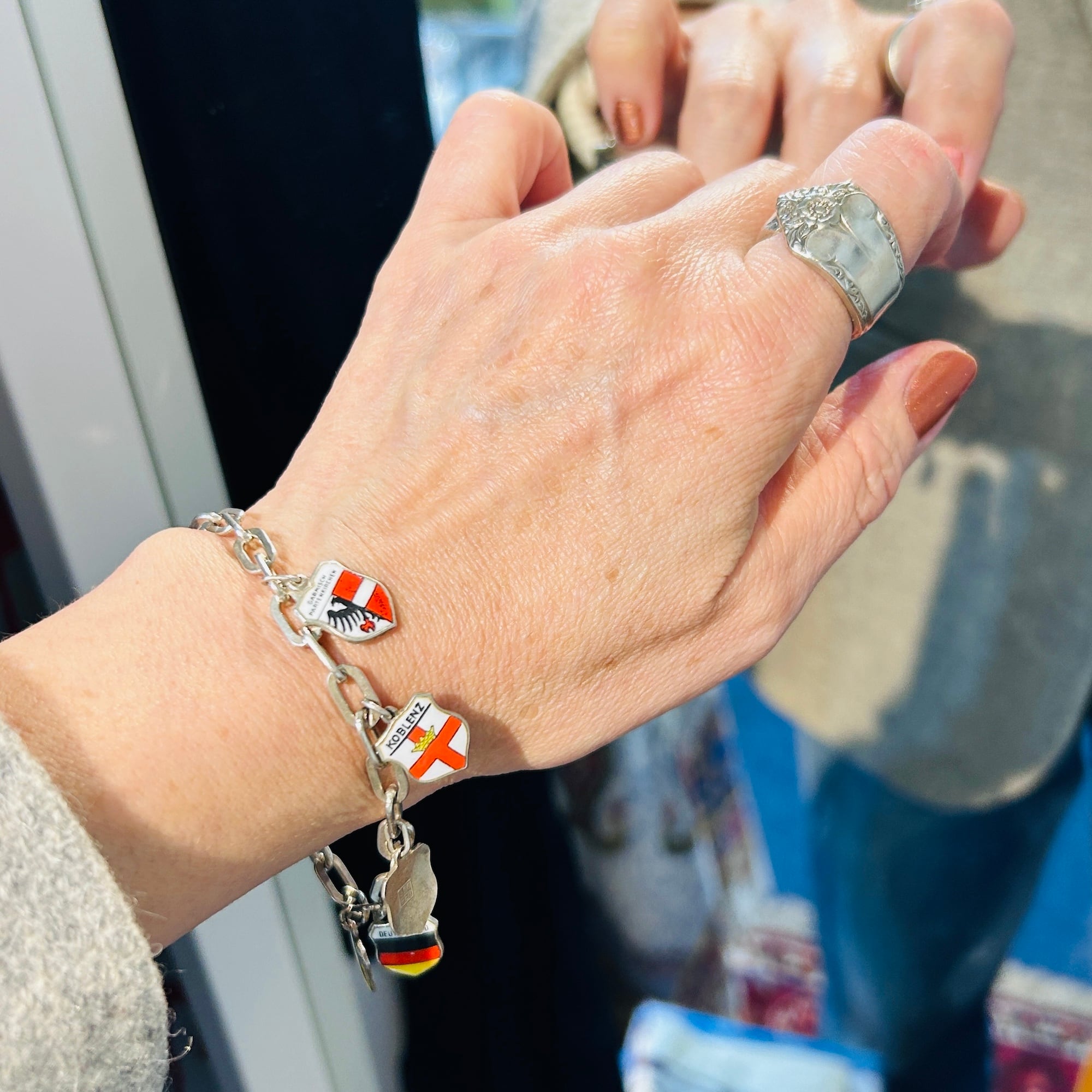 ドイツの地名などが描かれた盾型エナメルチャームが付いたブレスレット。太いクリップチェーンが洒落ています。チャームは7個、全ての裏側に「800 REU」又は「835」刻印。チェーンにも「835」。丸い引き輪が大きくて使いやすいです。引き輪はクリップチェーンに引っ掛けることで長さ調整可能です。引き輪の反対側のエンド、輪がクリップチェーンにロウ付けされているので使いやすいです。手元に個性が出るカラフルなチャームブレスレットです。