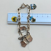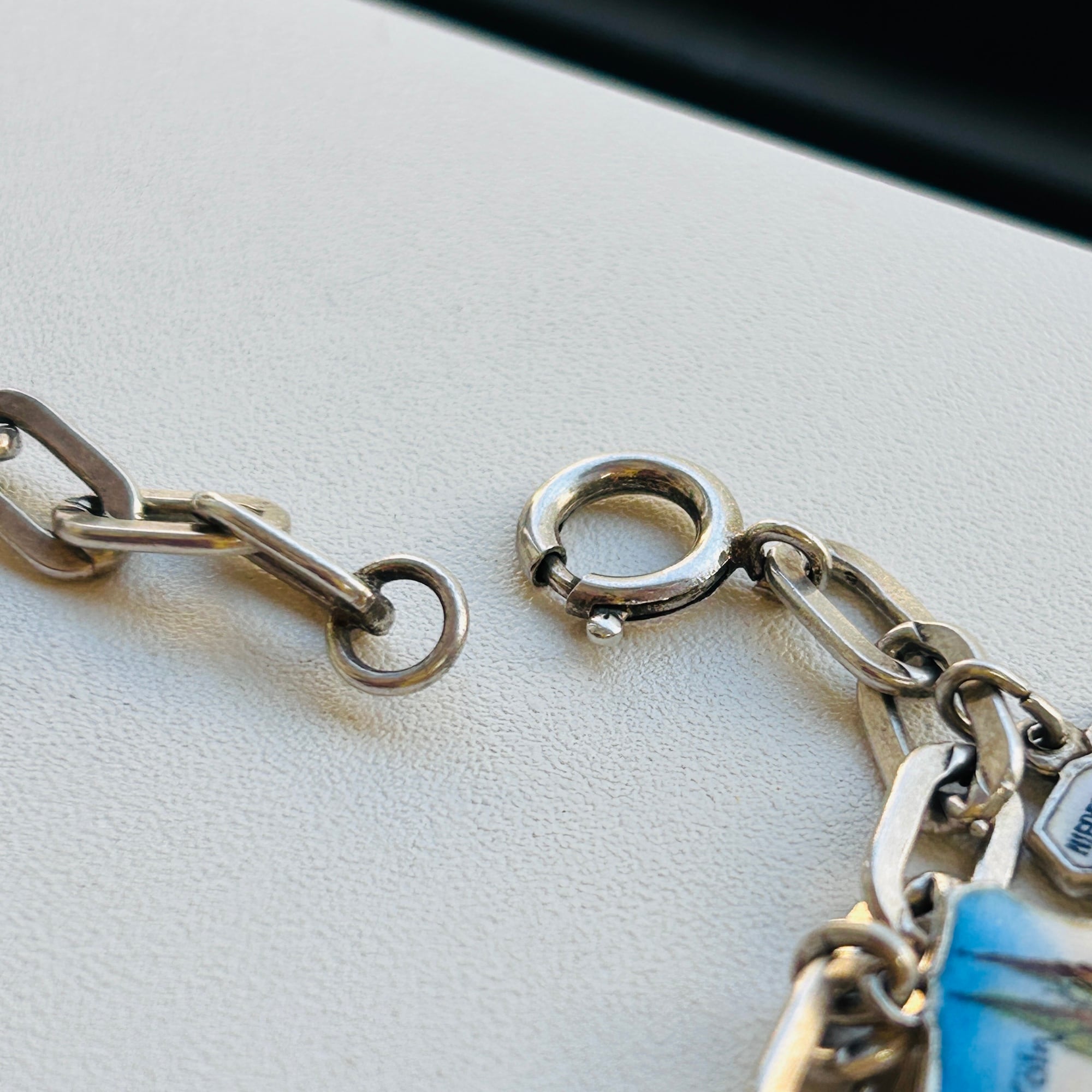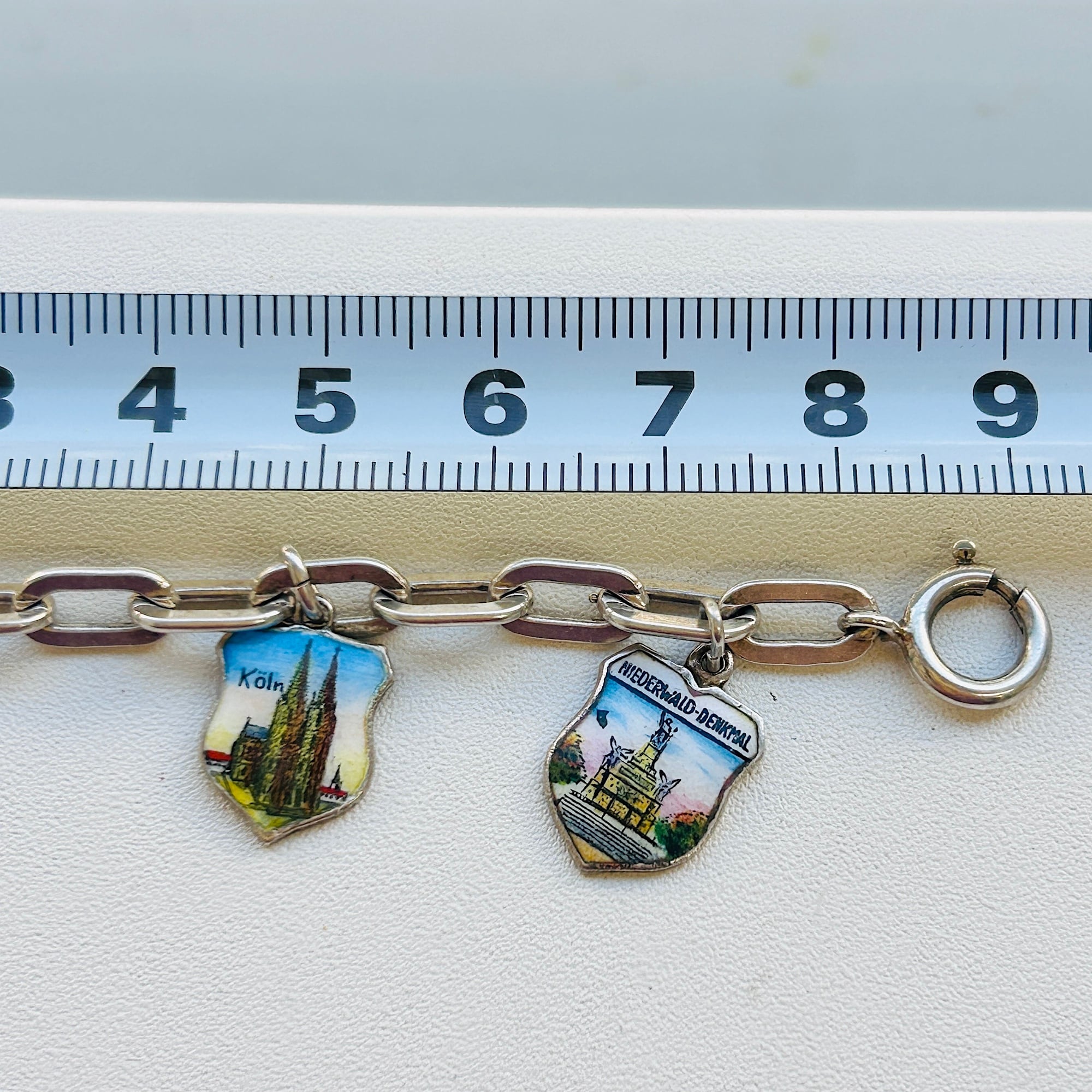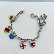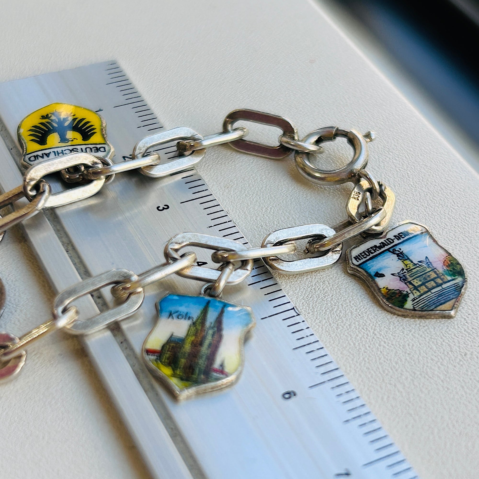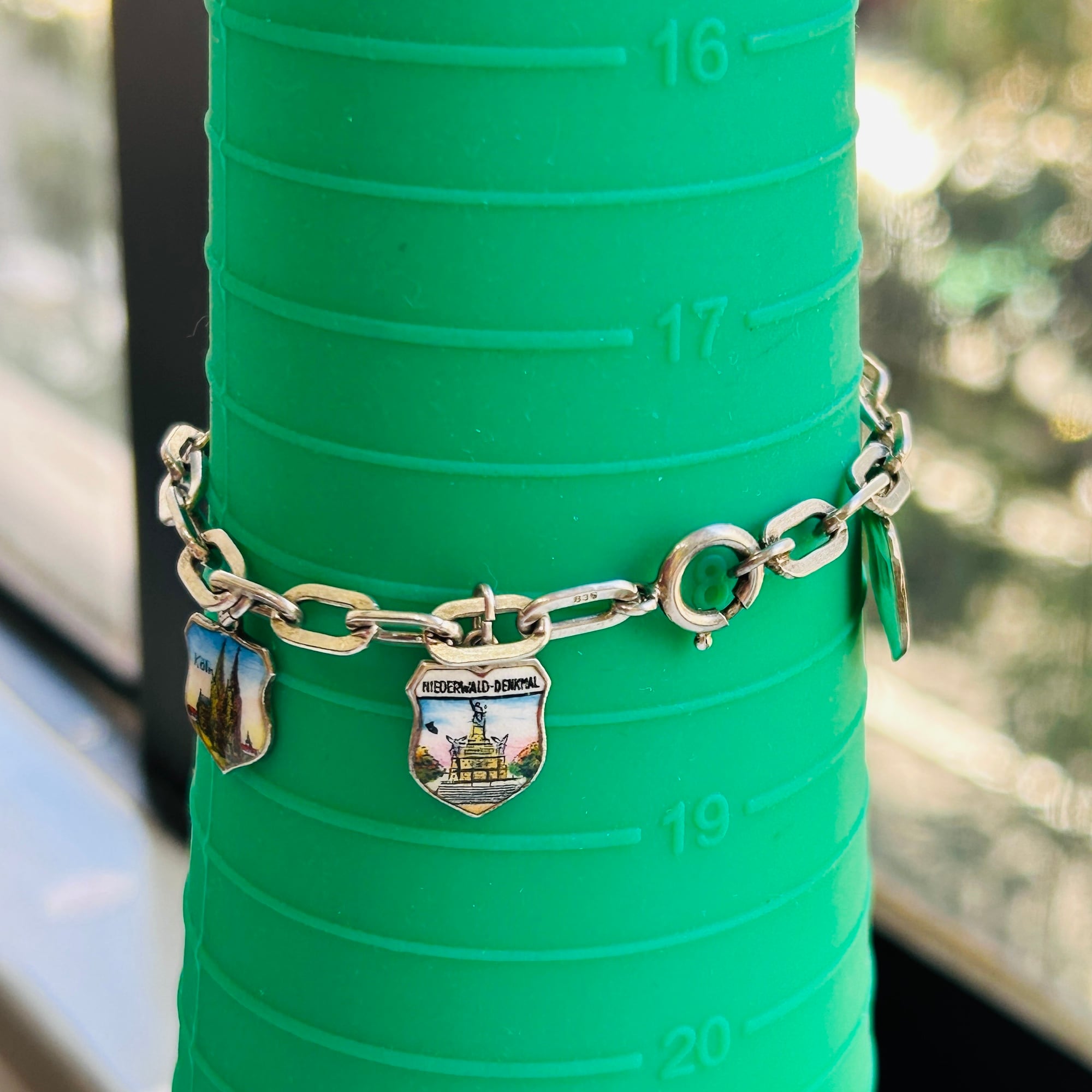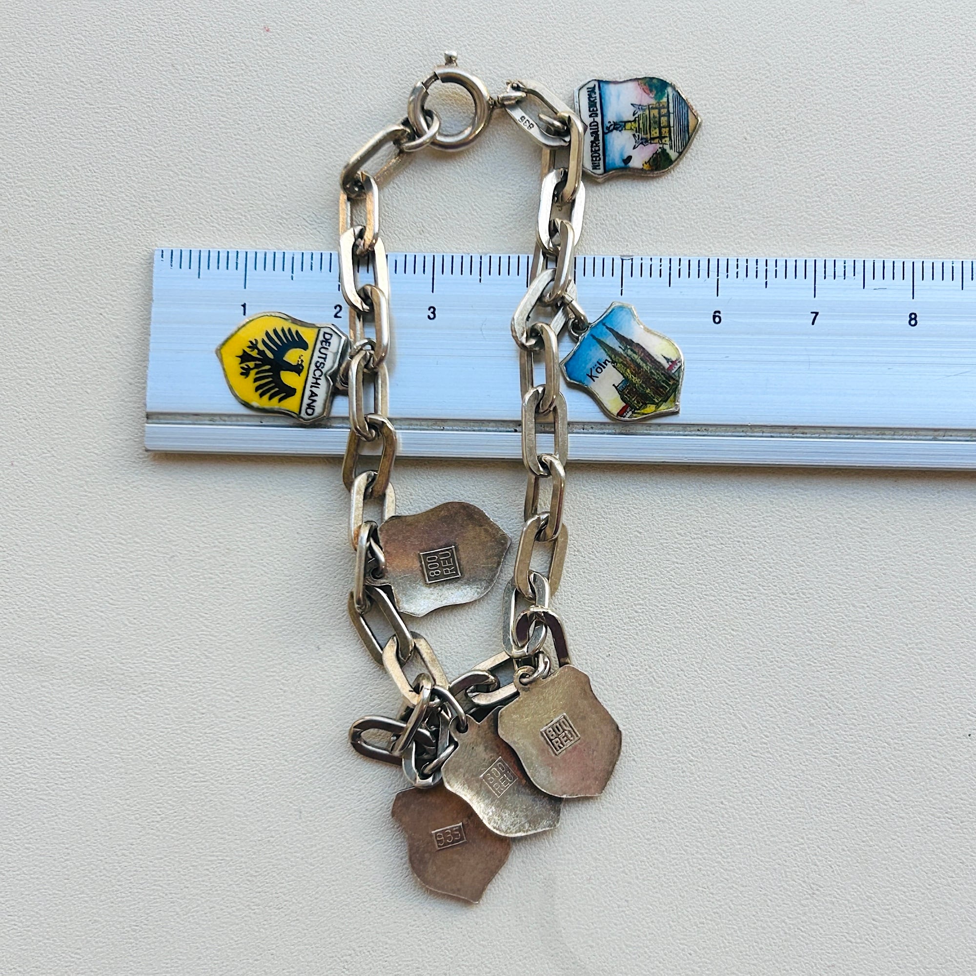 ドイツの地名などが描かれた盾型エナメルチャームが付いたブレスレット。太いクリップチェーンが洒落ています。チャームは7個、全ての裏側に「800 REU」又は「835」刻印。チェーンにも「835」。丸い引き輪が大きくて使いやすいです。引き輪はクリップチェーンに引っ掛けることで長さ調整可能です。引き輪の反対側のエンド、輪がクリップチェーンにロウ付けされているので使いやすいです。手元に個性が出るカラフルなチャームブレスレットです。