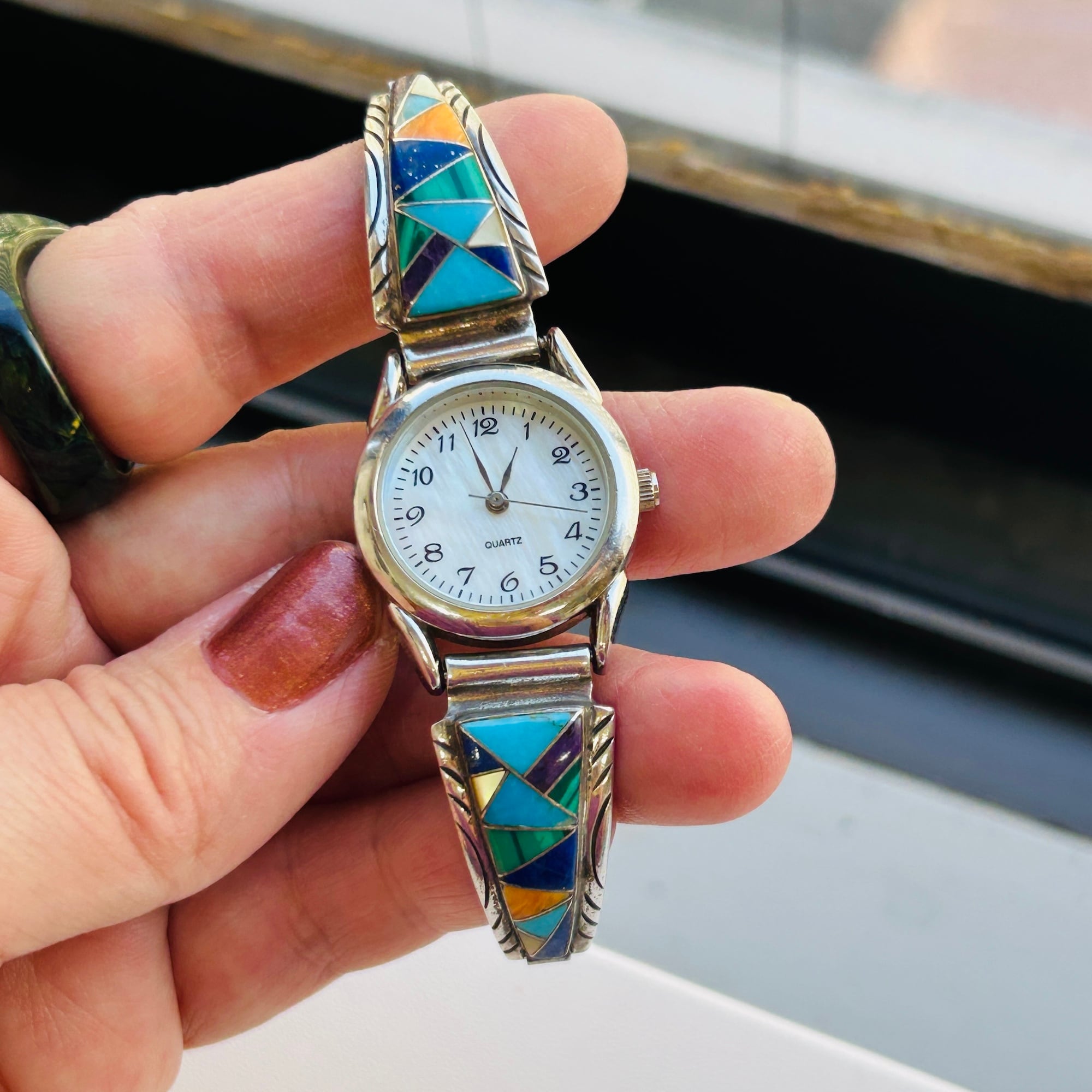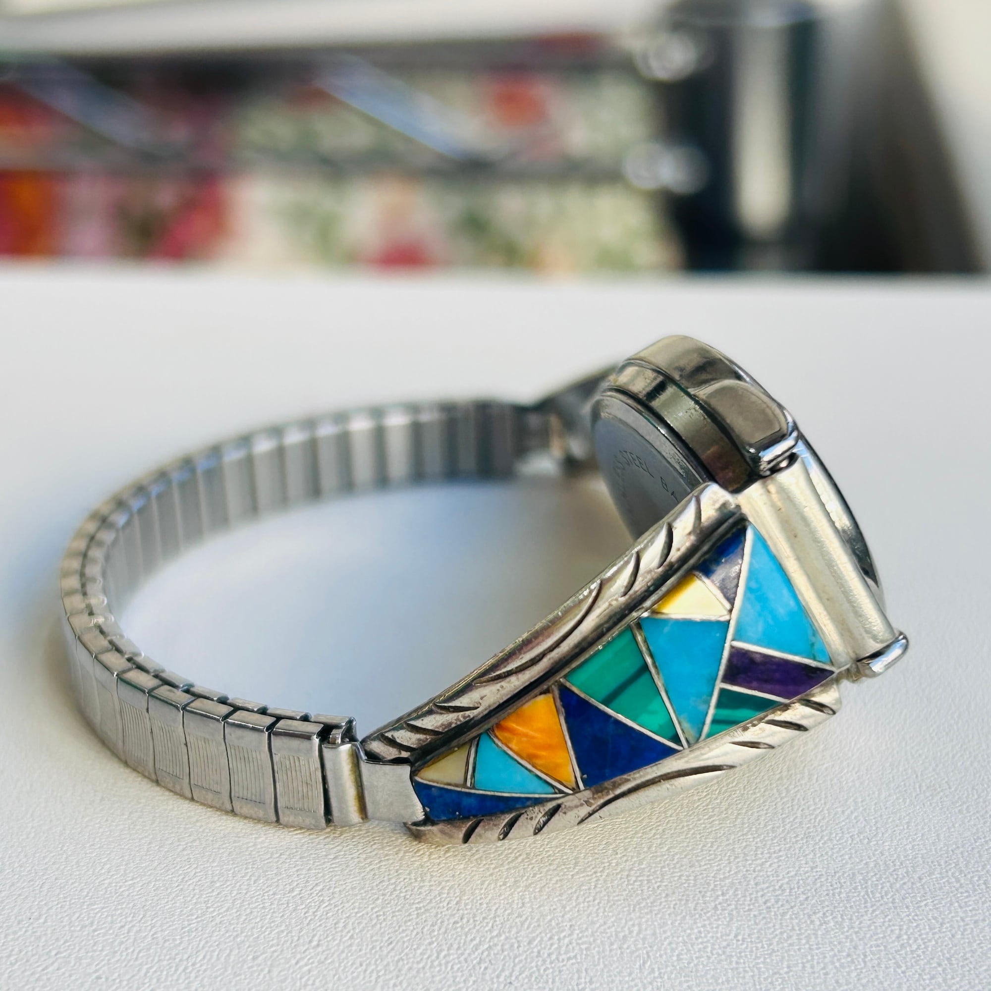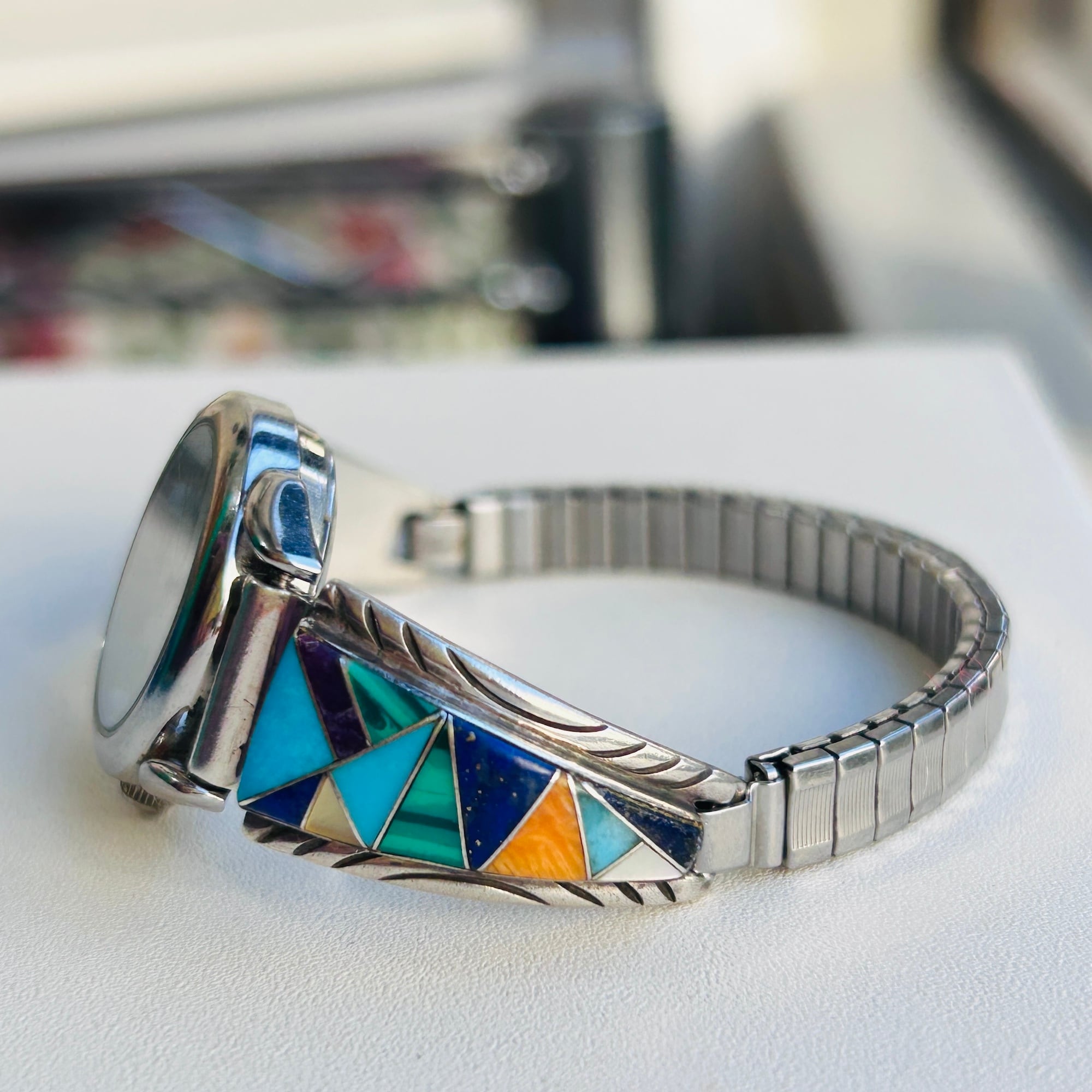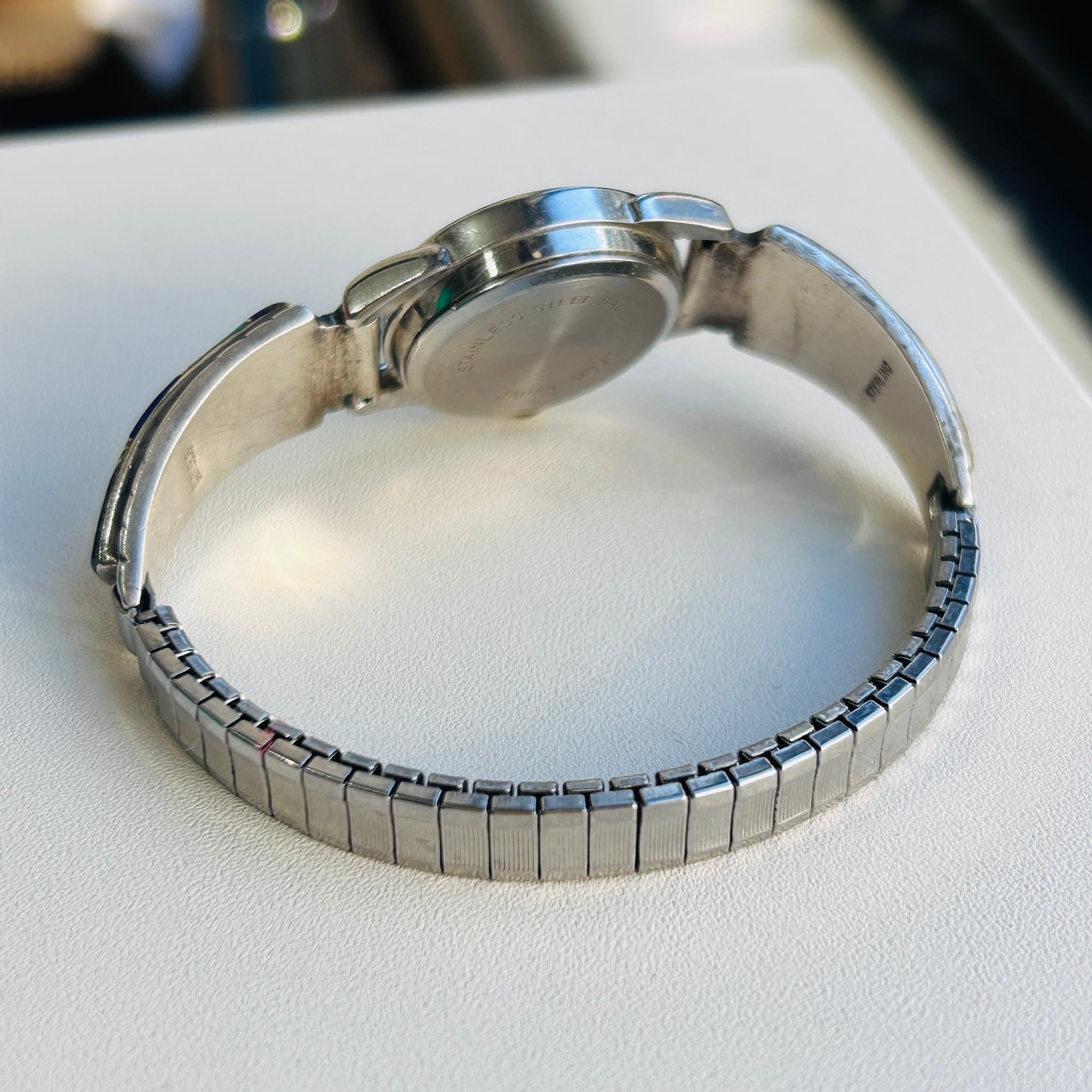 シルバーバンドにストーンが埋め込まれたネイティブアメリカン腕時計。ブレスレットと腕時計が一体化したオシャレなデザインです。カラフルなストーン使いが魅力です。文字盤部分と伸縮バンドはステンレス製です。JAPANメイドのクォーツ時計。電池交換は2025年11月27日、針は正しく動いています。時計の性能に関すること(水に濡れても大丈夫かどうか等々)は分かりかねます。メーリ便発送不可です。ストーン裏に「STERLING」、伸縮バンドに「STAINLESS STEEL」、文字盤裏「JAPAN MOVT」「STAINLESS STEEL BACK」。