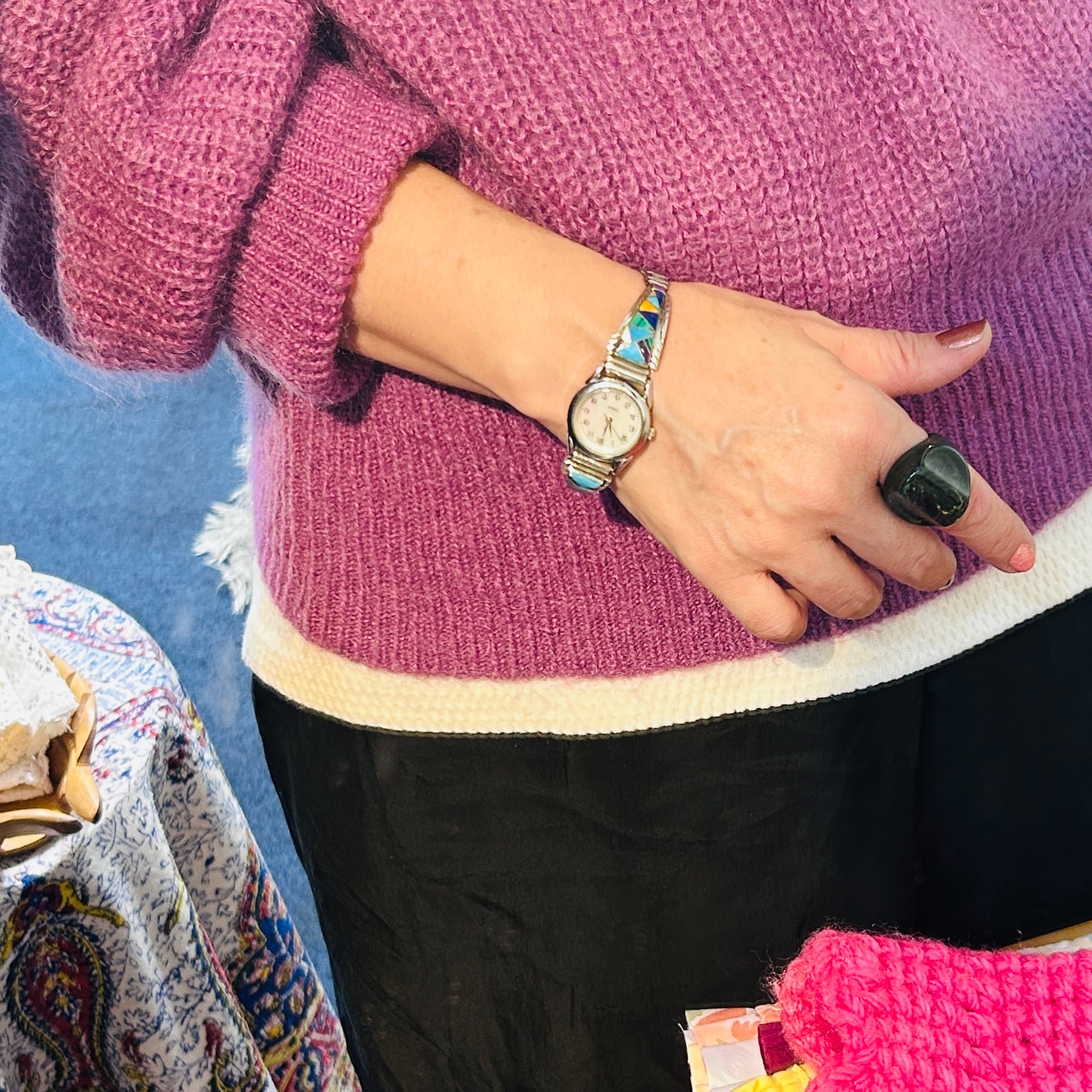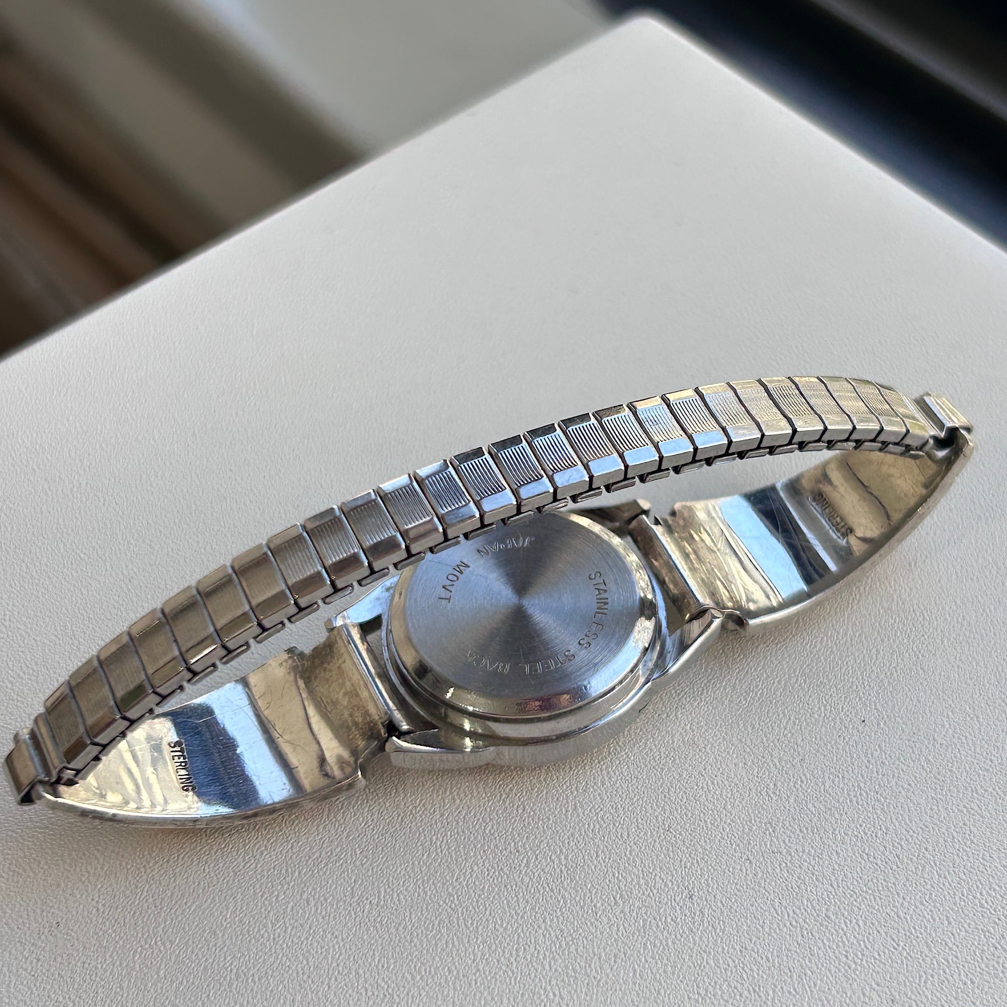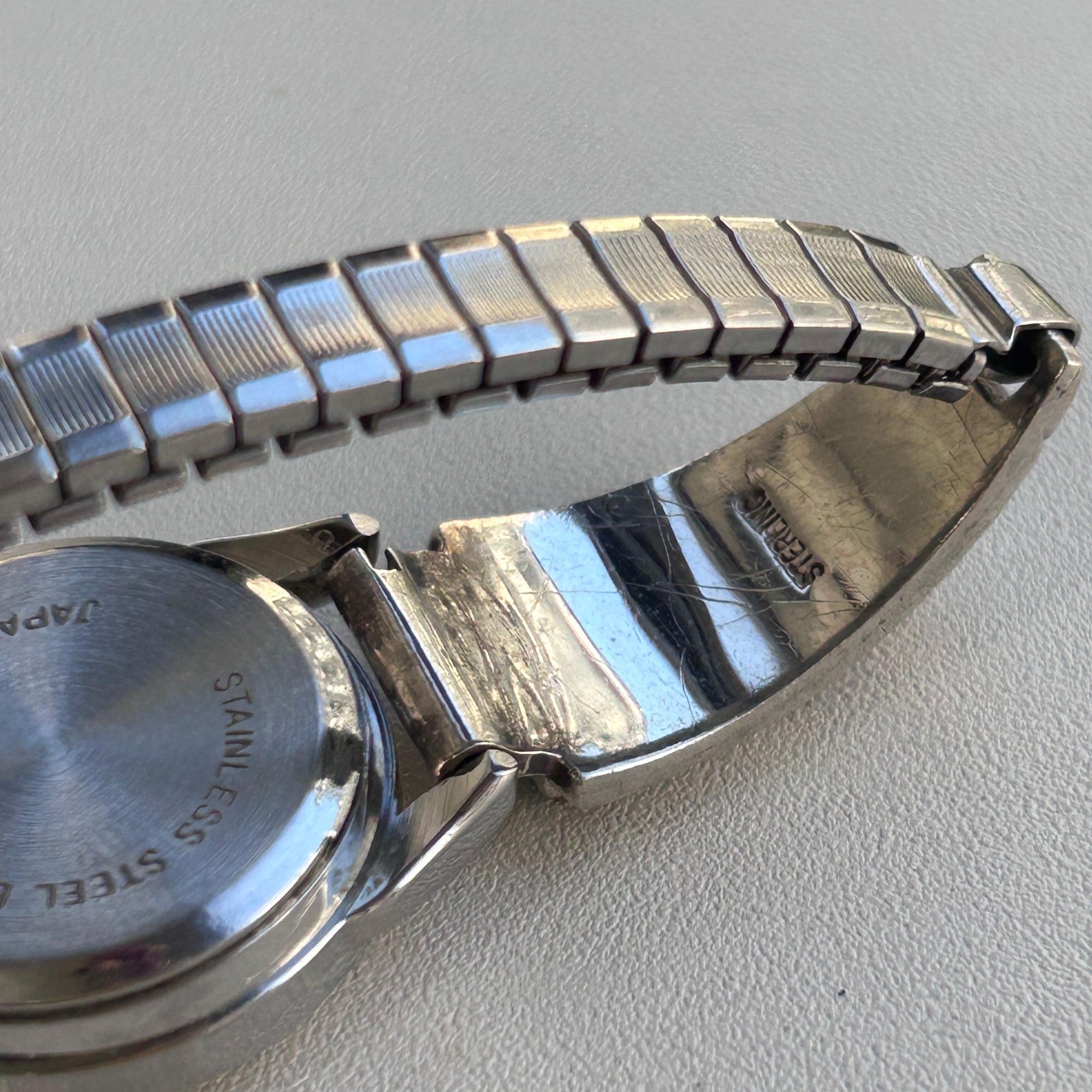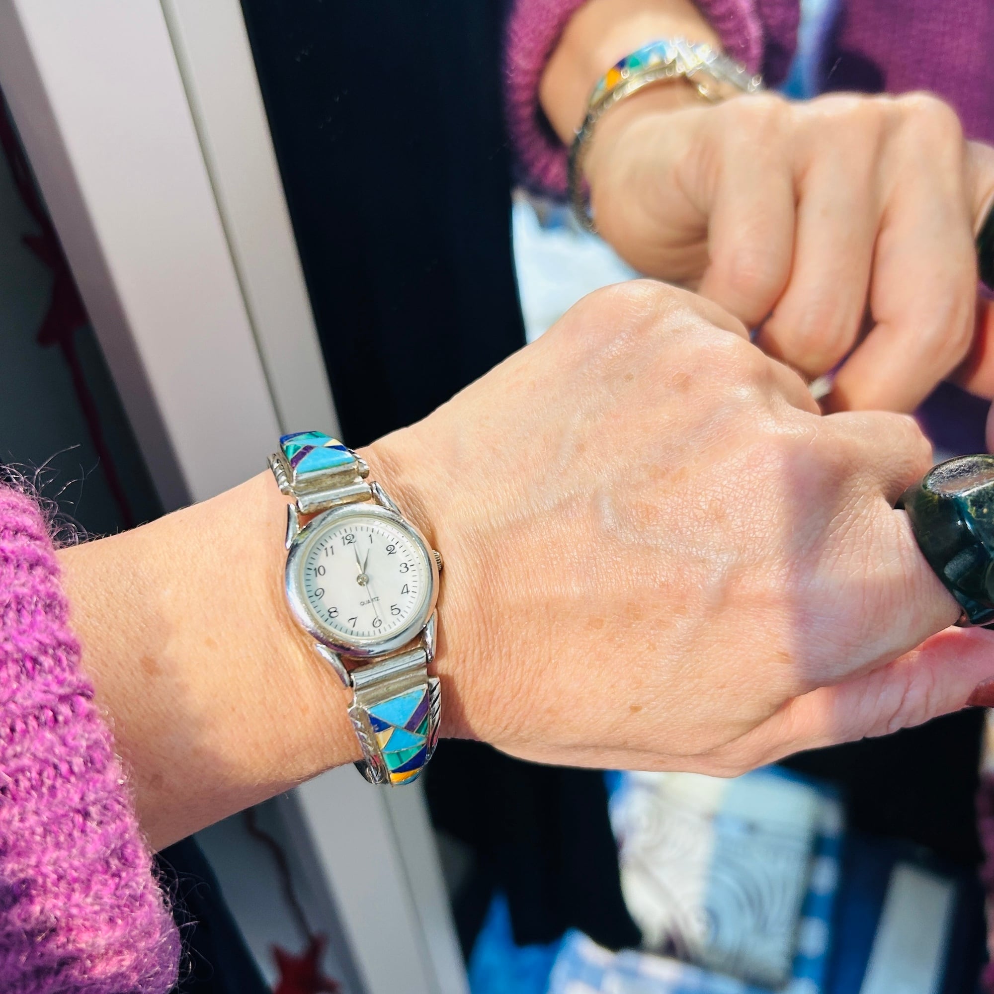 シルバーバンドにストーンが埋め込まれたネイティブアメリカン腕時計。ブレスレットと腕時計が一体化したオシャレなデザインです。カラフルなストーン使いが魅力です。文字盤部分と伸縮バンドはステンレス製です。JAPANメイドのクォーツ時計。電池交換は2025年11月27日、針は正しく動いています。時計の性能に関すること(水に濡れても大丈夫かどうか等々)は分かりかねます。メーリ便発送不可です。ストーン裏に「STERLING」、伸縮バンドに「STAINLESS STEEL」、文字盤裏「JAPAN MOVT」「STAINLESS STEEL BACK」。