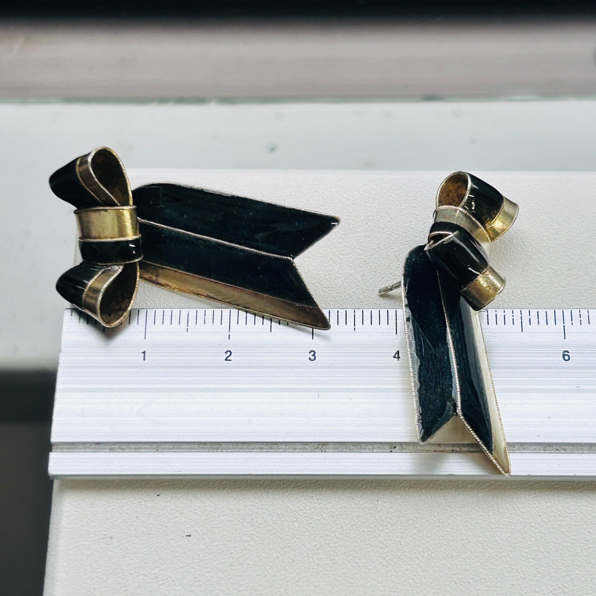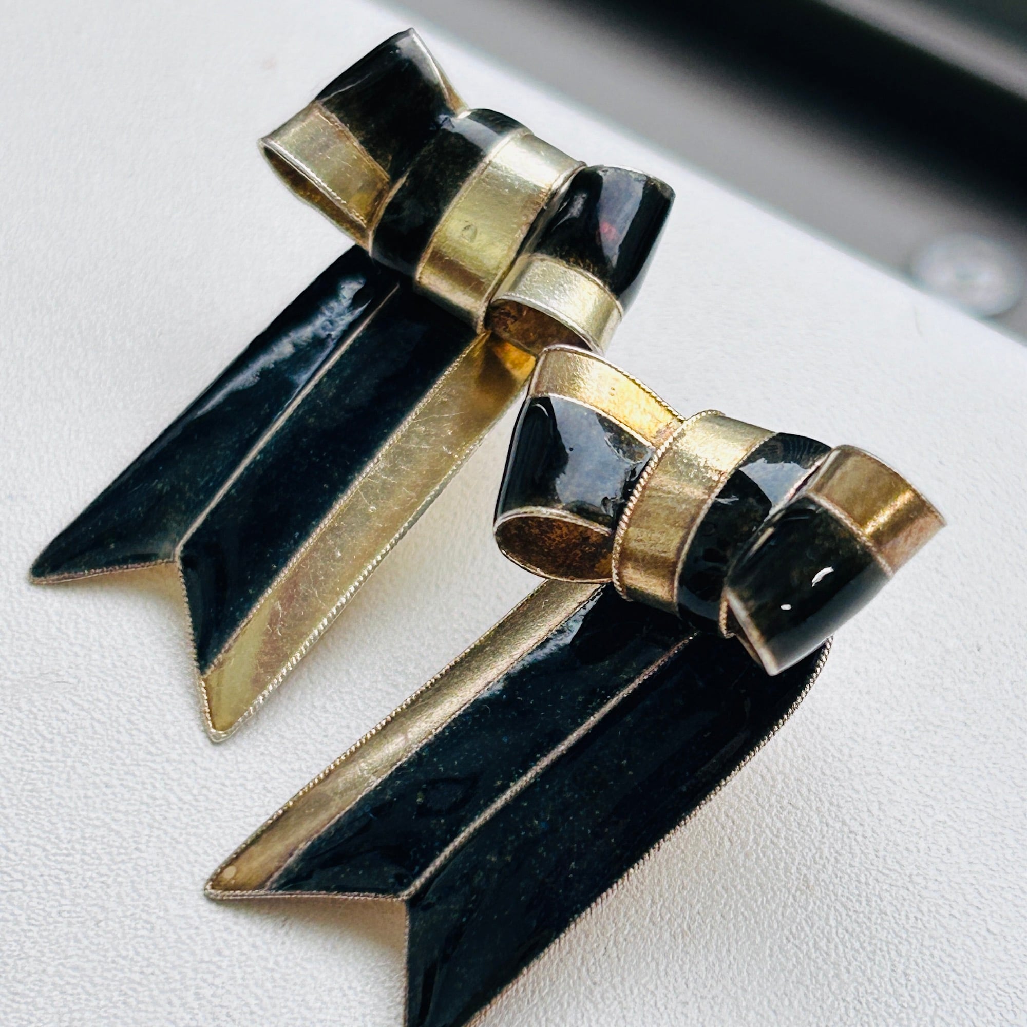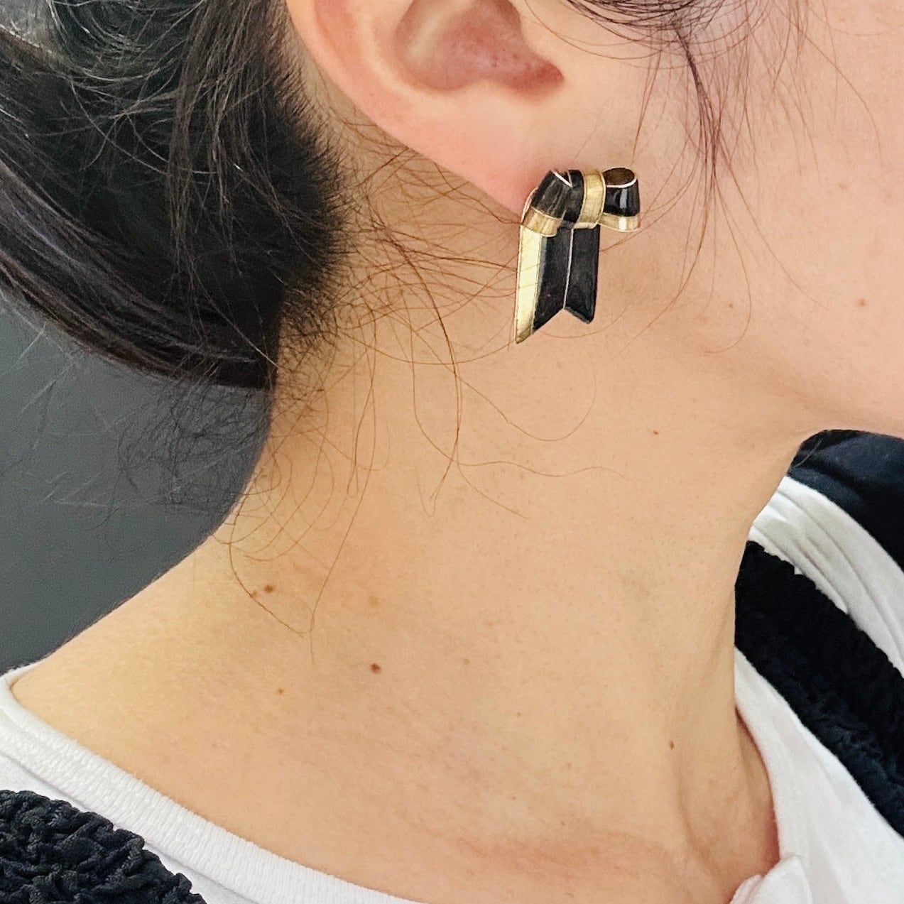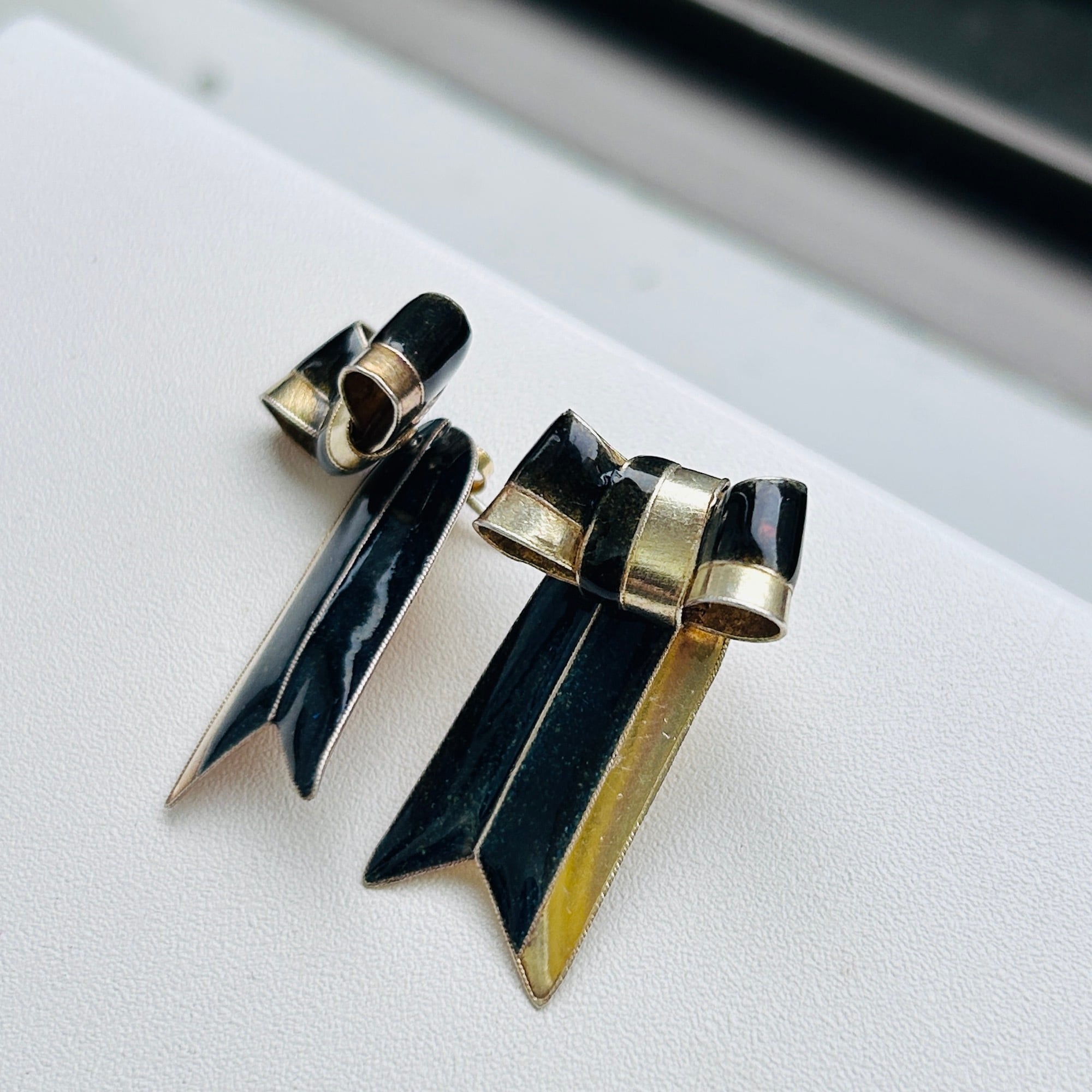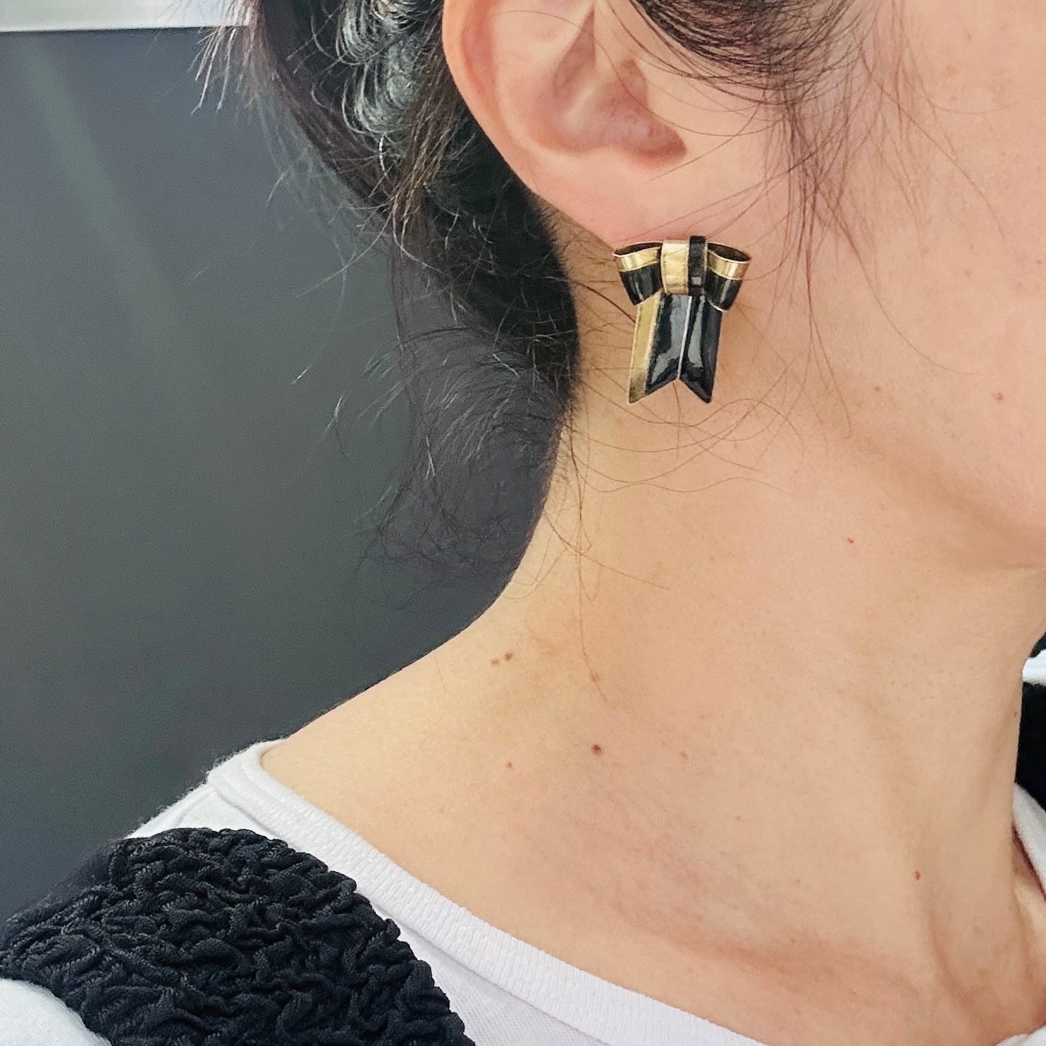 クラシカルでキュートなリボンピアス。シルバーに金メッキとブラックエナメルのツートーン。縦割・横割りのツートーンがオシャレ。ピアスは2つのパーツでできています。その分ピアス針が短くなっていて長さ約8mmです。ぶら下がったリボン先はやや内側に傾きがちですが着けるととても可愛いです。リボンの輪は上向き・下向きどちらでもいいと思います。「925」刻印。古さ漂うThe Vintage なお品です。