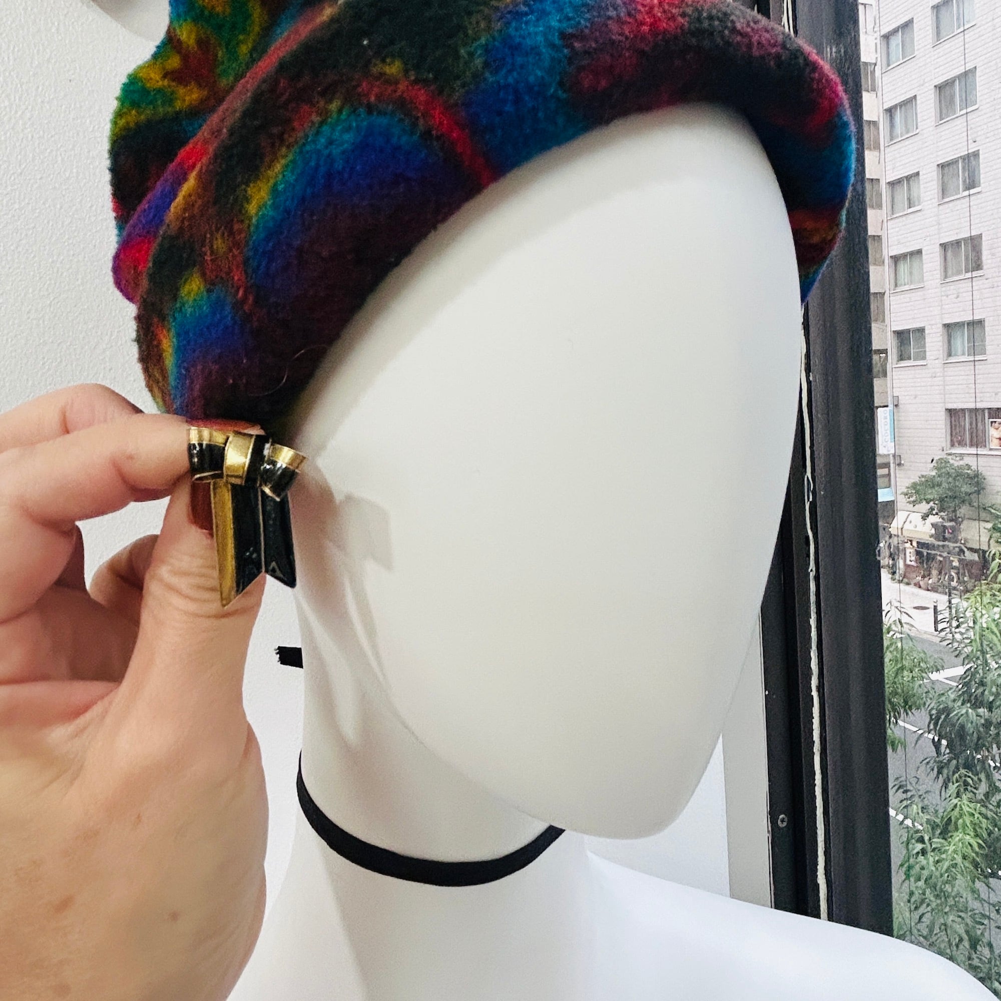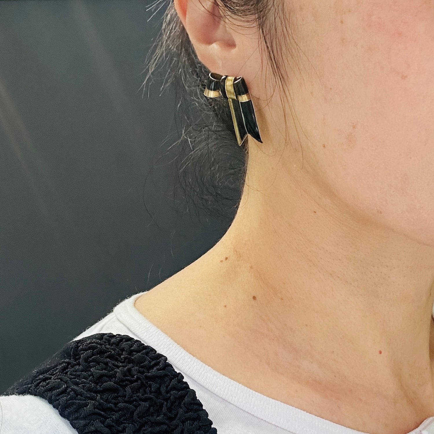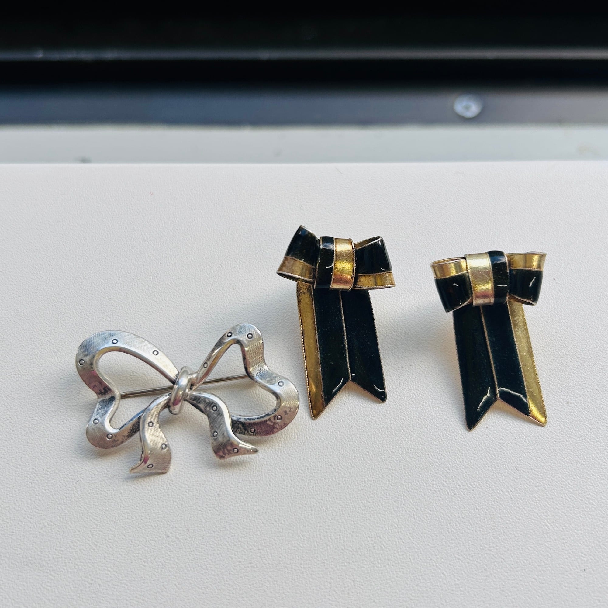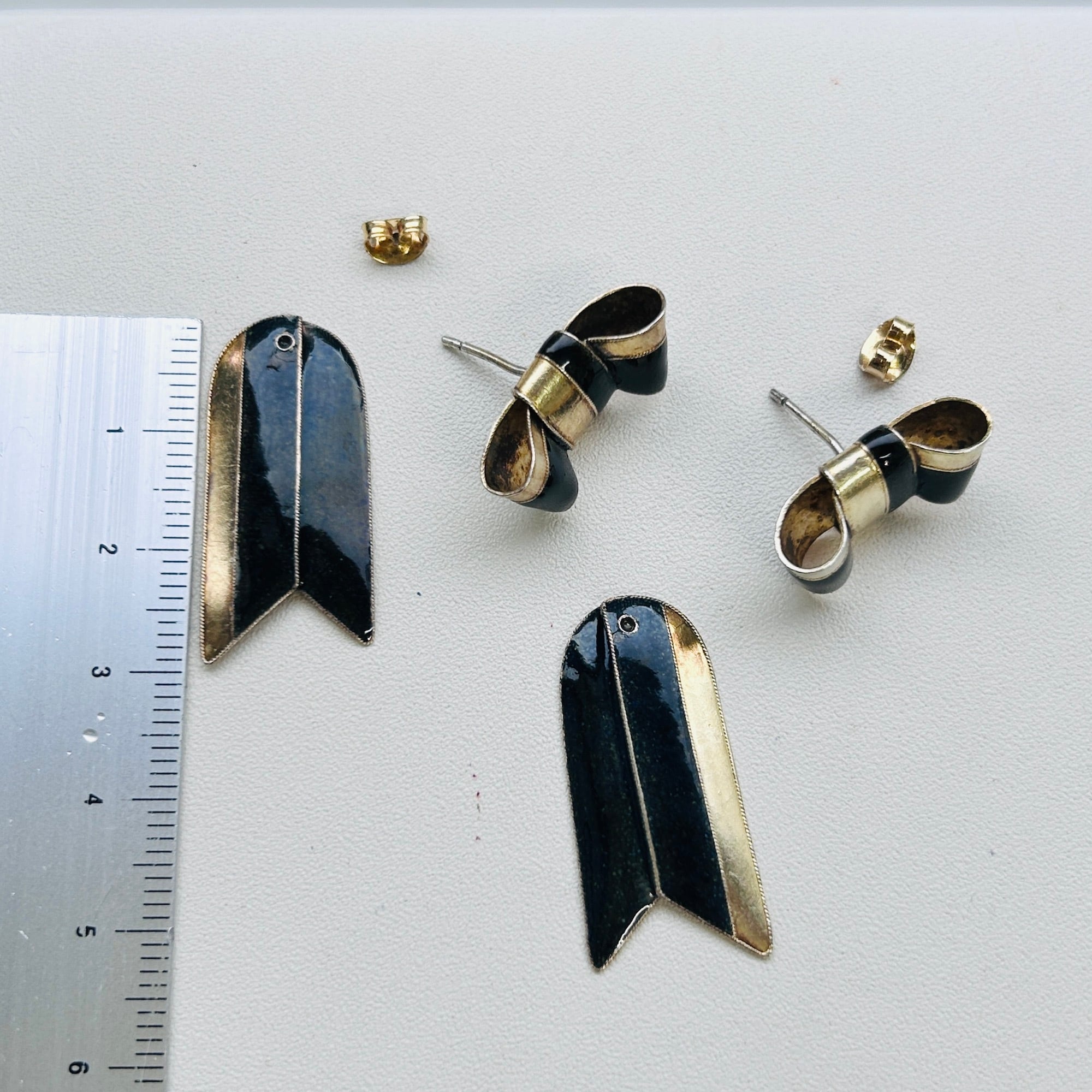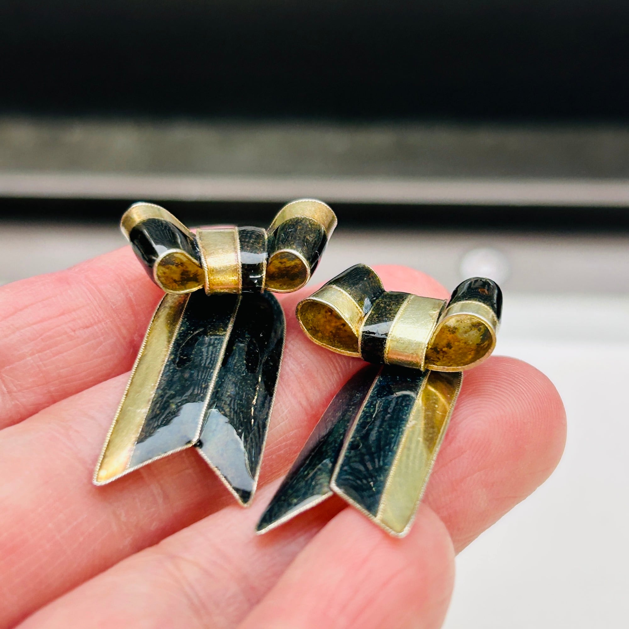 クラシカルでキュートなリボンピアス。シルバーに金メッキとブラックエナメルのツートーン。縦割・横割りのツートーンがオシャレ。ピアスは2つのパーツでできています。その分ピアス針が短くなっていて長さ約8mmです。ぶら下がったリボン先はやや内側に傾きがちですが着けるととても可愛いです。リボンの輪は上向き・下向きどちらでもいいと思います。「925」刻印。古さ漂うThe Vintage なお品です。