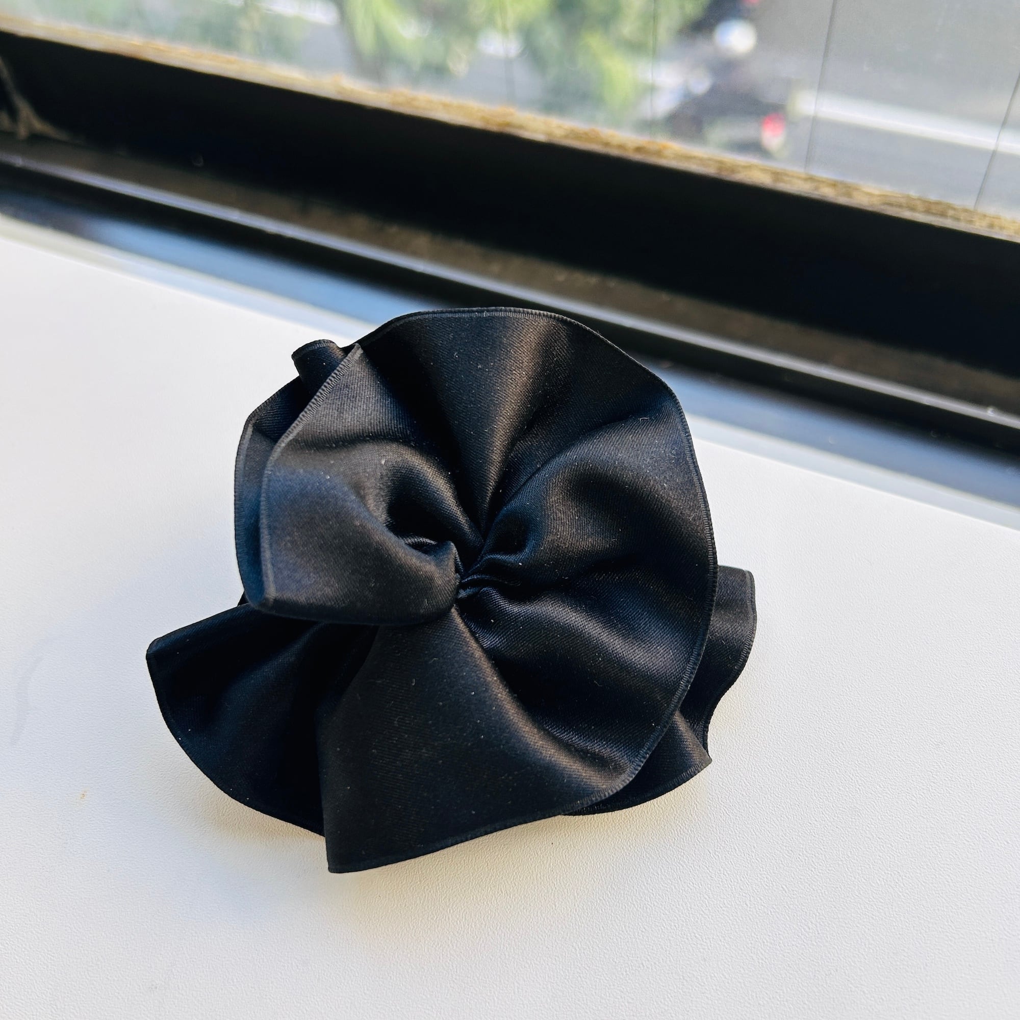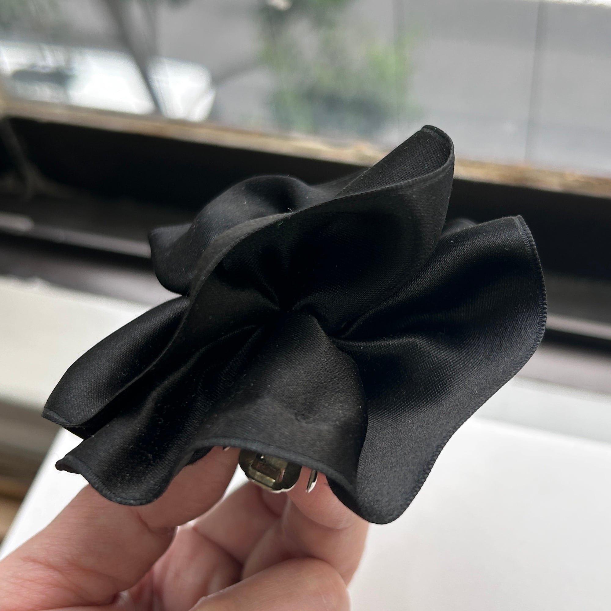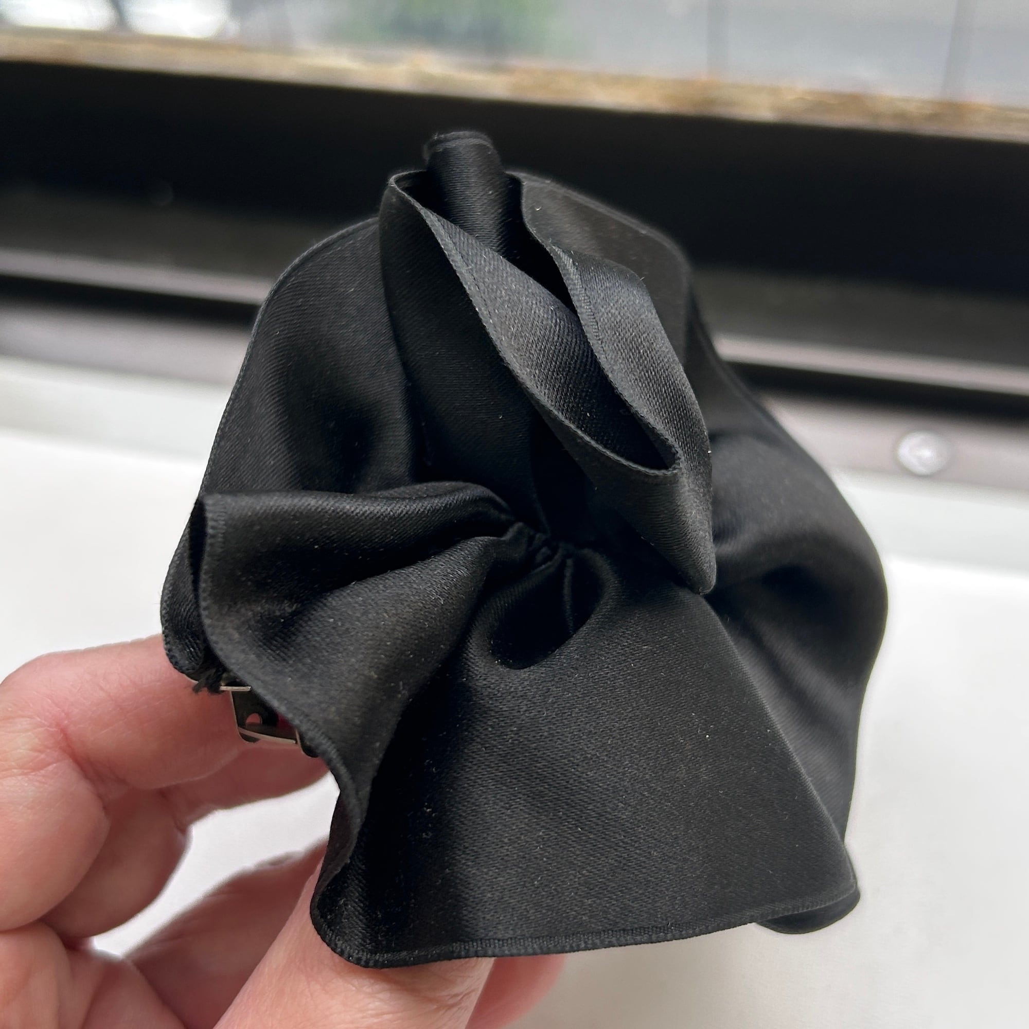 コサージュ風のバラバレッタ。張りと厚みのあるシルキーサテン生地で型崩れしにくそうです。バラの裏にベルトループ、バレッタ金具の両エンドは糸で縫い付けられています。手仕事のような感じ。ヴィンテージ品であることをご理解の上ご検討ください。金具に「MADE IN FRANCE」。金具は少しだけクスんでいます。金具の動作に問題ありません。メール便発送不可。
