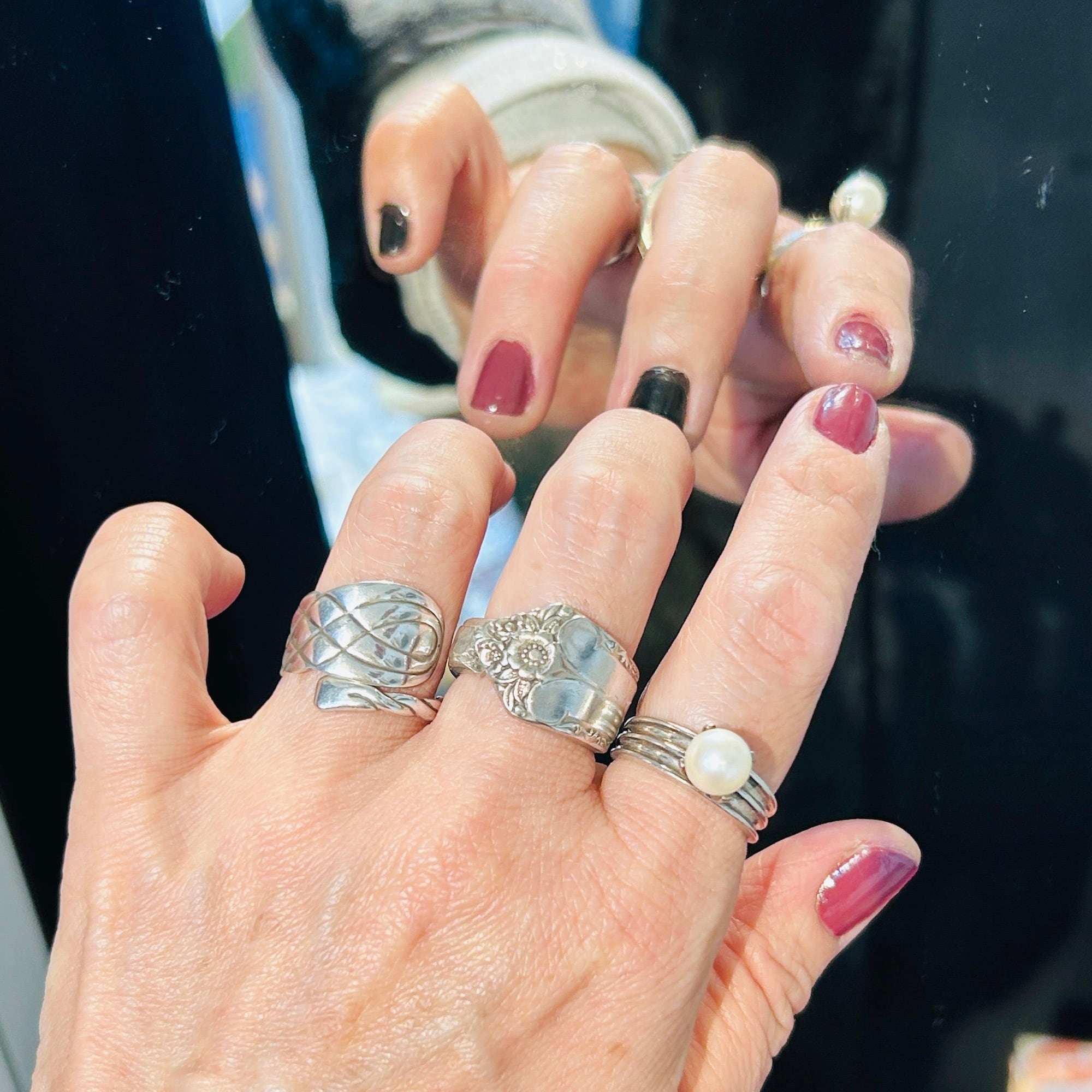 細かいフローラルエンボス模様のスプーンリング。厚みがあり程よいボリュームがいい感じのリングです。内側の刻印は途中で切れていてメーカーは不明です。ステンレス製が多いスプーンリングですがこちらはテストで材質確認済みのシルバーです。優雅な雰囲気の大人なシルバーリングです。