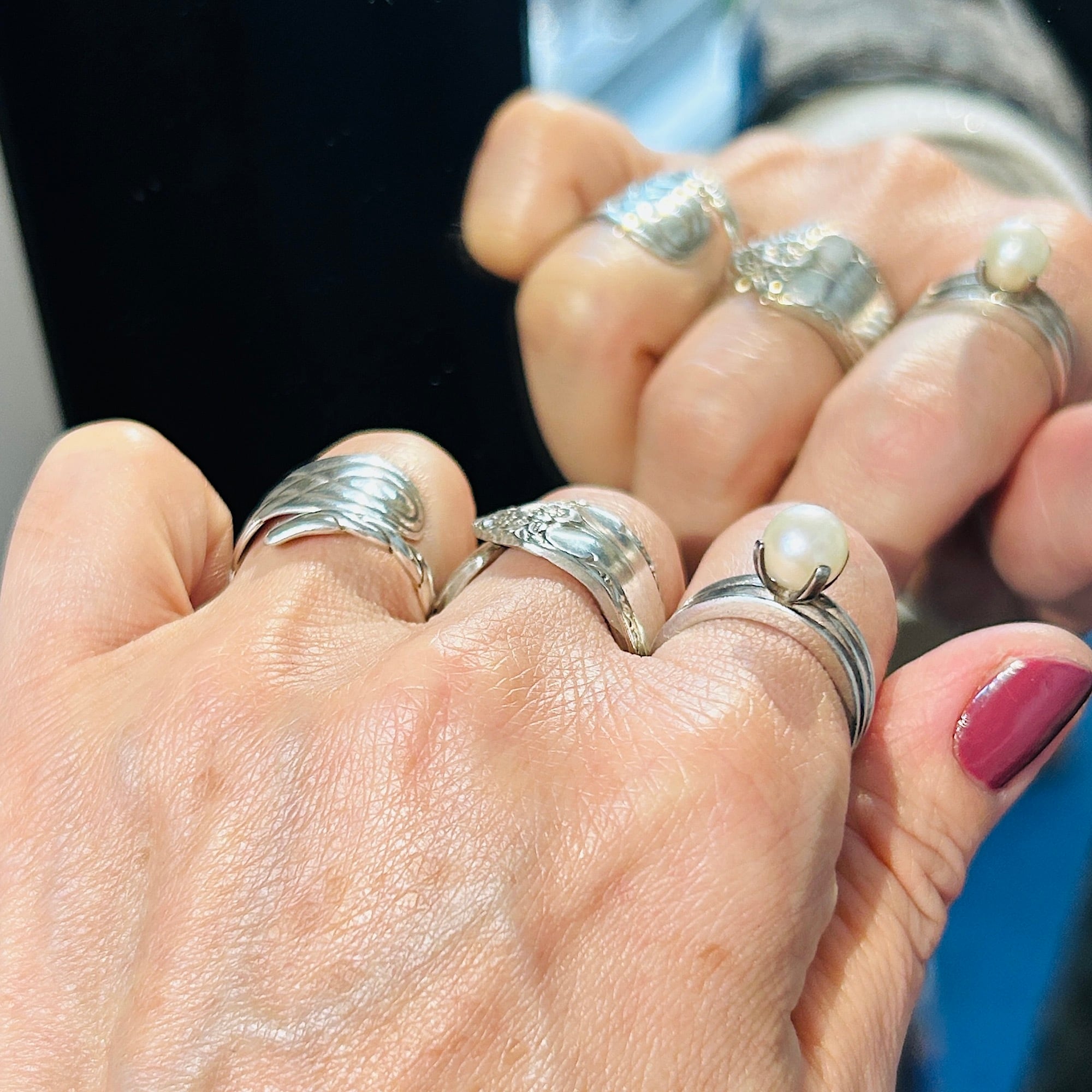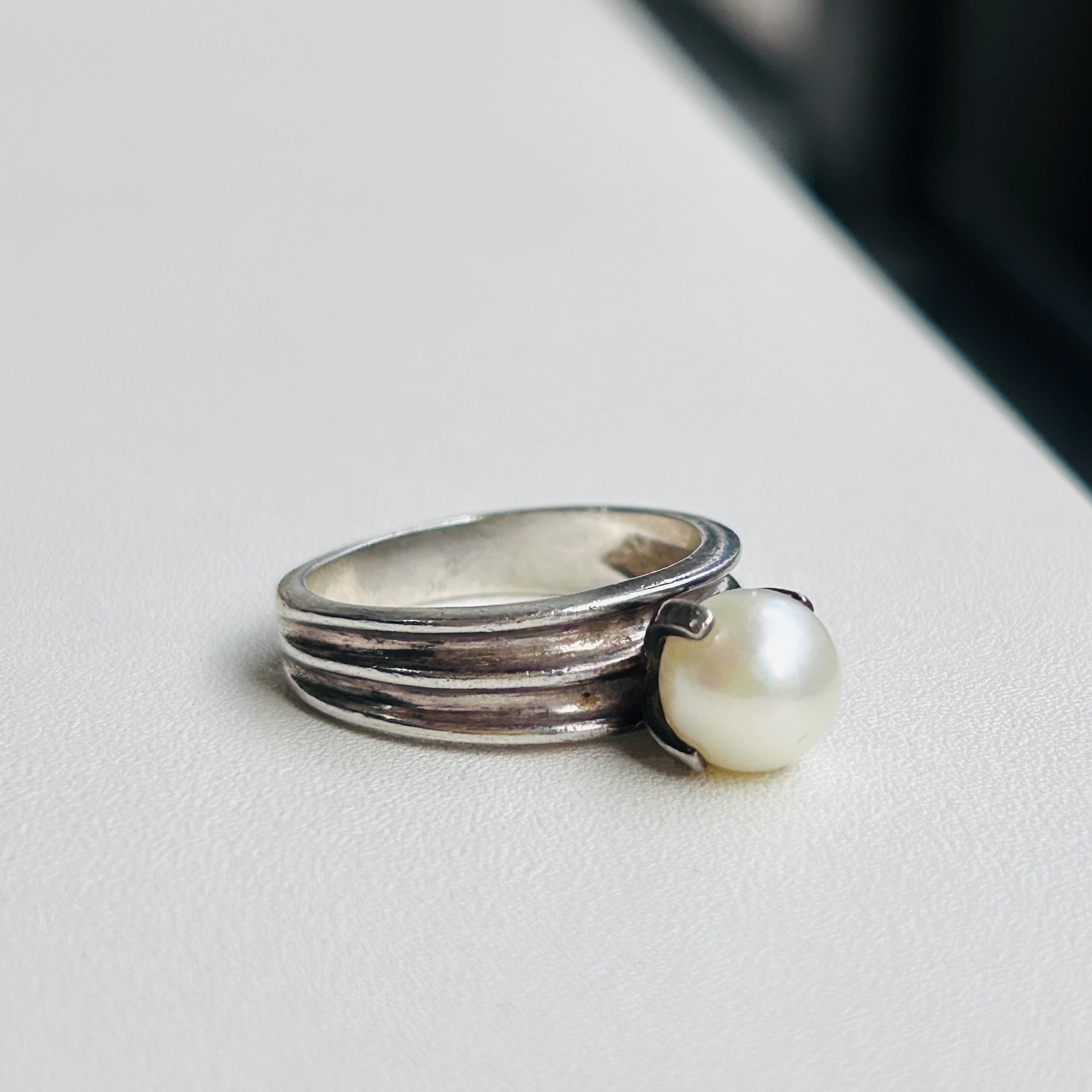 背の高い素敵な姿の1粒パールリング。7mmパールに4点爪留めのシンプルデザインです。バンドはトップに向けて少し厚め。しっかりした作りのバンドです。サイドは凹みストライプ。シックで素敵なデザインです。デリケートなパール周りは軽くクリーニングのみ。渋いダークシルバーのOLDな雰囲気があって素敵だと思います。パールにグラつきなし。内側に「STER.」とメーカーマーク。サイズ棒では12号ですが新円ではないので着用感は13-14号くらい。中指にも人差し指にも入ります。