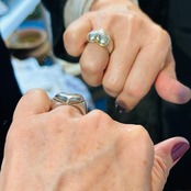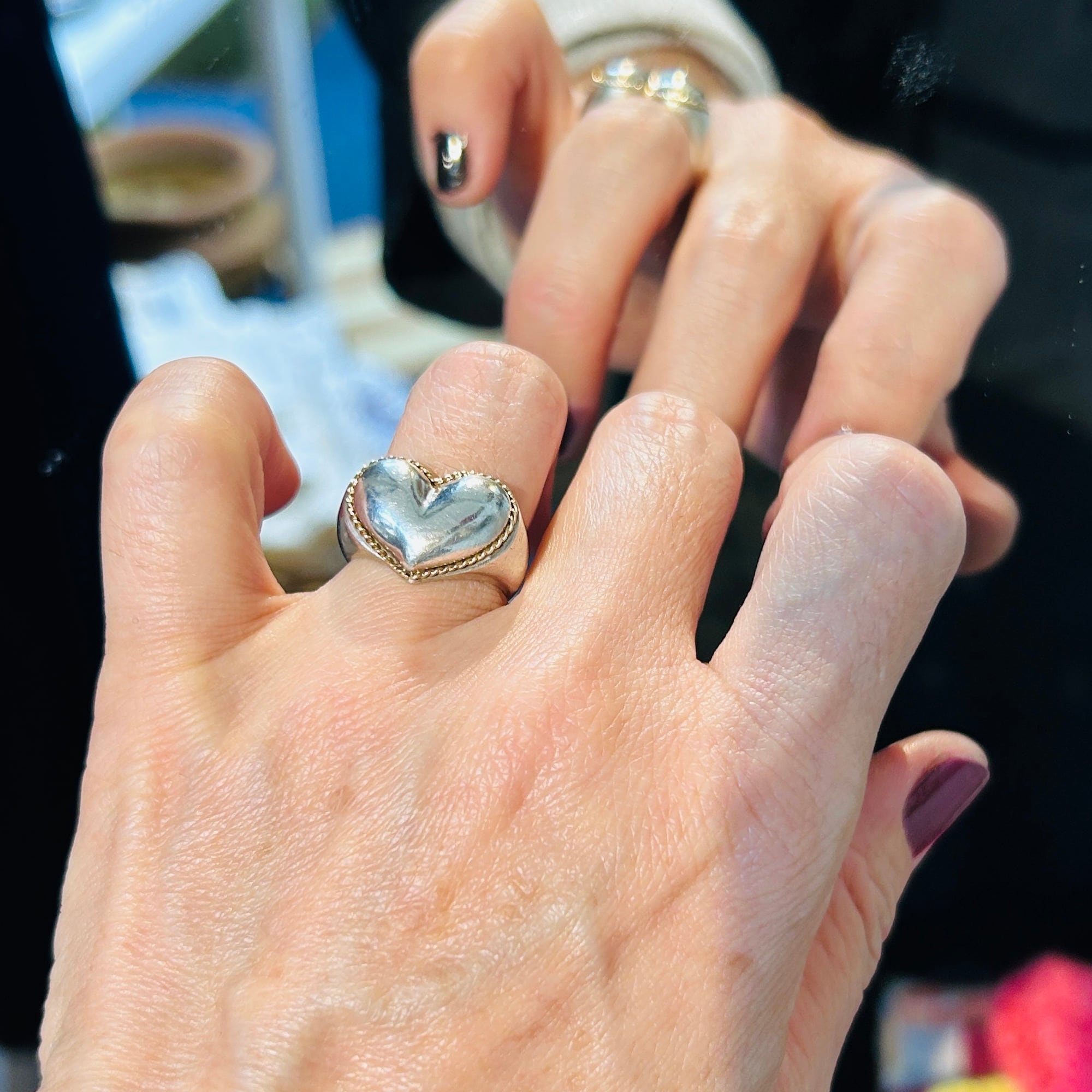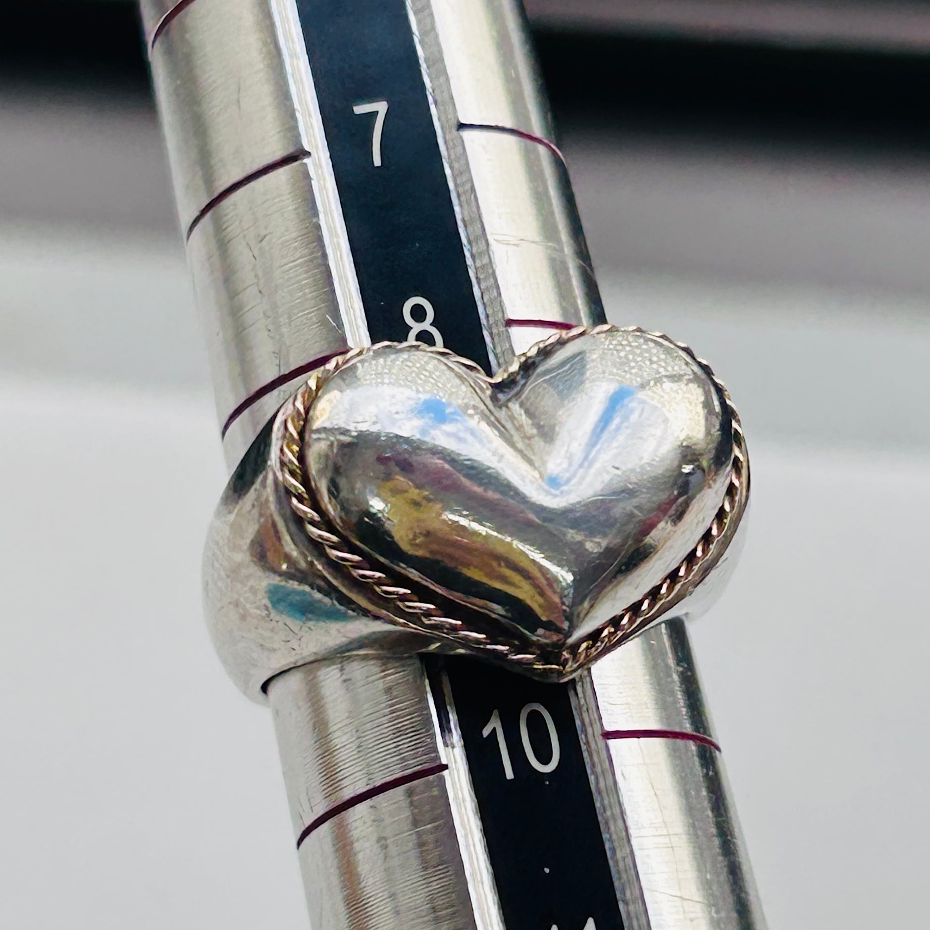ぷっくり膨らんだハートをロープフレームしたカッコよくて可愛いリング。サイズ9号も小柄な日本人に嬉しいサイズです。ロープフレームはメッキが大半ですがこちらのゴールドロープはメッキに見えないので真鍮かなと思います。近くて観察すると小傷がある程度のコンディション。磨けばもっと輝くと思います。内側の刻印は「STERLING」と「SA」。私は普段9-10号薬指にジャストフィットです。