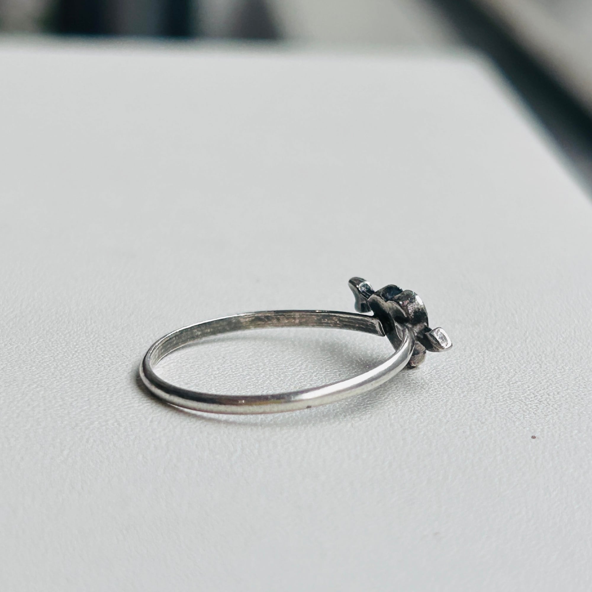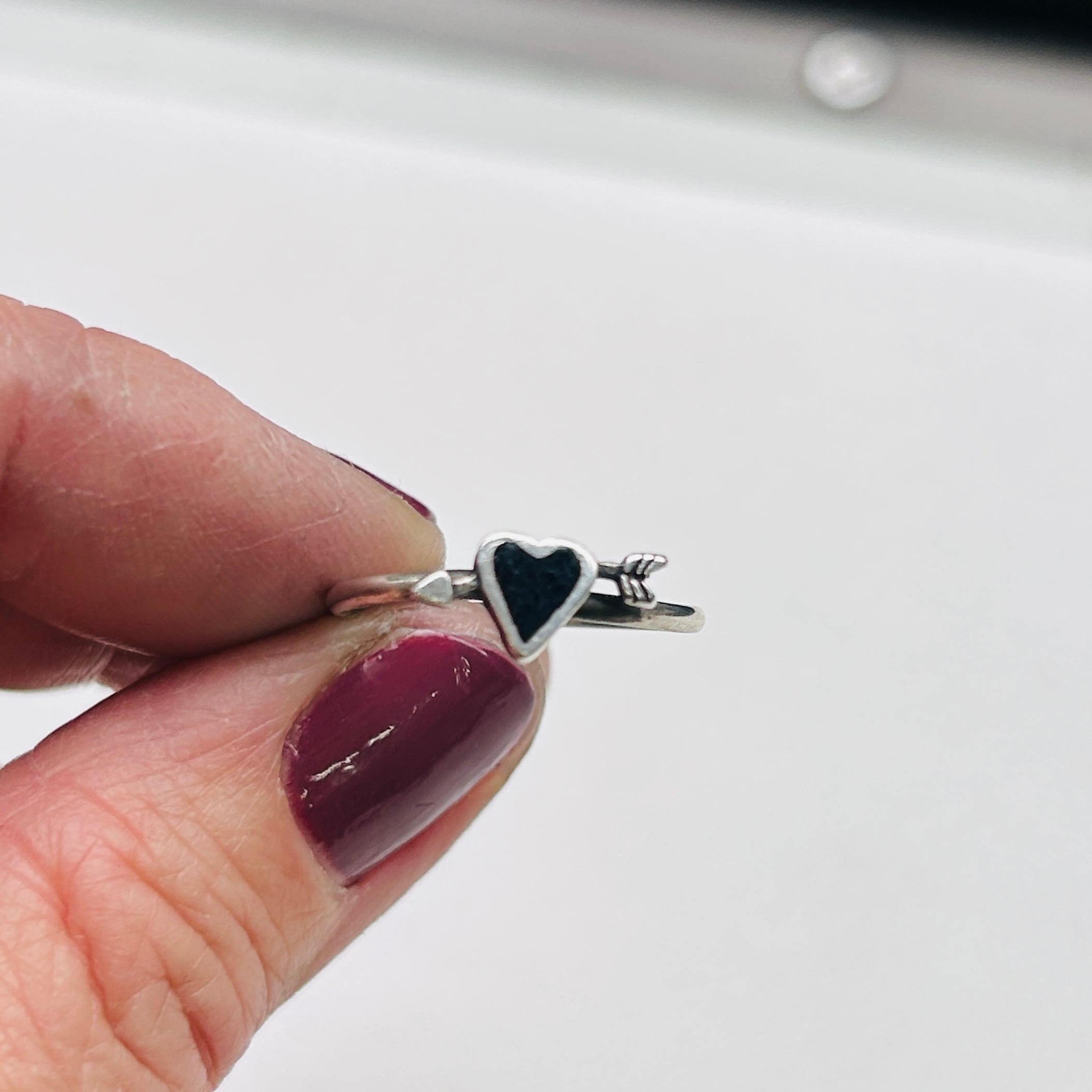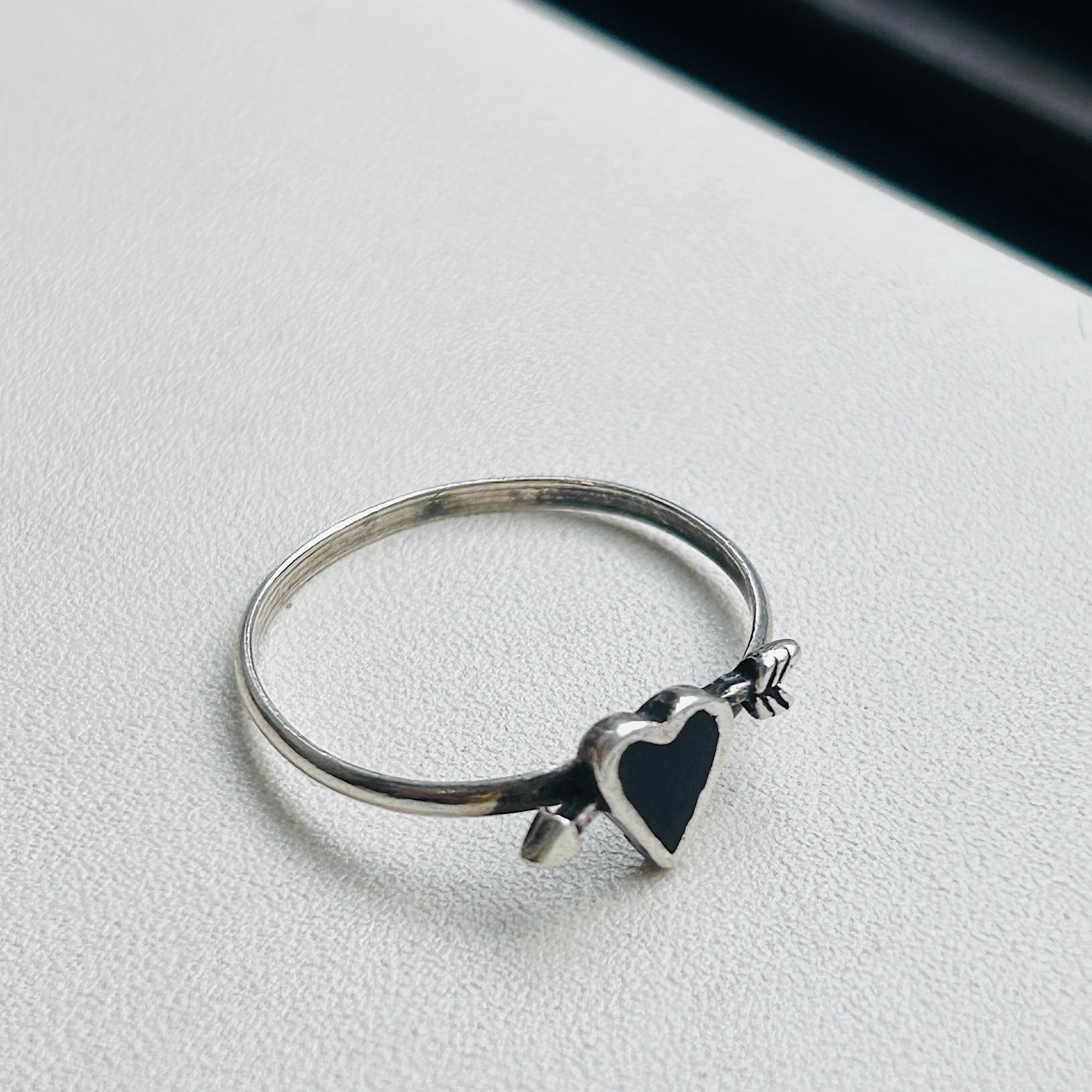 ブラックハートに弓矢の華奢リング。とても華奢です。華奢すぎて可愛いです。バンドが細いので指に入りやすく13-14号と大きめですがどの指にも着用できます。15号くらいの指にもきっと入ると思います。刻印なしシルバーです。