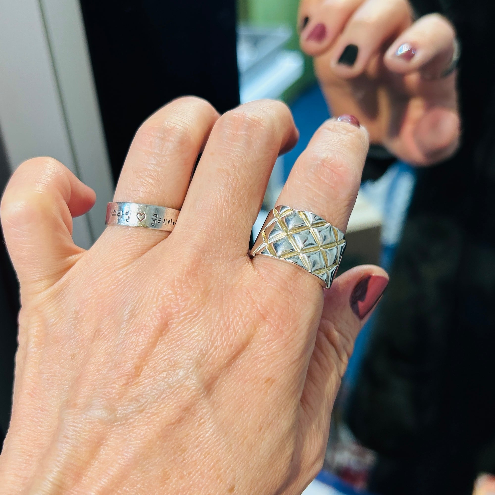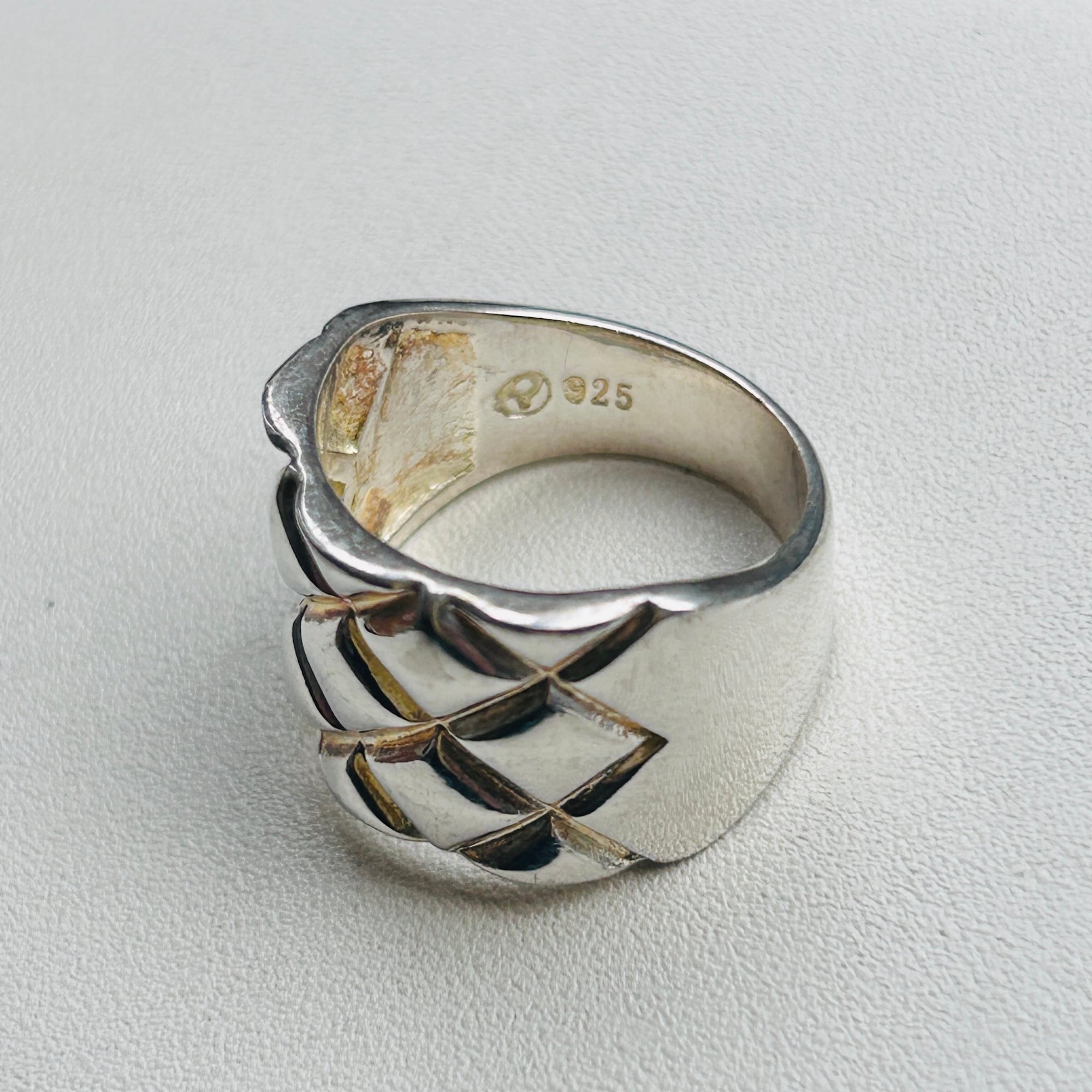 キルティング模様のワイドリング。凹み部分は金メッキだったようで薄く金色が残ったツートーンです。ツヤやかな凹凸ポコポコが目をひく現代っぽいデザイン。内側にメーカーマークと「925」刻印。