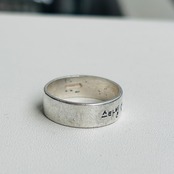 シンプルな5.5mmバンドリング。黒凹み文字でハングル語が彫られています。意味は確か、男性と女性の名前、愛の安定、ハート、みたいな内容でした。意味よりもハートとハングル文字が可愛くて選んだリングです。セミマットなツヤで表面全体にスレ・スリキズございますが、キュートなヴィンテージリングです。着用感は実寸より小さく、私の12号中指に入りません。普段9-10号の薬指にちょうどいいです。内側に「SILVER」。