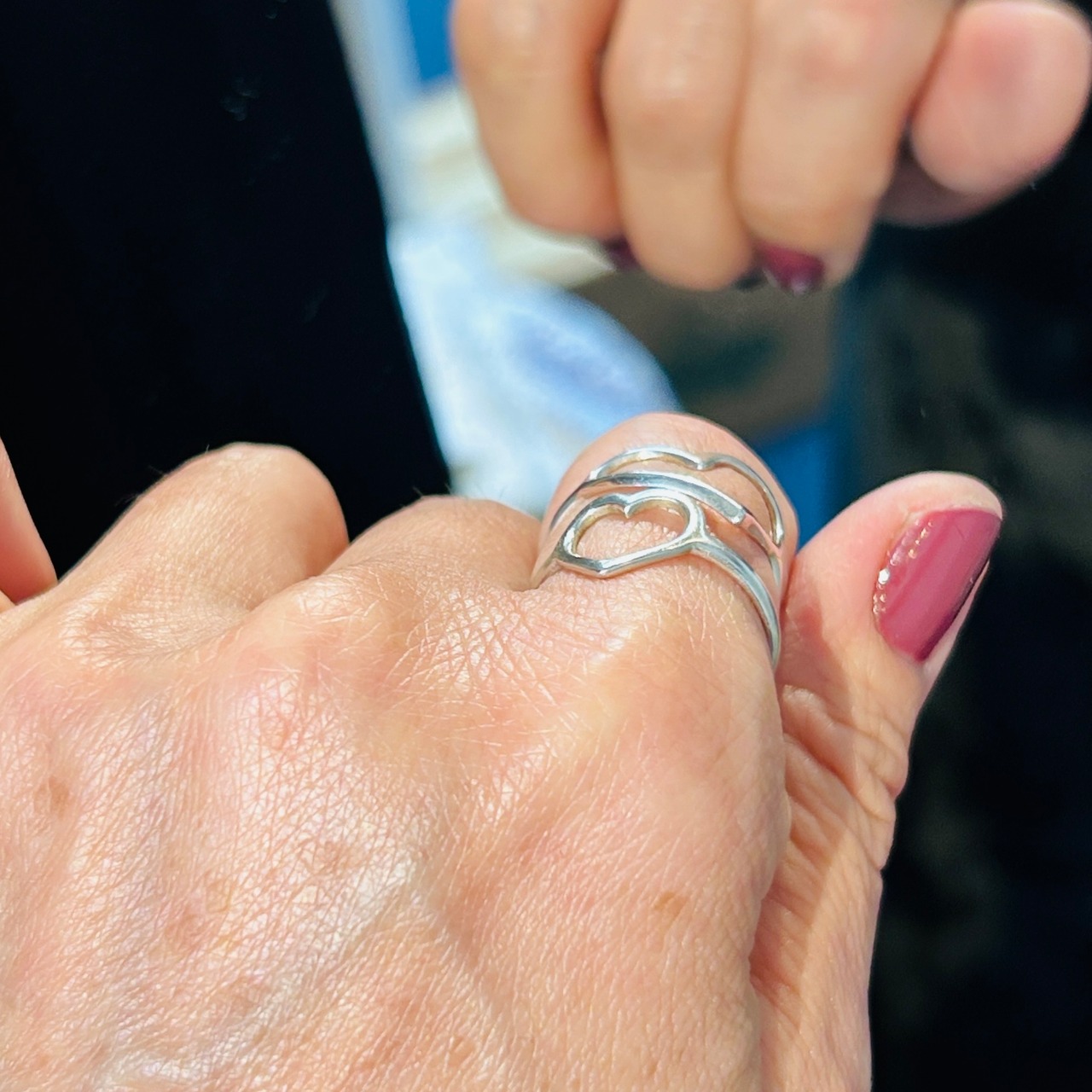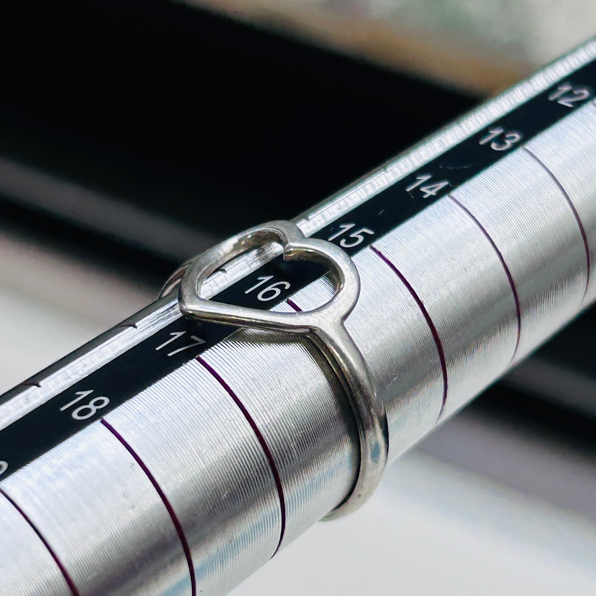 たて1.2cmのアウトラインハートリング。線が細い比較的華奢な作りのハートです。2つ重ねるのもオススメです。内側に「925」刻印。私は普段14〜15号人差し指に、少し緩いですが着用できます。
