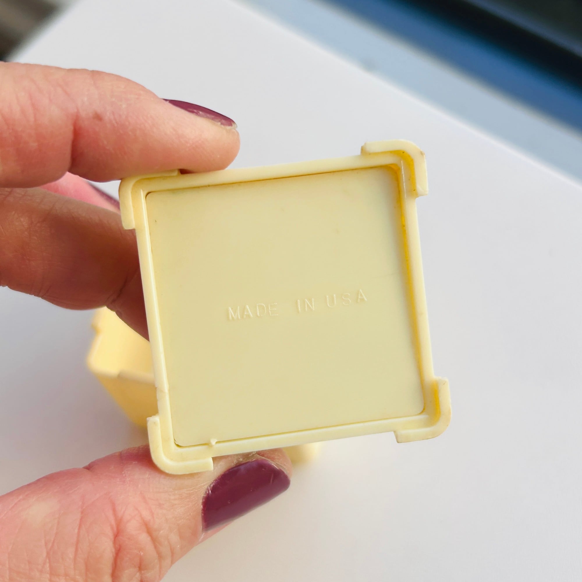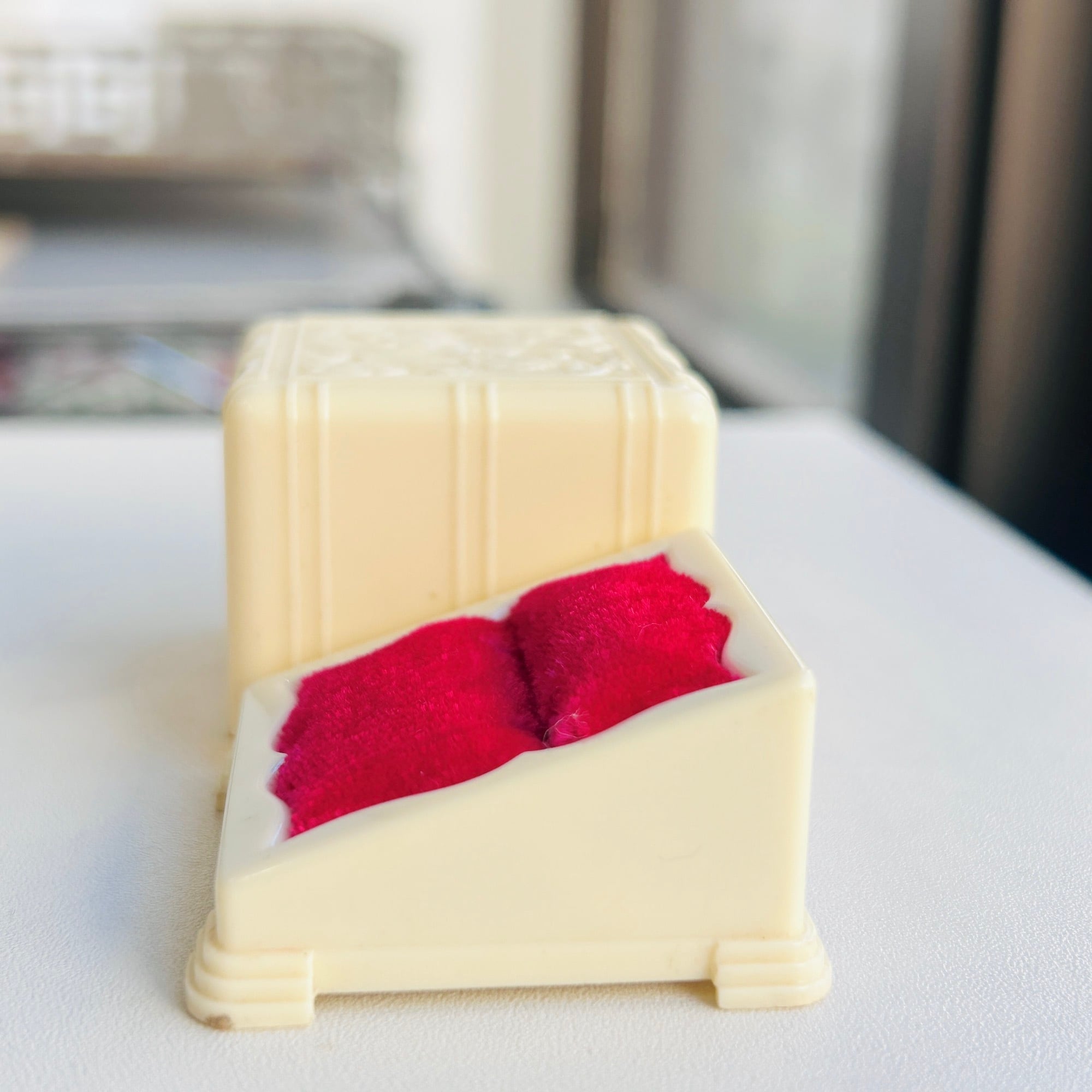 アイボリーカラーにエンボス模様のレトロなリングケース。セルロイドかと思いましたが違いました。プラスチック製です。中はビビッドなピンク色のベルベットです。写真で実物に近い色味を表すことができていません。フューシャピンク色をイメージください。バンド幅が広いリングは入りません。底に「MADE IN USA」。特筆すべきダメージはありません。