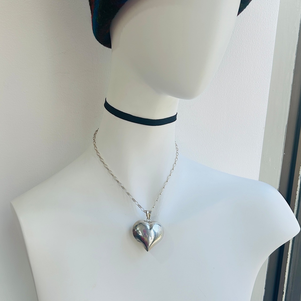 ぷっくりハートのチェーンネックレス。ハートは縦3.5cm、特別大きい訳ではないですが、厚みが17mmもあってすごくぷっくりしています。チェーンはスッキリしたリンクチェーン。切りっぱなしなのでどの位置にでも引っ掛けて頂けます。明るいツヤのあるシルバーです。変色が気になりましたら液体クリーナーのお手入れがオススメです。留め具とハートベイルに「925」刻印。着画にふさわしくない赤ニットでした。すいません。