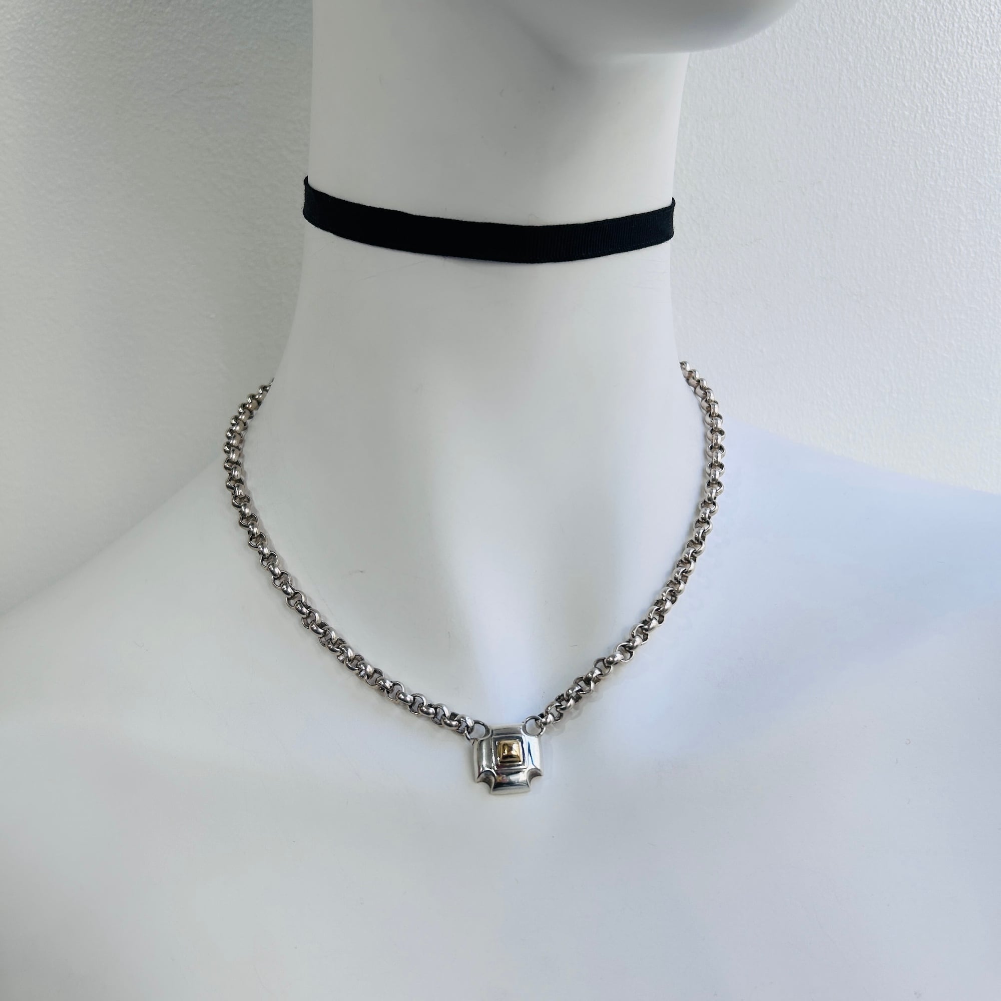 スクエアトップのツートーンネックレス。ゴロっとしたトップと径5mm太めのロロチェーンの組み合わせは貫禄があってカッコいいです。スクエアは1.5cm四方、厚み7mm。中央の四角は18金ゴールドです。バブリーな雰囲気のネックレスです。シャツから覗かせるのも素敵です。トップ裏に「©︎BAYANIHAN」「925」「18K」。送料無料でお届けいたします。